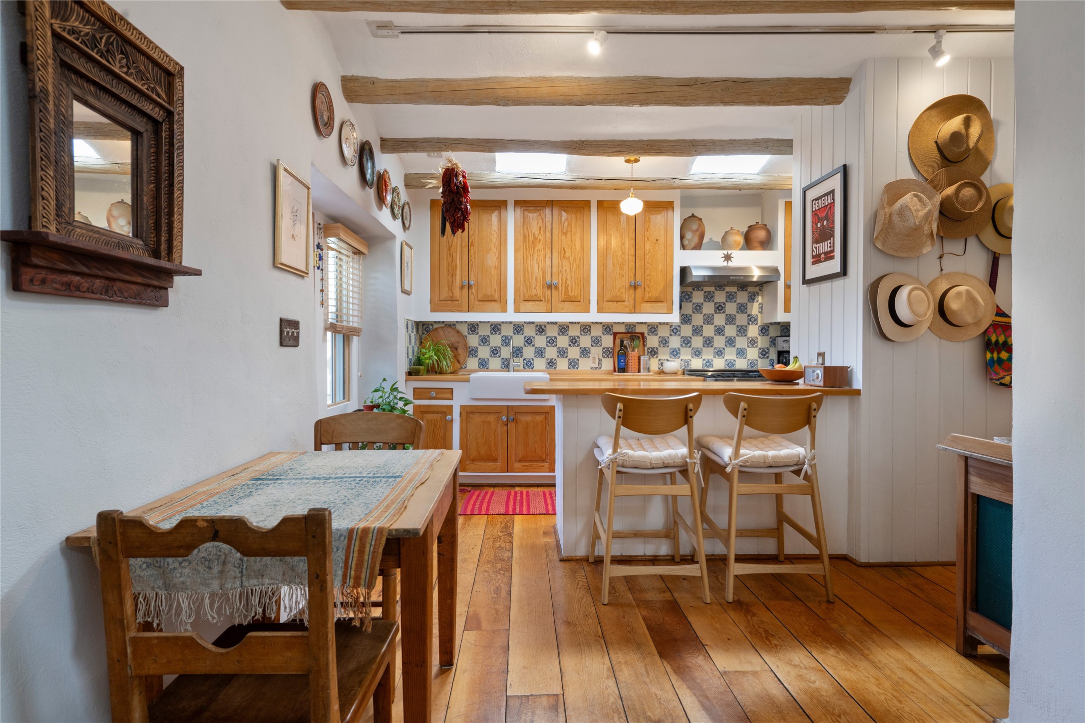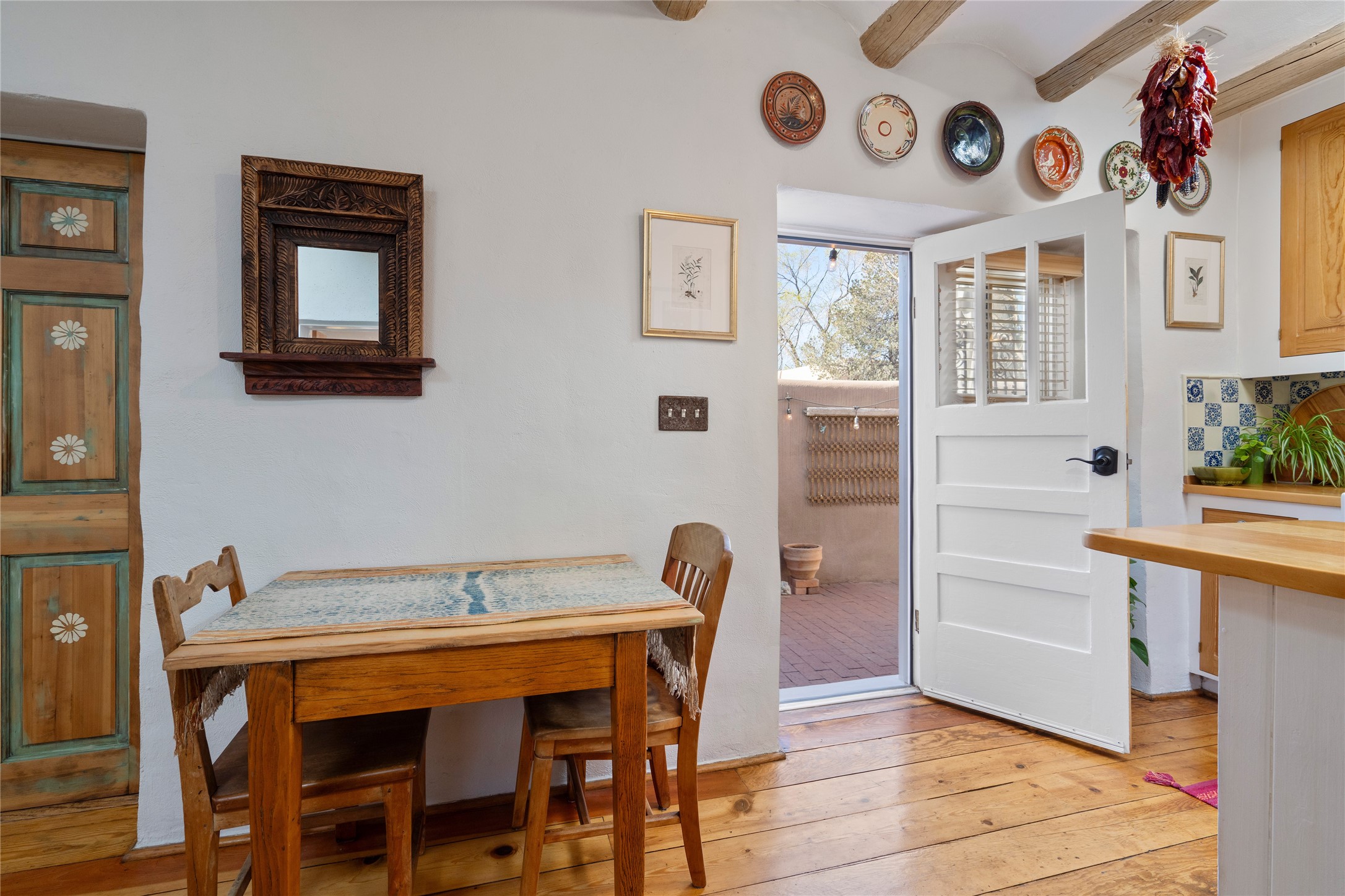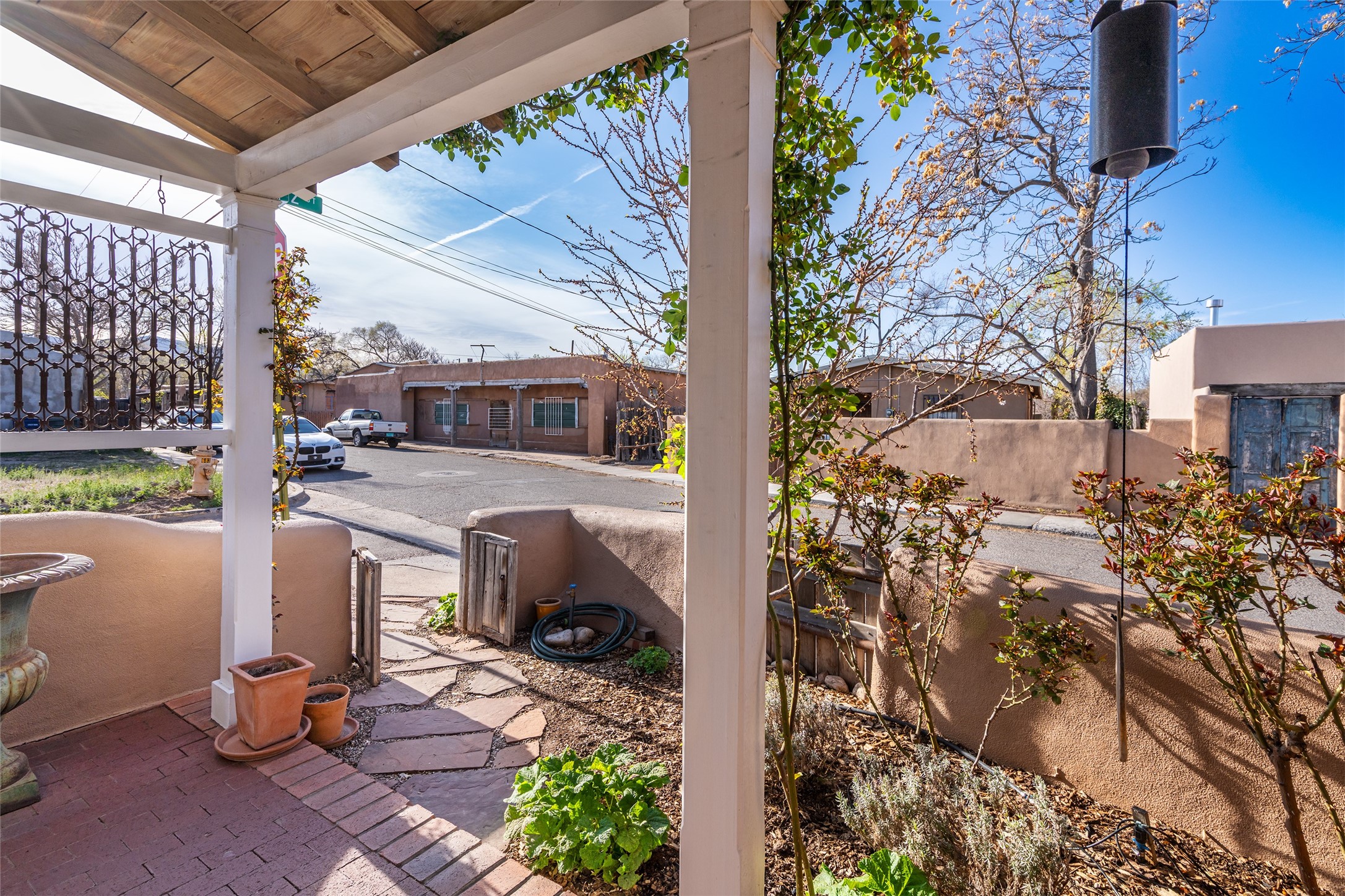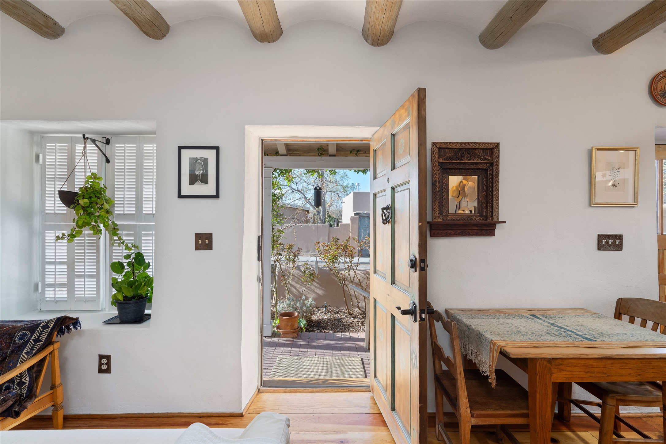 Elegant Adobe Pied--Terre in Downtown Santa Fe-- Experience the charm, warmth, and style of true Santa Fe living in this beautifully restored, freestanding adobe home--just blocks from the historic Plaza, world-class museums, local shops, the Railyard District, and an abundance of restaurants.Thoughtfully designed with classic Southwestern details and modern upgrades, this sophisticated corner-lot residence features sculpted coved and beamed ceilings, antique European doors, plaster walls, and deep window sills.The open-concept living, dining, and kitchen area is perfect for entertaining or relaxing. The living area has rich, wide wood plank floors and a kiva fireplace. The kitchen has vintage-inspired touches including a farmhouse sink and retro tile and upgraded appliances. The spacious primary suite features a tranquil bedroom, an en-suite bathroom, and seating area with kiva fireplace. It has a new traditional encaustic tile floor, the tiles are handcrafted by a local artist. Eight skylights throughout the home fill it with natural light, while two private courtyards--serene outdoor living spaces. One courtyard has a small shed for storage. Adobe walls offer peace and privacy and two efficient ductless mini-split units ensure comfort and low maintenance.Additional features include a washer/dryer, ample closet space, stone pathway, and one private off-street parking space. With no HOA fees, this home makes an ideal full-time residence, luxury rental, or dreamy downtown getaway for anyone seeking the magic of Old Santa Fe with modern comforts.