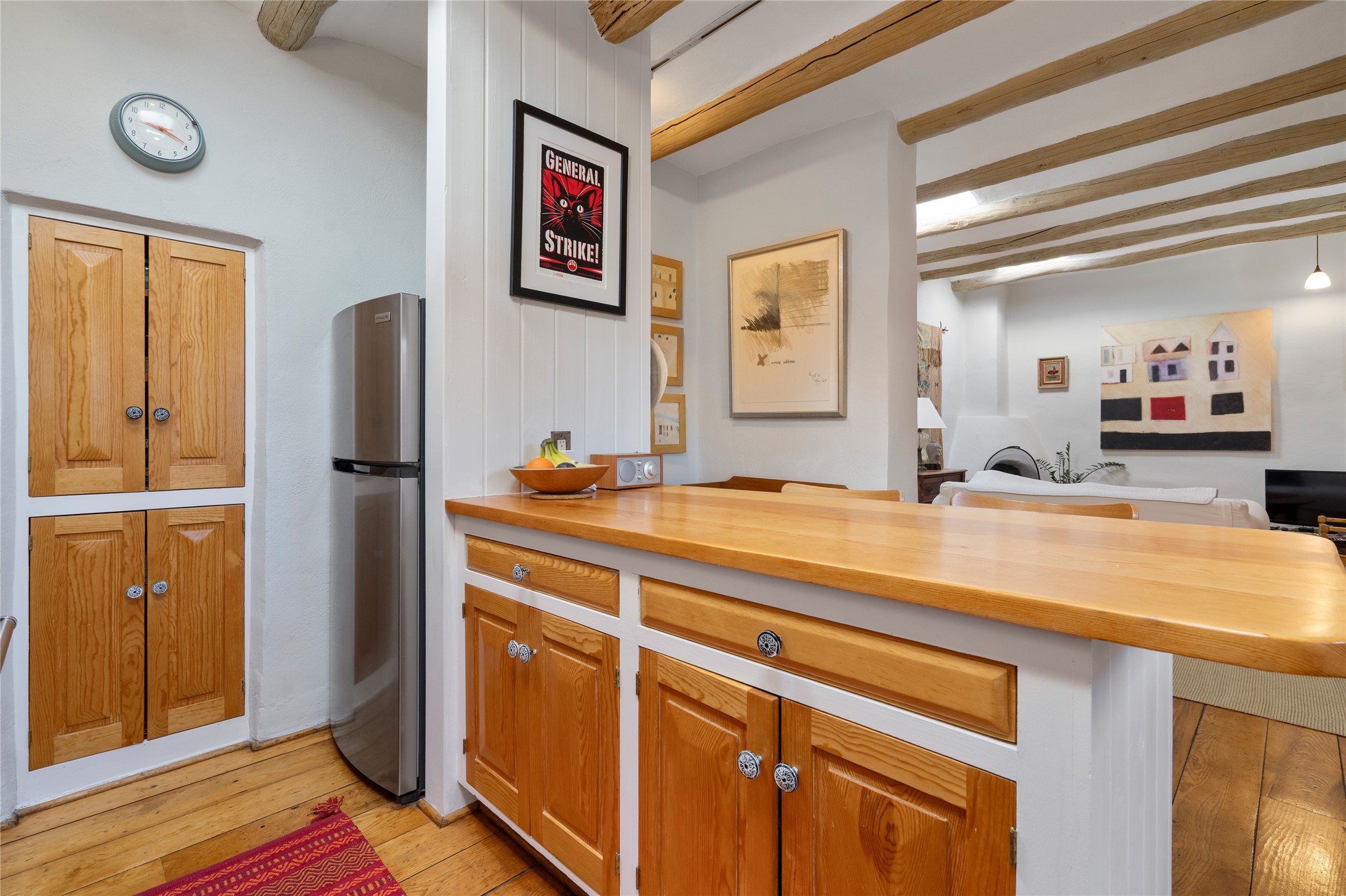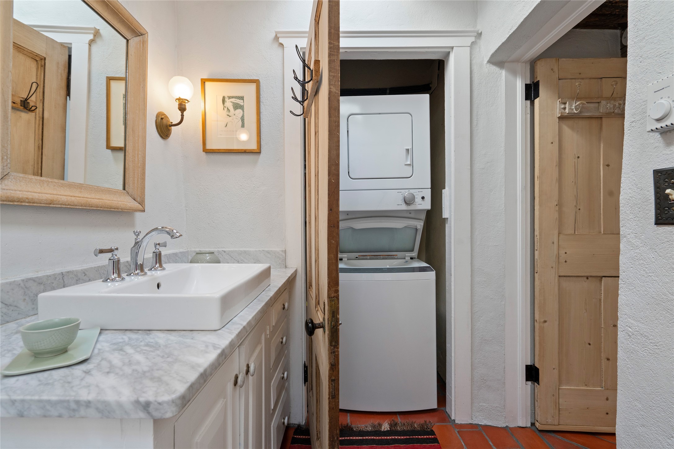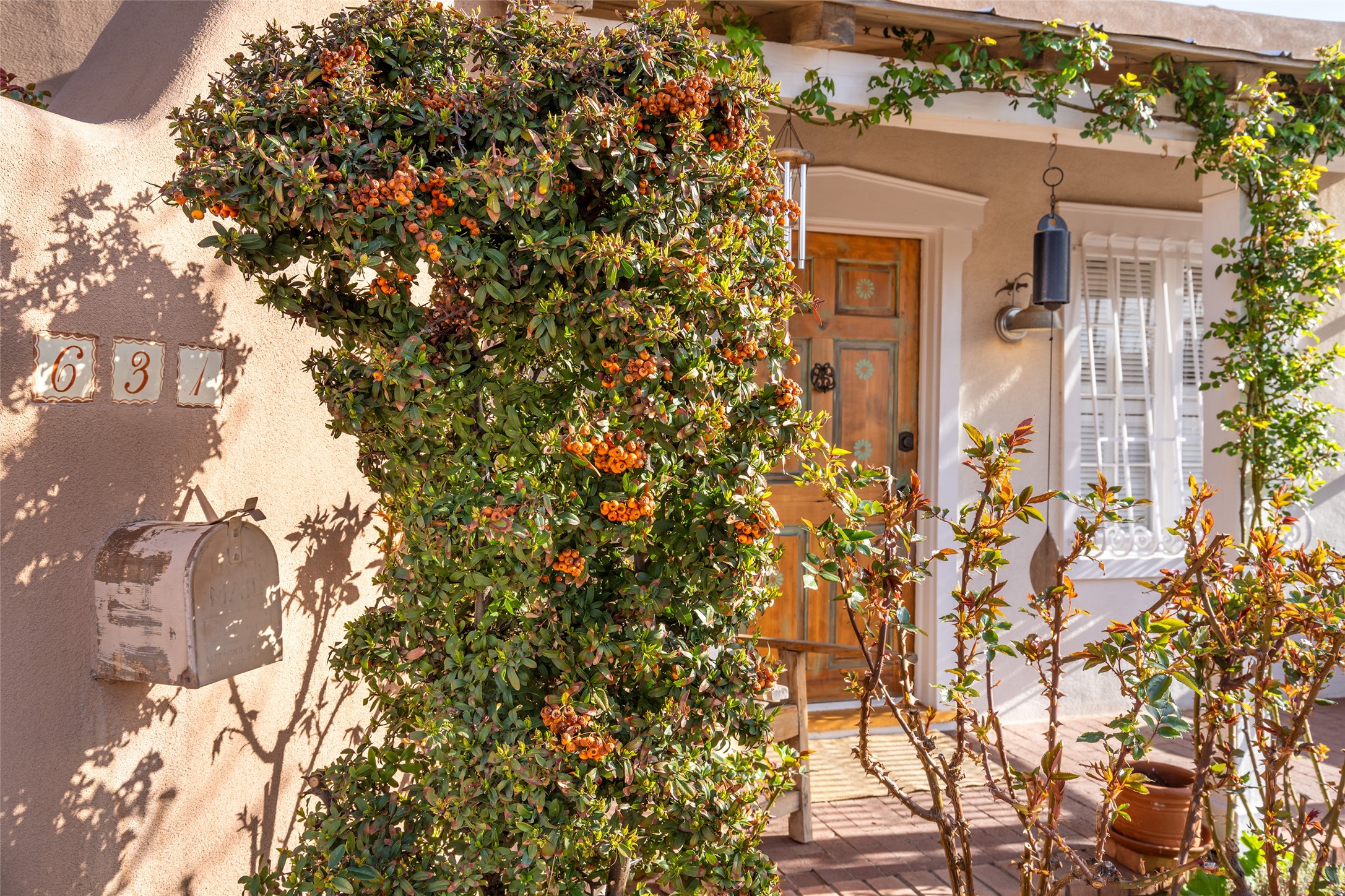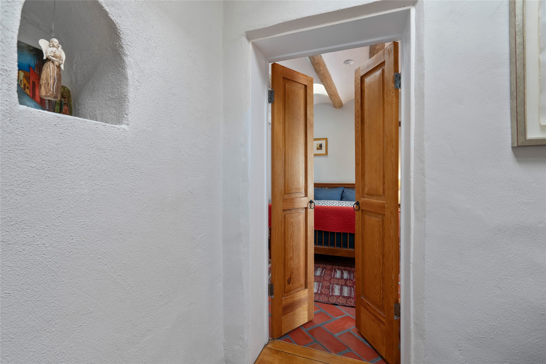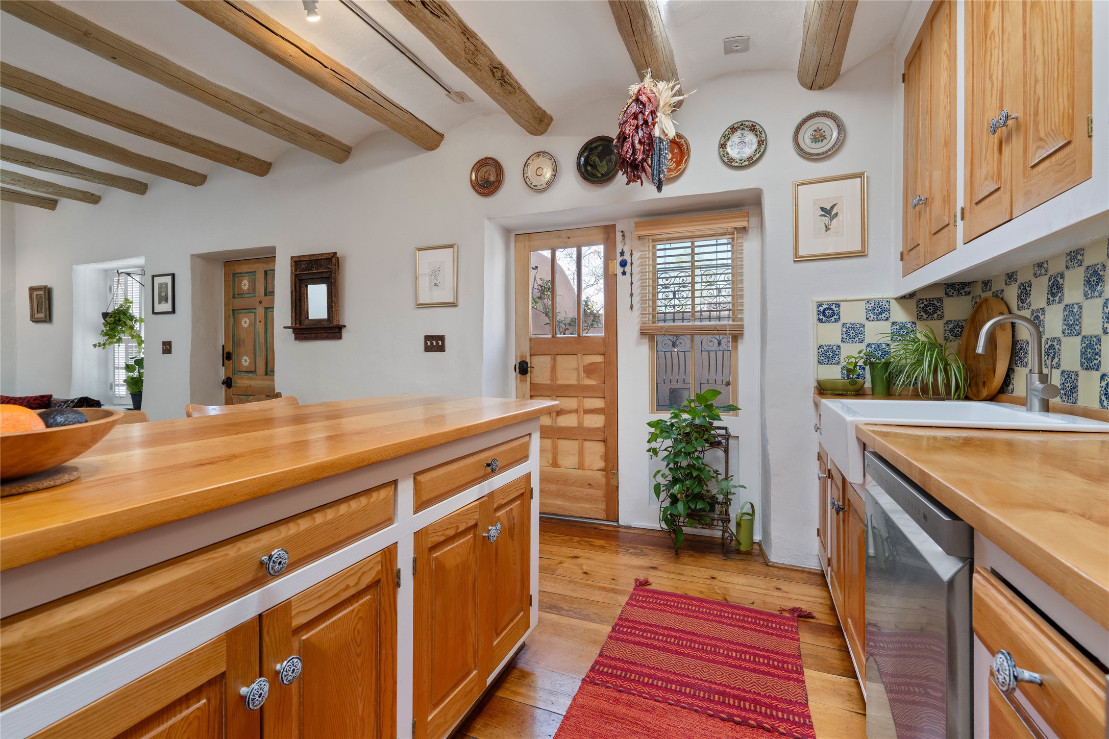 Elegant Adobe Pied--Terre in Downtown Santa Fe-- Experience the charm, warmth, and style of true Santa Fe living in this beautifully restored, freestanding adobe home--just blocks from the historic Plaza, world-class museums, local shops, the Railyard District, and an abundance of restaurants.Thoughtfully designed with classic Southwestern details and modern upgrades, this sophisticated corner-lot residence features sculpted coved and beamed ceilings, antique European doors, plaster walls, and deep window sills.The open-concept living, dining, and kitchen area is perfect for entertaining or relaxing. The living area has rich, wide wood plank floors and a kiva fireplace. The kitchen has vintage-inspired touches including a farmhouse sink and retro tile and upgraded appliances. The spacious primary suite features a tranquil bedroom, an en-suite bathroom, and seating area with kiva fireplace. It has a new traditional encaustic tile floor, the tiles are handcrafted by a local artist. Eight skylights throughout the home fill it with natural light, while two private courtyards--serene outdoor living spaces. One courtyard has a small shed for storage. Adobe walls offer peace and privacy and two efficient ductless mini-split units ensure comfort and low maintenance.Additional features include a washer/dryer, ample closet space, stone pathway, and one private off-street parking space. With no HOA fees, this home makes an ideal full-time residence, luxury rental, or dreamy downtown getaway for anyone seeking the magic of Old Santa Fe with modern comforts.