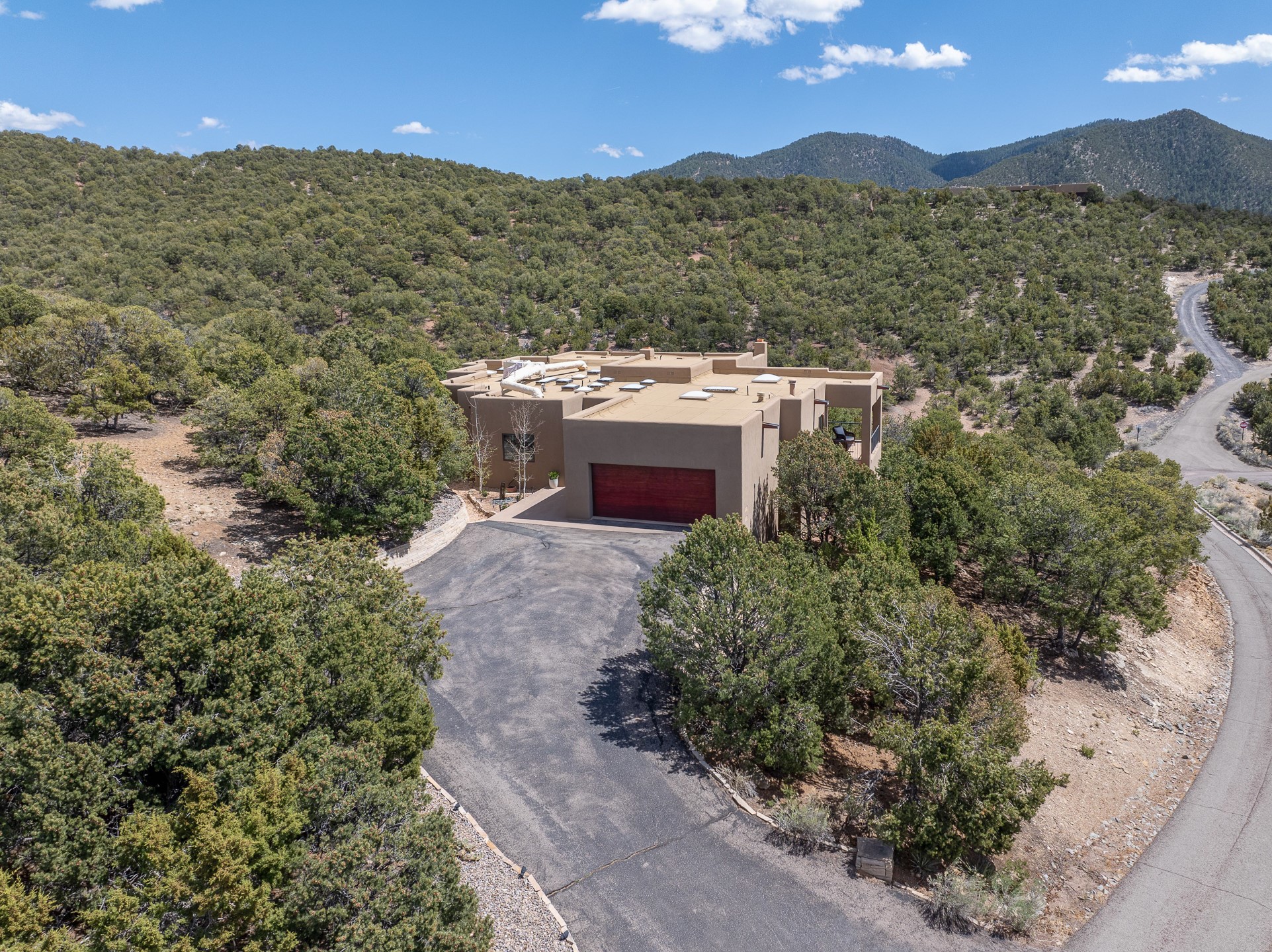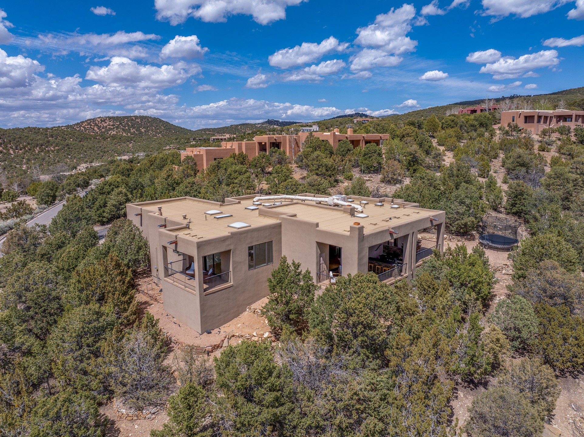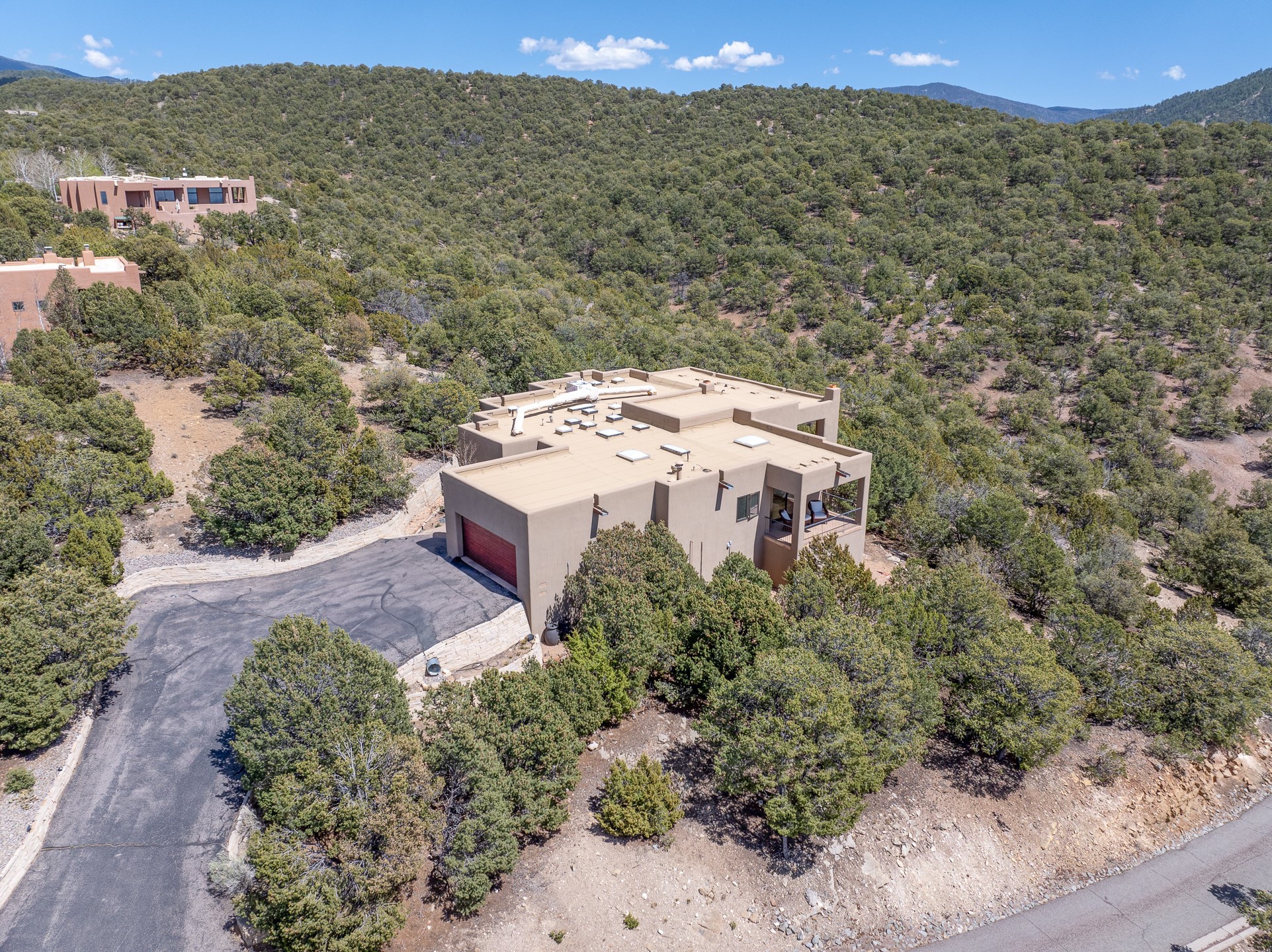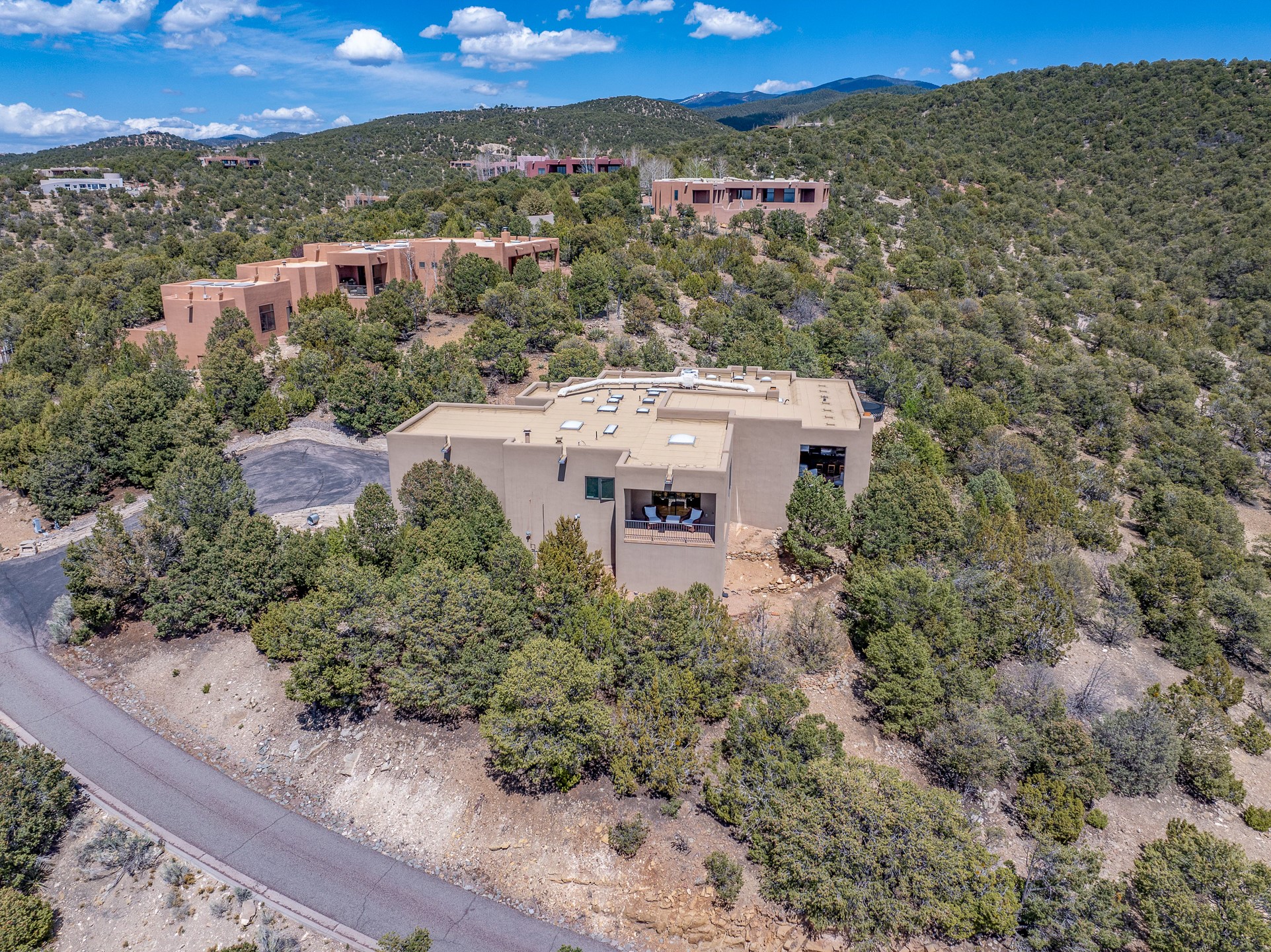 Modern Elegance in the Mountains -- A Sanctuary in the Sky-Built by award winning builder Fred Klein.Perched high above the city in the coveted Cerros Colorados community, find this breathtaking contemporary retreat where clean design meets timeless Santa Fe charm. Every moment in this 2,719- square-foot home is framed by expansive views of Sun and Moon Mountains, sparkling city lights, and the sweeping majesty of Northern New Mexico. For those who crave a connection to nature, this home is perfectly positioned with easy access to the Dale Ball Trails and on the scenic route to the Santa Fe Ski Basin. Inside, this 3-bedroom, 3-bath home has been thoughtfully updated with a modern aesthetic that still honors the spirit of Santa Fe. Wide-plank oak floors and smooth white plaster walls create a calming, gallery-like backdrop for art and life. The living room, with its wood-burning fireplace and rustic cross-beamed ceilings, offers a sense of grounded luxury--especially when the disappearing glass wall opens to a stunning portal that blurs the line between indoors and out. Imagine evenings here: cozying up by the outdoor fireplace, sharing stories around the built-in grill and bar, the scent of pion in the air, and stars stretching across a velvet sky. Just above the living room, a spacious dining area opens to another patio--perfect for dinner with a view. The chef's kitchen is a dream: generous in space, fitted with Wolf and Sub-Zero appliances, new stone countertops, and a tasteful tile backsplash. The primary suite is a private retreat with its own secluded patio--a quiet space to greet the day or wind down under the stars. The ensuite bath is pure indulgence, with double vanities, a deep soaking tub, and beautiful stone and tile finishes. Even the laundry and mudroom are designed with intention, offering a stylish and functional drop zone for gear, coats, and everyday living. Whether you're seeking stillness or adventure, this home offers both in a setting that inspires every day.