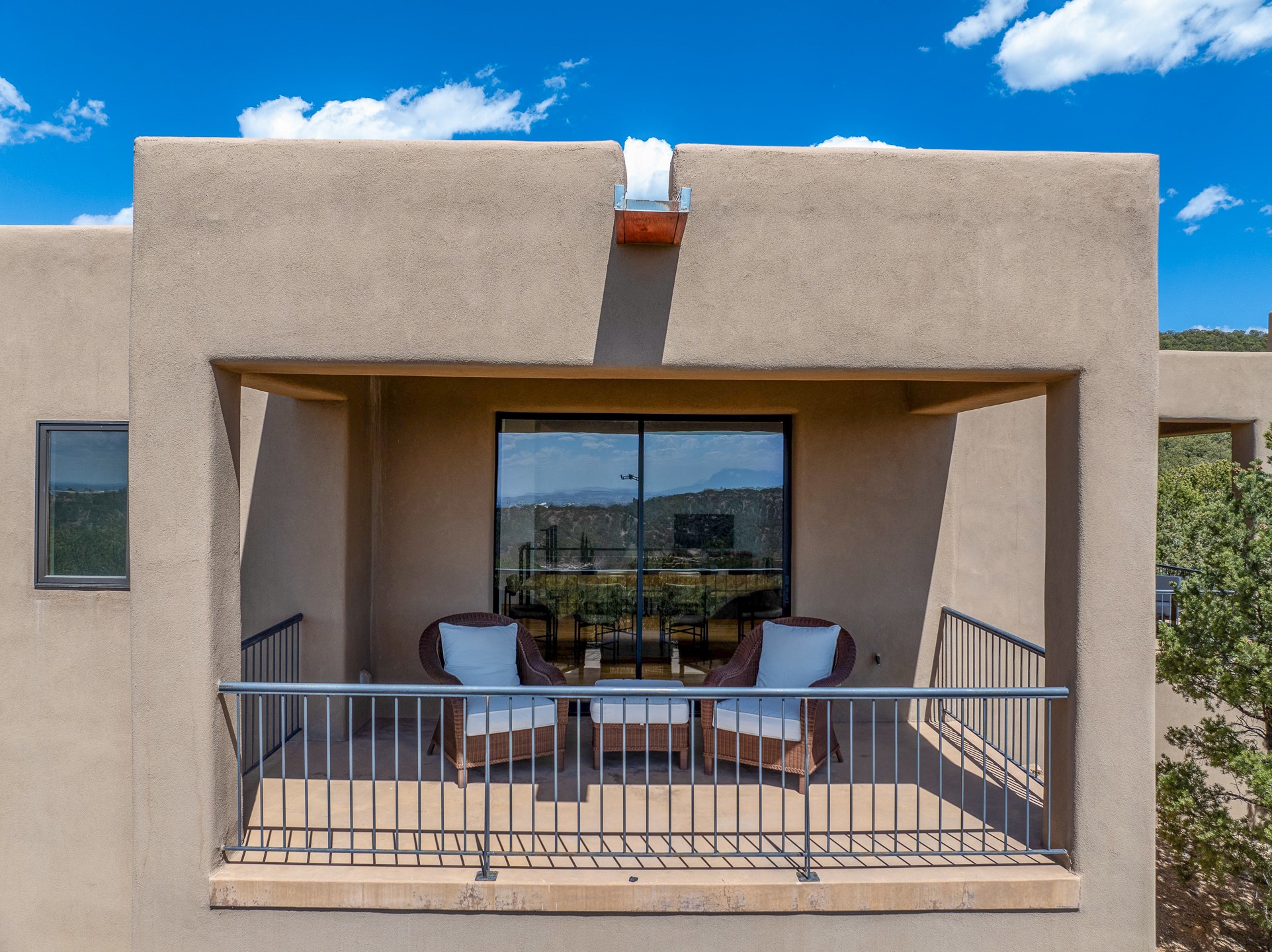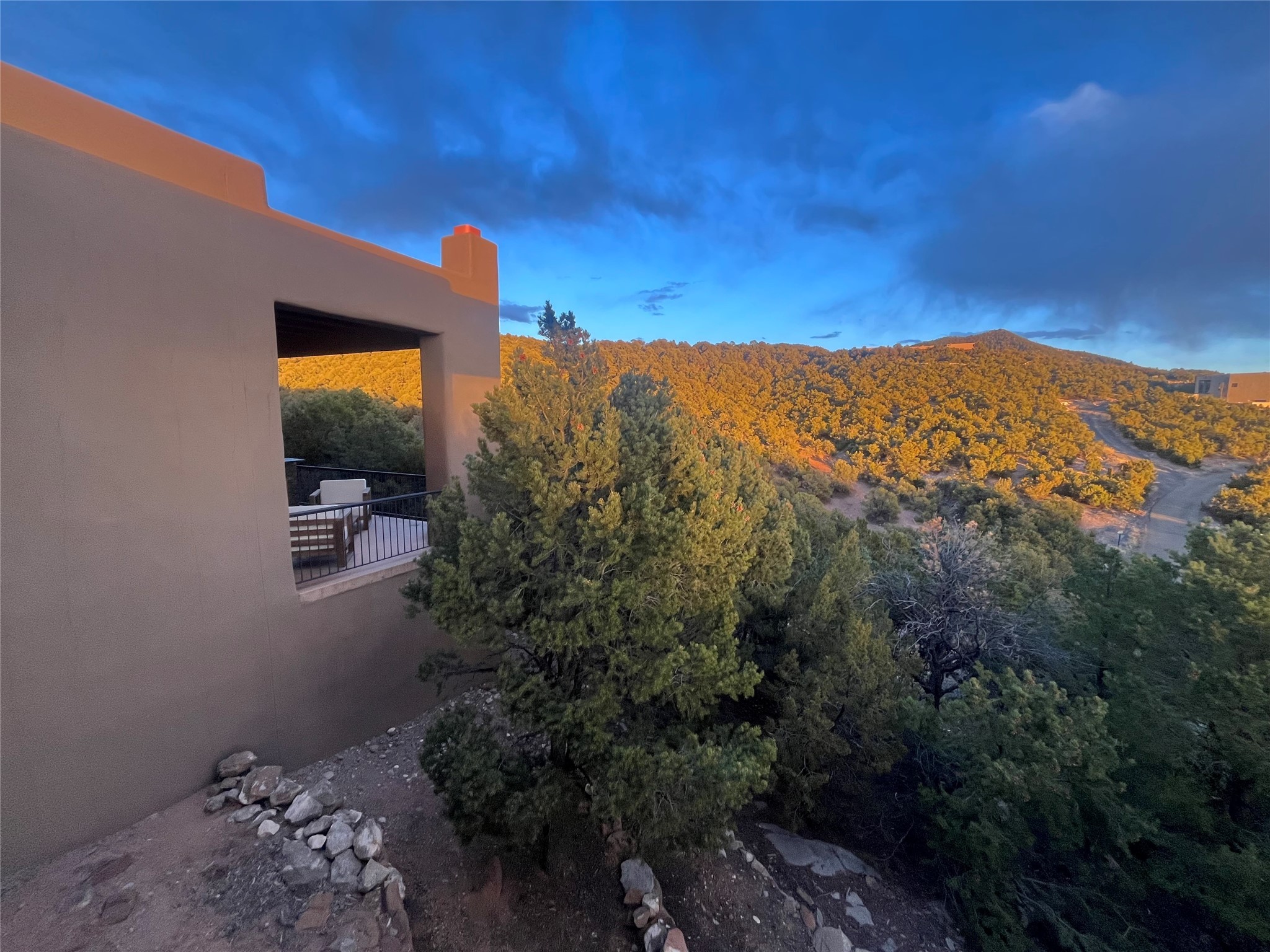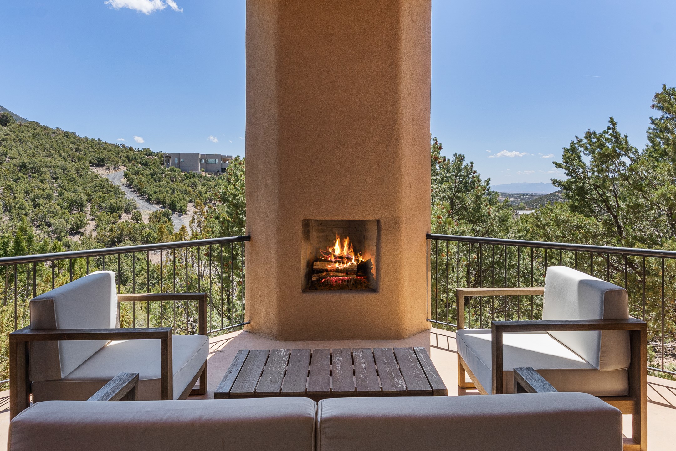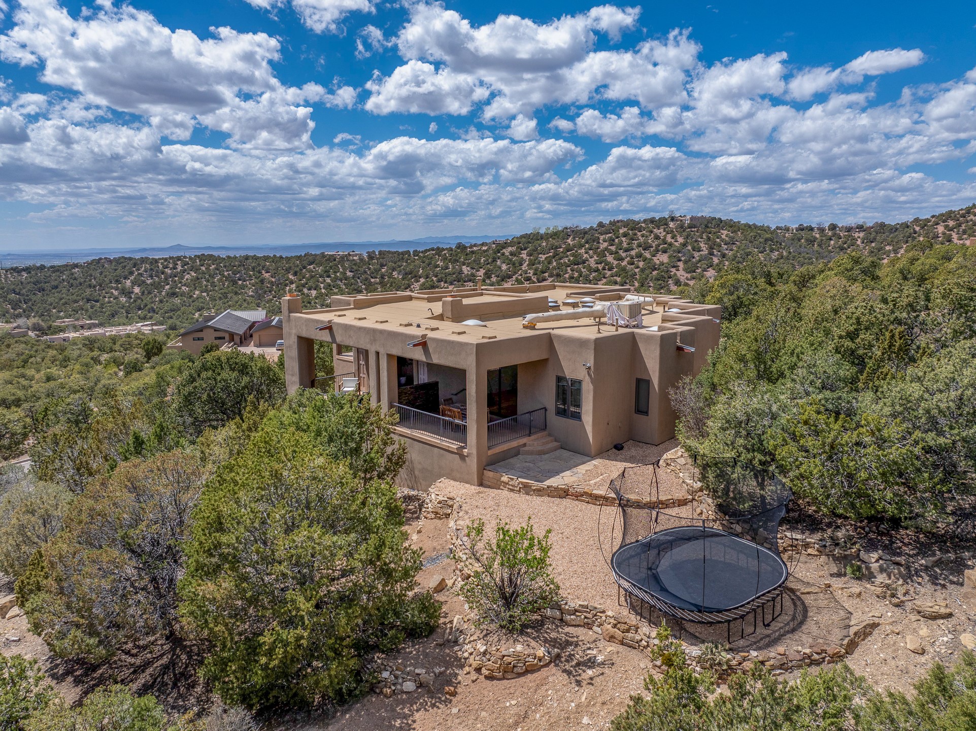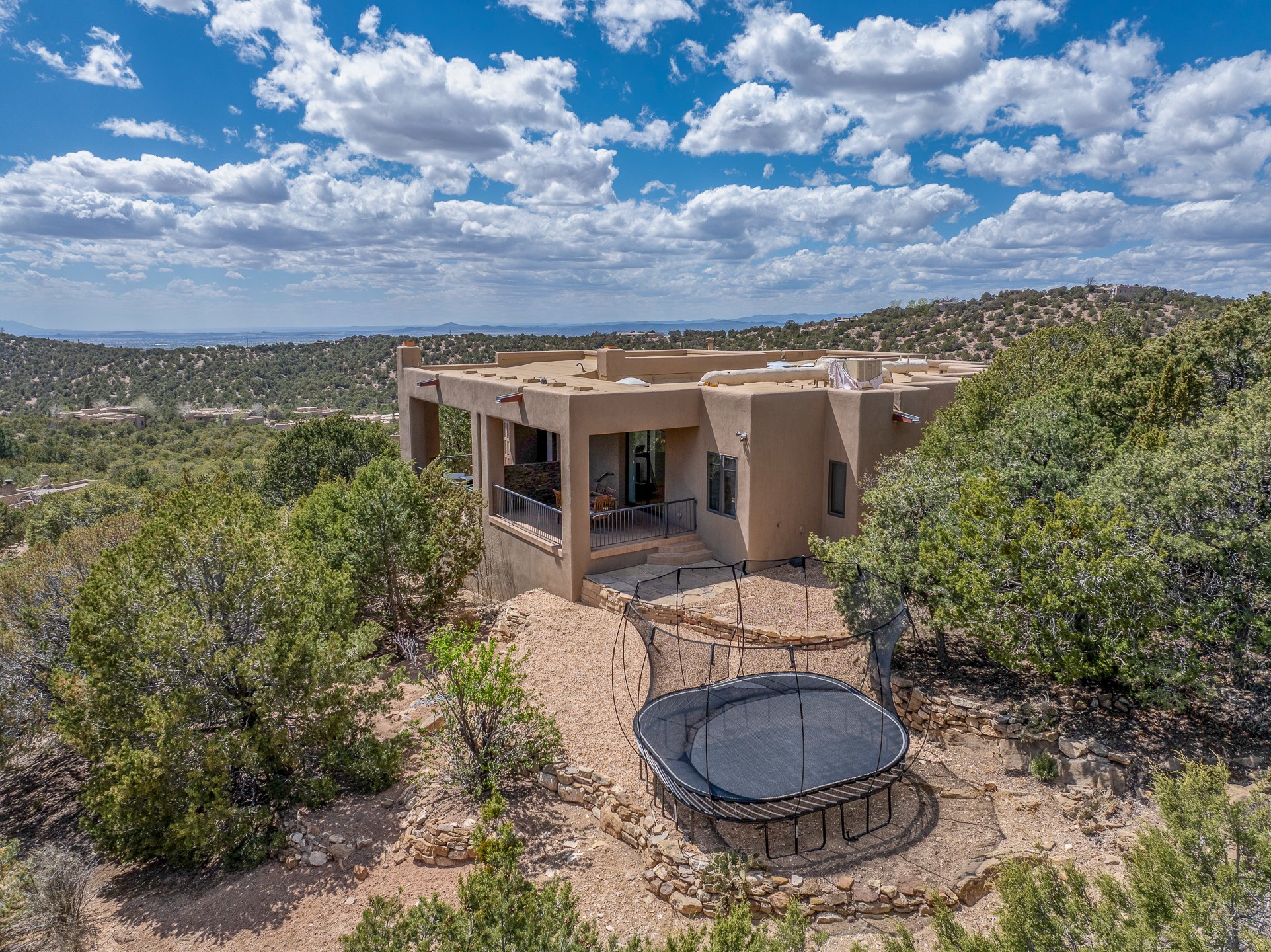 Modern Elegance in the Mountains -- A Sanctuary in the Sky-Built by award winning builder Fred Klein.Perched high above the city in the coveted Cerros Colorados community, find this breathtaking contemporary retreat where clean design meets timeless Santa Fe charm. Every moment in this 2,719- square-foot home is framed by expansive views of Sun and Moon Mountains, sparkling city lights, and the sweeping majesty of Northern New Mexico. For those who crave a connection to nature, this home is perfectly positioned with easy access to the Dale Ball Trails and on the scenic route to the Santa Fe Ski Basin. Inside, this 3-bedroom, 3-bath home has been thoughtfully updated with a modern aesthetic that still honors the spirit of Santa Fe. Wide-plank oak floors and smooth white plaster walls create a calming, gallery-like backdrop for art and life. The living room, with its wood-burning fireplace and rustic cross-beamed ceilings, offers a sense of grounded luxury--especially when the disappearing glass wall opens to a stunning portal that blurs the line between indoors and out. Imagine evenings here: cozying up by the outdoor fireplace, sharing stories around the built-in grill and bar, the scent of pion in the air, and stars stretching across a velvet sky. Just above the living room, a spacious dining area opens to another patio--perfect for dinner with a view. The chef's kitchen is a dream: generous in space, fitted with Wolf and Sub-Zero appliances, new stone countertops, and a tasteful tile backsplash. The primary suite is a private retreat with its own secluded patio--a quiet space to greet the day or wind down under the stars. The ensuite bath is pure indulgence, with double vanities, a deep soaking tub, and beautiful stone and tile finishes. Even the laundry and mudroom are designed with intention, offering a stylish and functional drop zone for gear, coats, and everyday living. Whether you're seeking stillness or adventure, this home offers both in a setting that inspires every day.