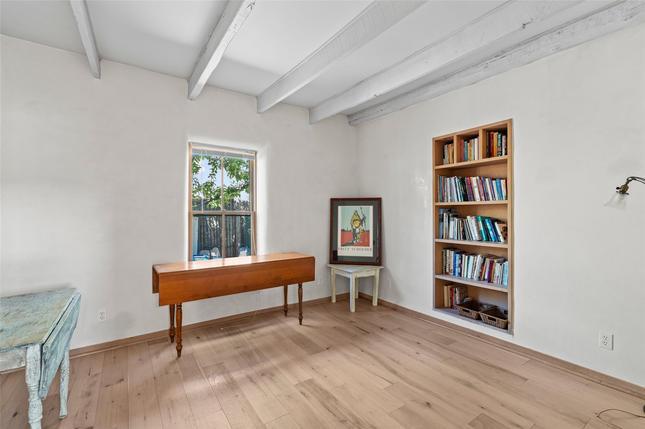 Located in the desirable Railyard district, this lovely 3 bedroom/2 bath single-level home combines modern comfort and traditional Sante Fe charm. The renovated adobe features an open concept living, dining and kitchen area with plastered walls, a wood-burning kiva fireplace, brick floors, beams with tongue and groove wood ceilings, skylights and recessed windows. The primary bedroom is an addition to the property - of frame construction with a vaulted, beamed ceiling, a walk-in closet and a three-quarter bath with beautifully tiled shower. The spacious outdoor area offers two separate patios perfect for dining, entertaining or just relaxing - one on the side of the home and one at the rear in the landscaped garden. Stone walls and coyote fences surround the property. Additional amenities include in-floor radiant heating, evaporative hallway cooling, three off-street parking spaces, a storage shed and new stucco applied in April 2025. Beautifully maintained and within walking to the Railyard, the Farmer's Market, restaurants and shopping, and the historic Santa Fe Plaza, this home is a jewel and not to be missed.