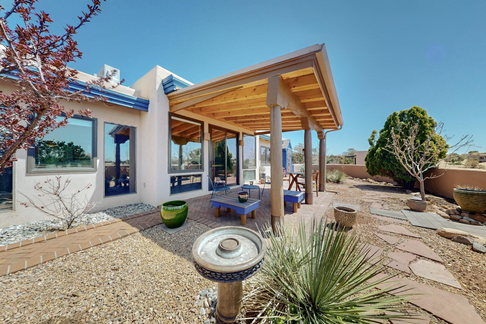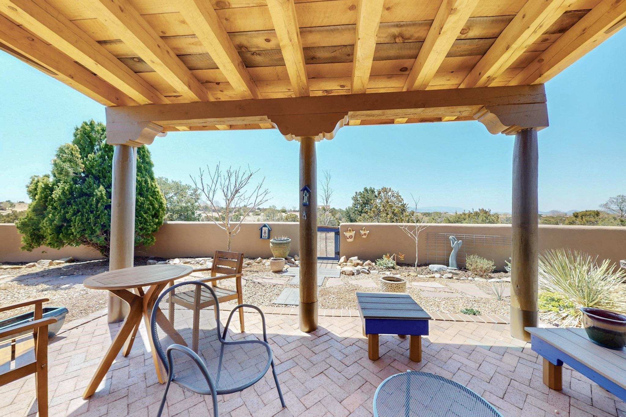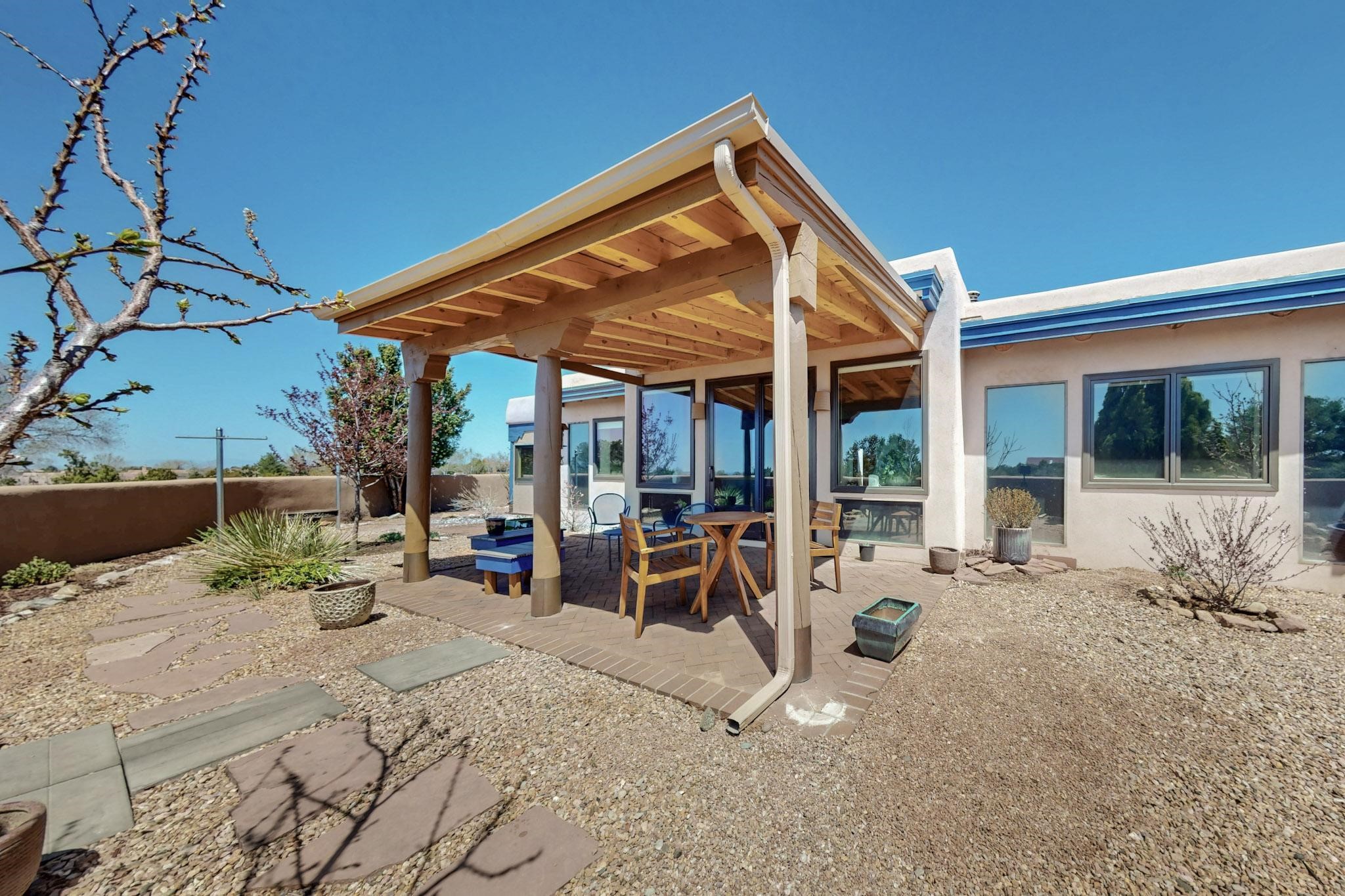 11 Chusco, is a wonderful passive solar home with paved access from Avenida Eldorado at the beginning of the subdivision. The home features living room with kiva fireplace, vigas and glass doors opening to the rear courtyard, formal dining room, Chef's kitchen, mud room, 3 bedrooms and 2 full baths. Recent upgrades include mini splits throughout, new roof in 2022, granite countertops & backsplashes in the kitchen and bathrooms, new Pella windows and appliances. The south side has thick trombe walls, creating both coolness in the summer and additional heat in the winter. The home is light and bright with clerestory windows for the rear bedrooms and large kitchen skylight in the kitchen. Both the front entry and rear have walled courtyards with extensive landscaping - fruit trees, perennial flowers, bushes as well as two storage sheds. There are Sangre de Cristo views from the front of the home and Sunset views from the back. For folks seeking a quality Eldorado home, 11 Chusco could be your place.