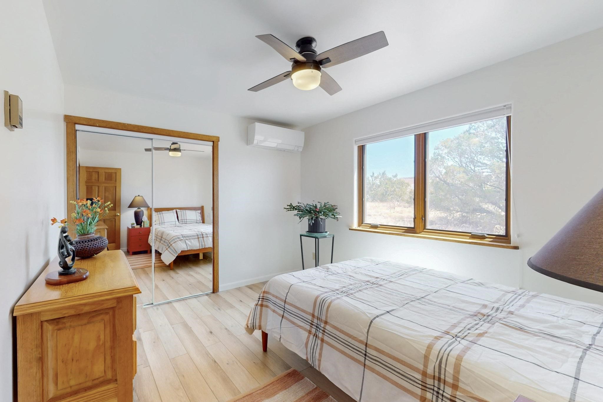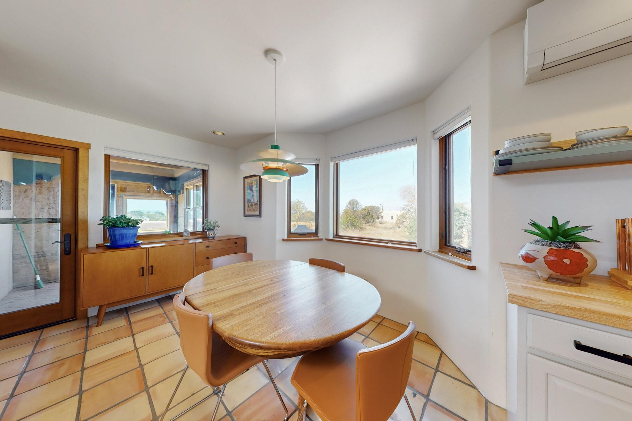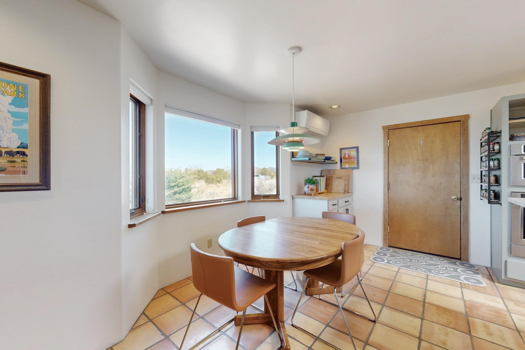 11 Chusco, is a wonderful passive solar home with paved access from Avenida Eldorado at the beginning of the subdivision. The home features living room with kiva fireplace, vigas and glass doors opening to the rear courtyard, formal dining room, Chef's kitchen, mud room, 3 bedrooms and 2 full baths. Recent upgrades include mini splits throughout, new roof in 2022, granite countertops & backsplashes in the kitchen and bathrooms, new Pella windows and appliances. The south side has thick trombe walls, creating both coolness in the summer and additional heat in the winter. The home is light and bright with clerestory windows for the rear bedrooms and large kitchen skylight in the kitchen. Both the front entry and rear have walled courtyards with extensive landscaping - fruit trees, perennial flowers, bushes as well as two storage sheds. There are Sangre de Cristo views from the front of the home and Sunset views from the back. For folks seeking a quality Eldorado home, 11 Chusco could be your place.