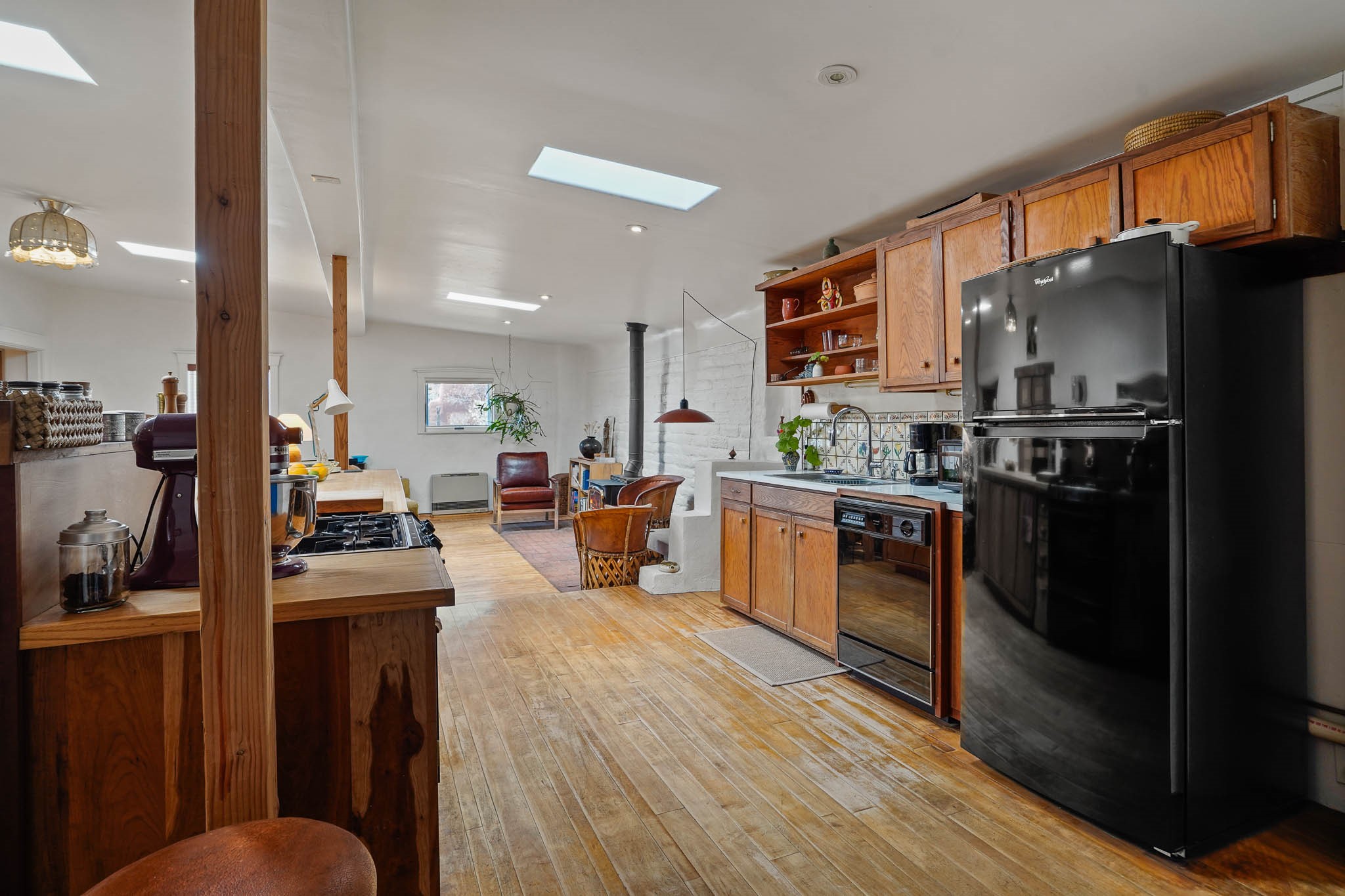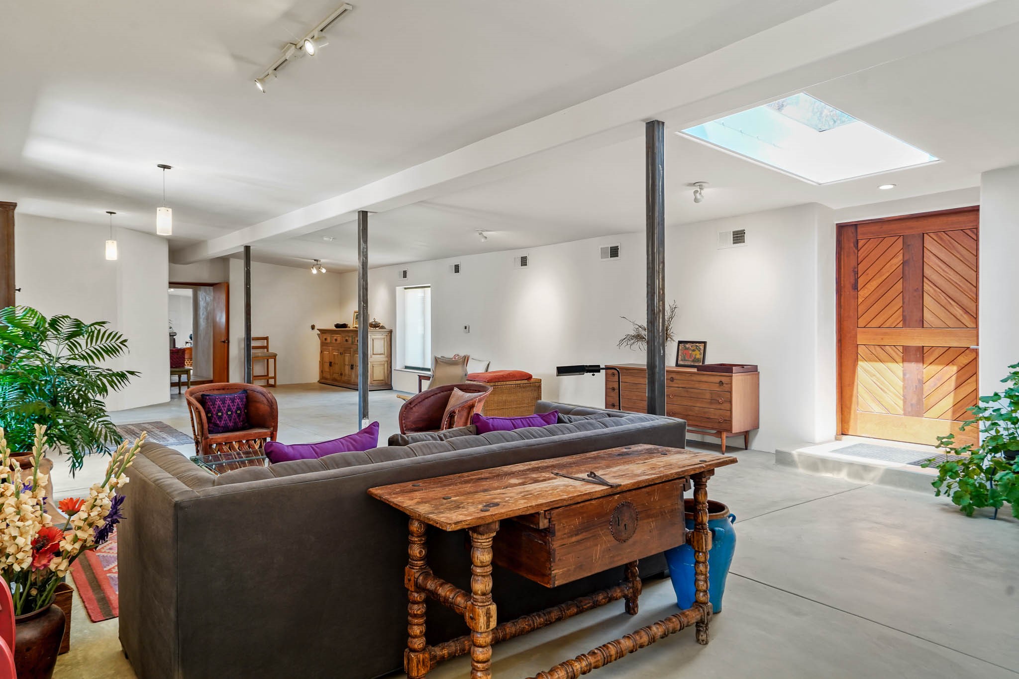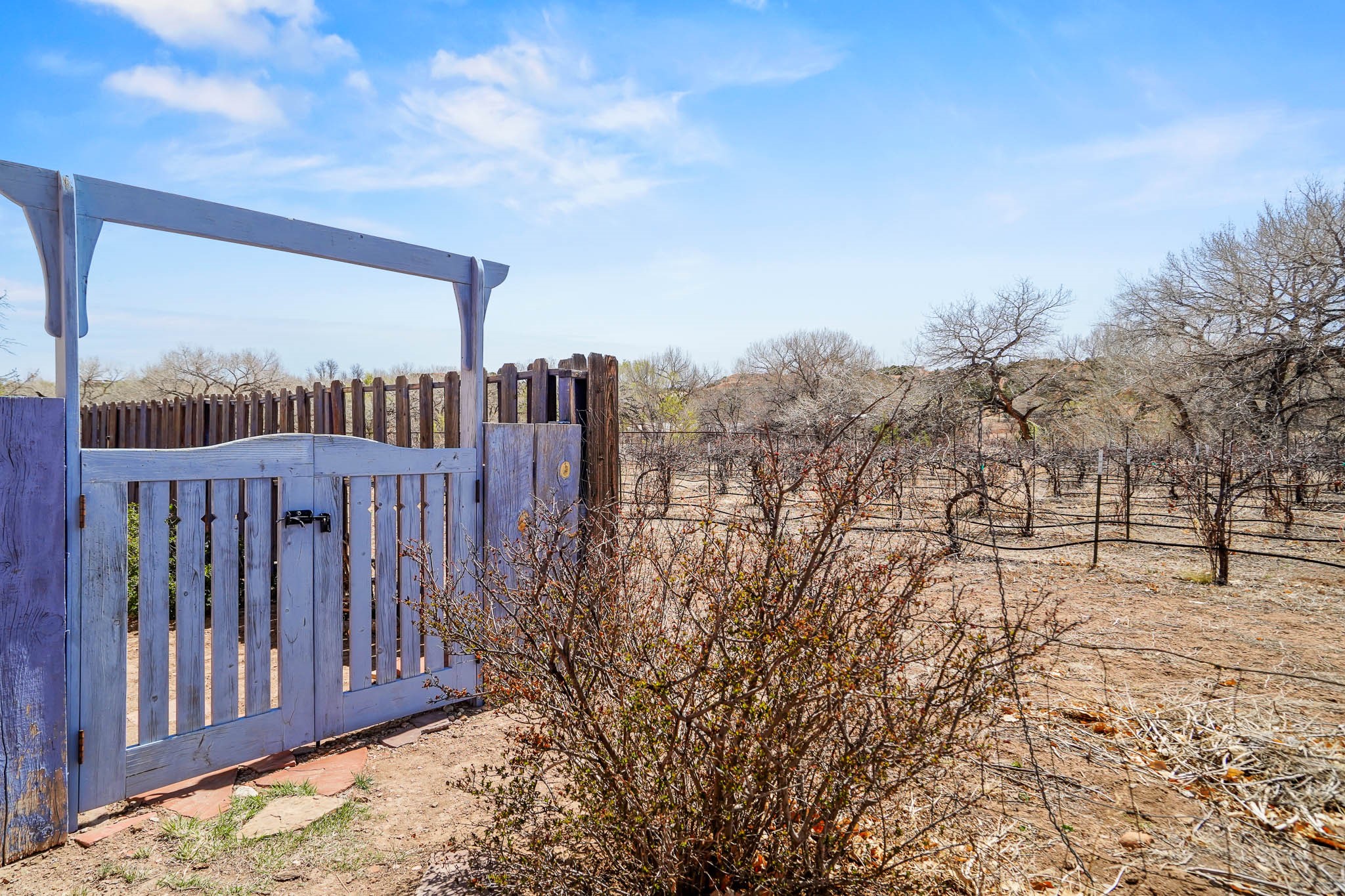 Incredible opportunity to own a super versatile getaway in the heart of La Cienega designed by notable architect Robert Zachry! Partial adobe home is an open concept 1 bed + flex space/2 bath oasis on over half an acre, surrounded by a vineyard, and ~3200sf of living. Entry foyer flows to large/wide family room & eat-in kitchen w/walk in pantry. Bright primary bedroom with large attached office/flex room, good closet space, & spa like passive solar bathroom w/brick flooring, tall ceilings, and windows/sunlight galore. Immense living room/open flex room + sunroom (with separate entrance) with concrete flooring could easily have a more traditional 2nd bedroom setup w/space for a full living room or be a separate studio/bonus space for an artist/musician/creative or roommate situation. Addt'l features include an open gated parking setup w/potential for garage or carport, chicken coop, acequia rights, regulated community system water, and separate storage outbuilding. Possible for multiple buyers from income or investment use, live/work hybrid, part time residents, artists/musicians/creatives/etc, or make your long term home for years to come