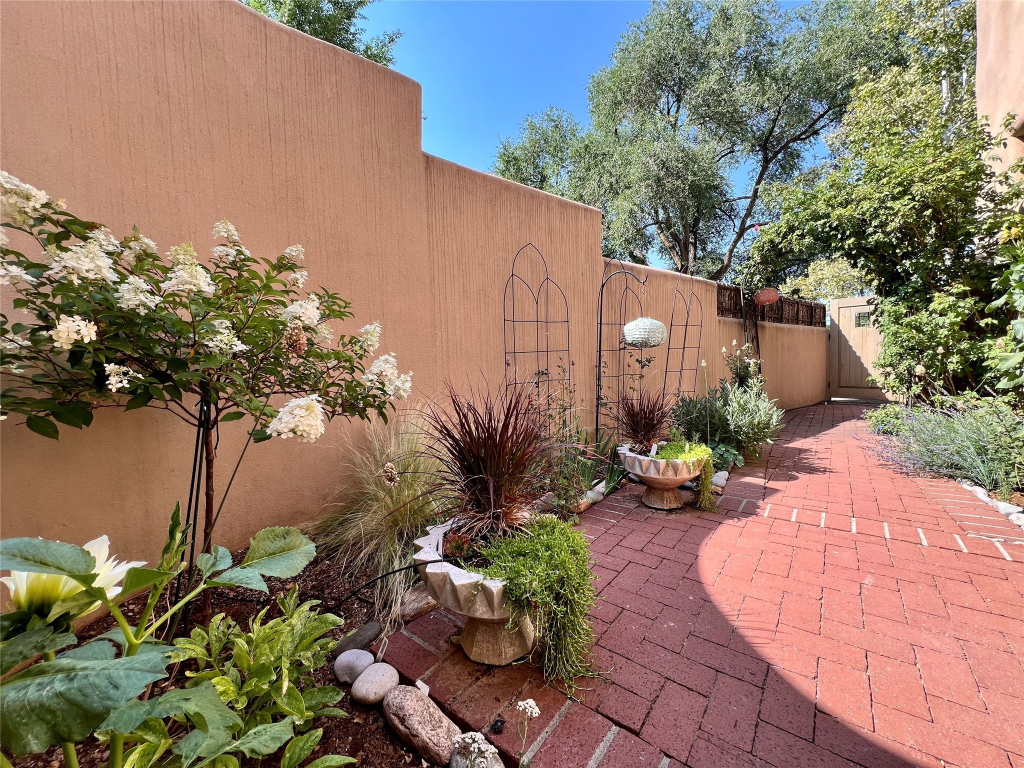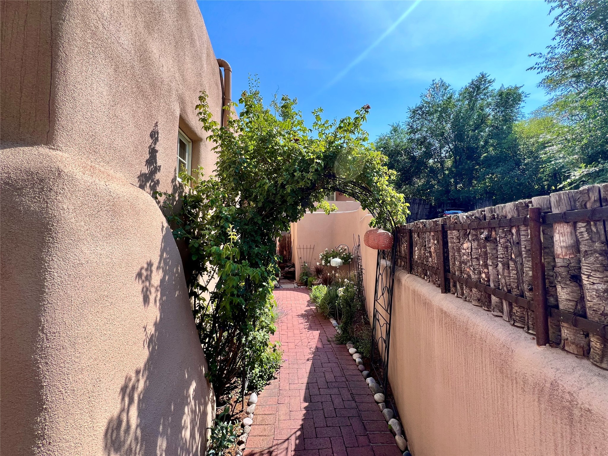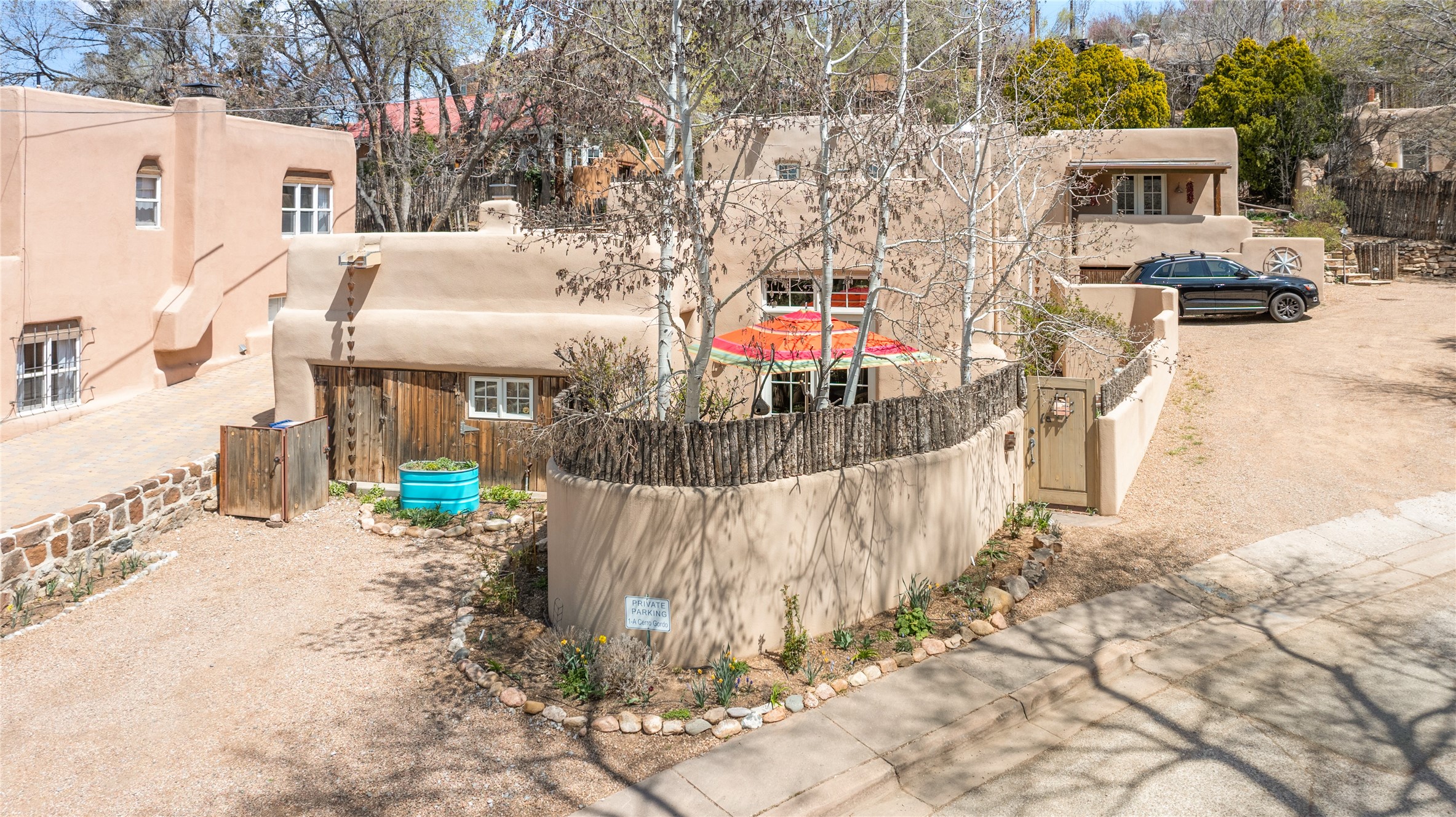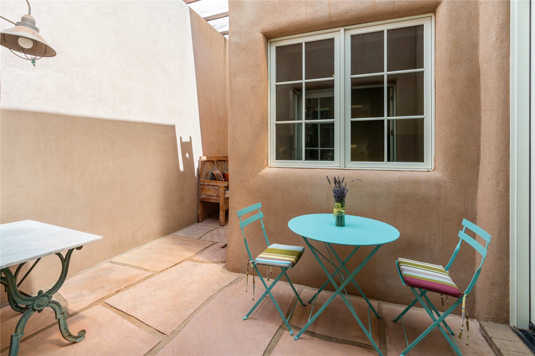 This historic Eastside home offers 1,322+/- Sq. Ft. of elegant living space, blending timeless Santa Fe charm with modern comfort. Designed by architect Michael Mahaffey and built in 2006 on the grounds of the 1926 Sheldon Parsons artist compound, it features a brand new roof, taupe-stone brick floors, tall alder wood doors, 2 wood-burning kiva fireplaces, skylights, and several glass French doors including one opening to a beautifully landscaped front patio. The interior walls are hand-plastered, adding warmth and texture to the space. Both the living area and bedroom boast high ceilings with wood beams, enhancing the open feel. The spacious bedroom suite offers a luxurious full bath and generous closet space. The kitchen flows into an open-concept living and dining area, perfect for relaxed living and entertaining. The front patio, framed by aspen, lilacs, and flower beds, offers privacy with wood gates and a walled perimeter, ideal for morning coffee or an evening meal. The low-maintenance landscaping has a drip irrigation system fed by a shared well. The back patio has an indoor-outdoor ambiance, reminiscent of a European pied--terre, offering serene architectural details and dappled light. This home is perfect for full-time living or as a "lock and leave" retreat. With its newly installed roof providing years of worry-free protection, and priced $302,000 below a recent appraisal (3/25), this property presents an exceptional value and an amazing opportunity to own a beautiful home in a highly sought-after location, just steps from the Santa Fe River Trail, Canyon Road, and a short stroll to the Plaza.