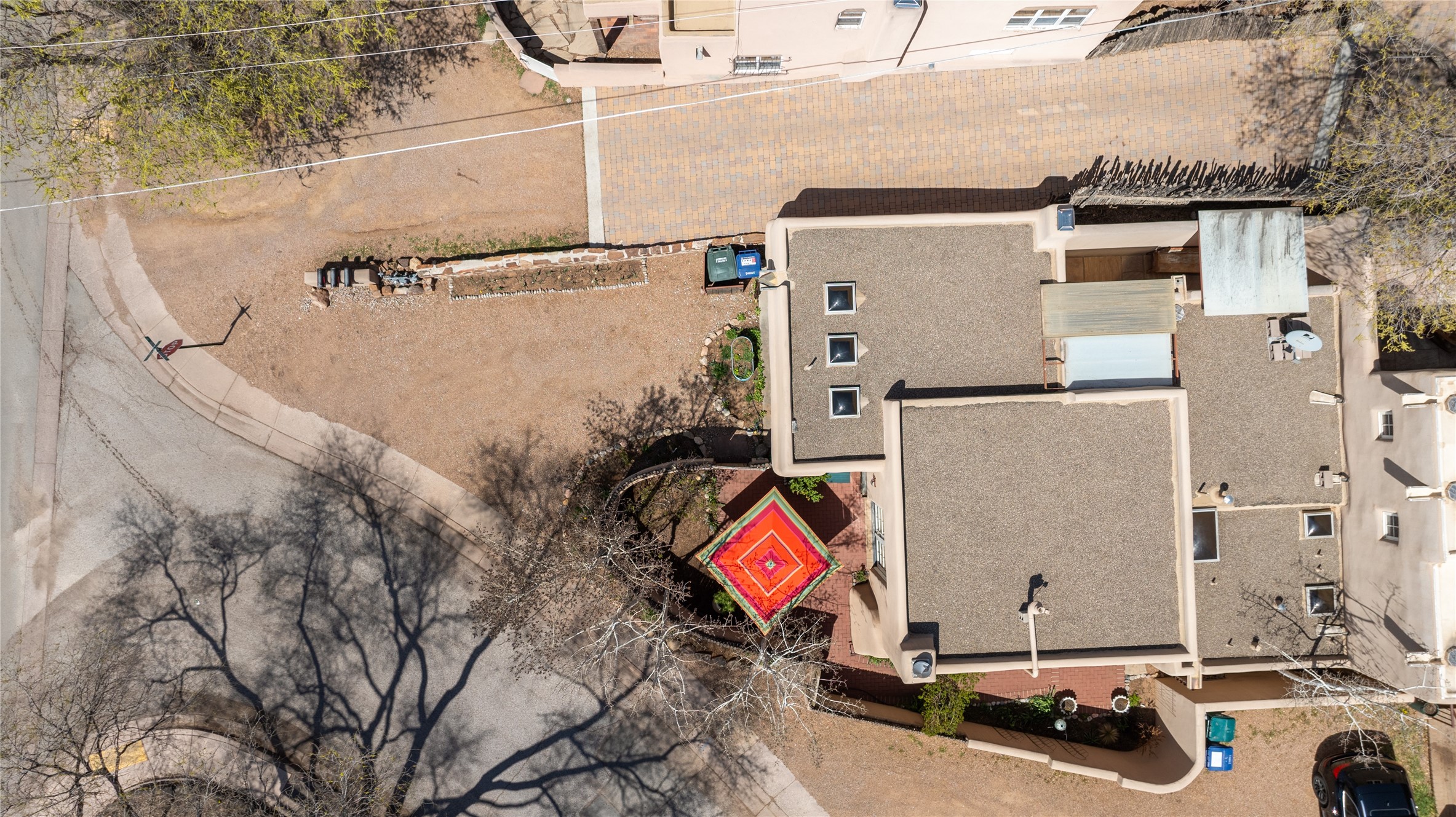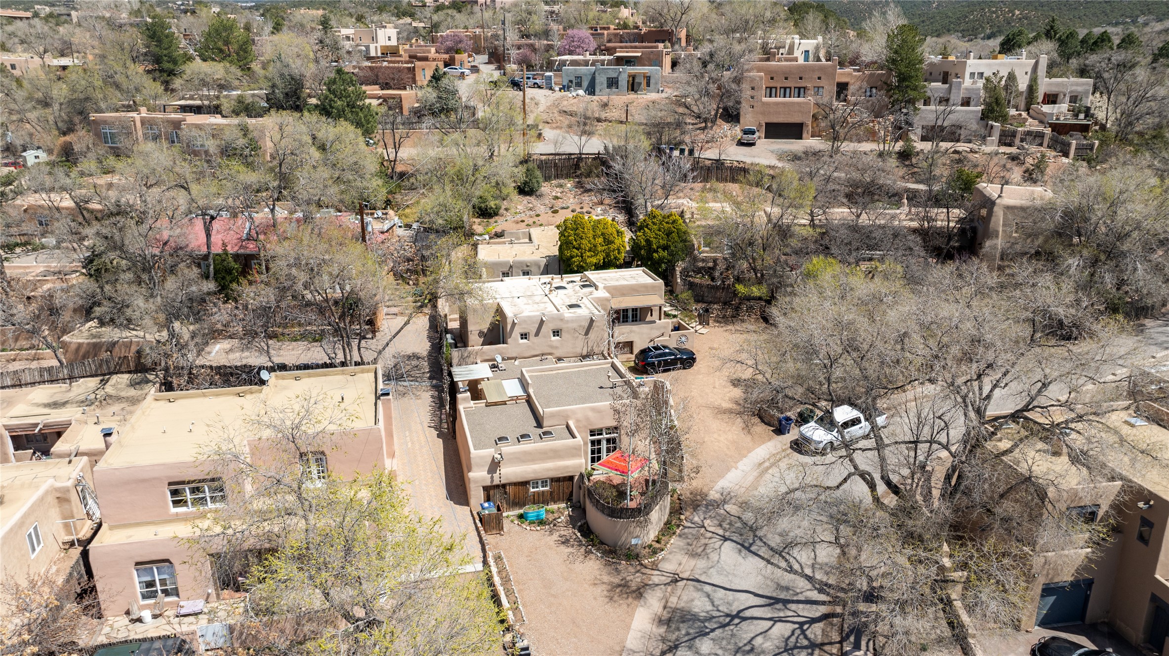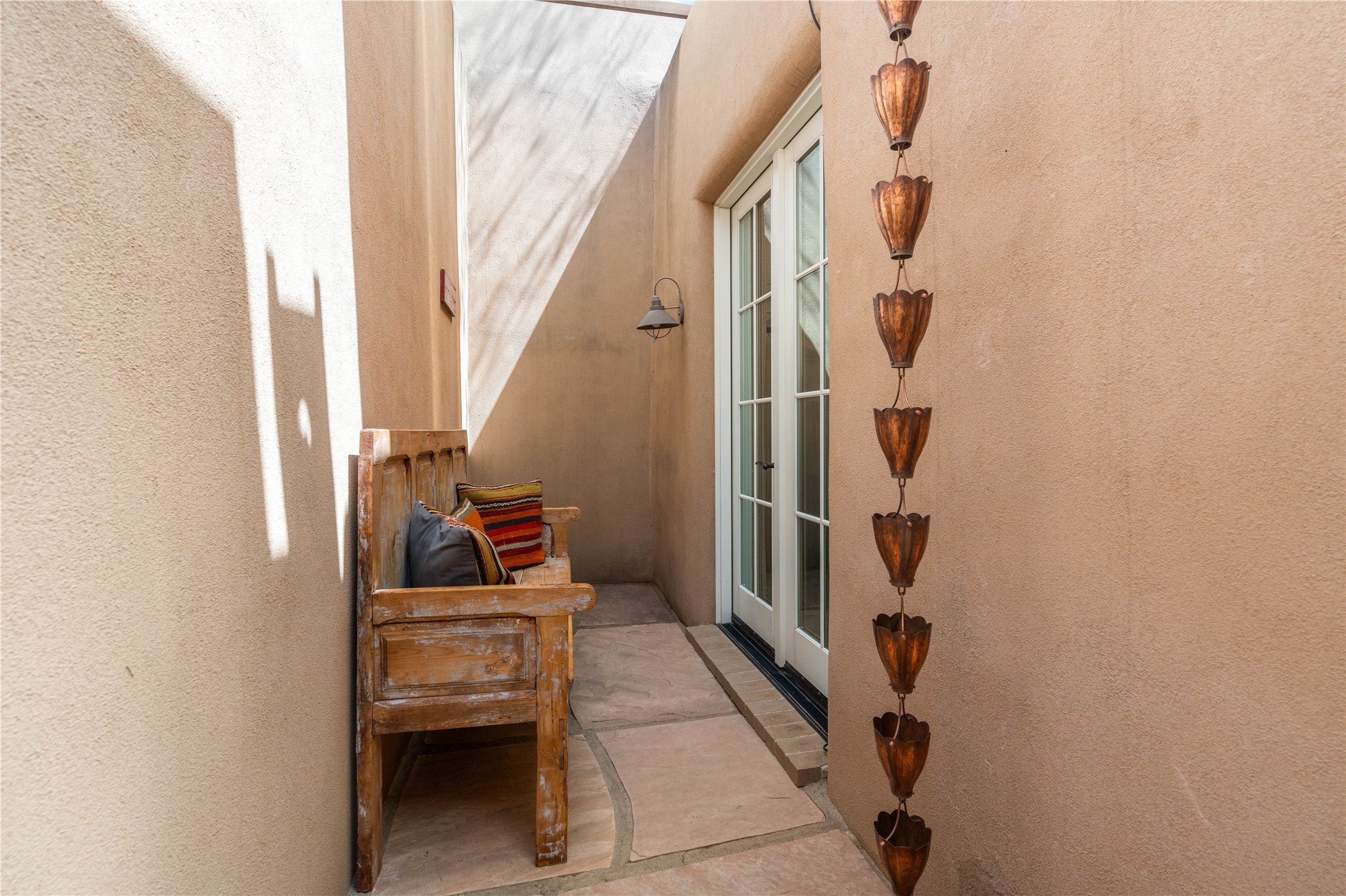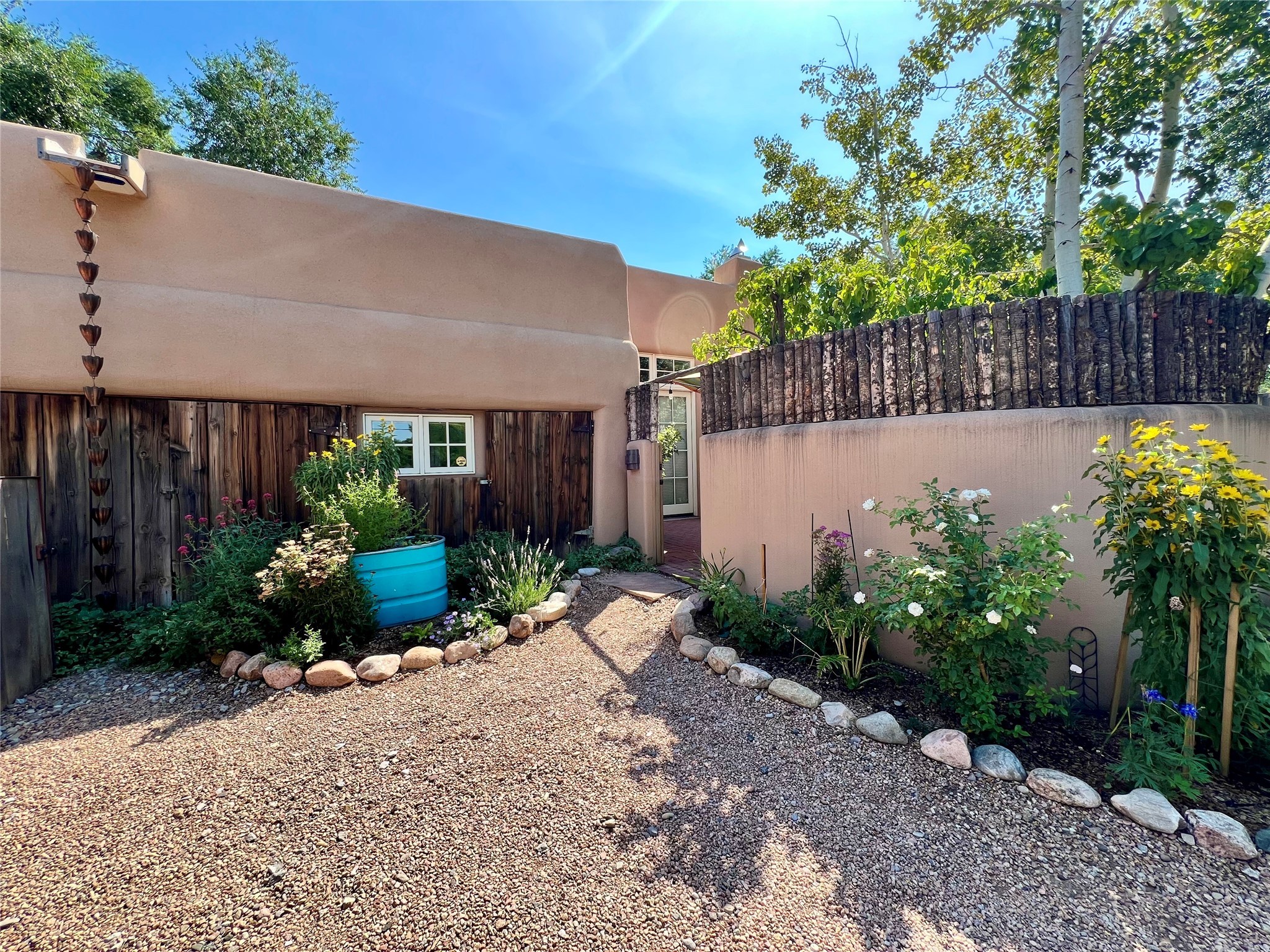 This historic Eastside home offers 1,322+/- Sq. Ft. of elegant living space, blending timeless Santa Fe charm with modern comfort. Designed by architect Michael Mahaffey and built in 2006 on the grounds of the 1926 Sheldon Parsons artist compound, it features a brand new roof, taupe-stone brick floors, tall alder wood doors, 2 wood-burning kiva fireplaces, skylights, and several glass French doors including one opening to a beautifully landscaped front patio. The interior walls are hand-plastered, adding warmth and texture to the space. Both the living area and bedroom boast high ceilings with wood beams, enhancing the open feel. The spacious bedroom suite offers a luxurious full bath and generous closet space. The kitchen flows into an open-concept living and dining area, perfect for relaxed living and entertaining. The front patio, framed by aspen, lilacs, and flower beds, offers privacy with wood gates and a walled perimeter, ideal for morning coffee or an evening meal. The low-maintenance landscaping has a drip irrigation system fed by a shared well. The back patio has an indoor-outdoor ambiance, reminiscent of a European pied--terre, offering serene architectural details and dappled light. This home is perfect for full-time living or as a "lock and leave" retreat. With its newly installed roof providing years of worry-free protection, and priced $302,000 below a recent appraisal (3/25), this property presents an exceptional value and an amazing opportunity to own a beautiful home in a highly sought-after location, just steps from the Santa Fe River Trail, Canyon Road, and a short stroll to the Plaza.