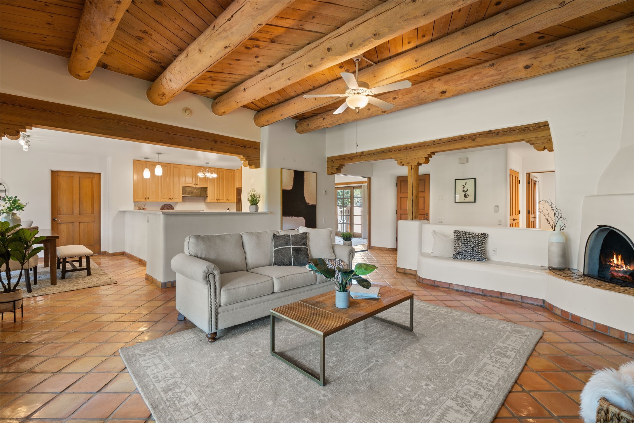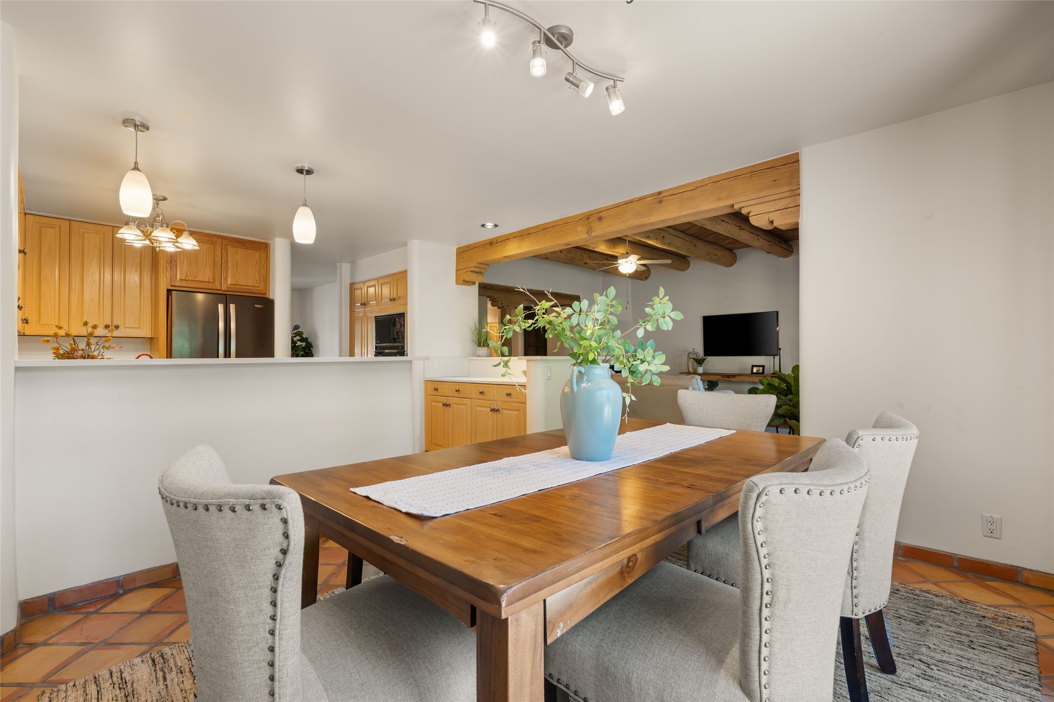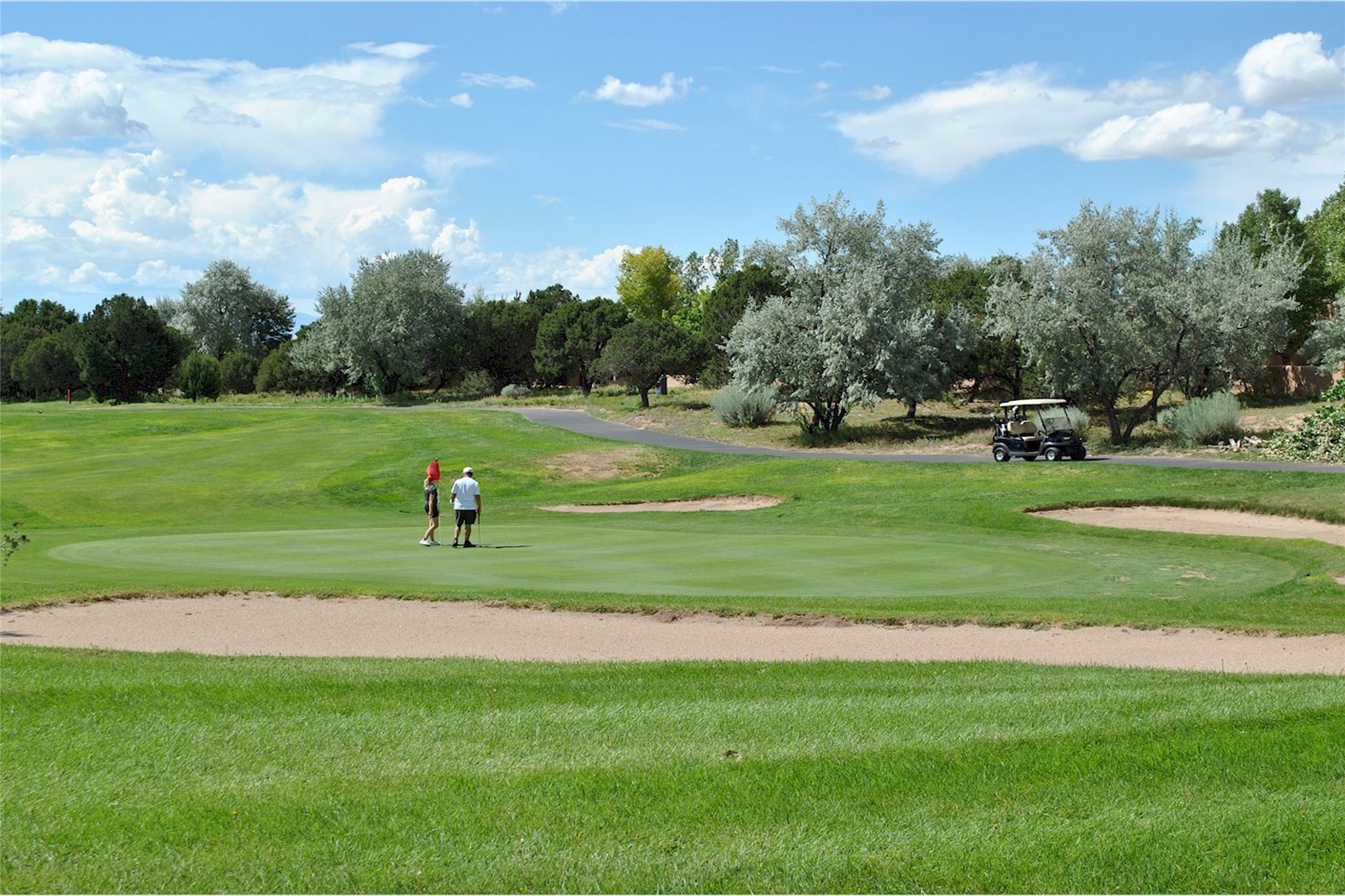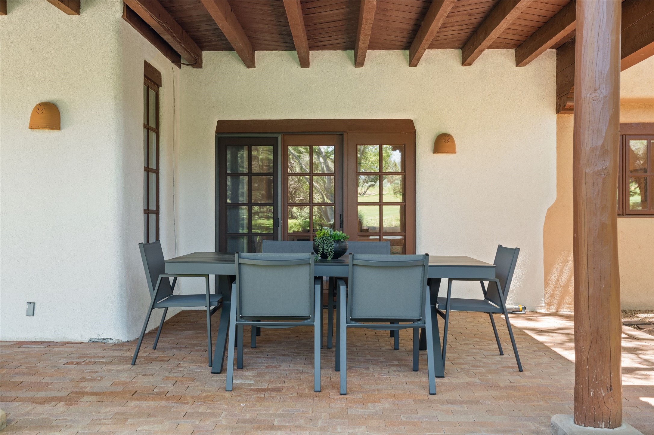 One of Quail Run's most coveted floorplans! The Pinon C is ideal with 2 spacious bedrooms and an office; just the right size to spread out and enjoy but not too much to maintain. This open space has plenty of light and Santa Fe charm with saltillo floors, 2 kiva fireplaces and vigas and beams throughout. Enjoy the lovely open kitchen and dining area which connects to a comfortable living room. Or relax outside in the ample portal with fabulous views of towering trees, the golf course, and those famously beautiful Santa Fe Skies. Abundant enjoyment to be had from this private, view-filled, expansive portal, truly special. Home ownership at Quail Run includes all the fantastic amenities such as 24 hour hosted security, state of the art workout areas and pool, varied fitness classes and social gatherings, pickleball, golf and much more; come and see!