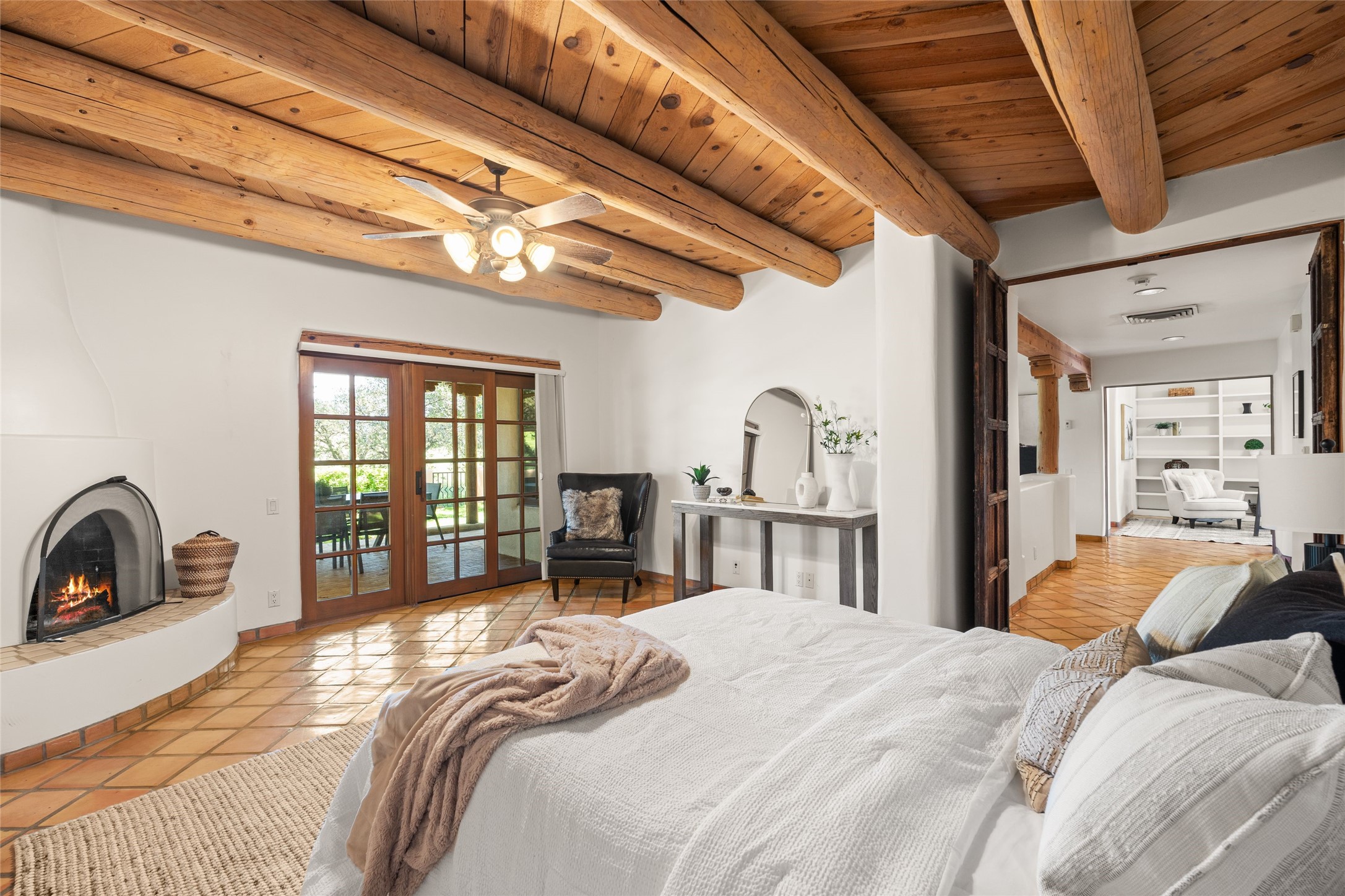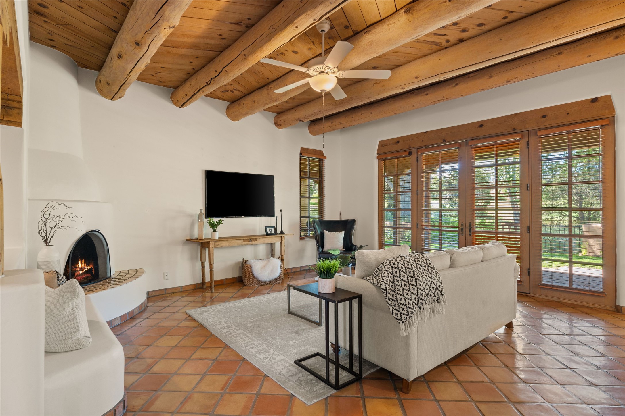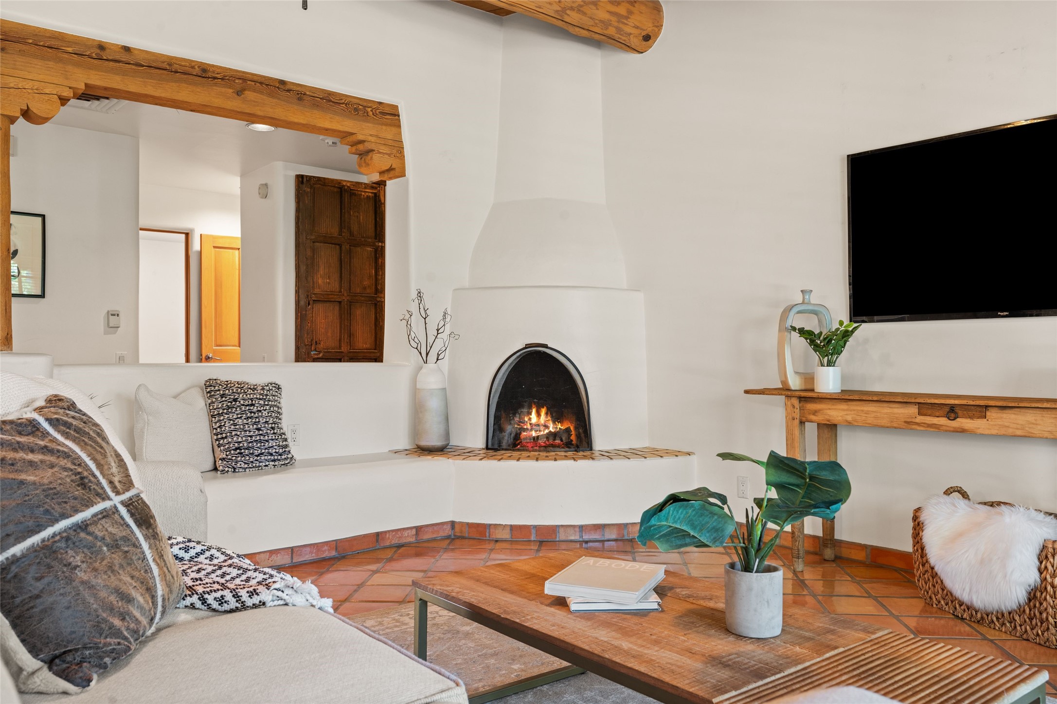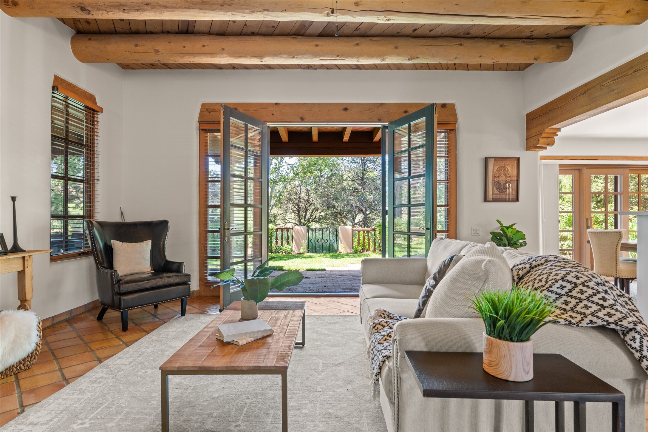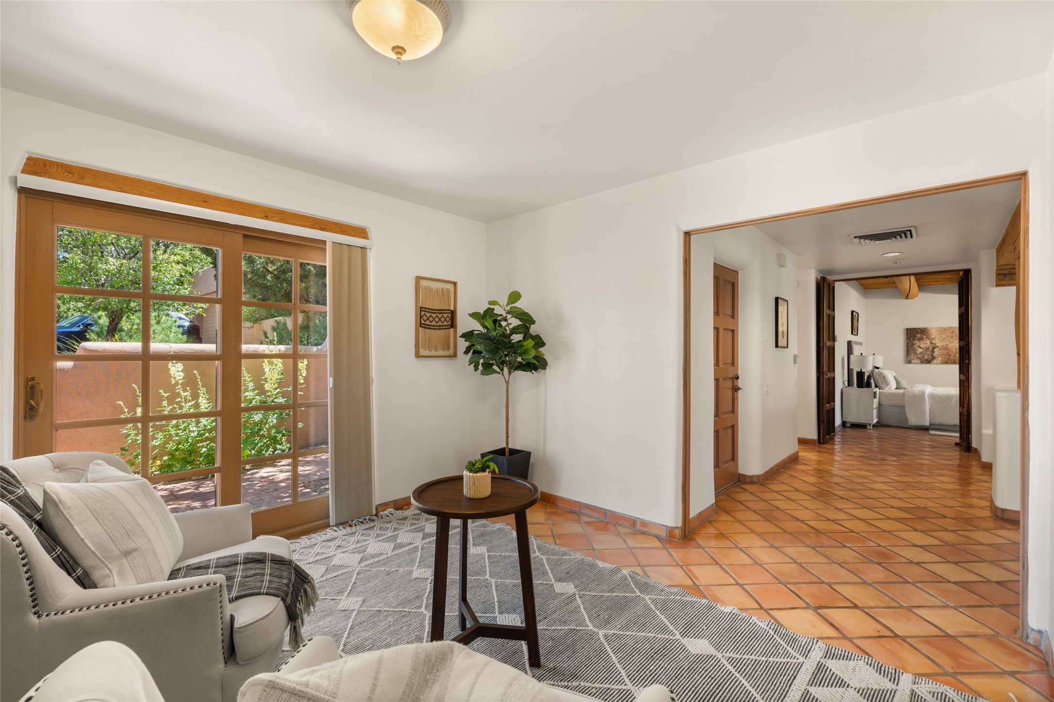 One of Quail Run's most coveted floorplans! The Pinon C is ideal with 2 spacious bedrooms and an office; just the right size to spread out and enjoy but not too much to maintain. This open space has plenty of light and Santa Fe charm with saltillo floors, 2 kiva fireplaces and vigas and beams throughout. Enjoy the lovely open kitchen and dining area which connects to a comfortable living room. Or relax outside in the ample portal with fabulous views of towering trees, the golf course, and those famously beautiful Santa Fe Skies. Abundant enjoyment to be had from this private, view-filled, expansive portal, truly special. Home ownership at Quail Run includes all the fantastic amenities such as 24 hour hosted security, state of the art workout areas and pool, varied fitness classes and social gatherings, pickleball, golf and much more; come and see!
