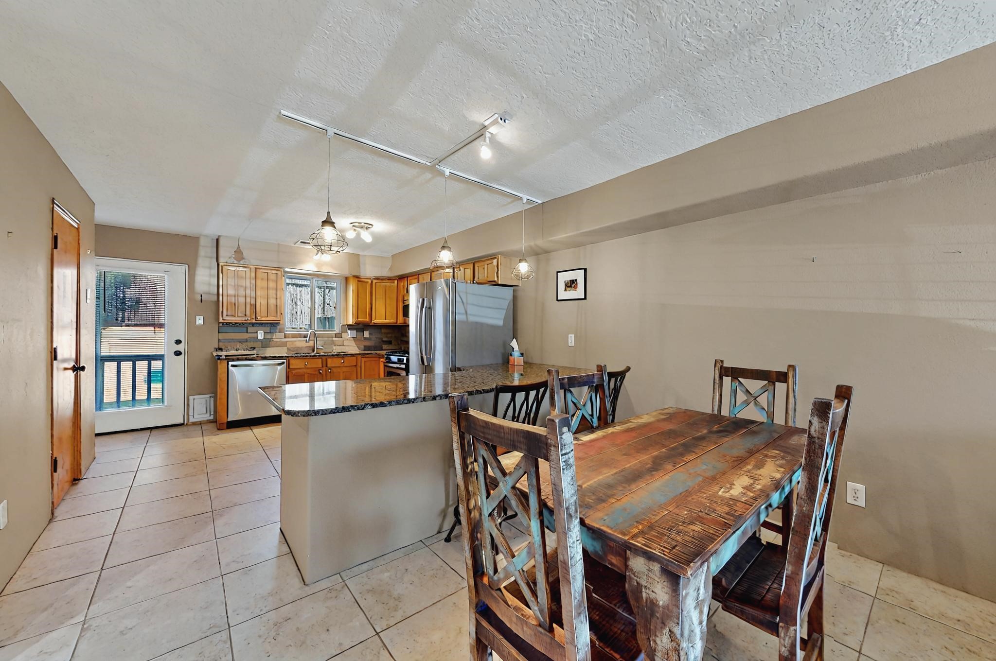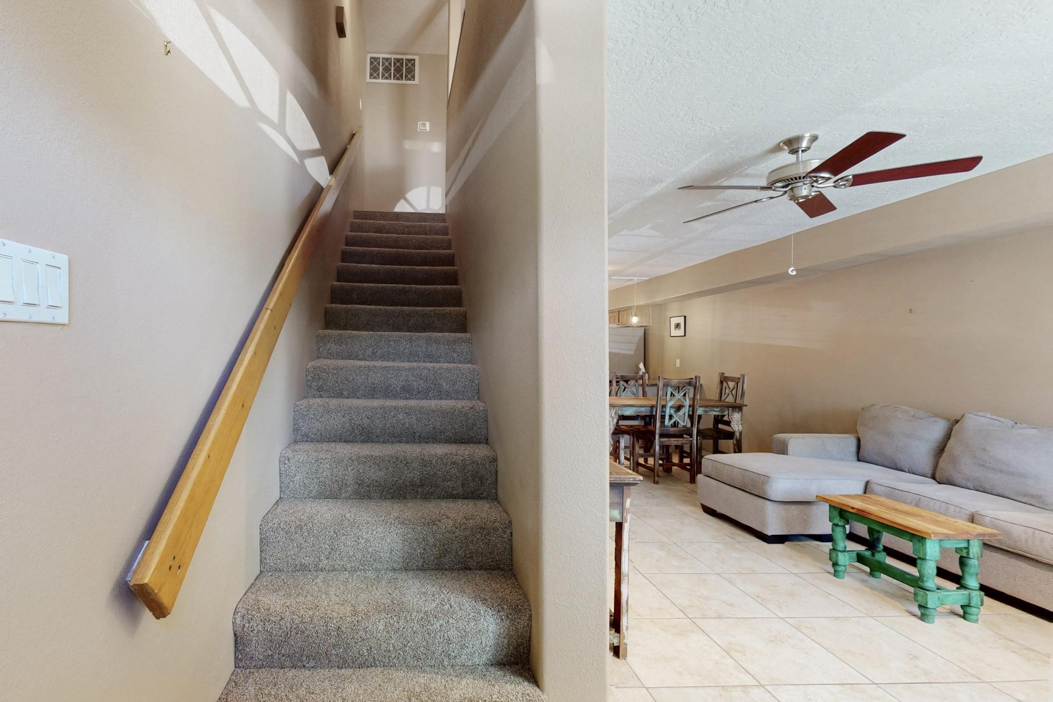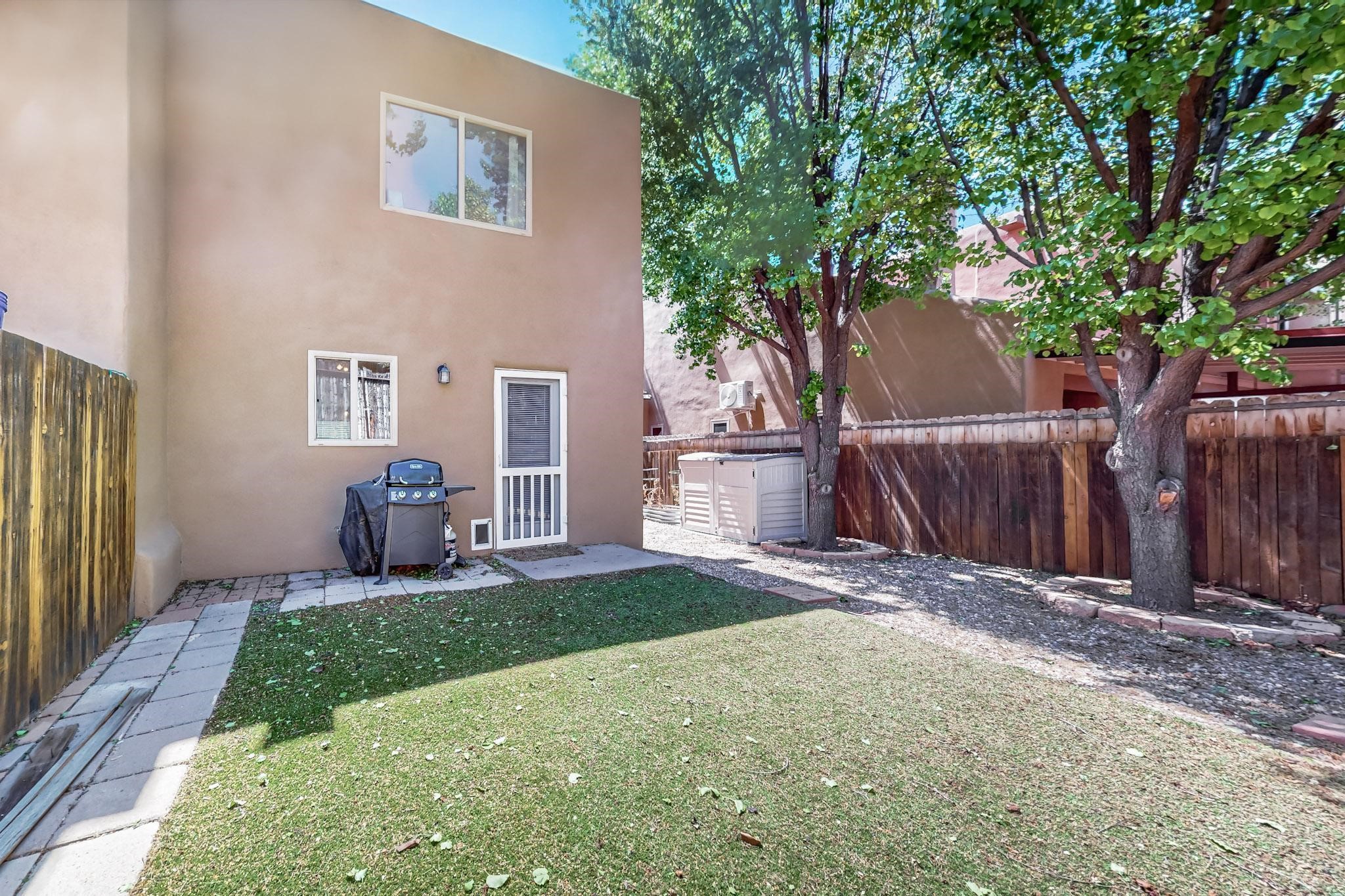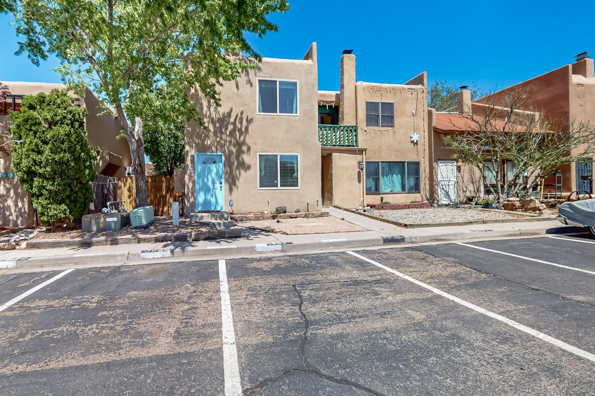 This is a charming townhome on an end lot. The convenient open floorplan includes a living room with a kiva fireplace leading to the dining area and kitchen with counter space for eating. Out the backdoor is a lovely sitting area with a small storage shed. There is also a 1/2 bath and a stacked washer/dryer downstairs. Upstairs are 2 bedrooms with views and a jack-&-jill bathroom. Central air was added; new hot water heater 2023; new laminate flooring upstairs, carpet on stairs, tile downstairs 2023; ADT security system 2023; fireplace cleaned and maintenance performed yearly; window added downstairs; additional over-head light added in the living room. Roof needs to be replaced and price has been adjusted accordingly. This is an estate.