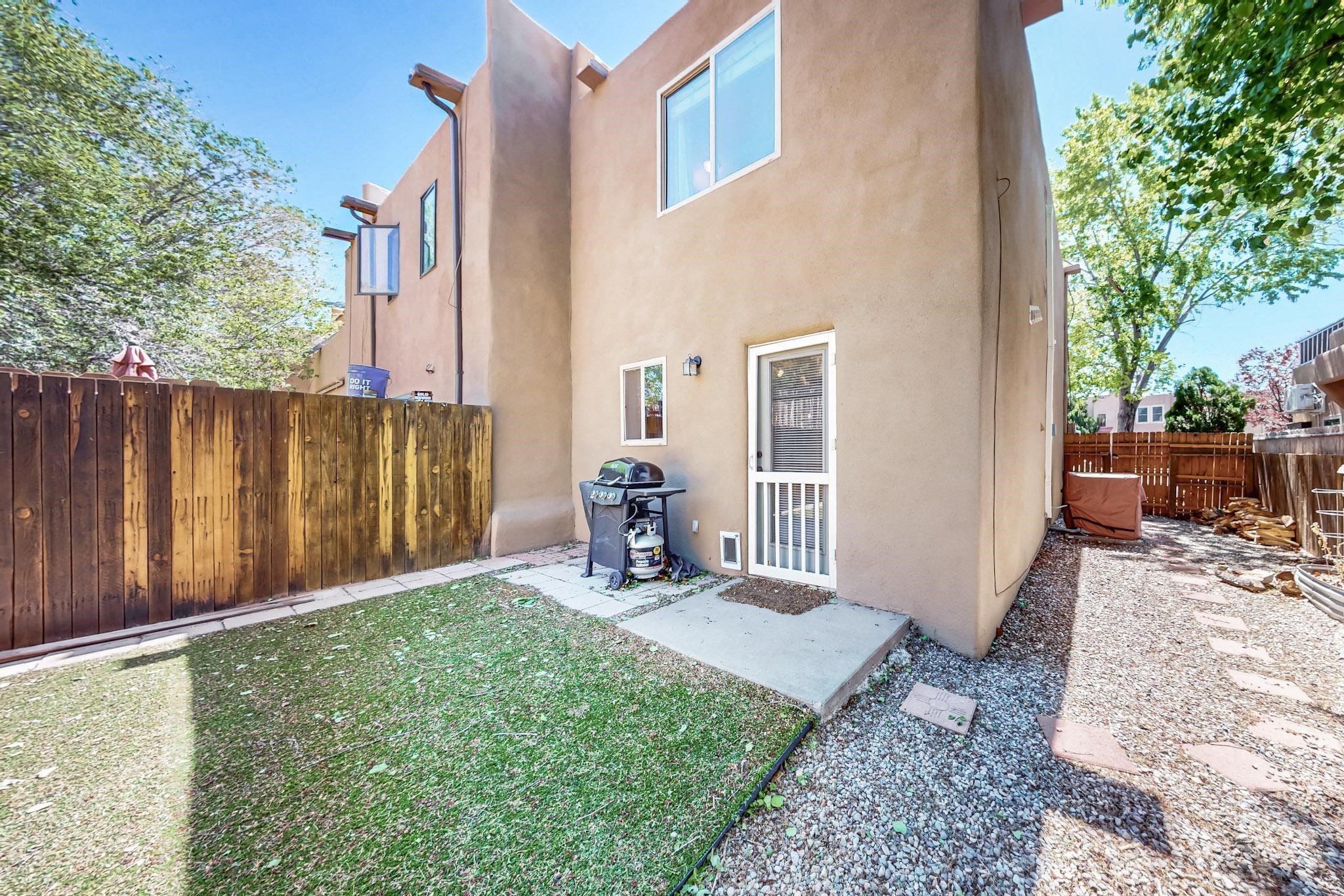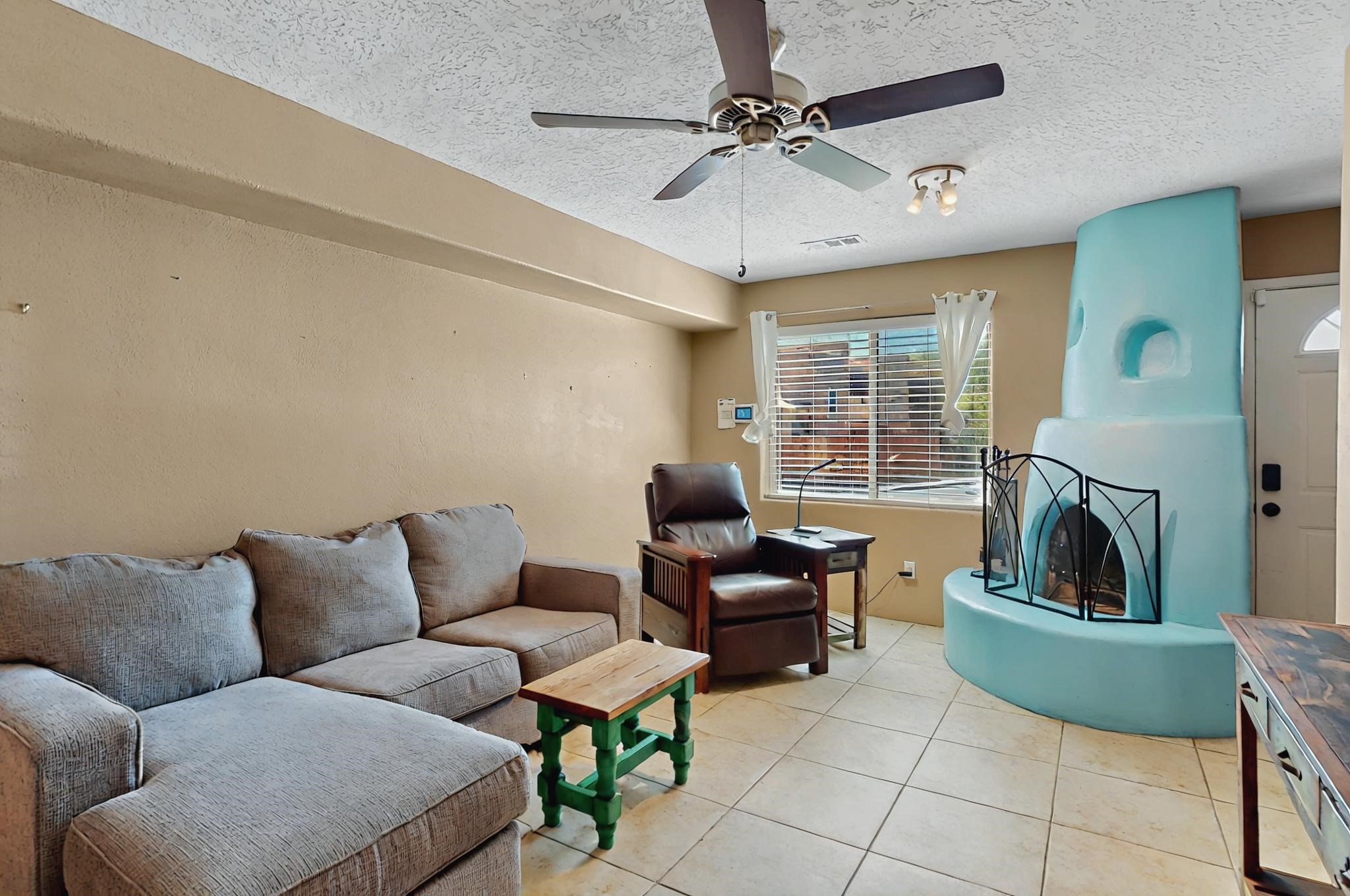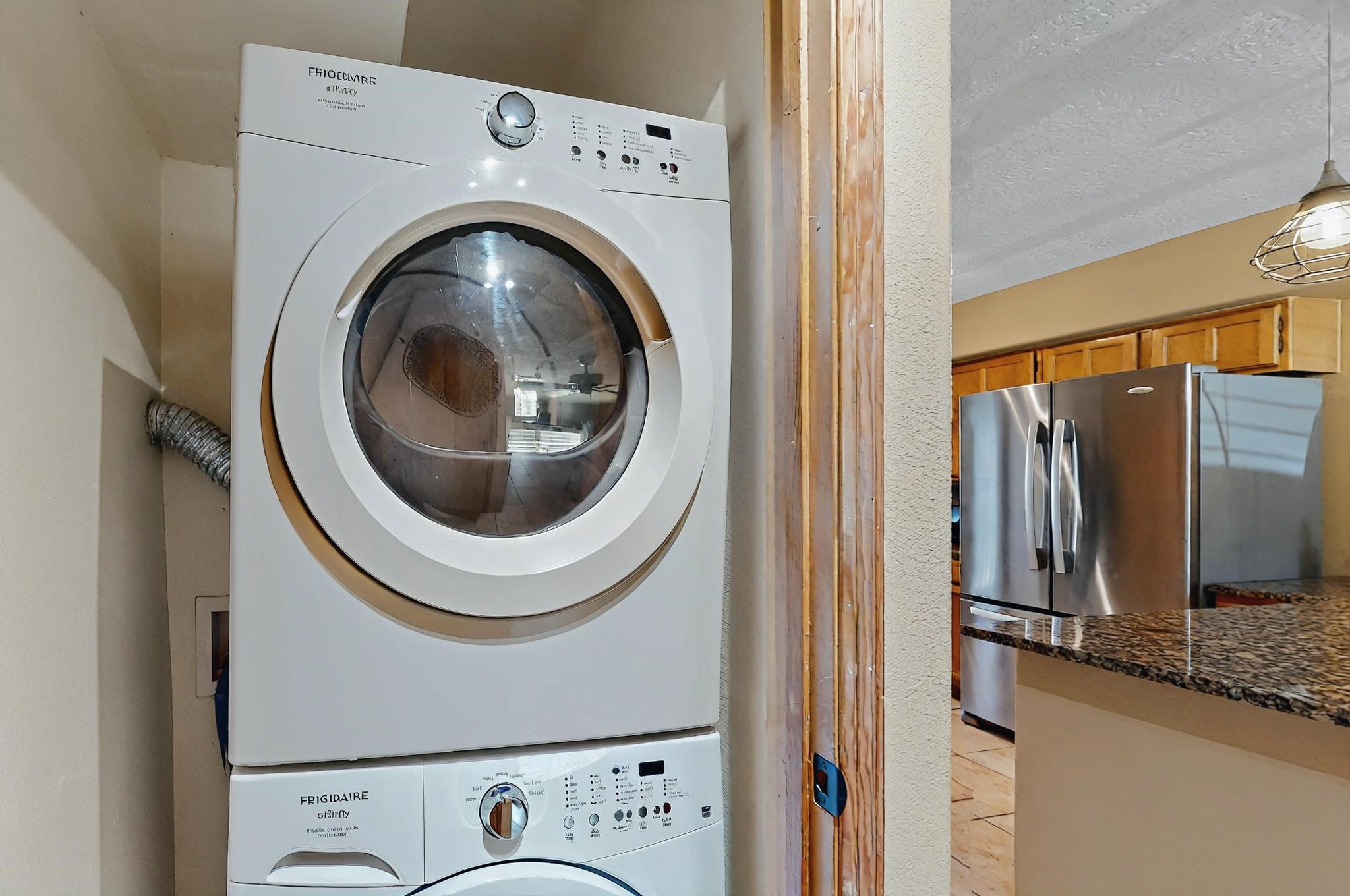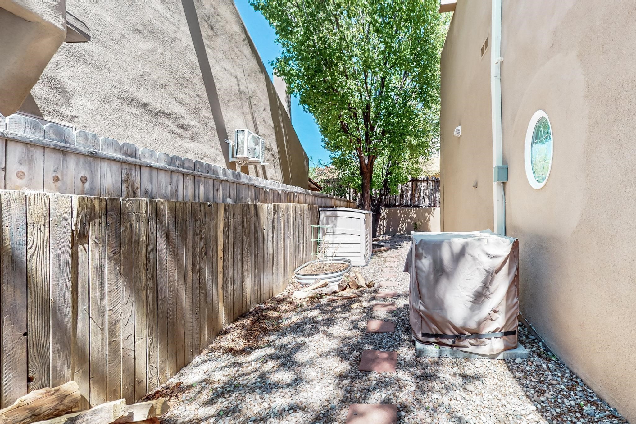 This is a charming townhome on an end lot. The convenient open floorplan includes a living room with a kiva fireplace leading to the dining area and kitchen with counter space for eating. Out the backdoor is a lovely sitting area with a small storage shed. There is also a 1/2 bath and a stacked washer/dryer downstairs. Upstairs are 2 bedrooms with views and a jack-&-jill bathroom. Central air was added; new hot water heater 2023; new laminate flooring upstairs, carpet on stairs, tile downstairs 2023; ADT security system 2023; fireplace cleaned and maintenance performed yearly; window added downstairs; additional over-head light added in the living room. Roof needs to be replaced and price has been adjusted accordingly. This is an estate.