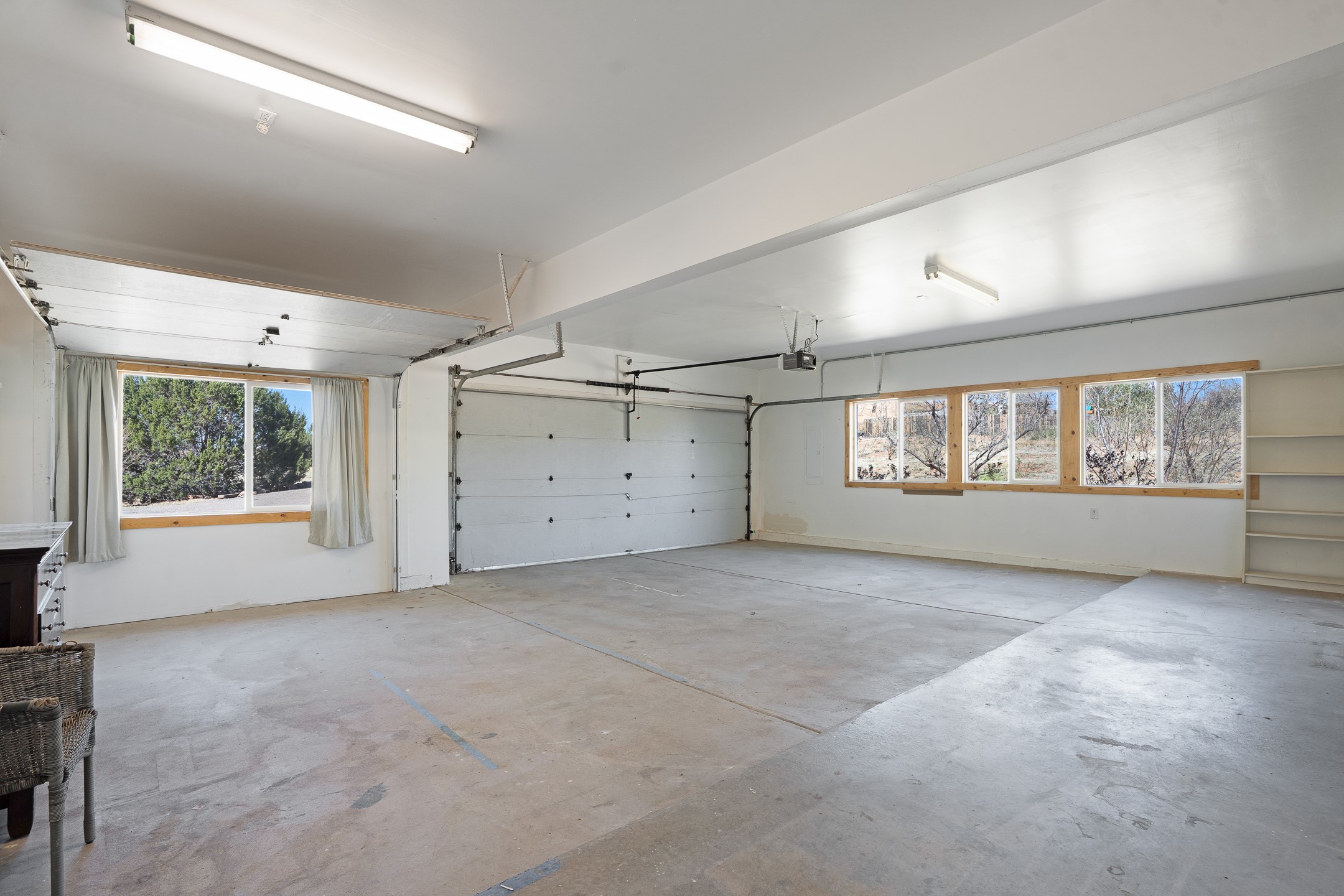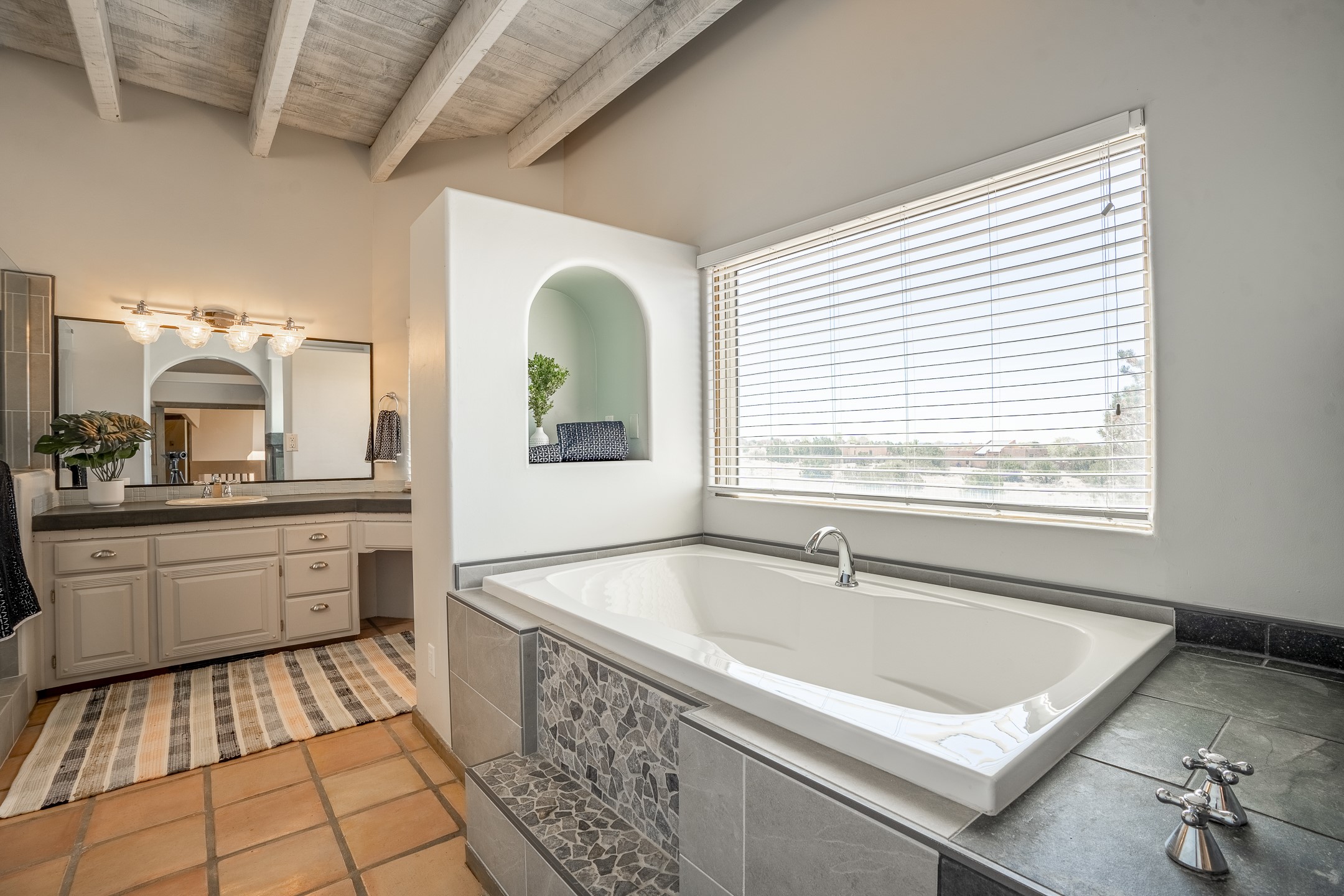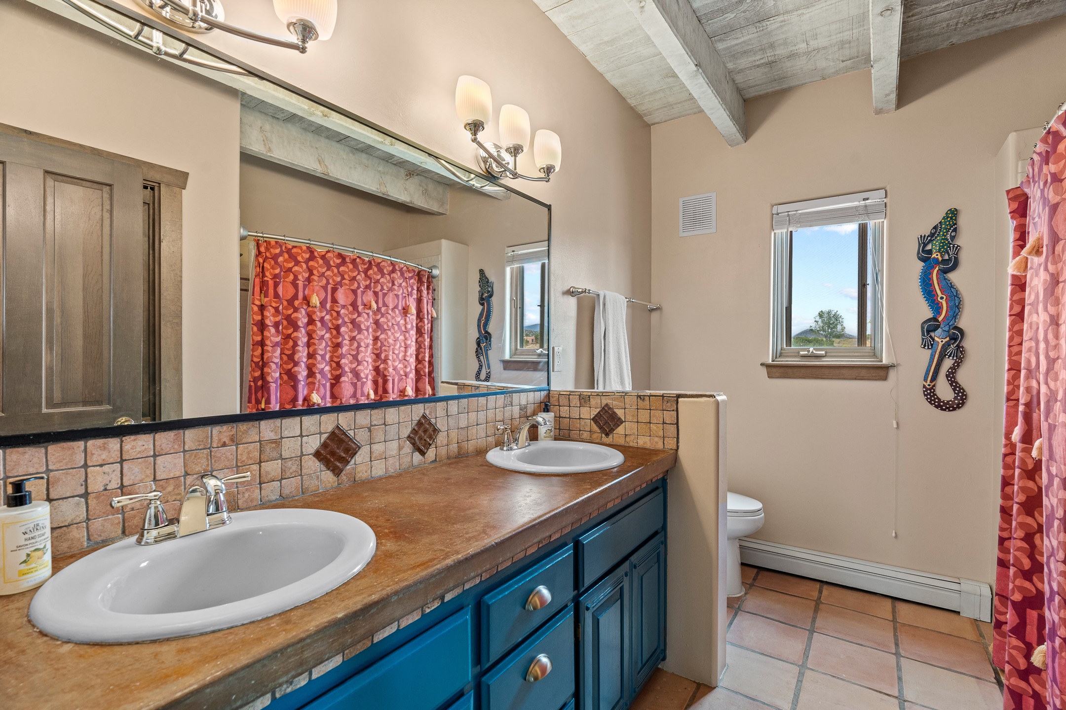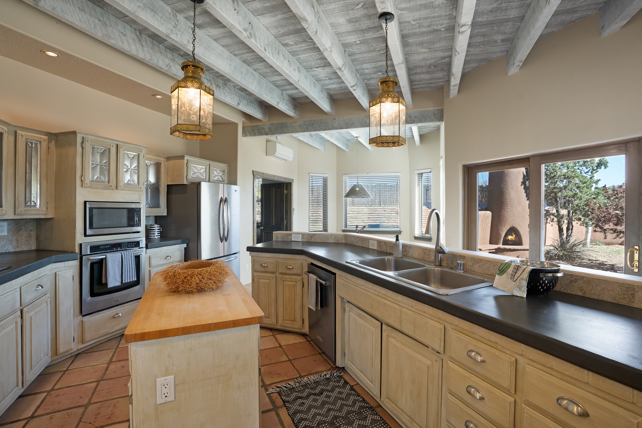 Located at the end of a quiet cul-de-sac in Eldorado, just a short walk from Eldorado Elementary and minutes from The Agora shopping center, this wonderful 4-bedroom, 3-bath home offers 3,294 square feet of comfortable living space on 2.3 acres. Nestled alongside a greenbelt, the property offers both privacy and versatility. The main level features two distinct living areas--one open to the newly renovated kitchen--along with a formal dining space and a guest bedroom currently serving as an office. The kitchen is a standout, showcasing concrete countertops with bar seating, custom tin-inlaid cabinetry, etched glass and tin lighting fixtures, and stainless steel appliances. From here, step outside to a fully fenced backyard complete with an outdoor kiva fireplace and generous space for entertaining or relaxing under the New Mexico sky.Upstairs, the expansive primary suite offers both East- and West-facing balconies, a cozy double-sided gas fireplace, deep soaking tub, glass-enclosed walk-in shower, and dual walk-in closets. Two additional guest bedrooms--each with their own private balcony--and a full guest bath complete the upper level. Recent upgrades include an 18-panel solar array, a new TPO roof with a transferable warranty, a tankless water heater, and a dedicated 30-amp service for RV power. Seamlessly blending modern updates with Southwestern charm, this home offers spacious, serene living in one of Santa Fe's most desirable communities.