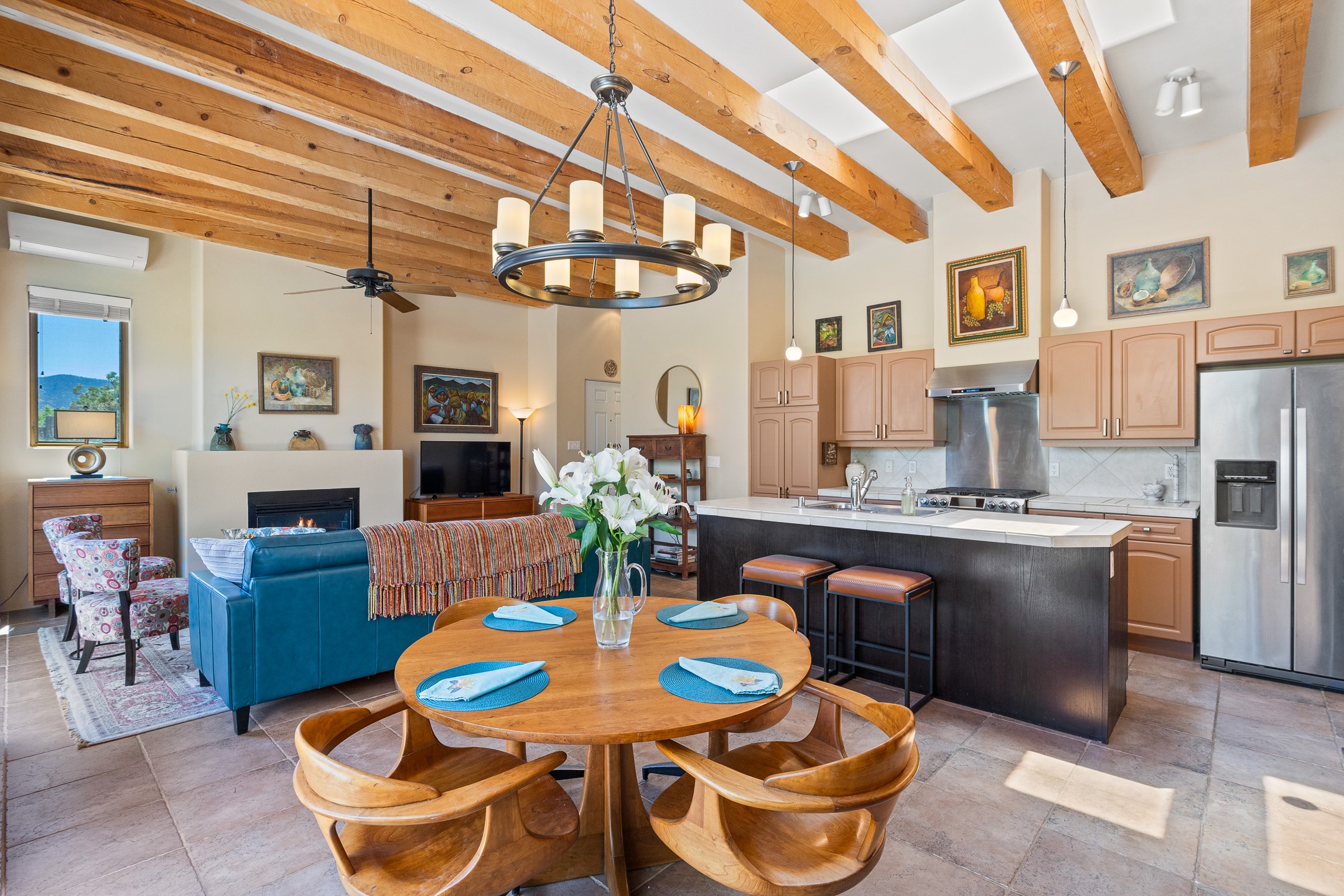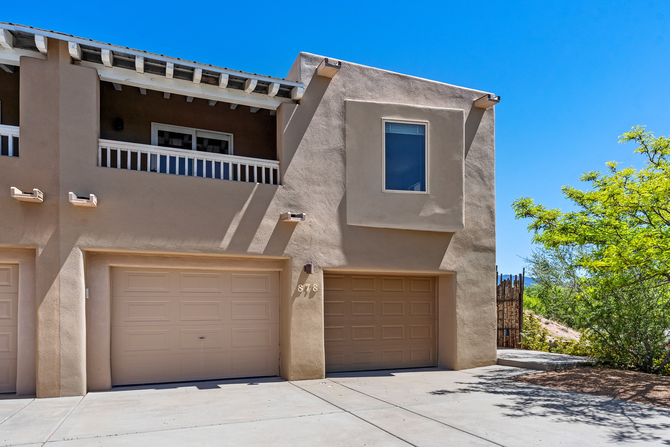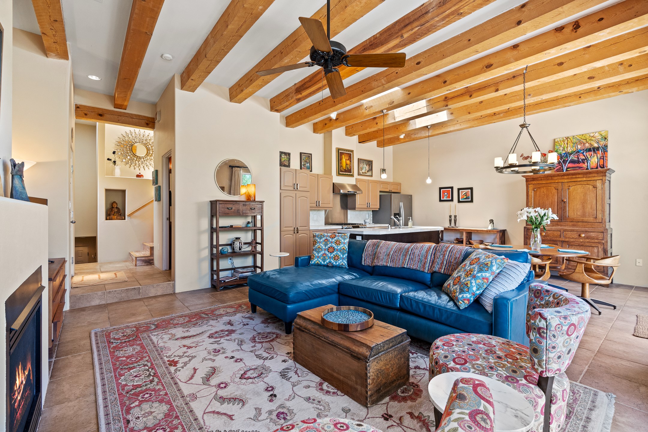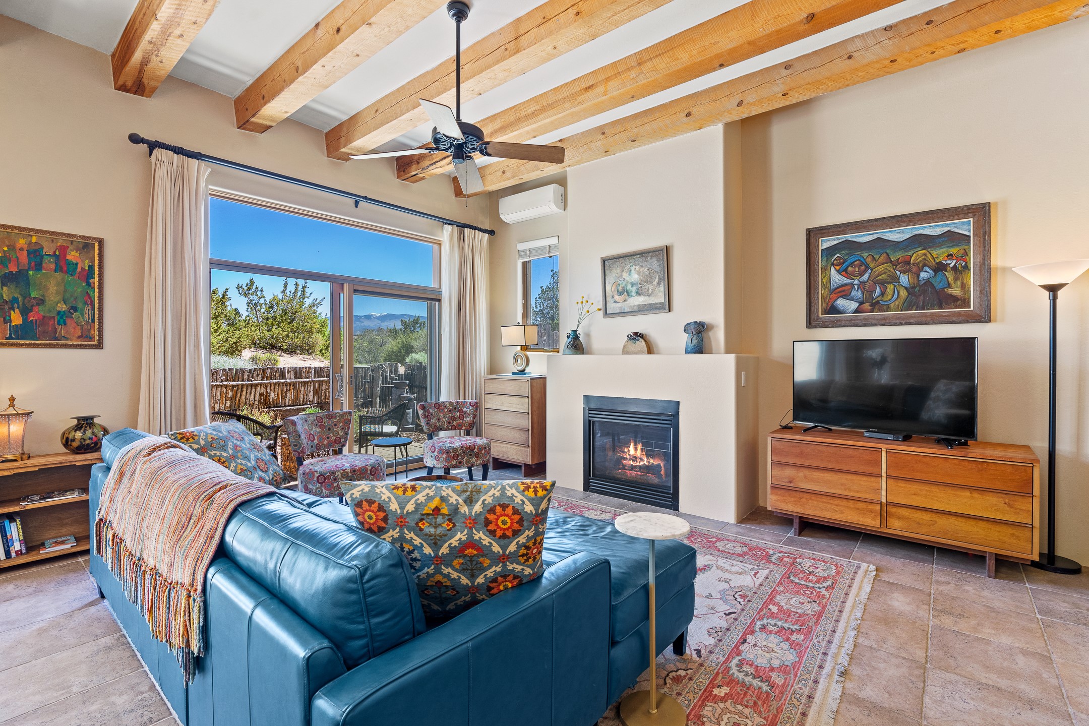 Lovely, light filled Condo conveniently located just a few minutes from the Plaza and Downtown with fabulous views of the Sangre de Cristo Mountains! The main floor consists of a high beamed ceiling open concept living room, dining room and kitchen, a cozy fireplace and direct access to a charming landscaped rear patio that looks out over protected, treed open space and the eastern mountain view. A powder room is also situated on the main floor and a few steps up are the master bedroom and master bath as well as a guest bedroom with a private bath. Step out of the master bedroom onto a private covered deck for wonderful views to the south. The home has a 2-car attached garage with lots of extra storage space and built-in cabinetry. Enjoy warm floors during the winter months with the in-floor radiant heating and mini-splits have been recently added for cooling. This home is part the Cielo Vista COA which is located close to several trail systems and is a super convenient location for the LANL commuter.