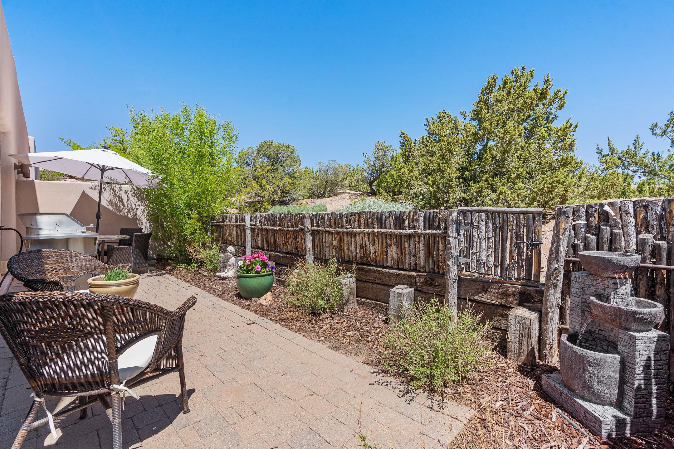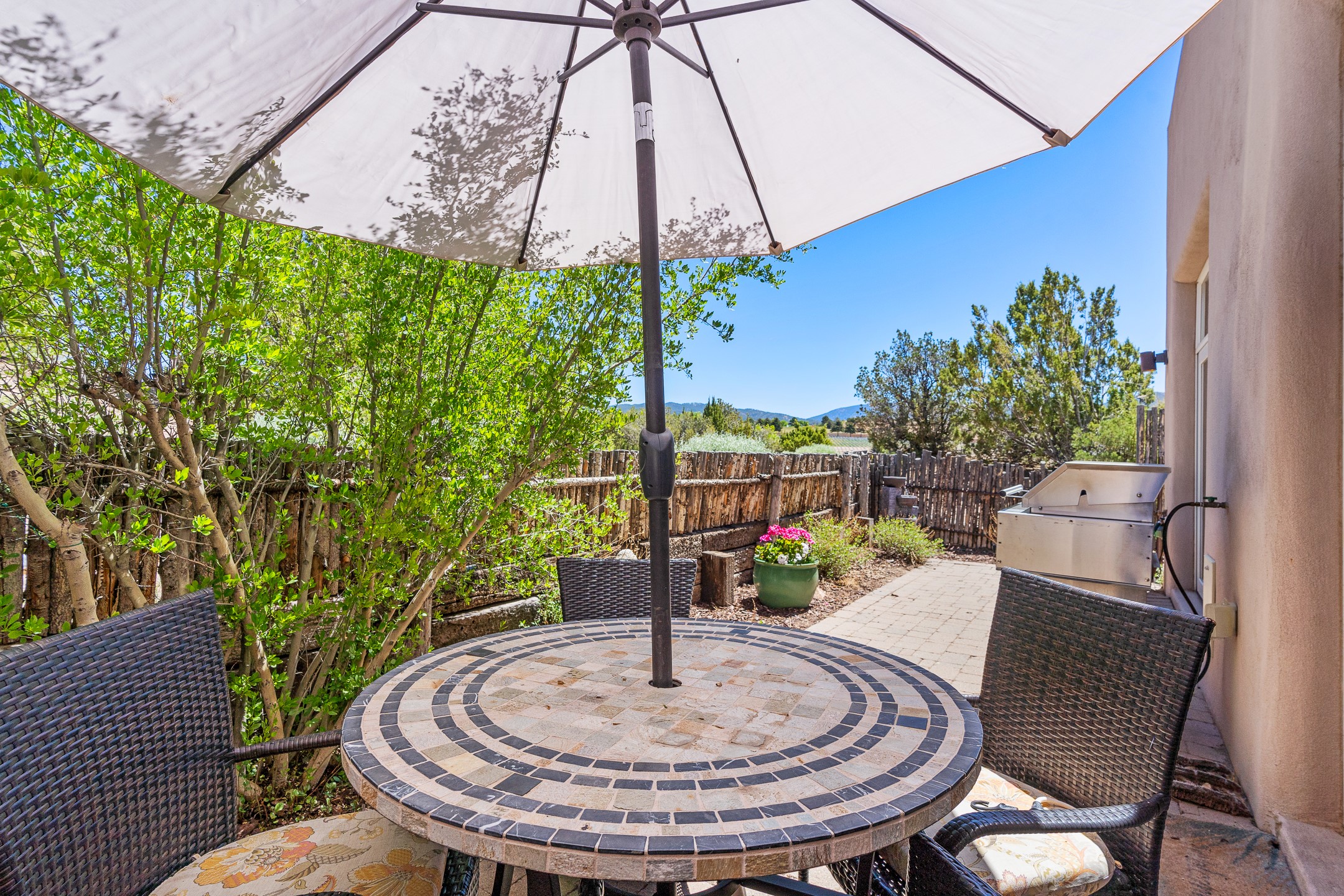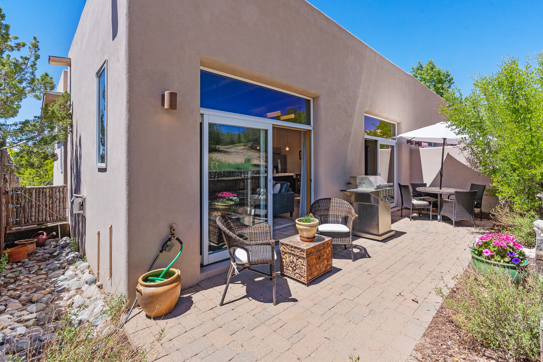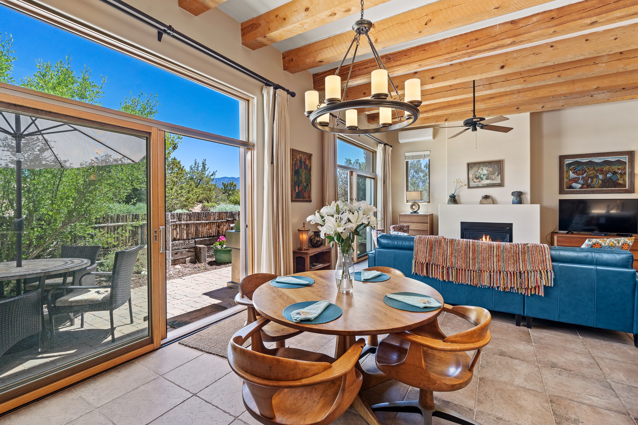 Lovely, light filled Condo conveniently located just a few minutes from the Plaza and Downtown with fabulous views of the Sangre de Cristo Mountains! The main floor consists of a high beamed ceiling open concept living room, dining room and kitchen, a cozy fireplace and direct access to a charming landscaped rear patio that looks out over protected, treed open space and the eastern mountain view. A powder room is also situated on the main floor and a few steps up are the master bedroom and master bath as well as a guest bedroom with a private bath. Step out of the master bedroom onto a private covered deck for wonderful views to the south. The home has a 2-car attached garage with lots of extra storage space and built-in cabinetry. Enjoy warm floors during the winter months with the in-floor radiant heating and mini-splits have been recently added for cooling. This home is part the Cielo Vista COA which is located close to several trail systems and is a super convenient location for the LANL commuter.