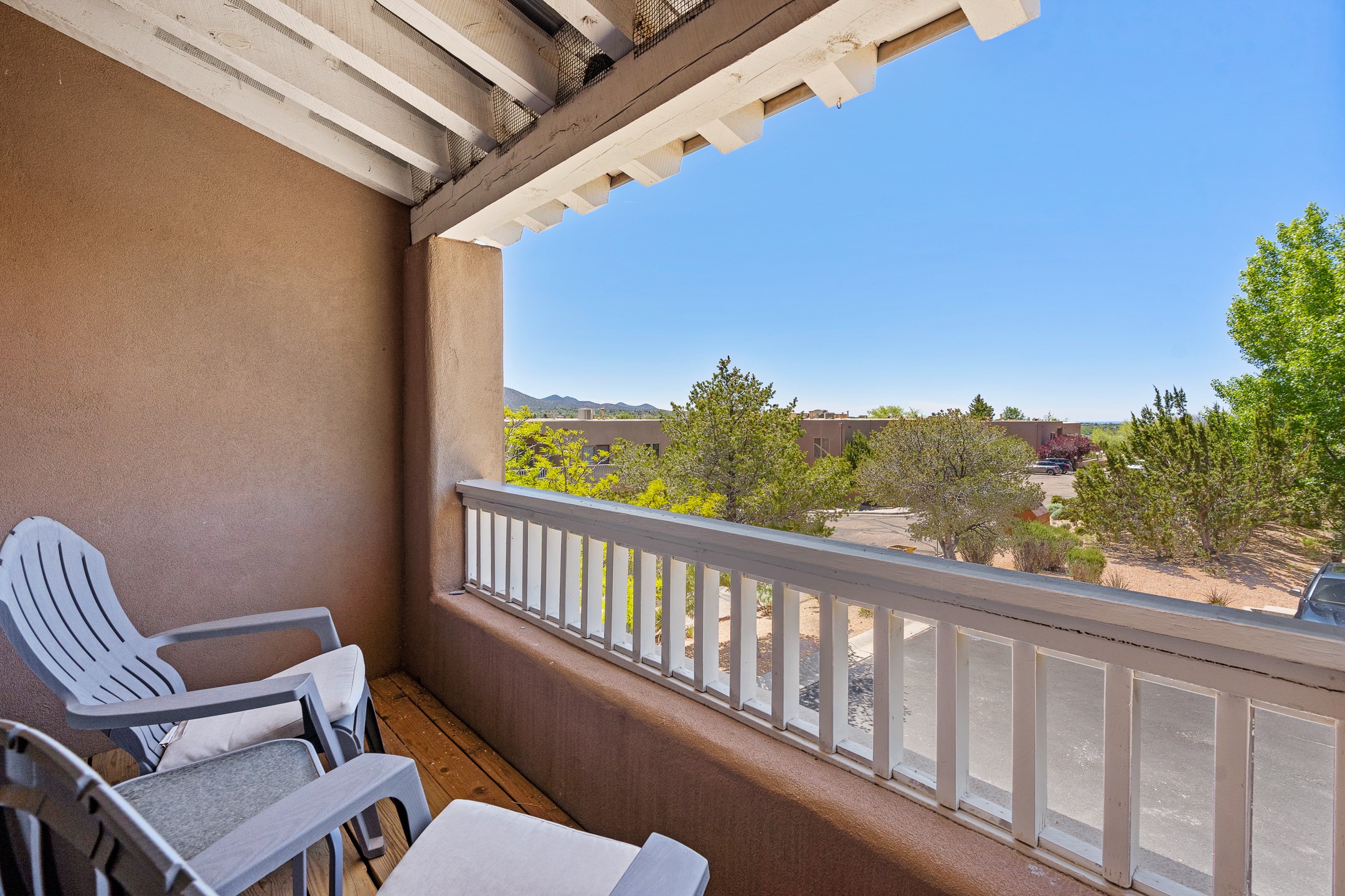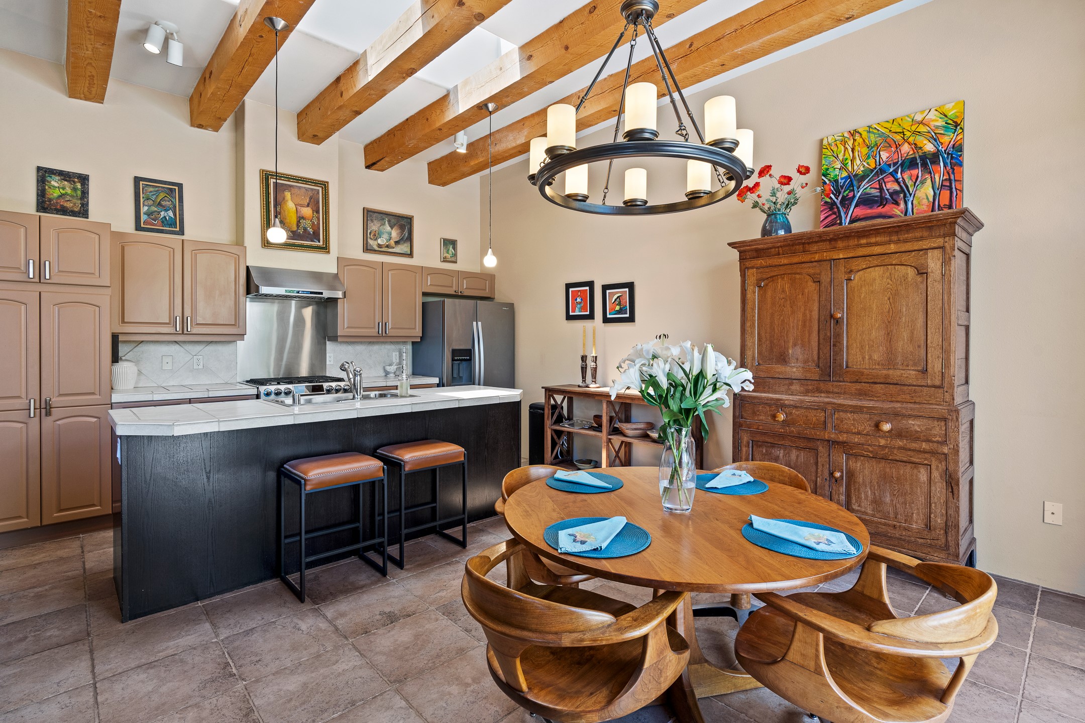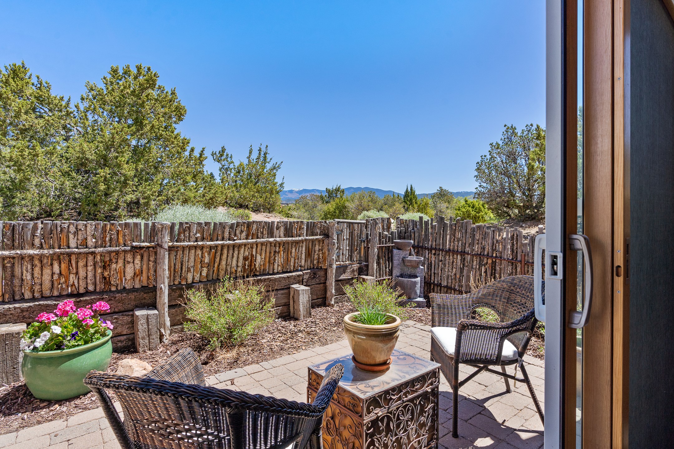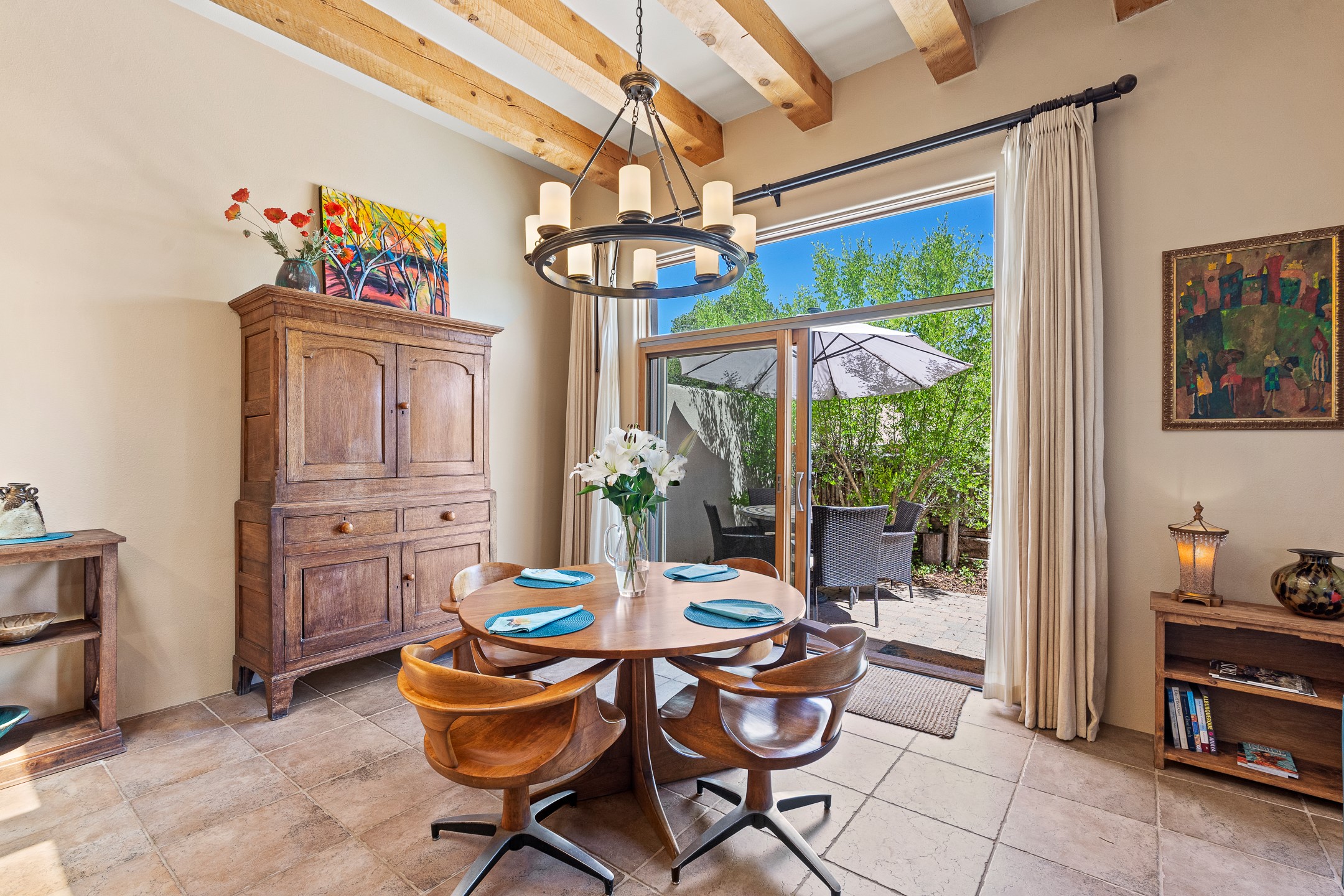 Lovely, light filled Condo conveniently located just a few minutes from the Plaza and Downtown with fabulous views of the Sangre de Cristo Mountains! The main floor consists of a high beamed ceiling open concept living room, dining room and kitchen, a cozy fireplace and direct access to a charming landscaped rear patio that looks out over protected, treed open space and the eastern mountain view. A powder room is also situated on the main floor and a few steps up are the master bedroom and master bath as well as a guest bedroom with a private bath. Step out of the master bedroom onto a private covered deck for wonderful views to the south. The home has a 2-car attached garage with lots of extra storage space and built-in cabinetry. Enjoy warm floors during the winter months with the in-floor radiant heating and mini-splits have been recently added for cooling. This home is part the Cielo Vista COA which is located close to several trail systems and is a super convenient location for the LANL commuter.