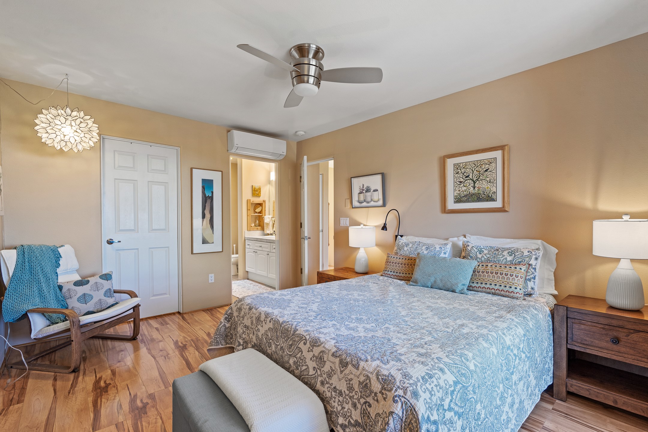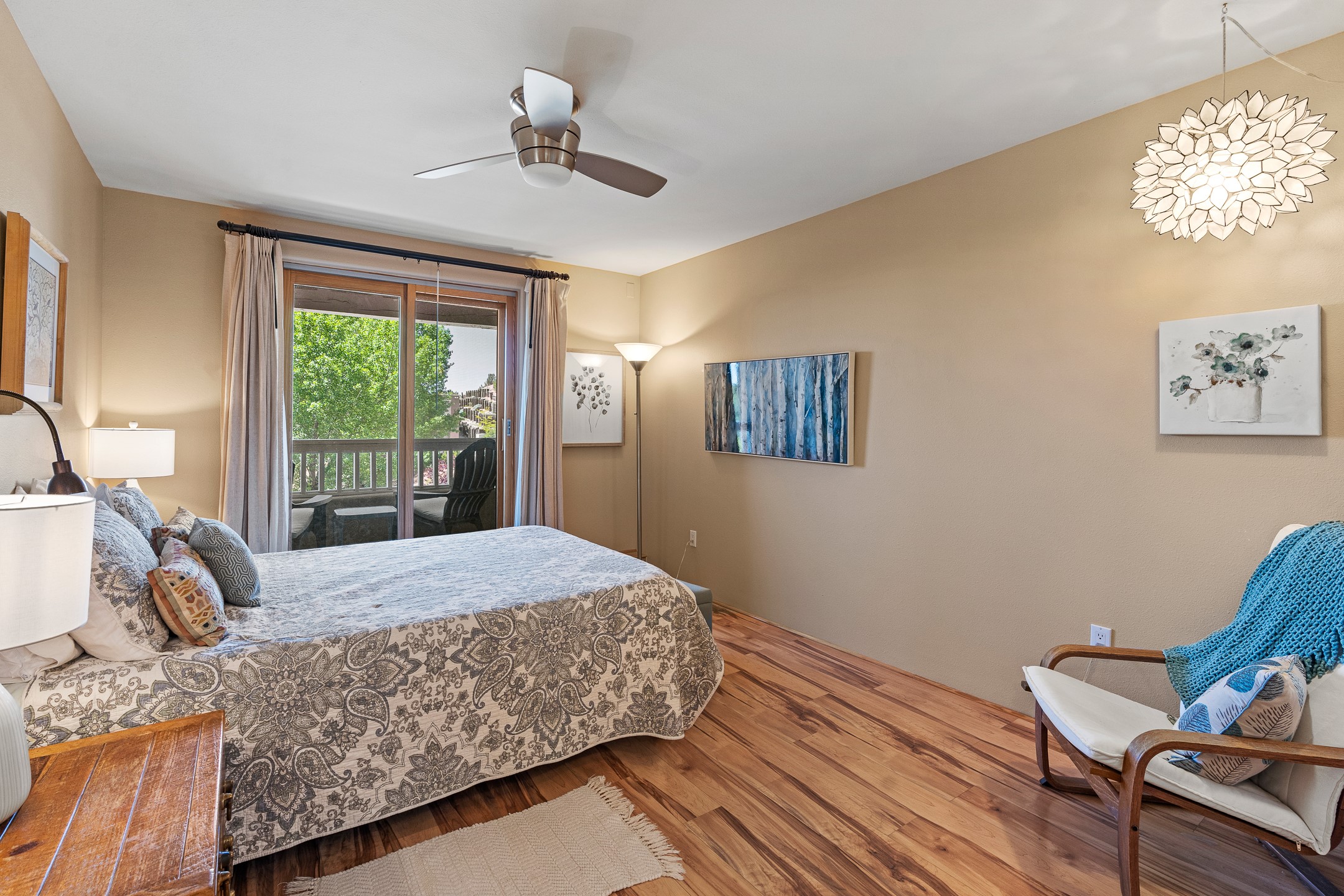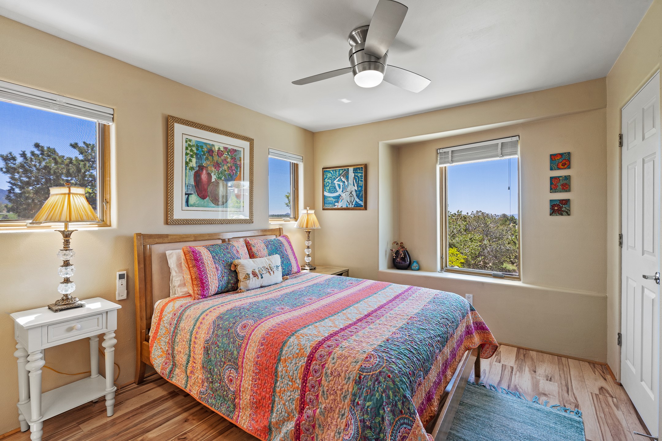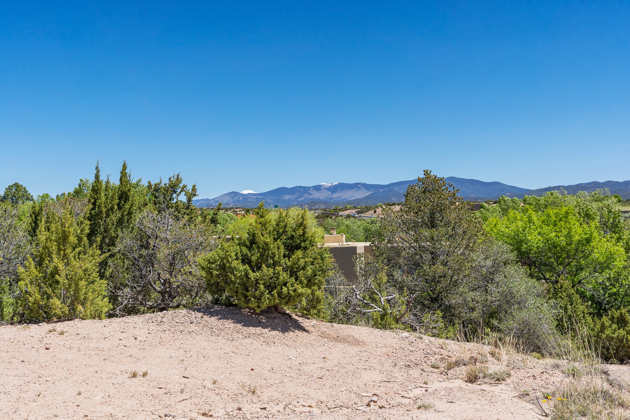 Lovely, light filled Condo conveniently located just a few minutes from the Plaza and Downtown with fabulous views of the Sangre de Cristo Mountains! The main floor consists of a high beamed ceiling open concept living room, dining room and kitchen, a cozy fireplace and direct access to a charming landscaped rear patio that looks out over protected, treed open space and the eastern mountain view. A powder room is also situated on the main floor and a few steps up are the master bedroom and master bath as well as a guest bedroom with a private bath. Step out of the master bedroom onto a private covered deck for wonderful views to the south. The home has a 2-car attached garage with lots of extra storage space and built-in cabinetry. Enjoy warm floors during the winter months with the in-floor radiant heating and mini-splits have been recently added for cooling. This home is part the Cielo Vista COA which is located close to several trail systems and is a super convenient location for the LANL commuter.