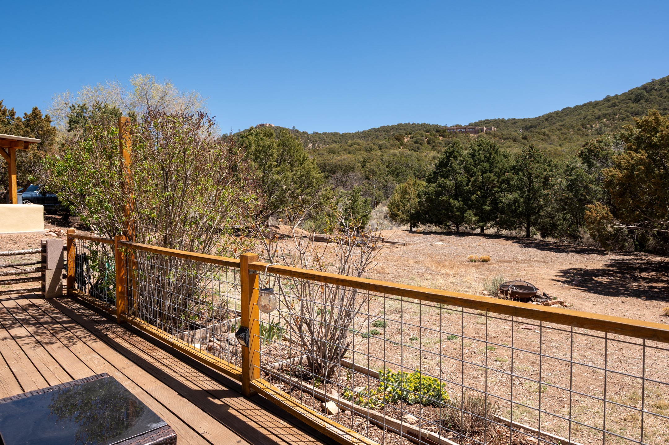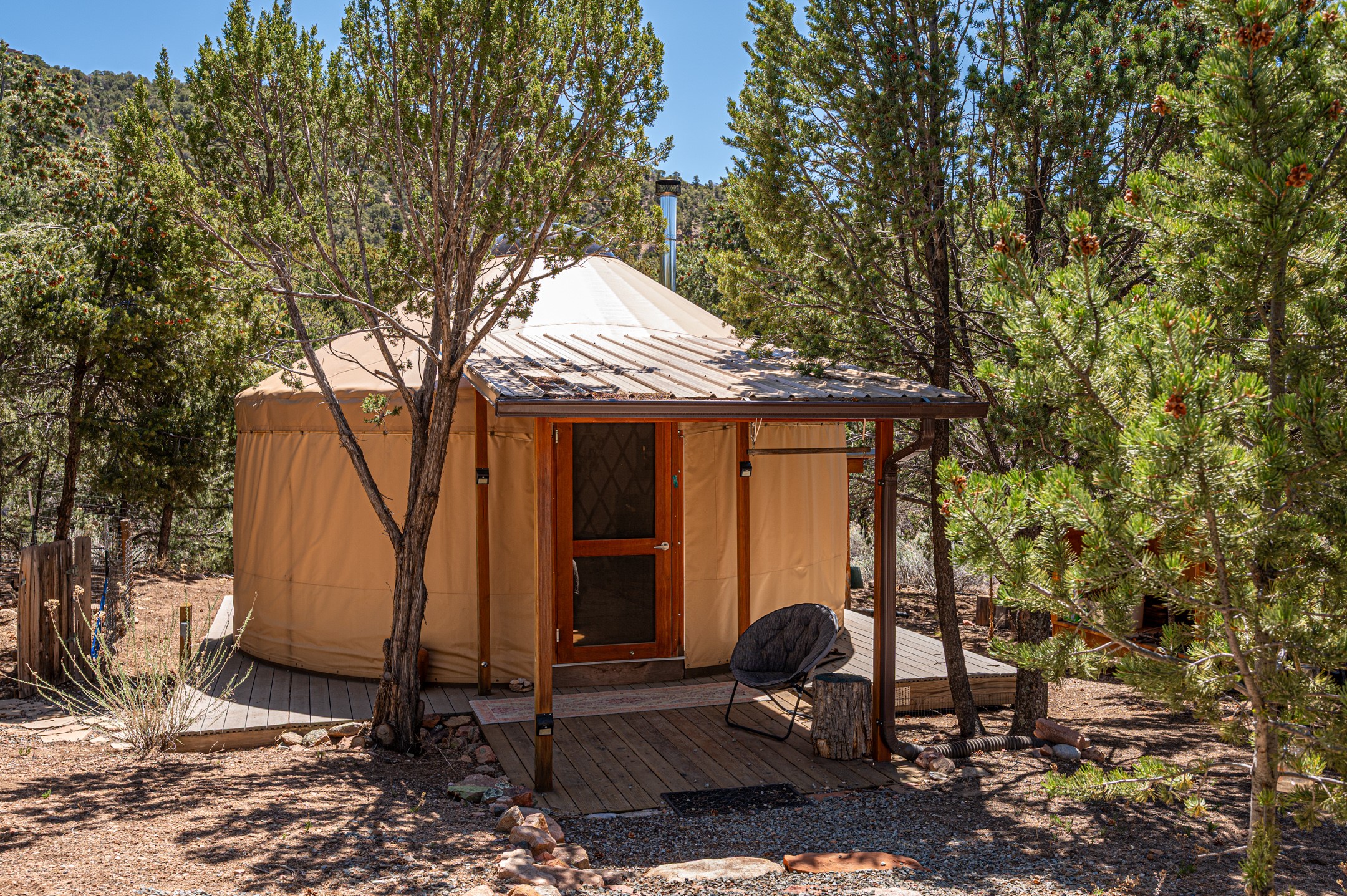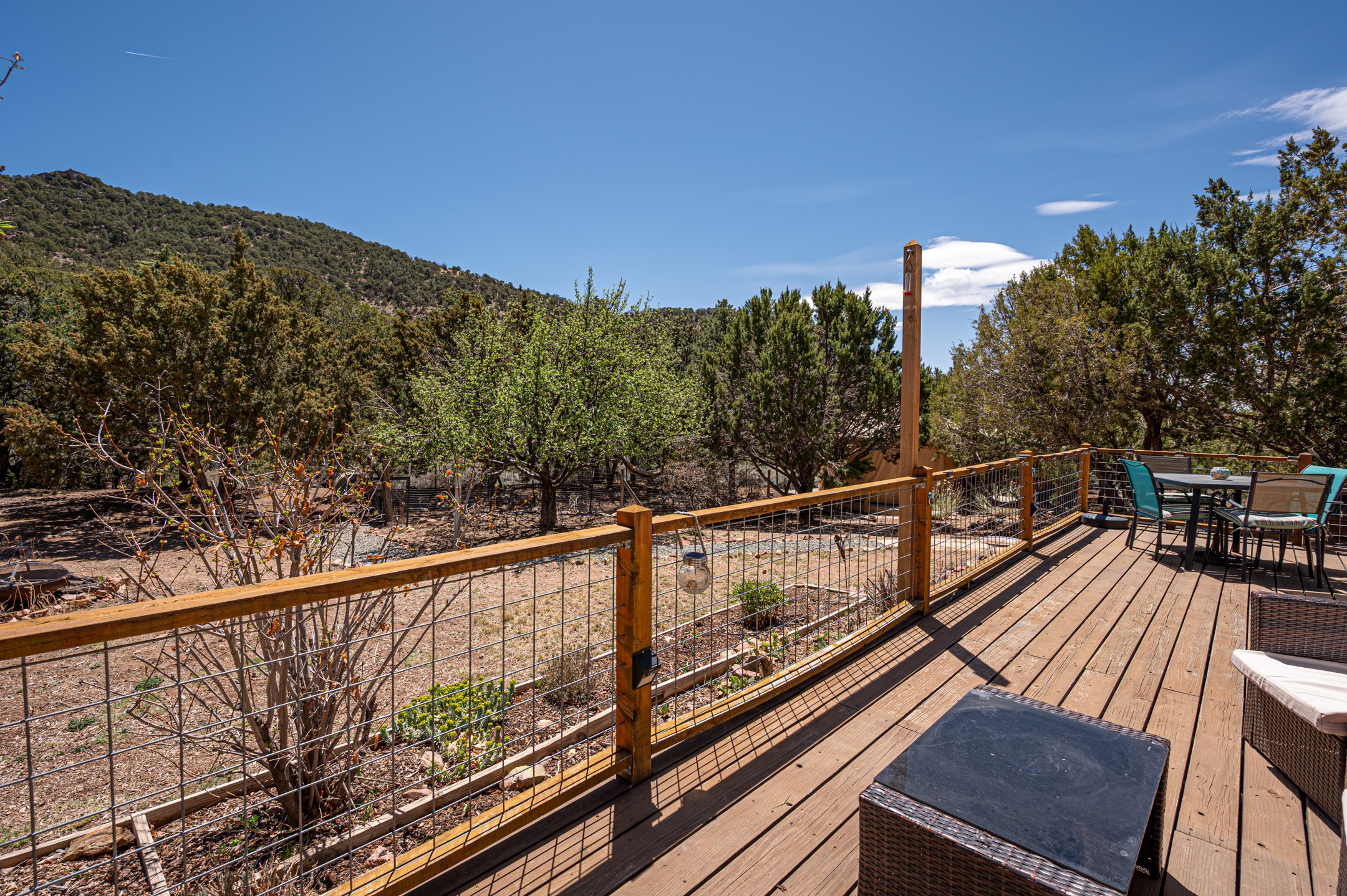 Discover this one-of-a-kind retreat nestled into the foothills of the Sangre de Cristo Mountains. Sited on 5 acres of idyllic high desert terrain off Old Santa Fe Trail, the ber-private property will make you forget the hustle and bustle and embrace open spaces, cool breezes, and endless starry skies. Featuring a +/- 600 sqft main house with gas fireplace in addition to a +/-315 sqft yurt with wood-burning stove, there is abundant space for creative endeavors and guests alike. The open concept kitchen is fully equipped with stainless steel appliances, the living area doubles as a bedroom with en suite walk-in closet and bathroom with a stackable washer and dryer. A spacious wrap-around deck will be the perfect perch for morning coffee and Al-fresco dining. The inclusion of photovoltaic solar panels, a shared well, and cistern for rain water harvesting will appeal to your environmental consciousness. Amenities are a moment away, with Harry's Roadhouse, The Agora Center in Eldorado, athletic facilities at El Gancho, and downtown Santa Fe, just to name a few. Prime for relaxation, enjoying hiking trails from your doorstep, homesteading with bountiful fruit trees, and more, this home is more than just a place to stay--it's a place to recharge, refresh, and reignite your spirit. **See broker remarks for more information. Details as provided by Sellers.