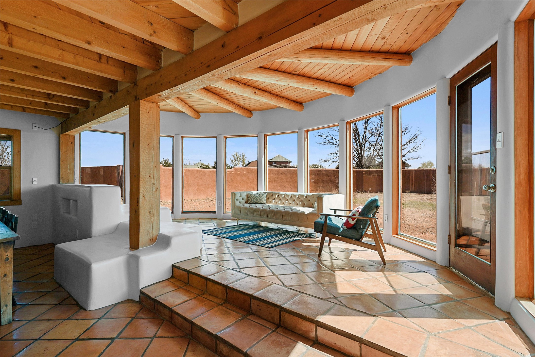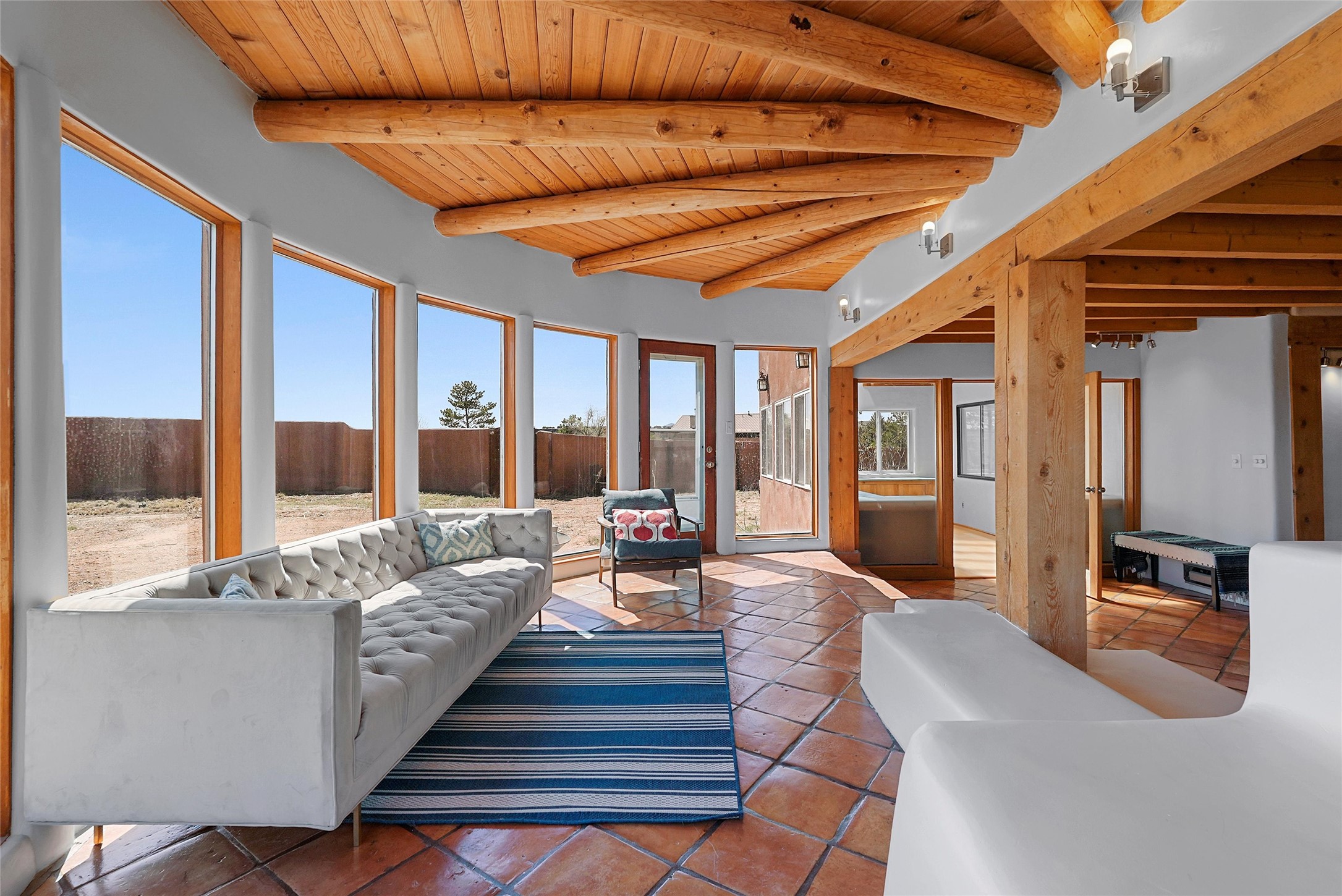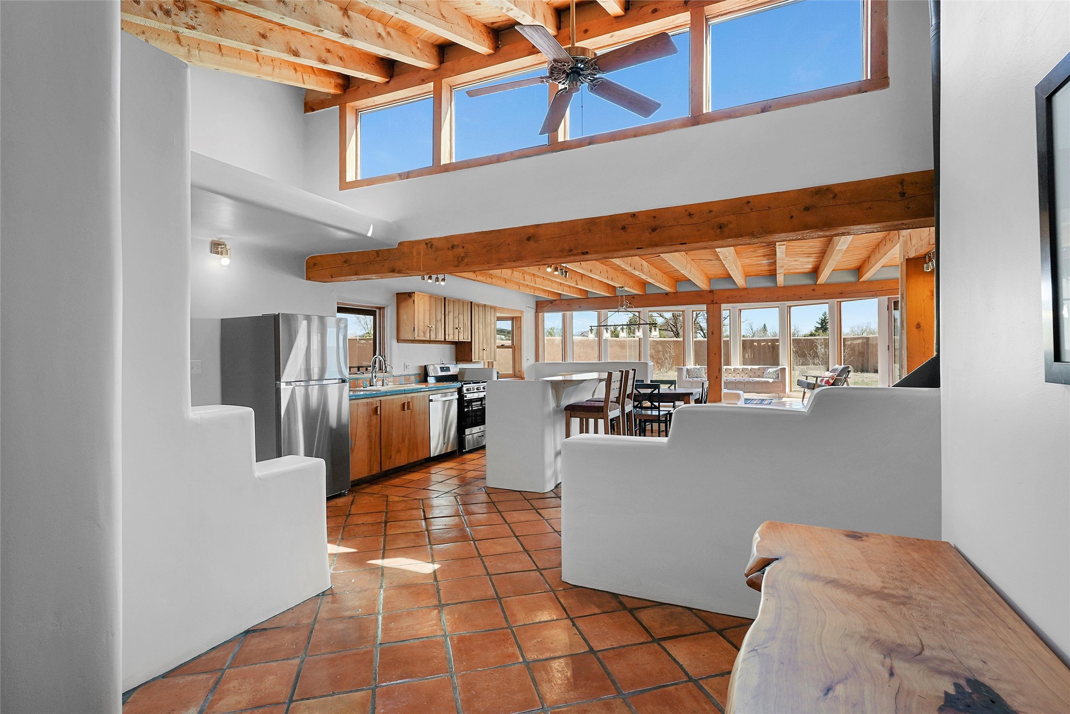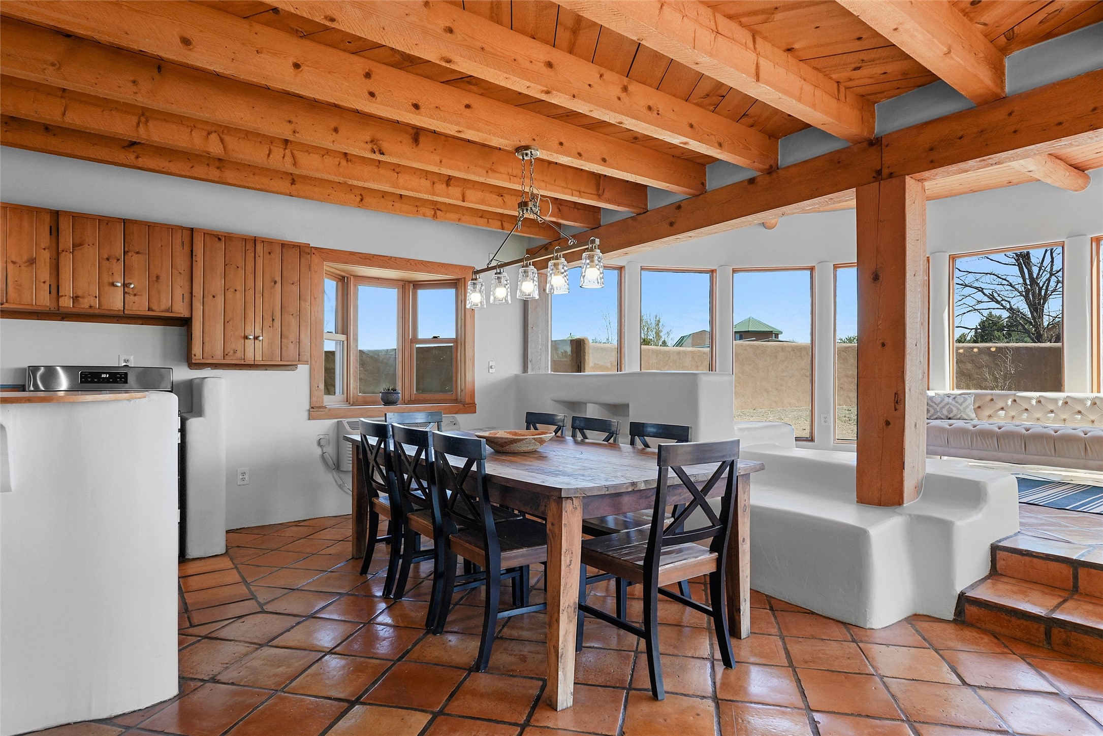 Welcome to this serene La Cieneguilla sanctuary featuring the perfect blend of Southwest charm and modern updates on 2.7 acres. Step inside a light filled home with large windows, beautiful wood beams and herringbone ceilings. The home features new stucco, freshly resealed Saltillo floors, fresh paint, and updated lighting throughout. This spacious 2,113 sq ft home is complemented by a bright sunroom capable of heating the entire home. The open kitchen is equipped with all new appliances (less than a year old) and built-in benches throughout make for effortless entertaining. There are endless possibilities with 360 linear feet of enclosed courtyard. For hobbyists or those who need extra workspace, the property features a 400 sq ft workshop with electricity and 220V access, Horses allowed.