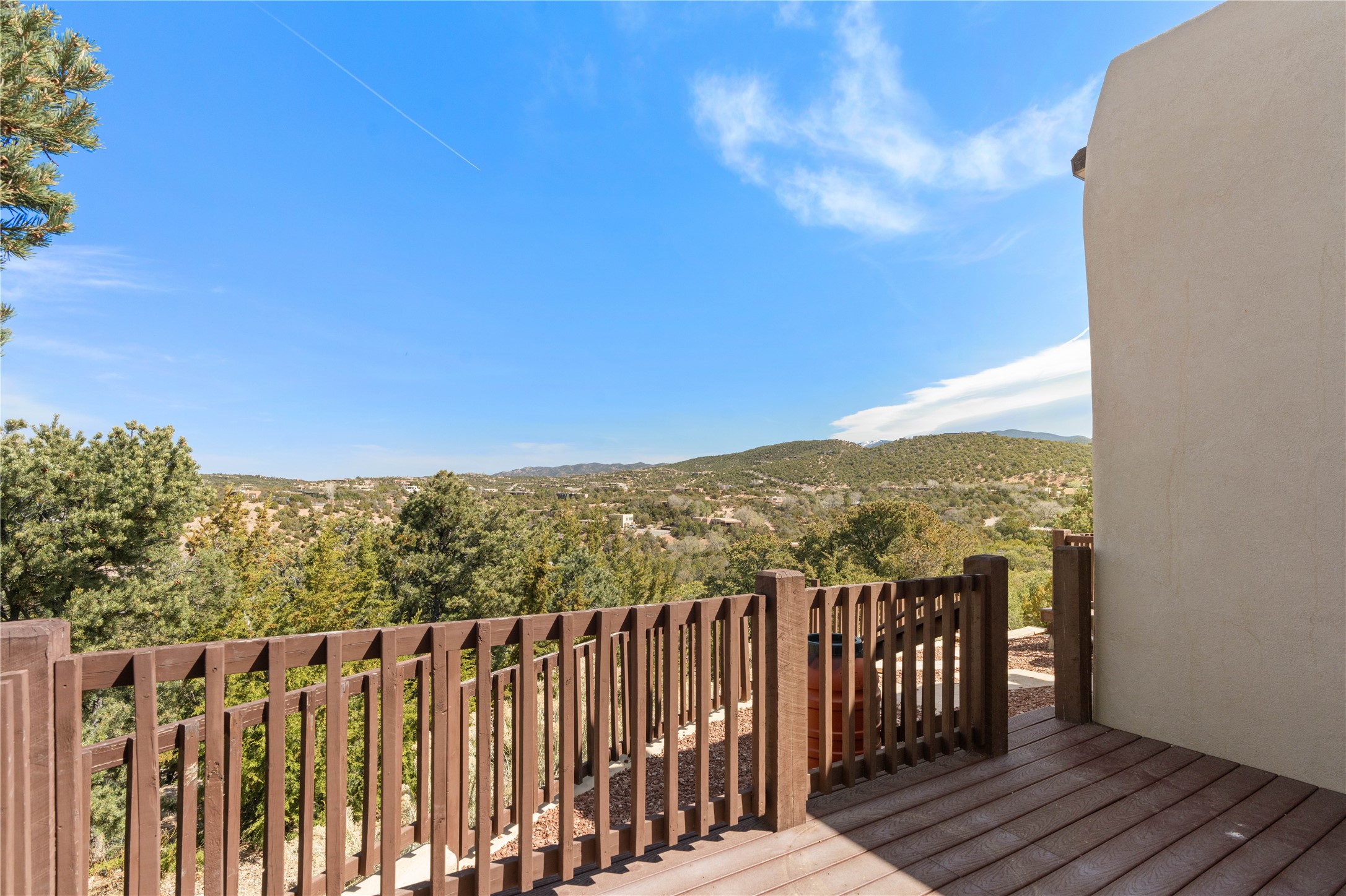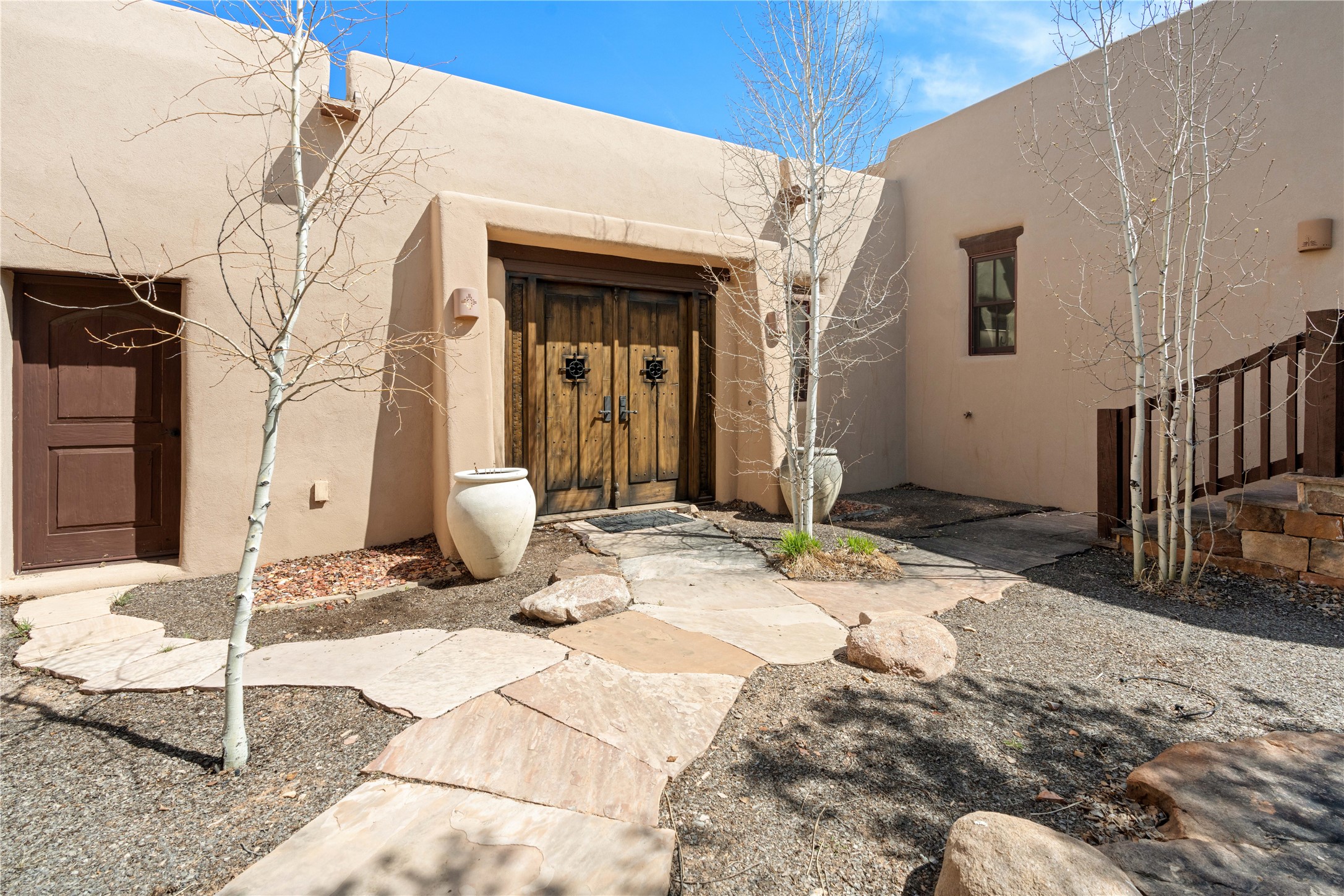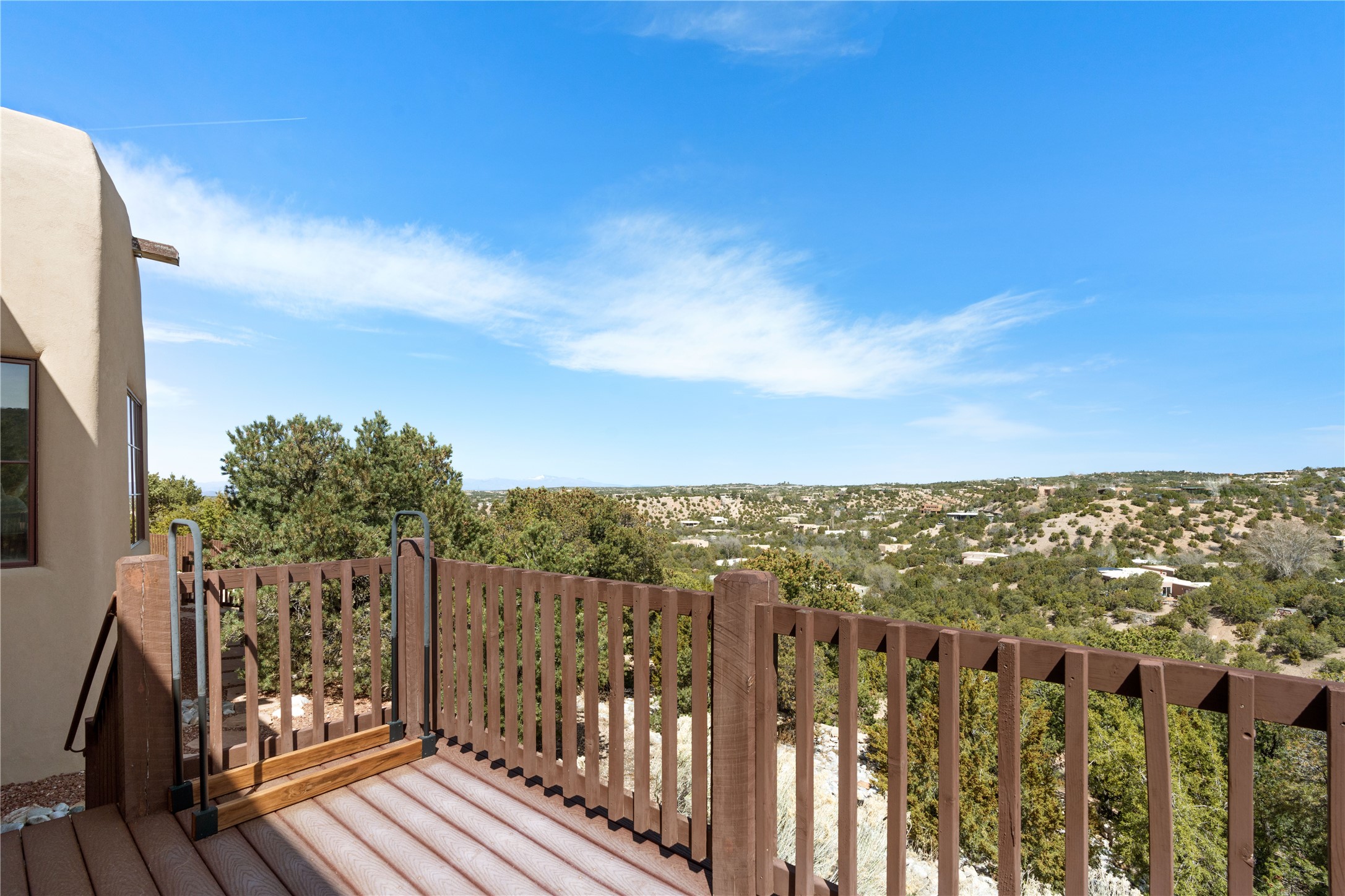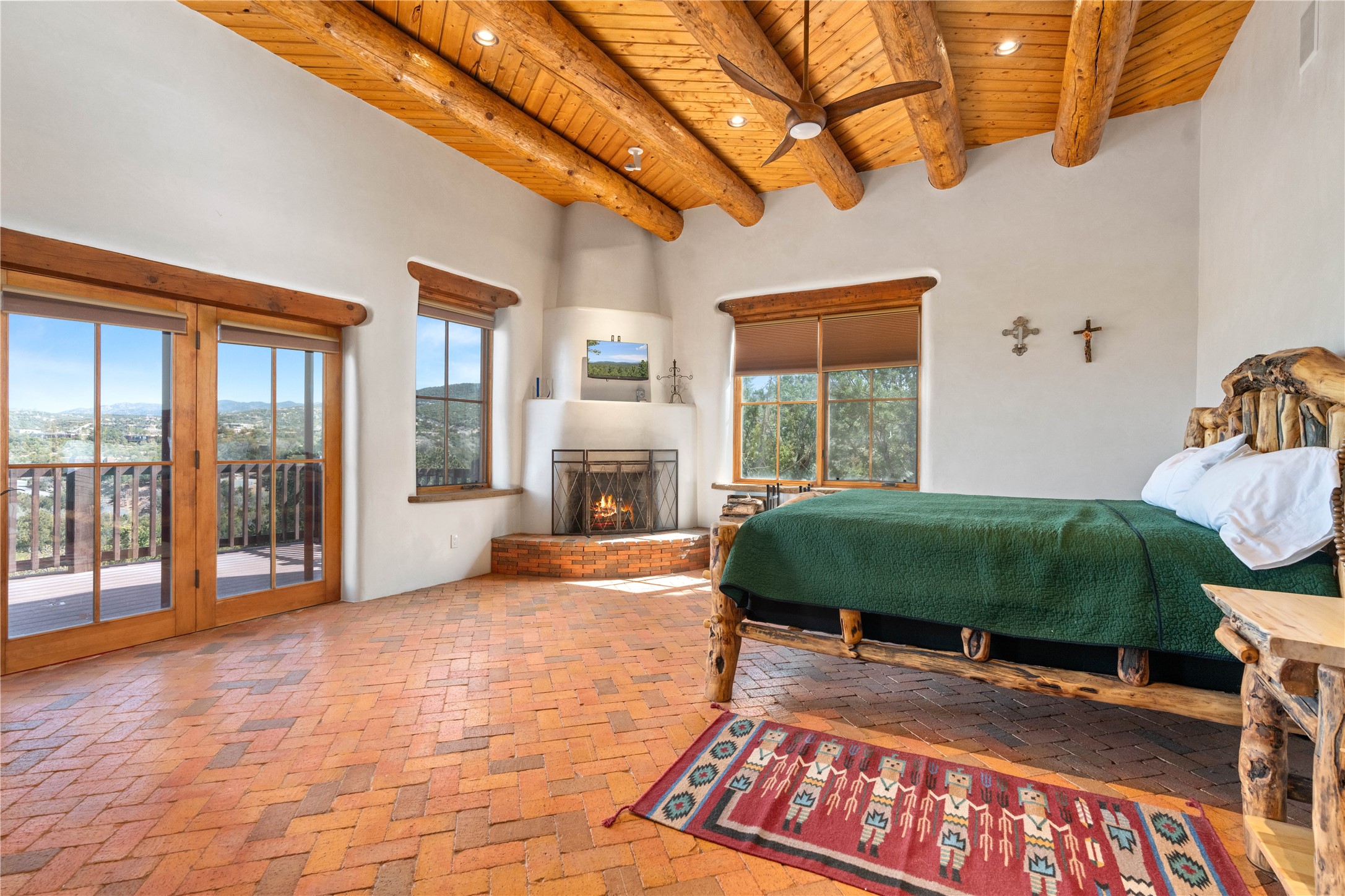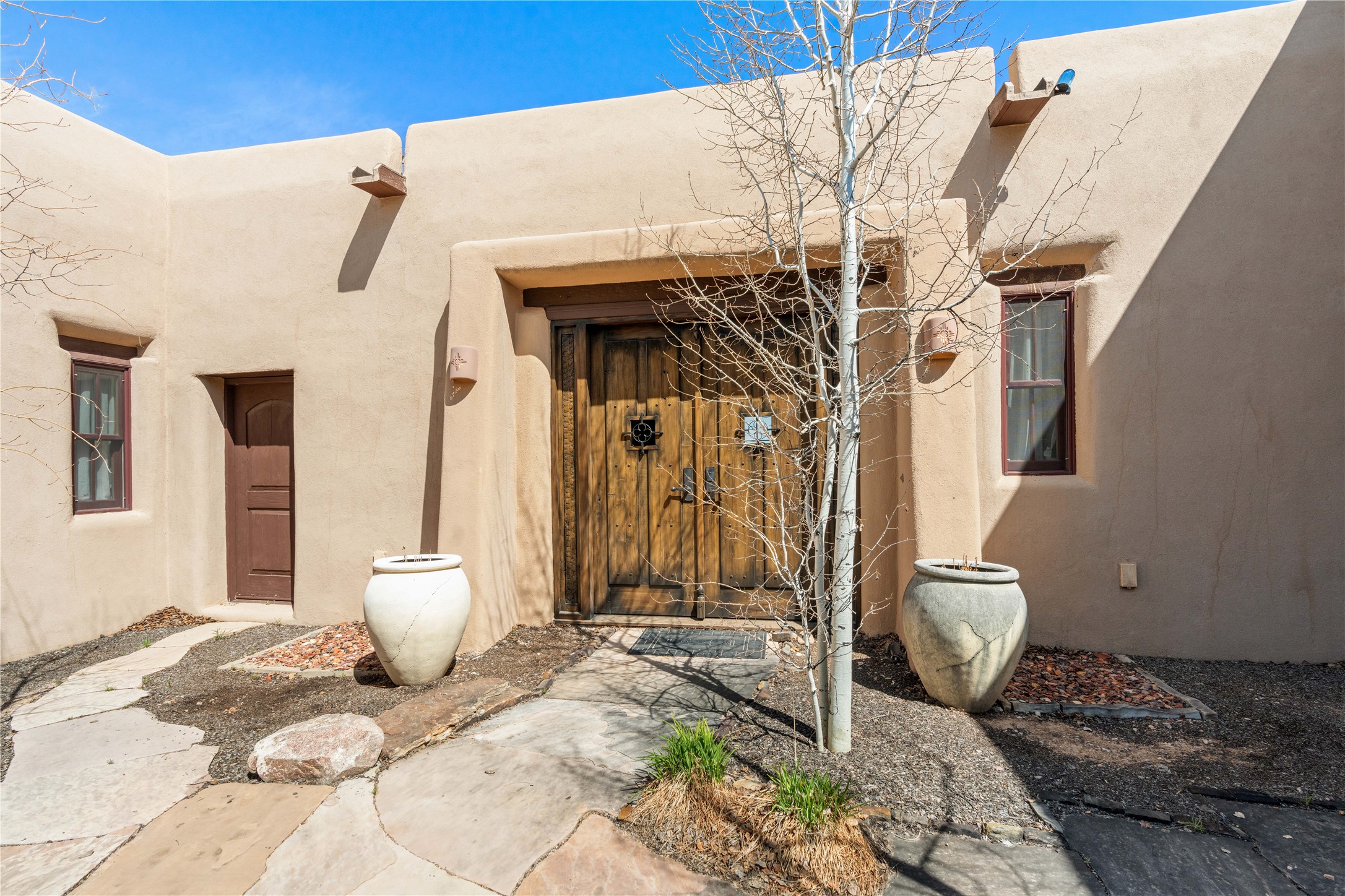 Experience timeless Santa Fe elegance in this exquisite 3-bedroom, 4-bath double adobe home perched on a 2.017 acre lot, offering sweeping 180 degree views of the Sangre de Cristo foothills. The location is fantastic--just minutes from the Santa Fe Plaza, Canyon Road, Museum Hill, Ten Thousand Waves, and less than 1/2 hour to the Santa Fe Ski Area. The residence features white plaster walls, beautifully laid brick floors, and soaring ceilings adorned with vigas and latillas. A new custom-made La Puerta front door sets the tone for the home's authentic charm. The en-suite primary bedroom boasts a corner fireplace and private balcony access. A separate guest suite includes its own kitchenette and entrance. Multiple decks provide perfect vantage points to relax and take in the stunning scenery. The gourmet kitchen, formal dining room, and three fireplaces create a warm, inviting atmosphere. A new roof was installed in 2020 and includes a transferable warranty for peace of mind. Additional highlights include a 2-car garage, ample off-street parking, and a potential building site on the lower portion of the lot. This is Santa Fe living at its finest - Schedule a showing today!