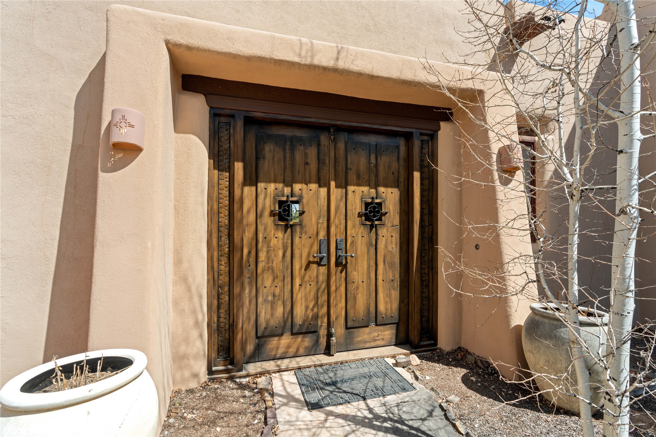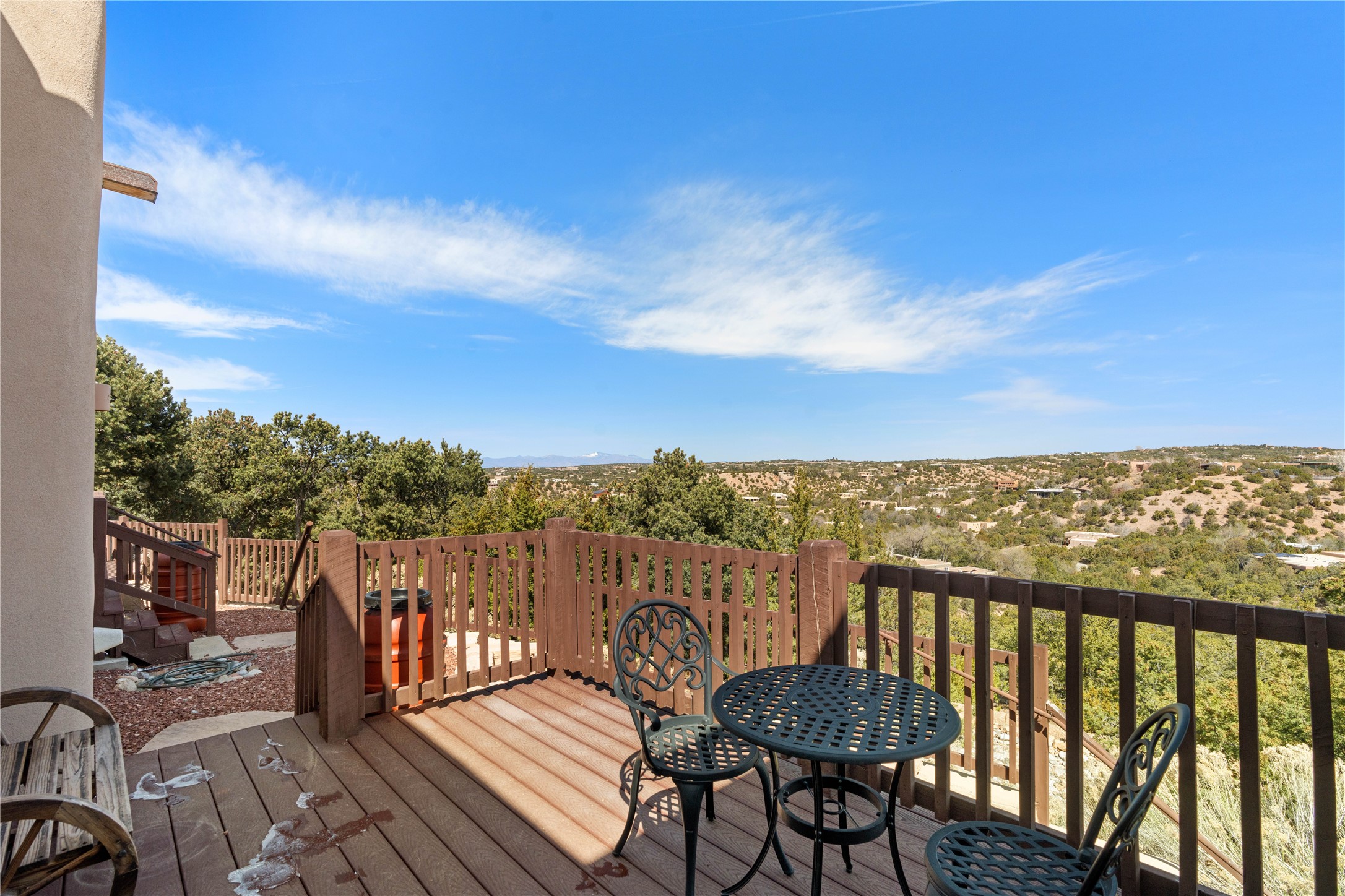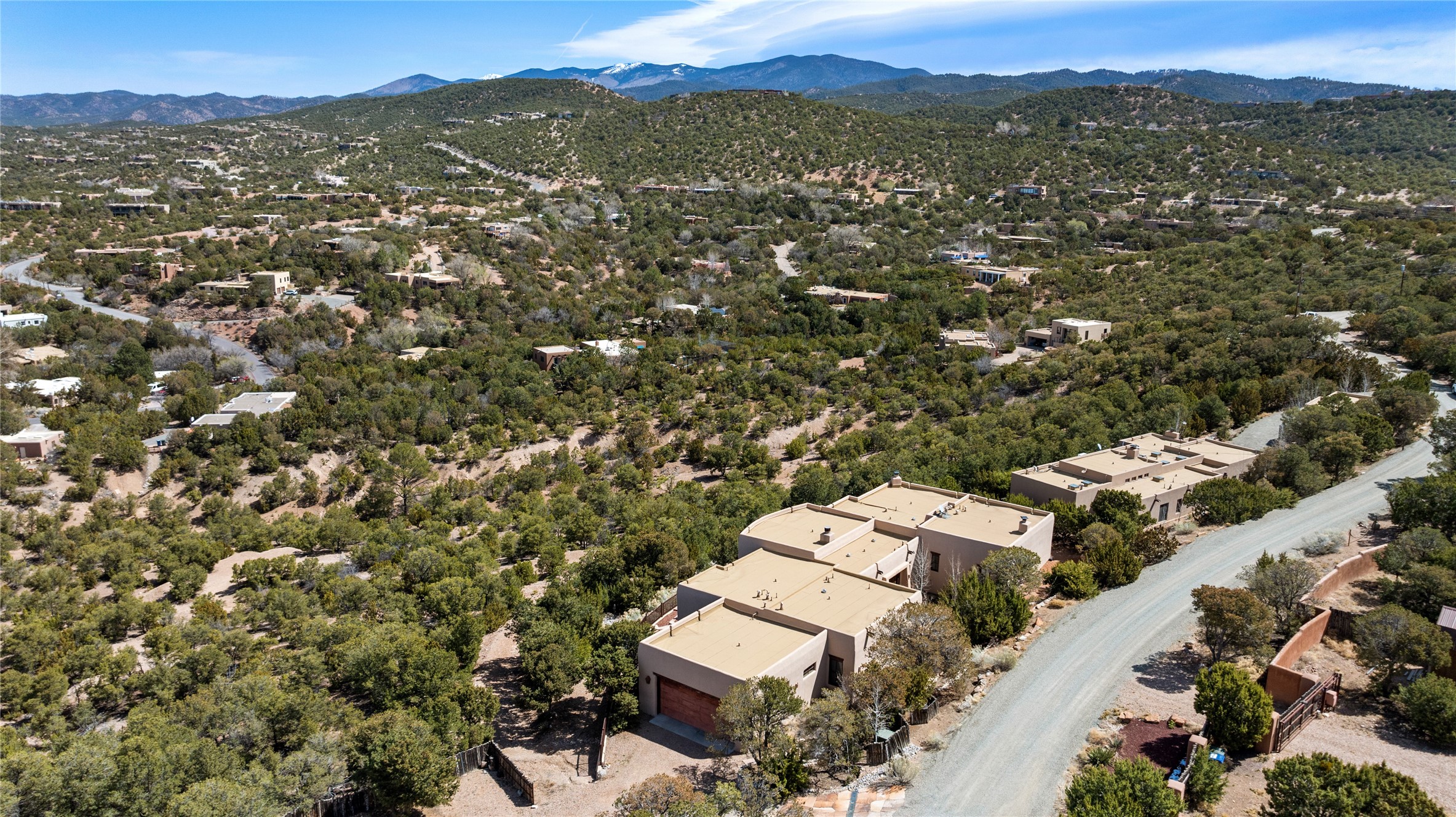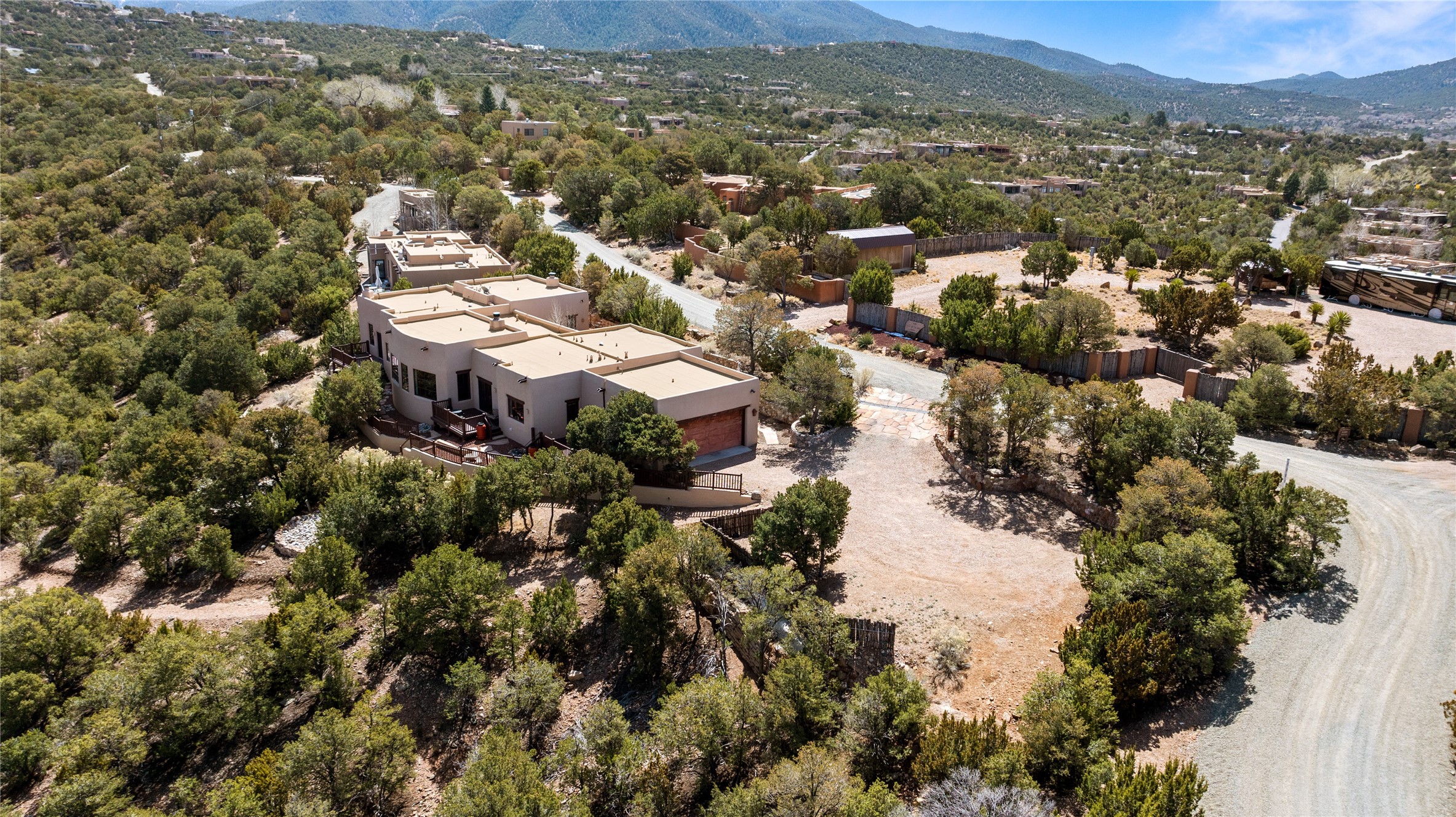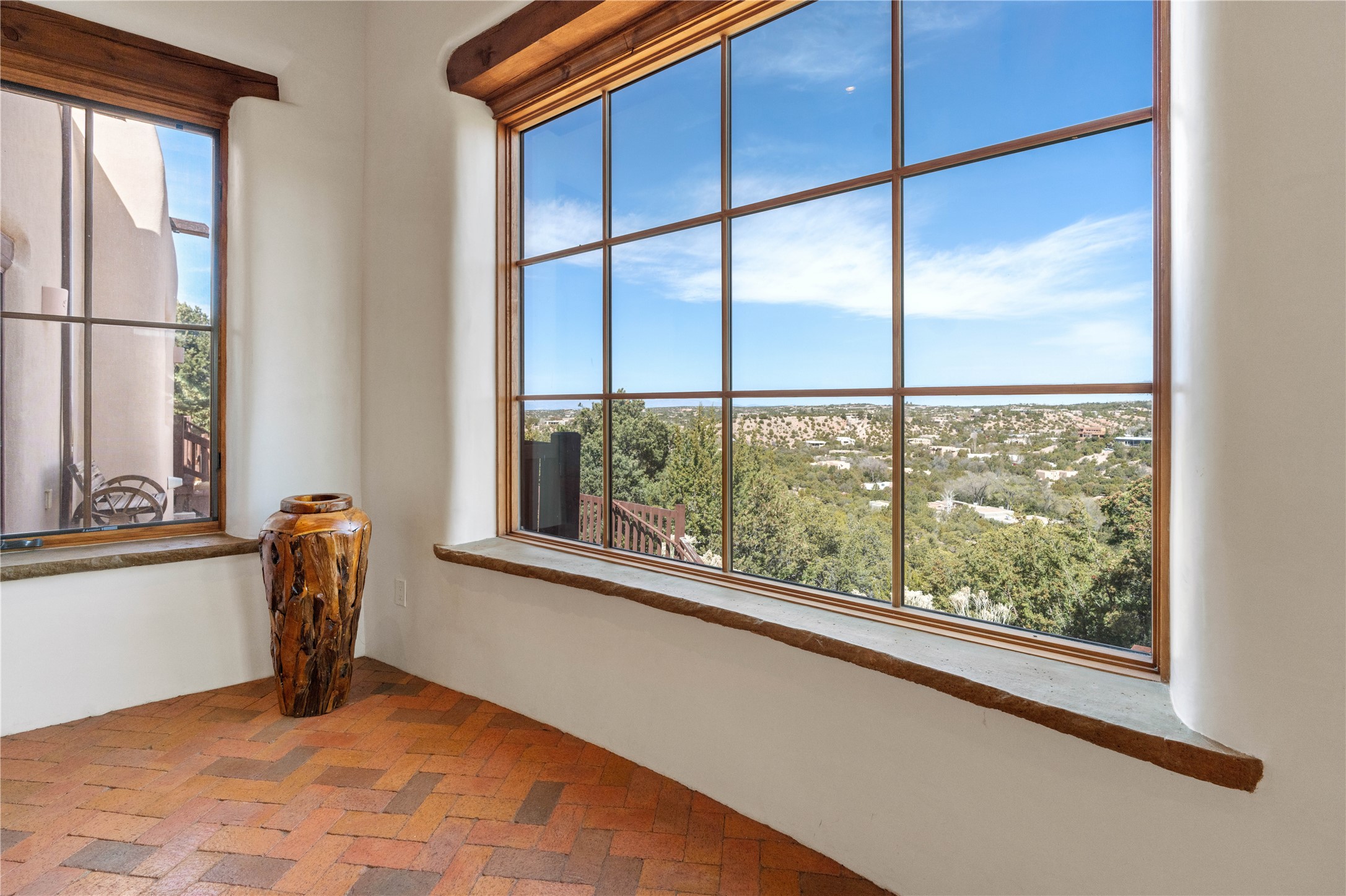 Experience timeless Santa Fe elegance in this exquisite 3-bedroom, 4-bath double adobe home perched on a 2.017 acre lot, offering sweeping 180 degree views of the Sangre de Cristo foothills. The location is fantastic--just minutes from the Santa Fe Plaza, Canyon Road, Museum Hill, Ten Thousand Waves, and less than 1/2 hour to the Santa Fe Ski Area. The residence features white plaster walls, beautifully laid brick floors, and soaring ceilings adorned with vigas and latillas. A new custom-made La Puerta front door sets the tone for the home's authentic charm. The en-suite primary bedroom boasts a corner fireplace and private balcony access. A separate guest suite includes its own kitchenette and entrance. Multiple decks provide perfect vantage points to relax and take in the stunning scenery. The gourmet kitchen, formal dining room, and three fireplaces create a warm, inviting atmosphere. A new roof was installed in 2020 and includes a transferable warranty for peace of mind. Additional highlights include a 2-car garage, ample off-street parking, and a potential building site on the lower portion of the lot. This is Santa Fe living at its finest - Schedule a showing today!