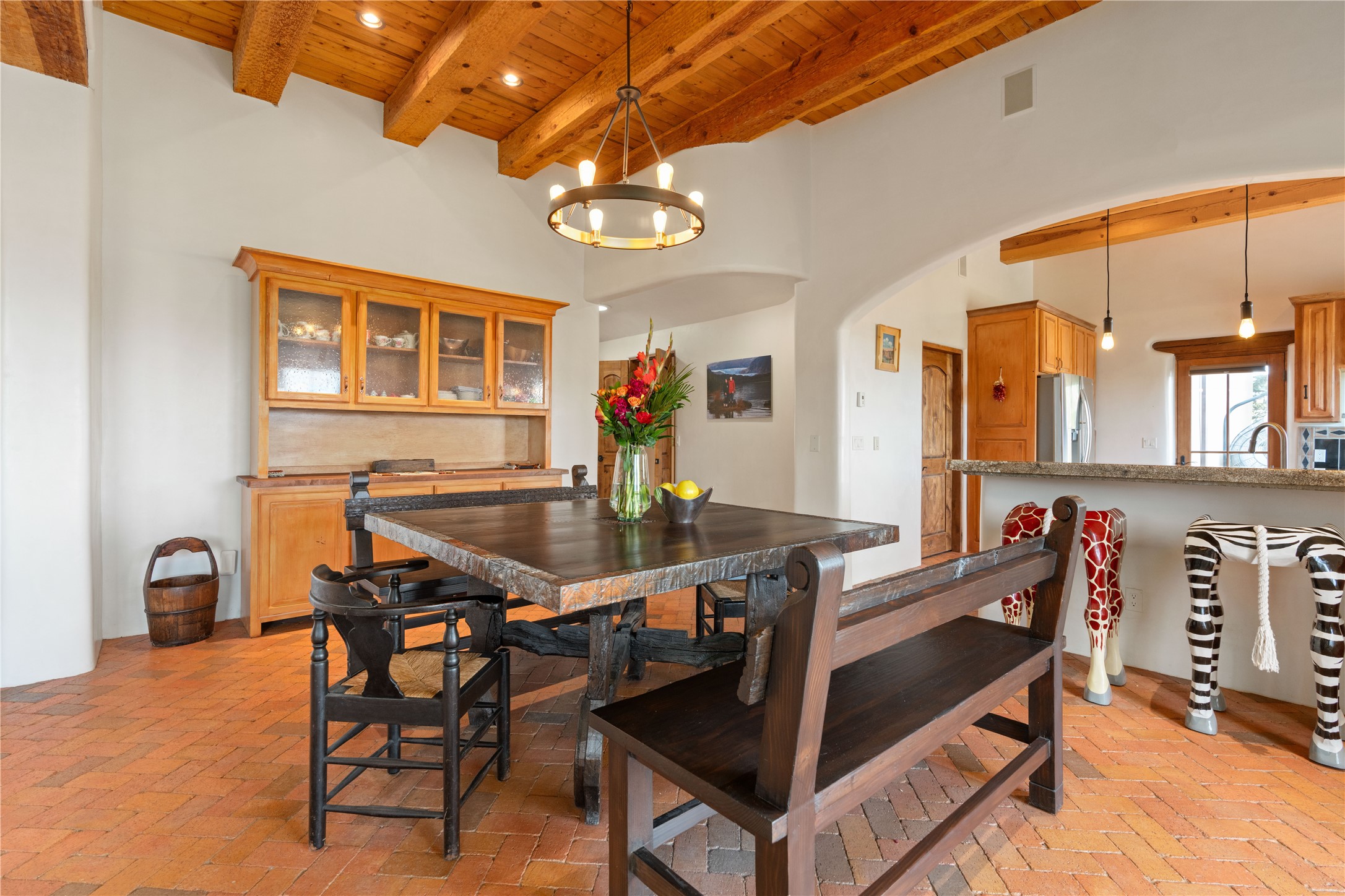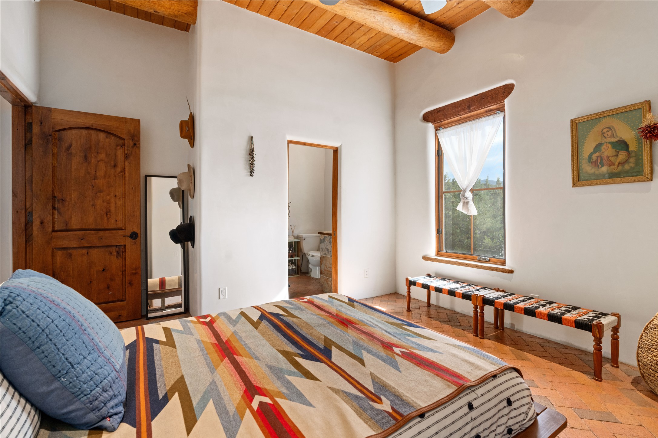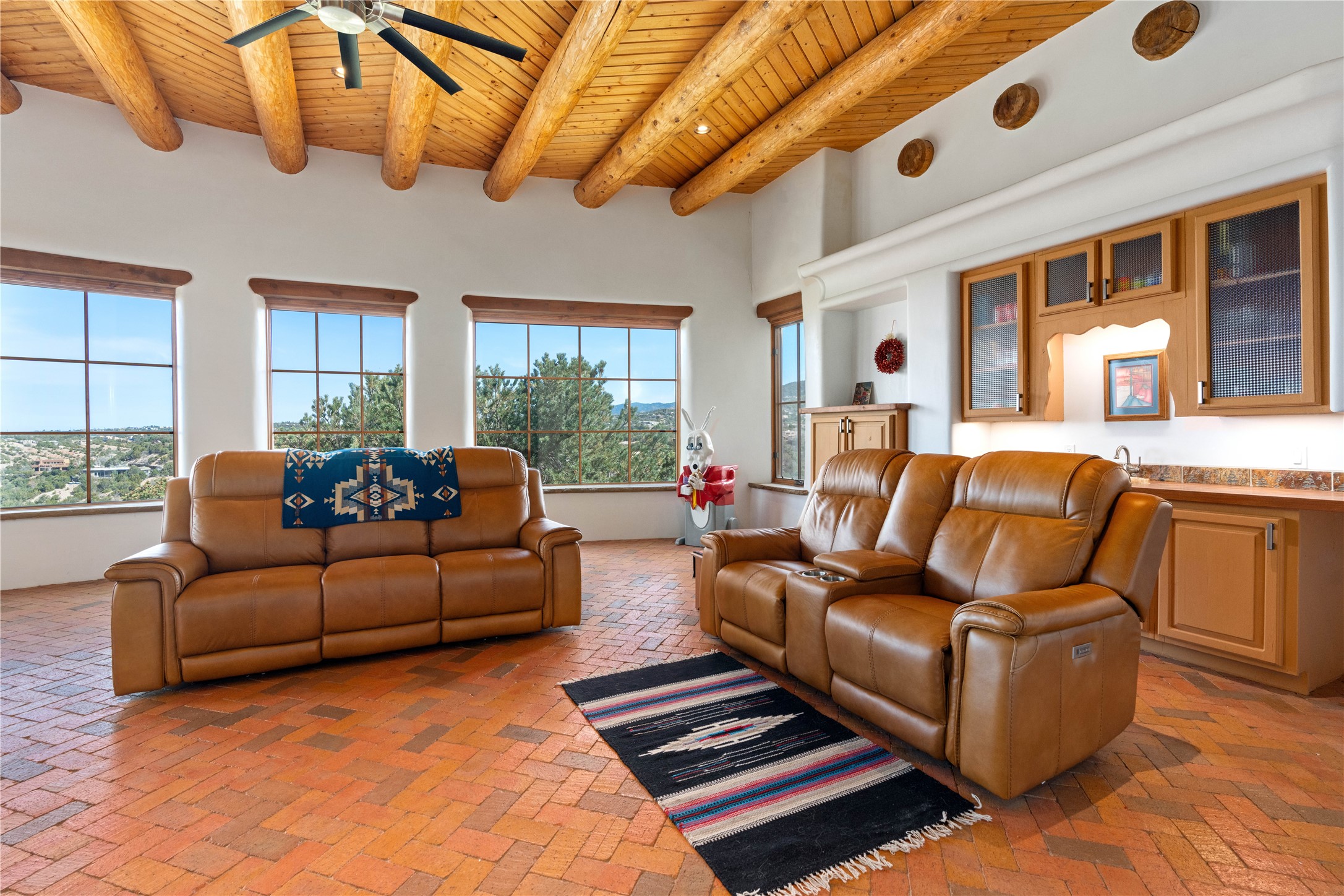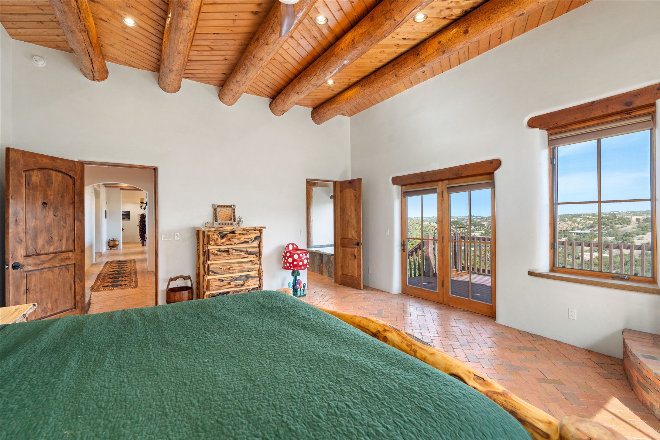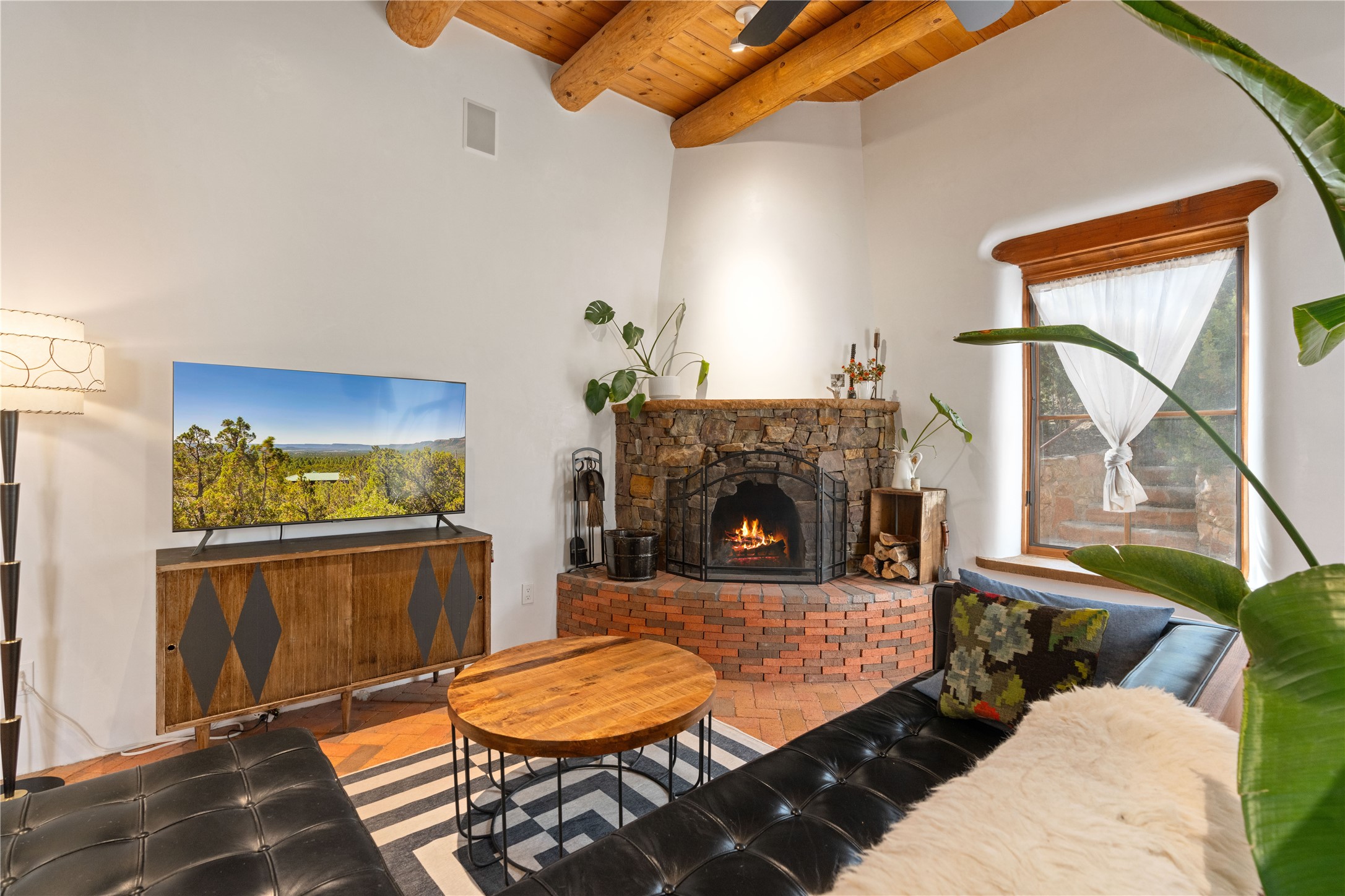 Experience timeless Santa Fe elegance in this exquisite 3-bedroom, 4-bath double adobe home perched on a 2.017 acre lot, offering sweeping 180 degree views of the Sangre de Cristo foothills. The location is fantastic--just minutes from the Santa Fe Plaza, Canyon Road, Museum Hill, Ten Thousand Waves, and less than 1/2 hour to the Santa Fe Ski Area. The residence features white plaster walls, beautifully laid brick floors, and soaring ceilings adorned with vigas and latillas. A new custom-made La Puerta front door sets the tone for the home's authentic charm. The en-suite primary bedroom boasts a corner fireplace and private balcony access. A separate guest suite includes its own kitchenette and entrance. Multiple decks provide perfect vantage points to relax and take in the stunning scenery. The gourmet kitchen, formal dining room, and three fireplaces create a warm, inviting atmosphere. A new roof was installed in 2020 and includes a transferable warranty for peace of mind. Additional highlights include a 2-car garage, ample off-street parking, and a potential building site on the lower portion of the lot. This is Santa Fe living at its finest - Schedule a showing today!