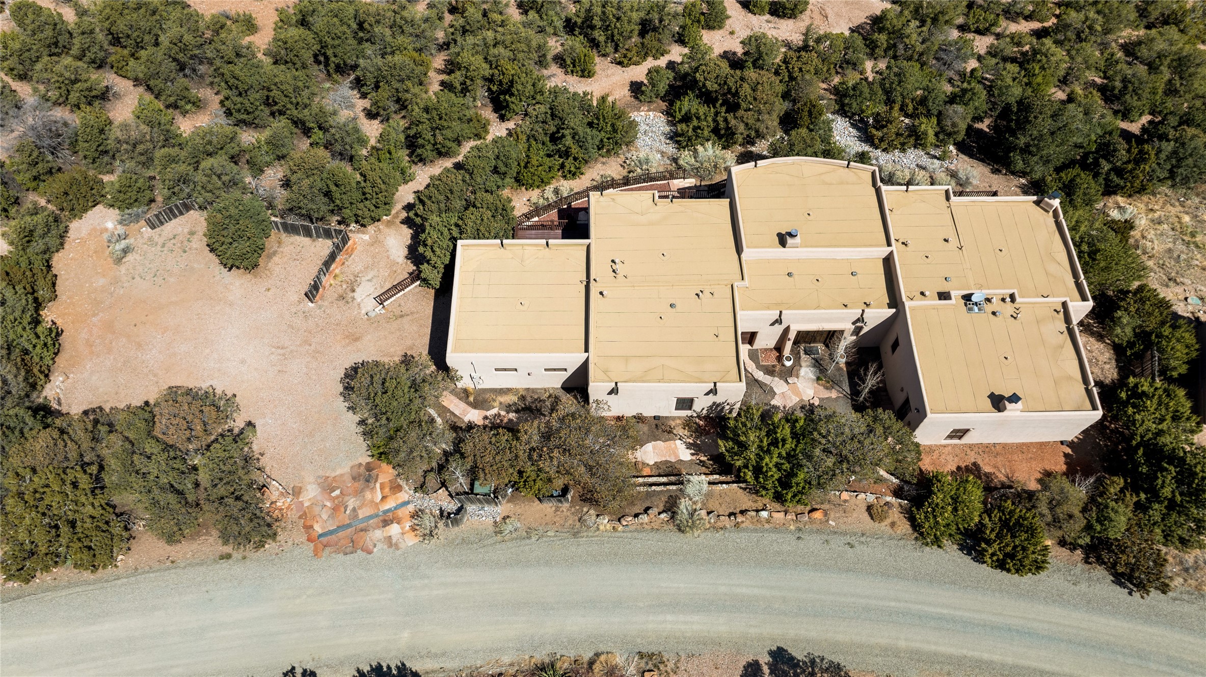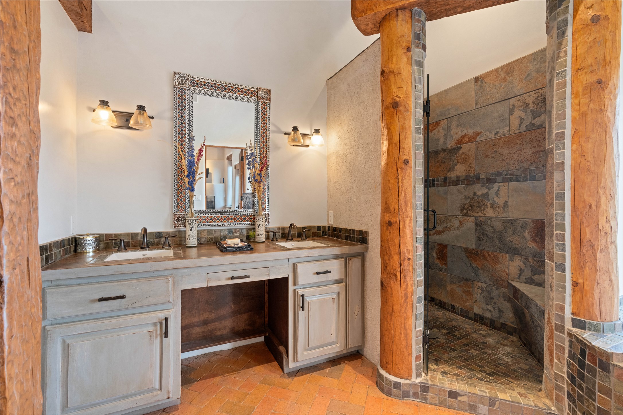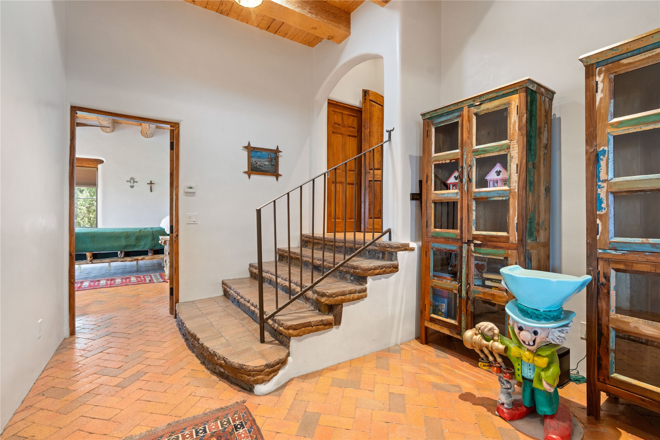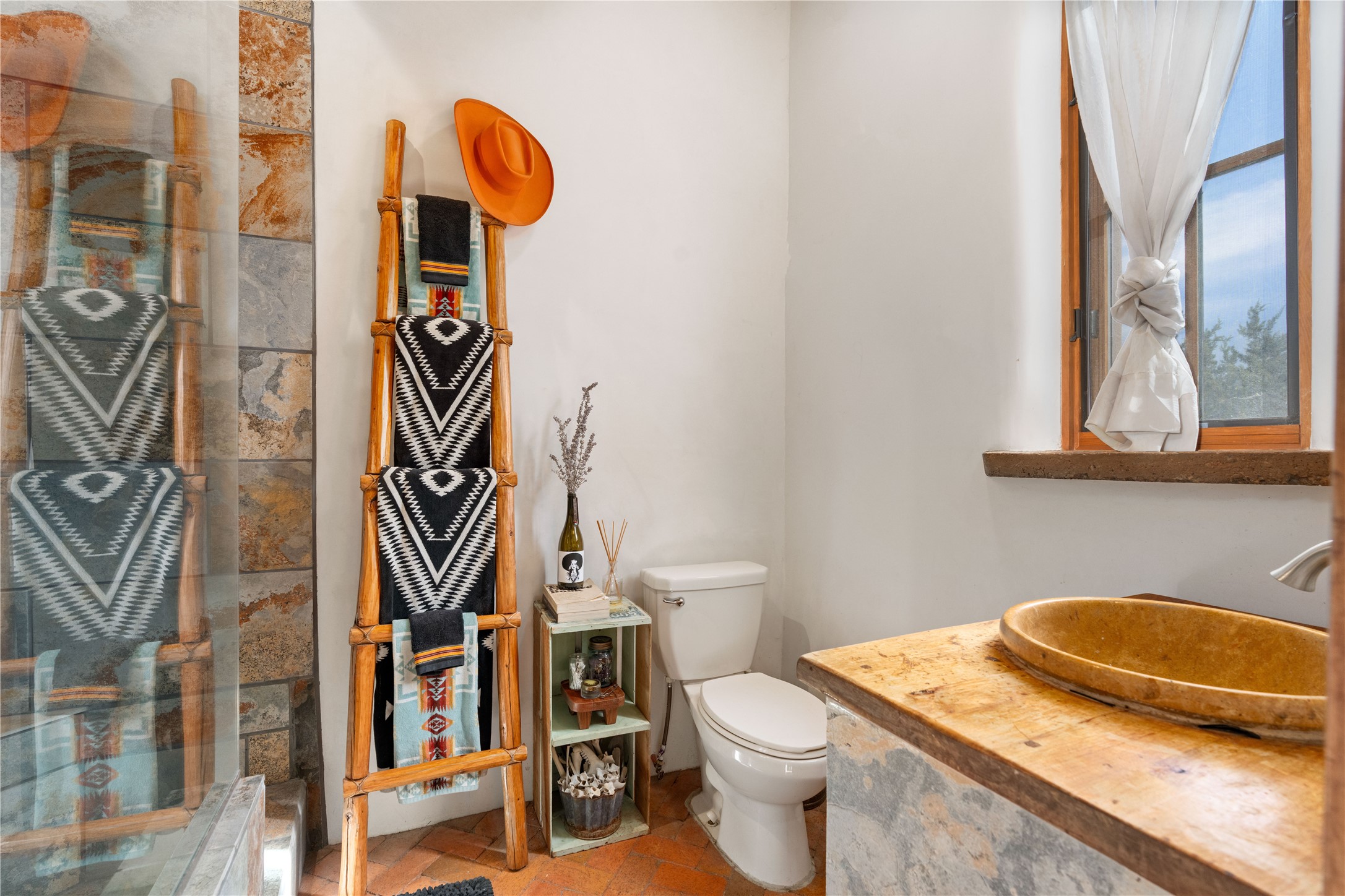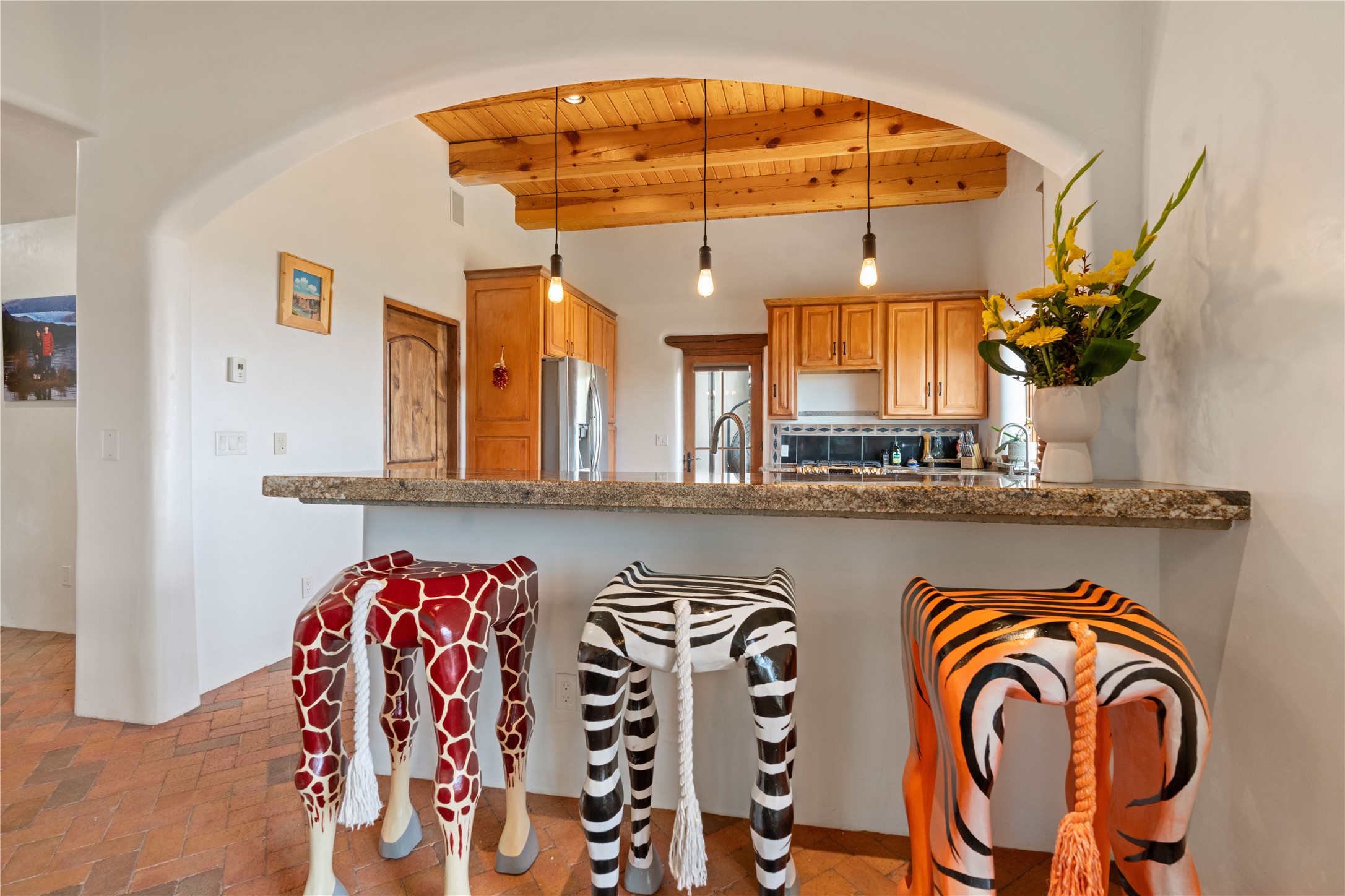 Experience timeless Santa Fe elegance in this exquisite 3-bedroom, 4-bath double adobe home perched on a 2.017 acre lot, offering sweeping 180 degree views of the Sangre de Cristo foothills. The location is fantastic--just minutes from the Santa Fe Plaza, Canyon Road, Museum Hill, Ten Thousand Waves, and less than 1/2 hour to the Santa Fe Ski Area. The residence features white plaster walls, beautifully laid brick floors, and soaring ceilings adorned with vigas and latillas. A new custom-made La Puerta front door sets the tone for the home's authentic charm. The en-suite primary bedroom boasts a corner fireplace and private balcony access. A separate guest suite includes its own kitchenette and entrance. Multiple decks provide perfect vantage points to relax and take in the stunning scenery. The gourmet kitchen, formal dining room, and three fireplaces create a warm, inviting atmosphere. A new roof was installed in 2020 and includes a transferable warranty for peace of mind. Additional highlights include a 2-car garage, ample off-street parking, and a potential building site on the lower portion of the lot. This is Santa Fe living at its finest - Schedule a showing today!