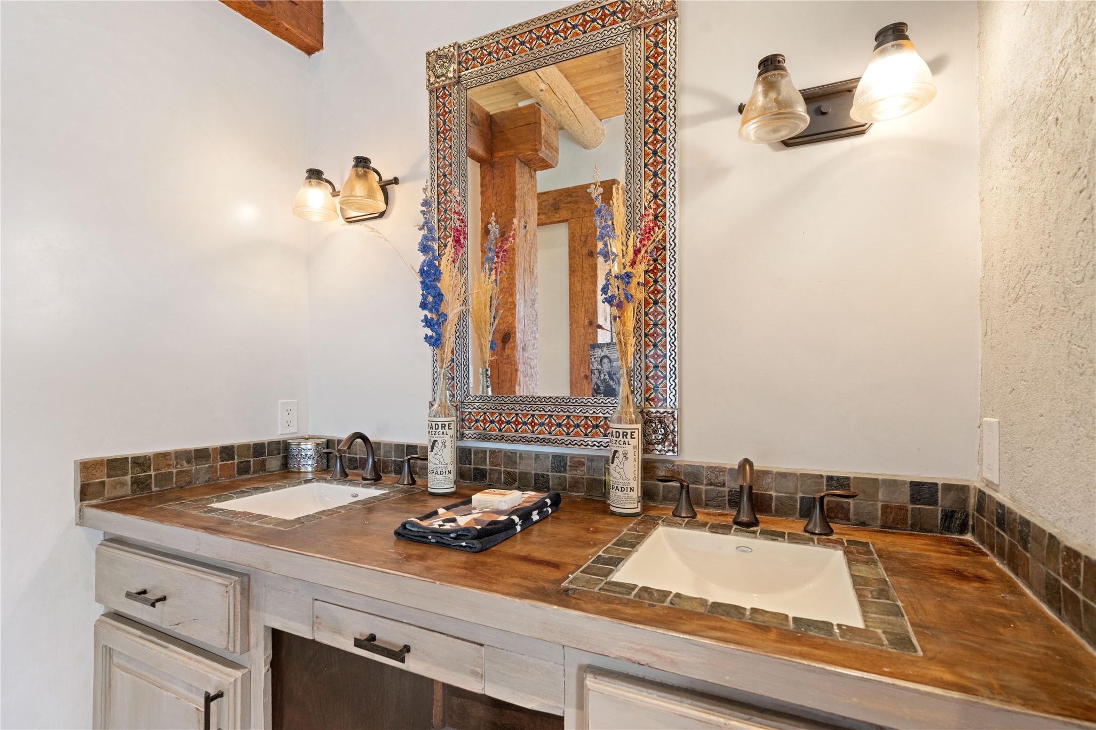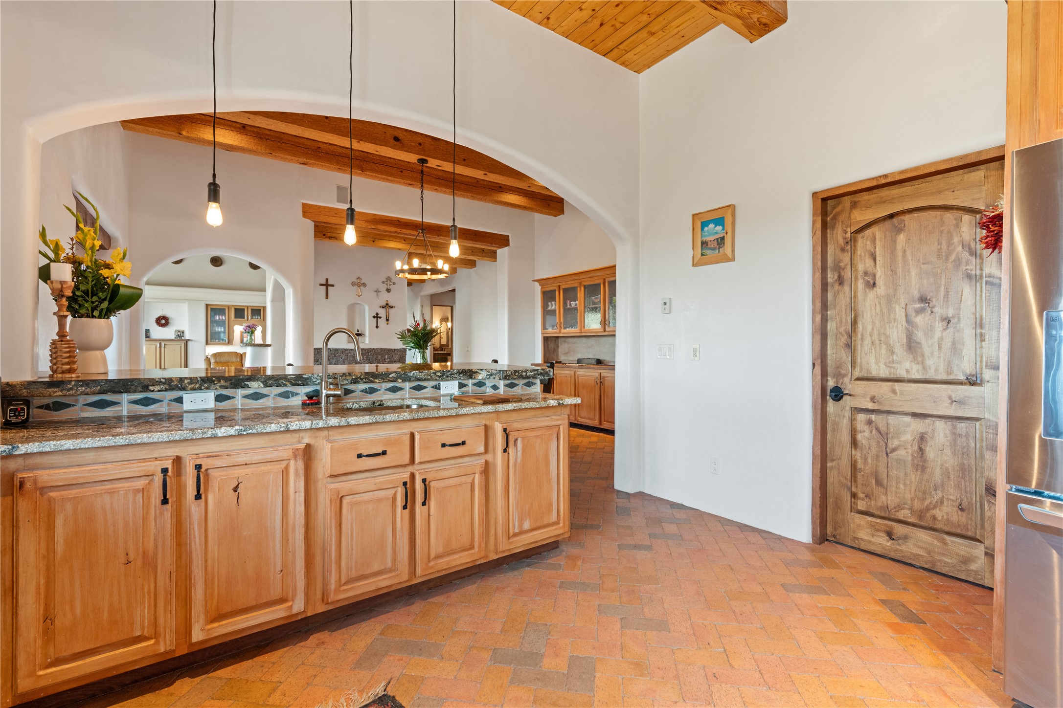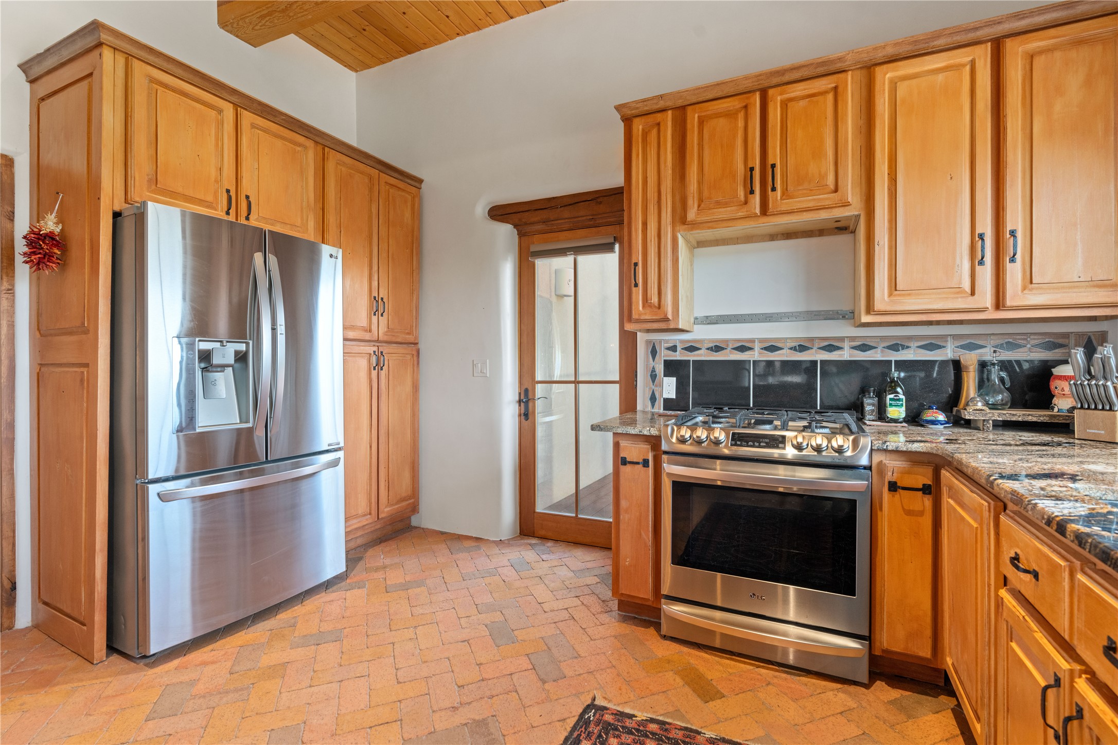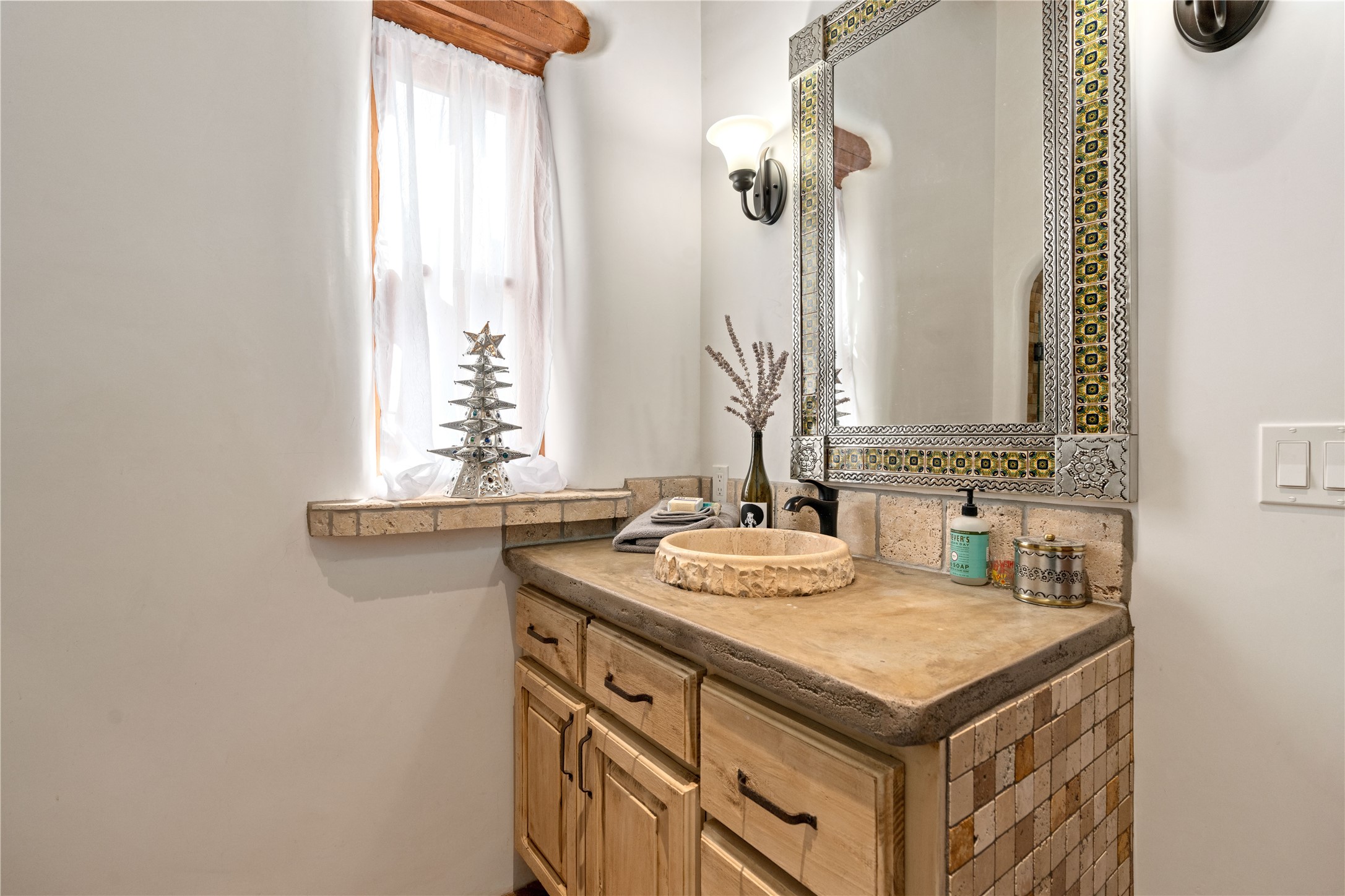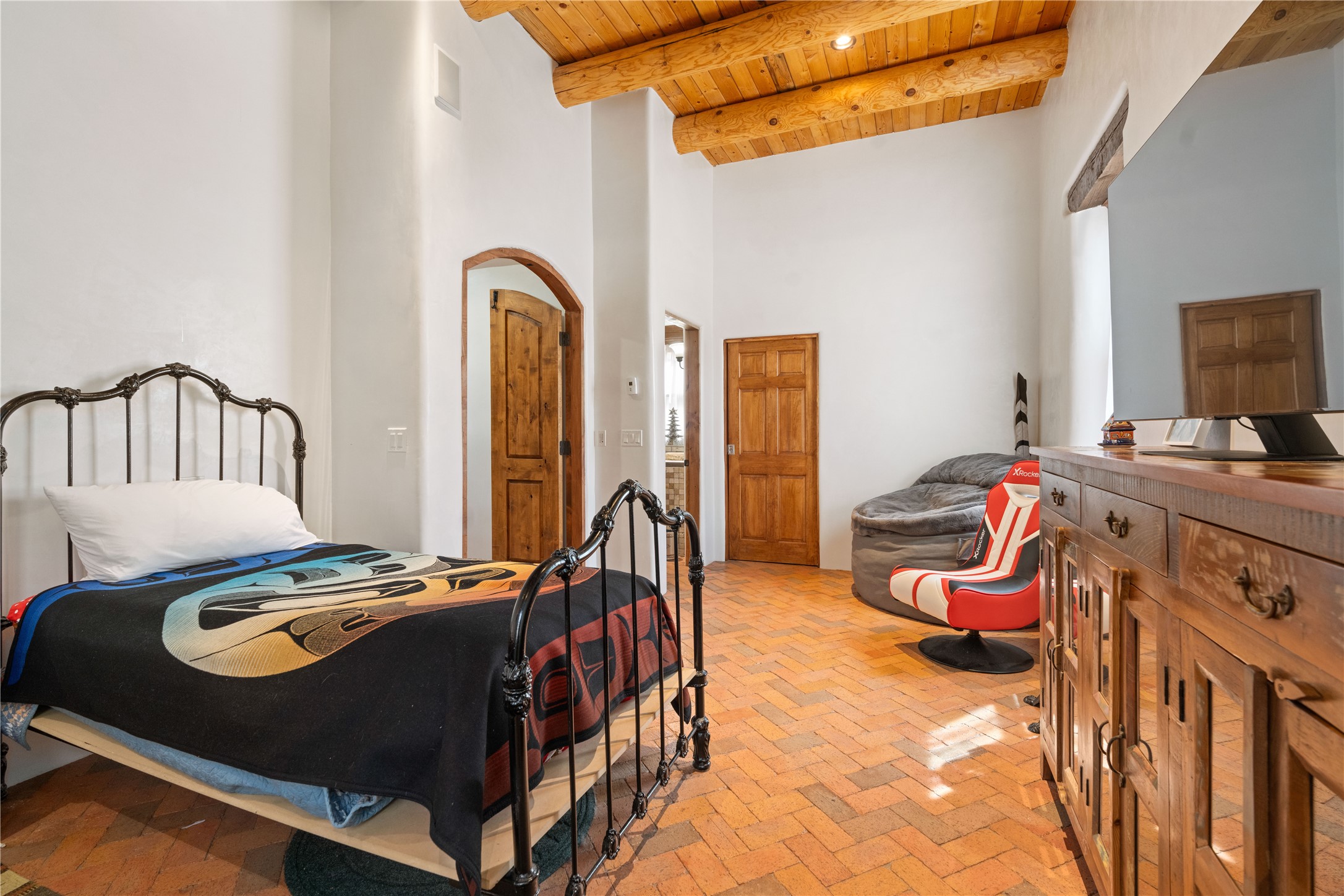 Experience timeless Santa Fe elegance in this exquisite 3-bedroom, 4-bath double adobe home perched on a 2.017 acre lot, offering sweeping 180 degree views of the Sangre de Cristo foothills. The location is fantastic--just minutes from the Santa Fe Plaza, Canyon Road, Museum Hill, Ten Thousand Waves, and less than 1/2 hour to the Santa Fe Ski Area. The residence features white plaster walls, beautifully laid brick floors, and soaring ceilings adorned with vigas and latillas. A new custom-made La Puerta front door sets the tone for the home's authentic charm. The en-suite primary bedroom boasts a corner fireplace and private balcony access. A separate guest suite includes its own kitchenette and entrance. Multiple decks provide perfect vantage points to relax and take in the stunning scenery. The gourmet kitchen, formal dining room, and three fireplaces create a warm, inviting atmosphere. A new roof was installed in 2020 and includes a transferable warranty for peace of mind. Additional highlights include a 2-car garage, ample off-street parking, and a potential building site on the lower portion of the lot. This is Santa Fe living at its finest - Schedule a showing today!