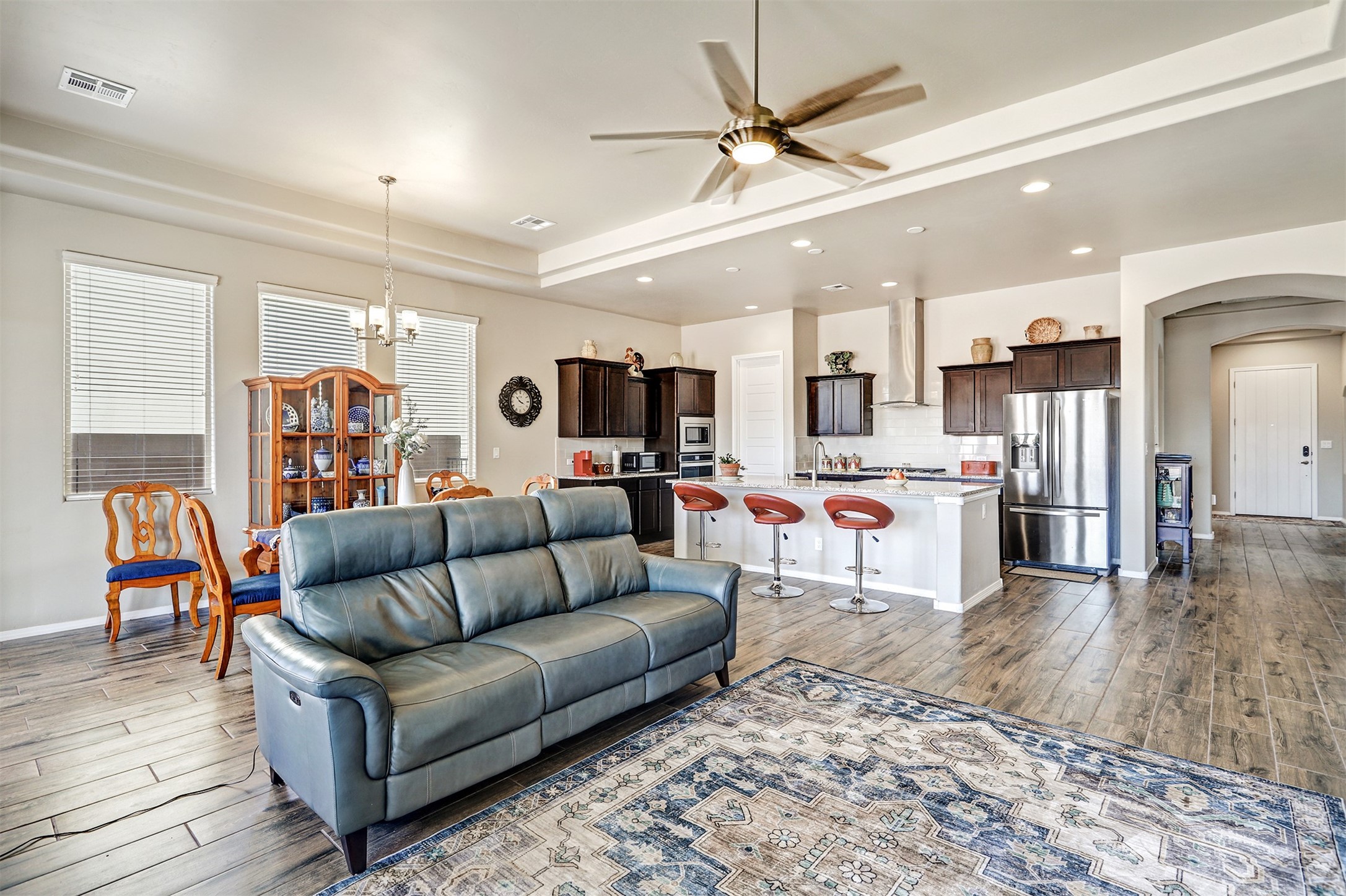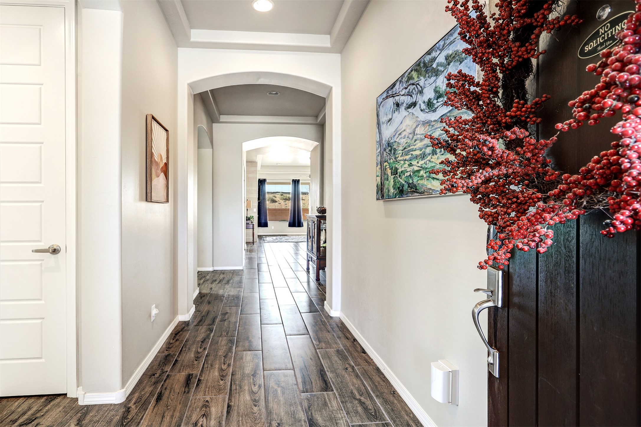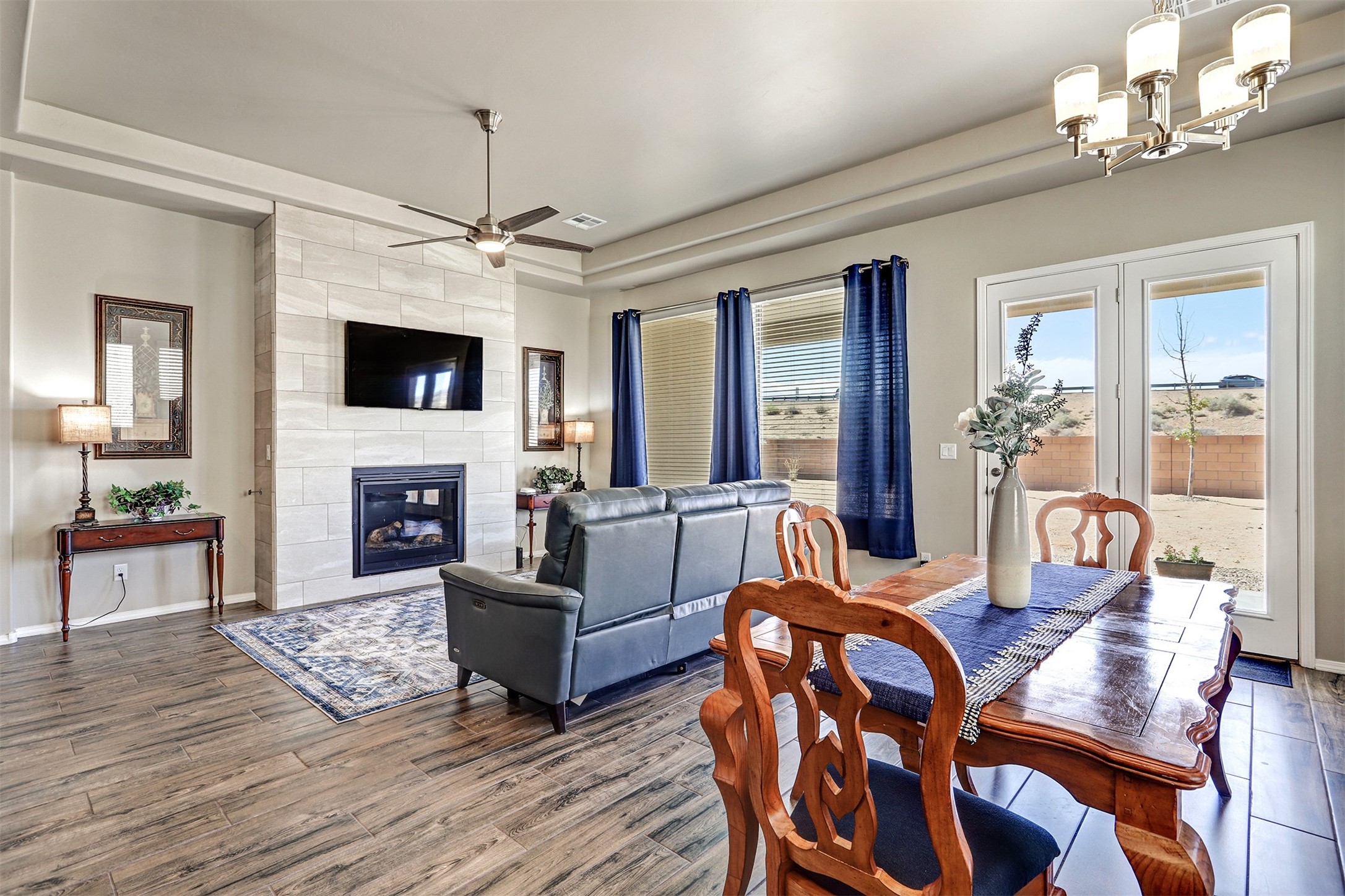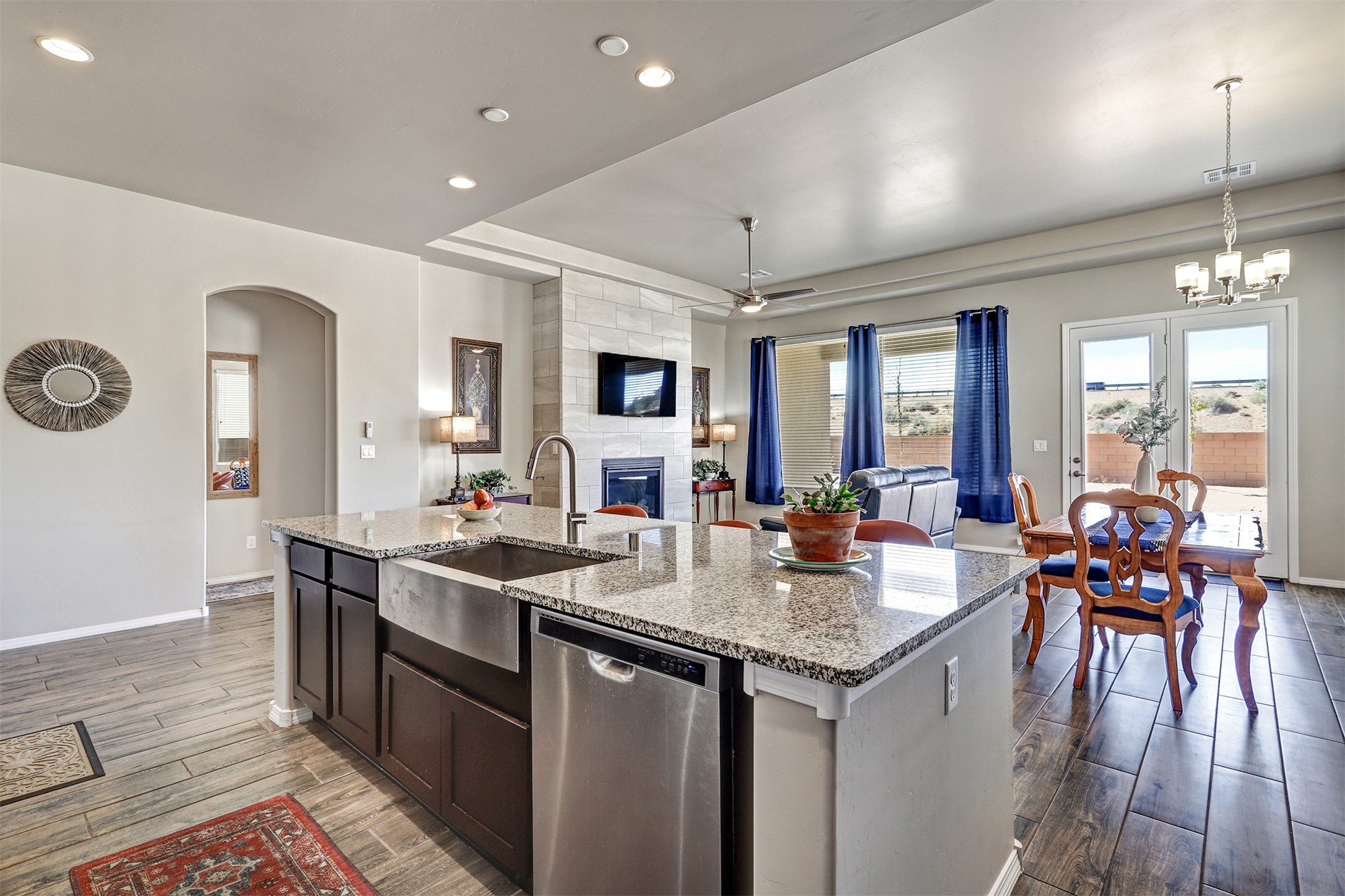 Why wait (or pay more) for new construction? This 2022 Hakes Brothers home in Lomas Encantadas offers modern design, thoughtful upgrades, and better value -- all with the PID fully paid and priced at just $211/SF!Stylishly appointed and meticulously maintained, this home blends comfort and practicality. The open-concept living/dining area features soaring ceilings and a cozy gas fireplace, while wood-look tile flooring flows through the main living areas. The spacious kitchen is a dream, with a large island, granite countertops, and abundant storage.The primary suite is thoughtfully separated for privacy and features an oversized walk-in closet and a well-appointed bath. A flexible 4th bedroom or office, a roomy laundry room, and a generous 2-car garage round out the interior. Outdoors, the arroyo beside the home provides space and privacy -- a rare find in new builds.Located in northern Rio Rancho, this home offers quick access to NM-550 and I-25, making commutes to Albuquerque, Santa Fe, or Los Alamos a breeze.Skip the wait and get more for less -- schedule your showing today!