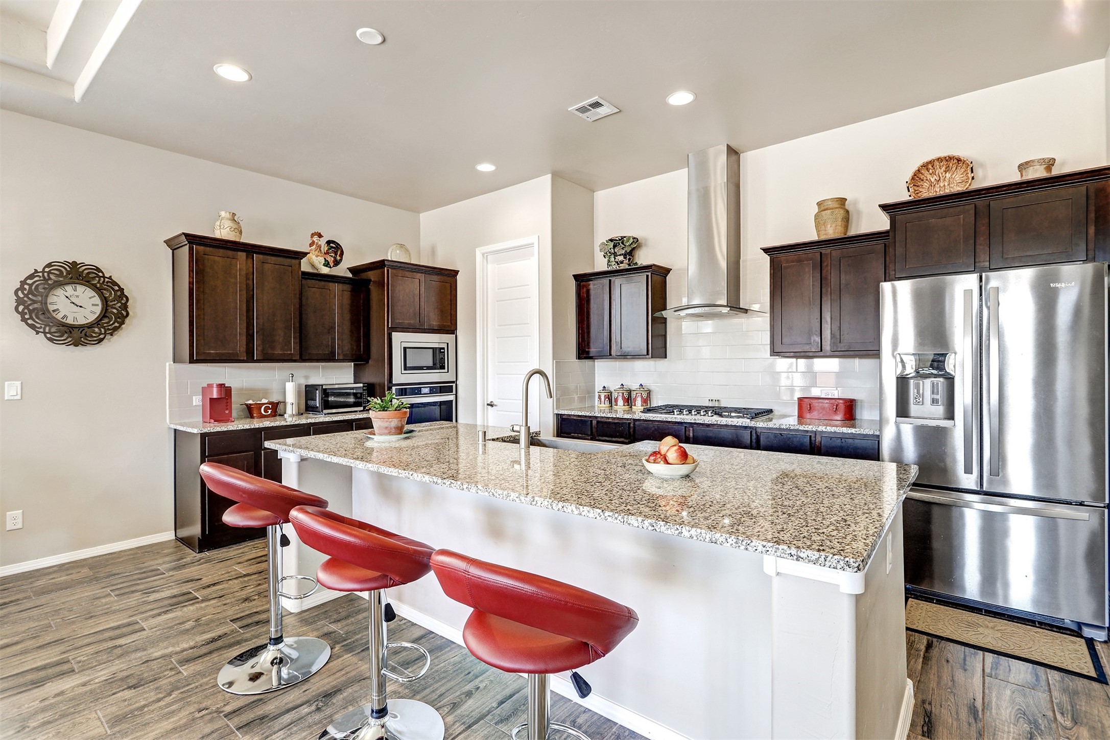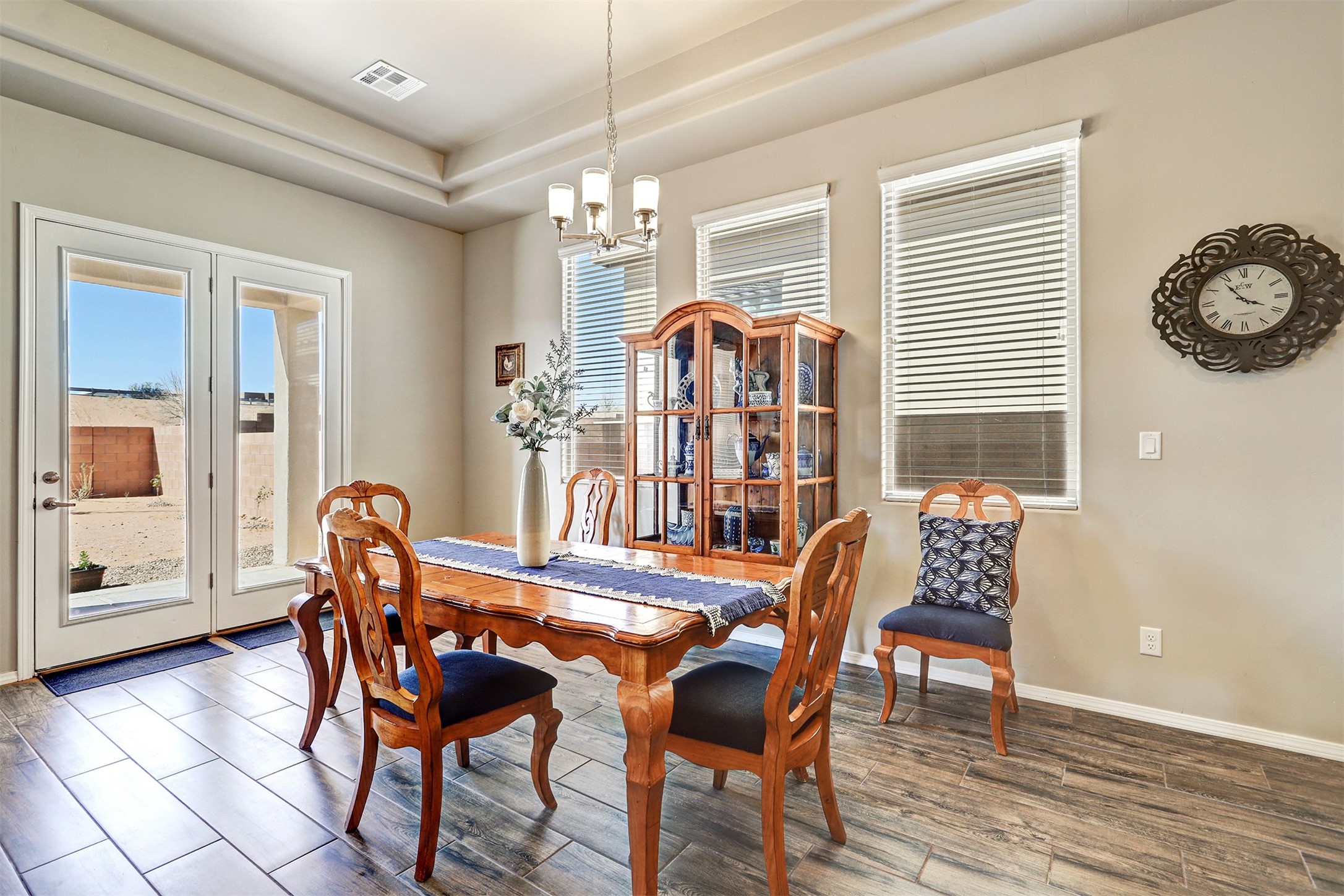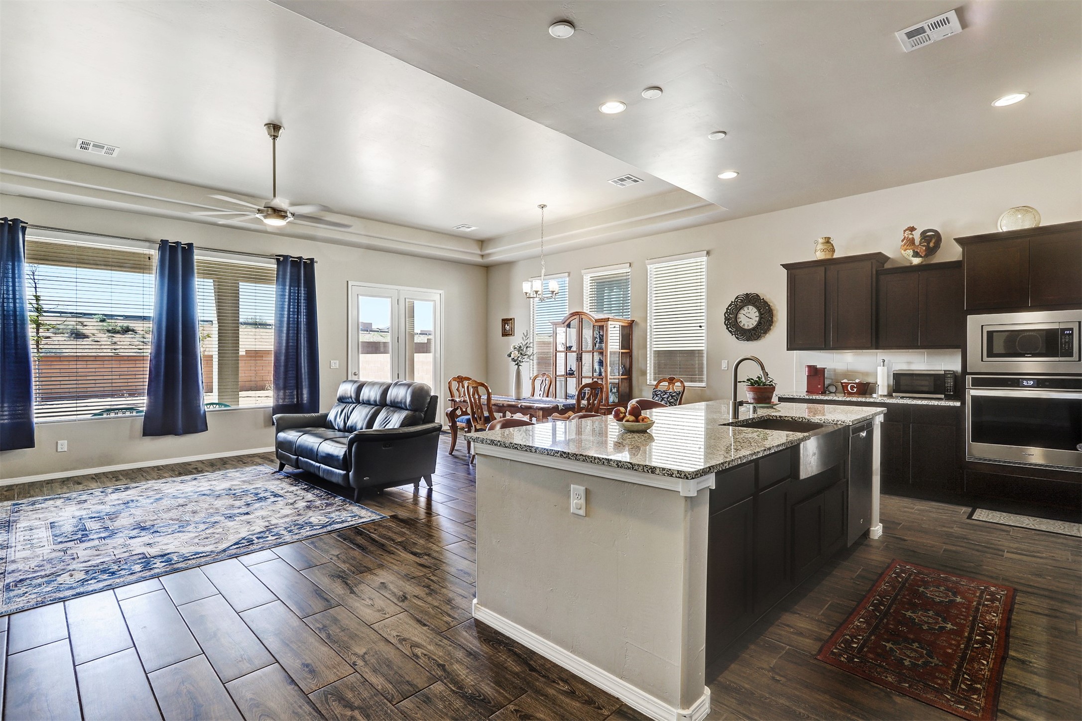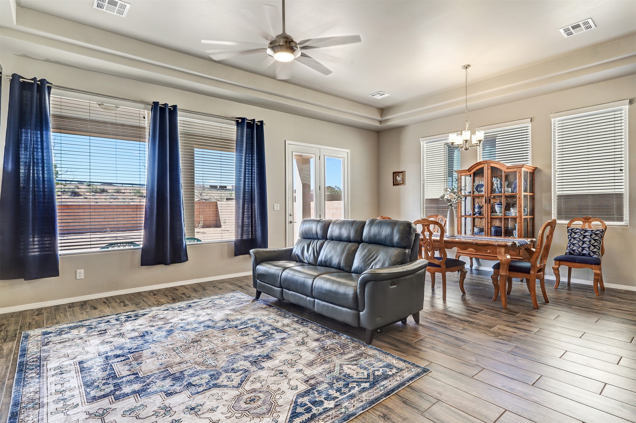 Why wait (or pay more) for new construction? This 2022 Hakes Brothers home in Lomas Encantadas offers modern design, thoughtful upgrades, and better value -- all with the PID fully paid and priced at just $211/SF!Stylishly appointed and meticulously maintained, this home blends comfort and practicality. The open-concept living/dining area features soaring ceilings and a cozy gas fireplace, while wood-look tile flooring flows through the main living areas. The spacious kitchen is a dream, with a large island, granite countertops, and abundant storage.The primary suite is thoughtfully separated for privacy and features an oversized walk-in closet and a well-appointed bath. A flexible 4th bedroom or office, a roomy laundry room, and a generous 2-car garage round out the interior. Outdoors, the arroyo beside the home provides space and privacy -- a rare find in new builds.Located in northern Rio Rancho, this home offers quick access to NM-550 and I-25, making commutes to Albuquerque, Santa Fe, or Los Alamos a breeze.Skip the wait and get more for less -- schedule your showing today!