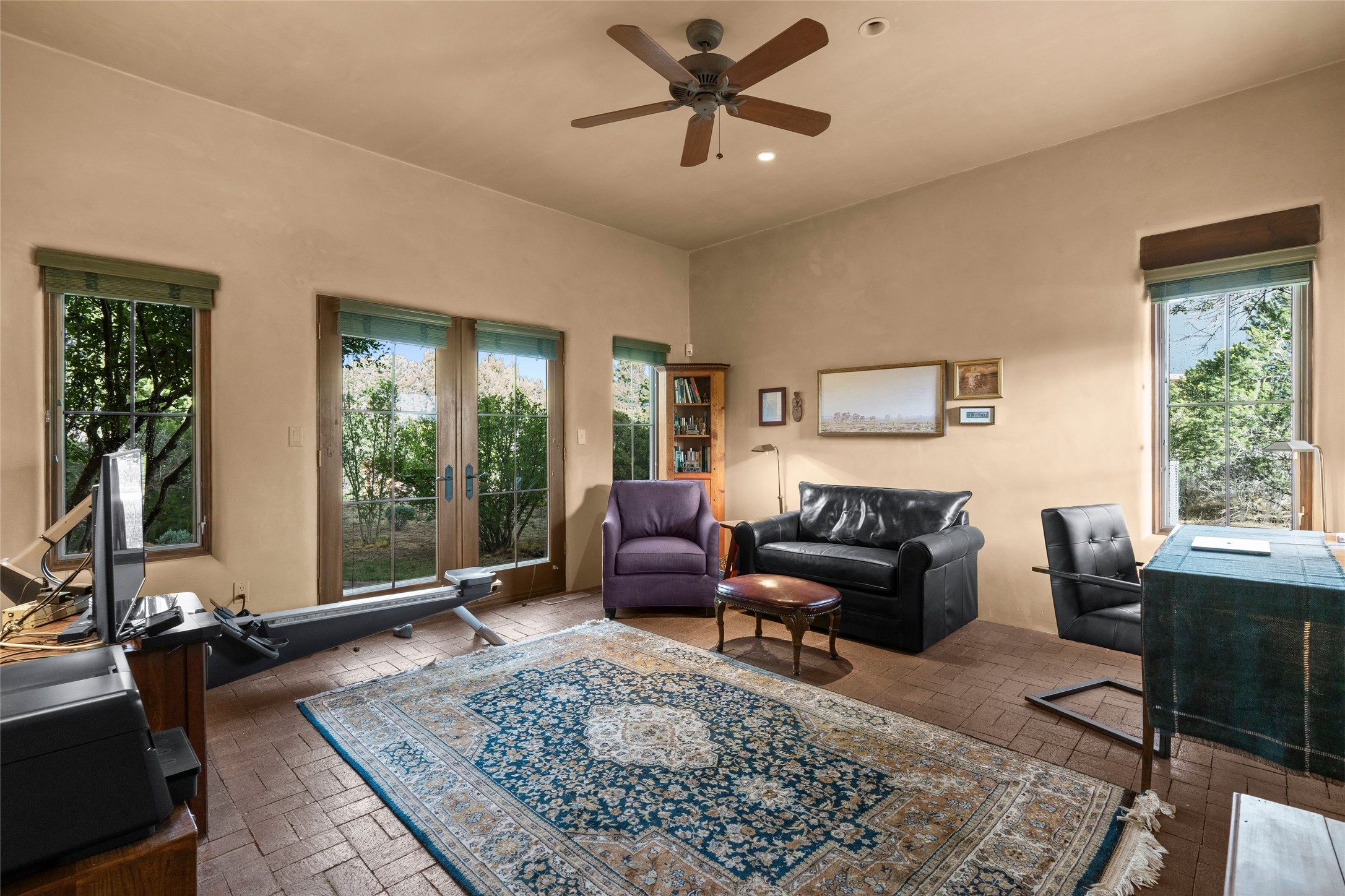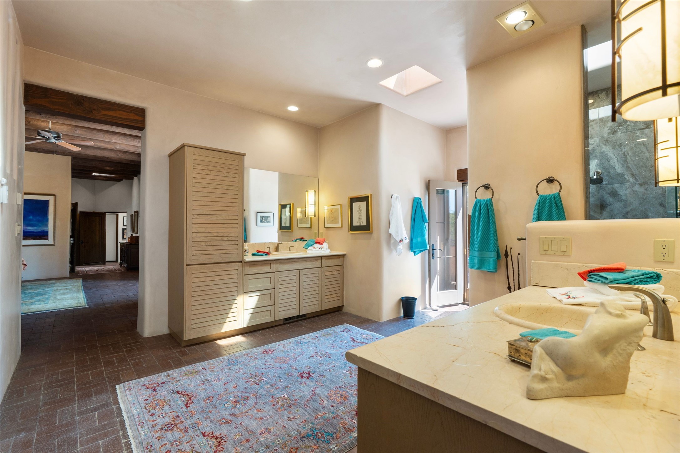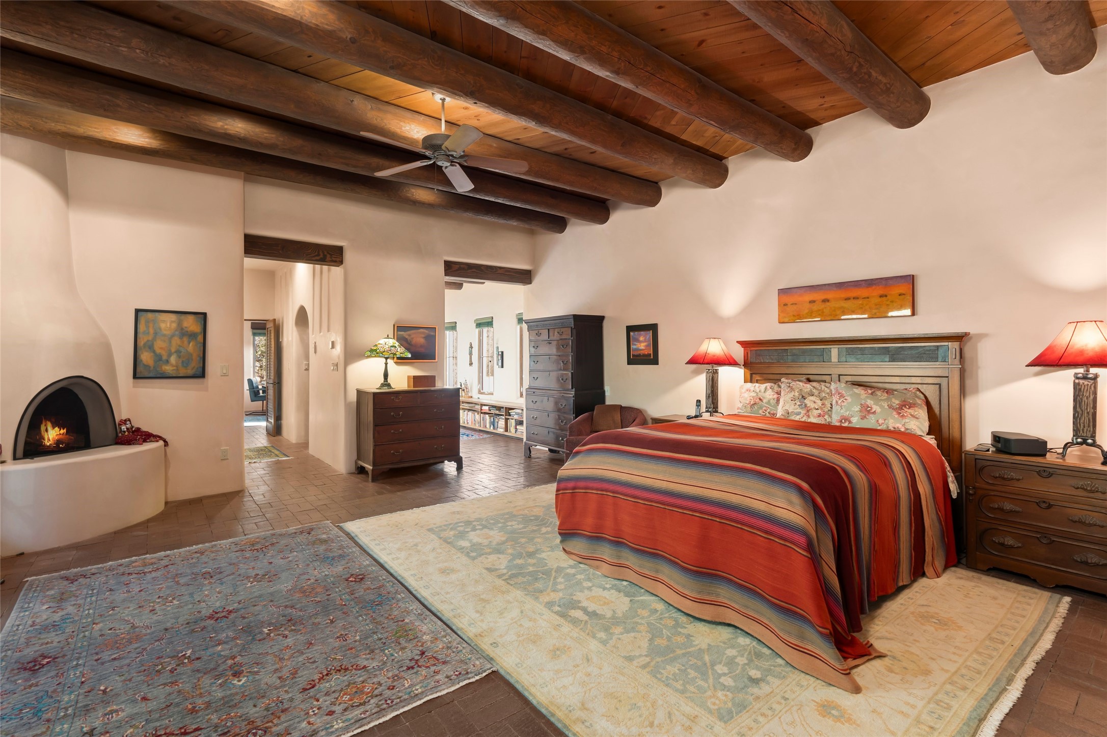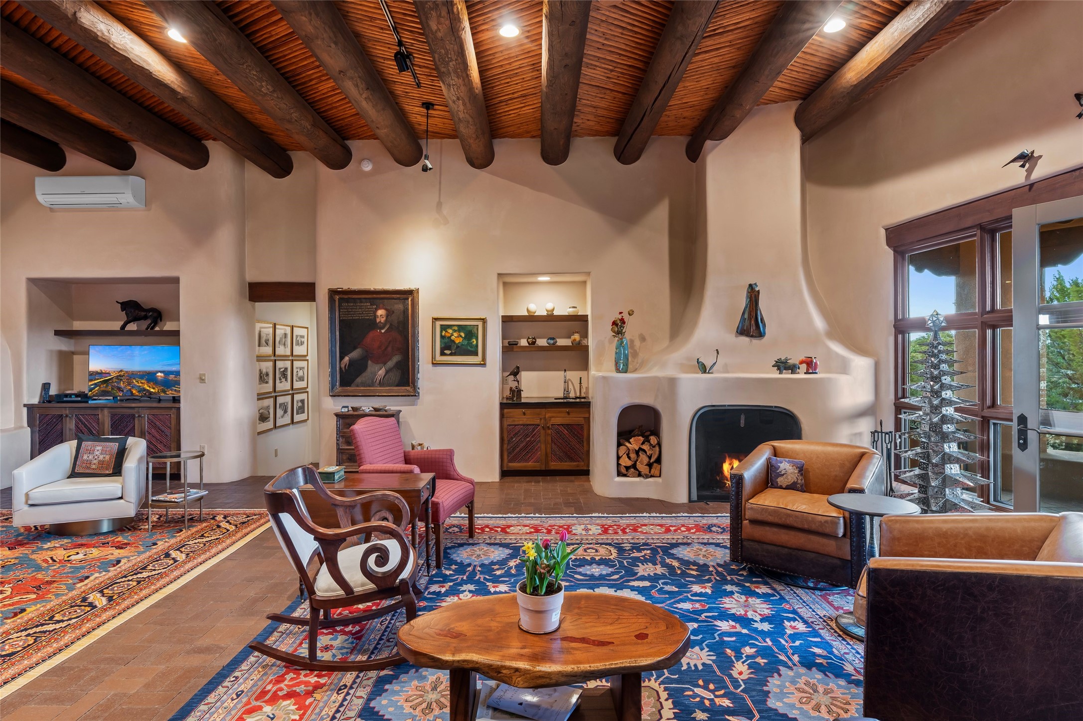 This Soft Contemporary 3-Bed + Den + Retreat / 3.5 -Bath home offers Sangre de Cristo Mountain Views in gated Las Campanas. The Great Room is truly Great, with 2 areas for socializing - One with a Kiva Fireplace, built-in TV / entertainment niche & doors to the Front Portal area. The other is a conversation area with a free-flowing kiva fireplace, wet bar, room for a Baby Grand Piano, Sangre de Cristo views plus access to the Back Portal area with wood-burning kiva fireplace. The Dining area is perfect for sharing meals & has access to the Back Portal area with Built-in BBQ & in-ground spa. The Kitchen has a Sub-Zero refrigerator, Bosch Dishwasher, Dacor Oven & Microwave plus a generous island with Dacor gas cooktop & prep sink. There is also a walk-in wine storage area plus Buffet & Butler's Pantry, both with ample storage. The Owner's Suite includes a kiva fireplace, walk-in closet & its own private portal with a Sangre de Cristo Mountain view. The Owner's Bath offers 2 separate vanities, 2 separate water closets, walk-in shower with body sprays & direct access to the In-ground Spa & outdoor shower. Also in the Owner's Suite wing, there is a private Den / Office with walk-in closet & outdoor access through double French doors as well as a south-facing Library / Retreat area. Two secondary bedrooms, each with their own bathrooms, are on the opposite side of the home, creating privacy from the Owner's Suite. The spacious outdoor area offers a multitude of desirable features - Private In-Ground Spa, Outdoor Shower, Built-in BBQ, Extensive shaded portal areas with wood-burning fireplace & a spacious roof deck with 360-degree Mountain Views. The 3-car garage includes a third, separate stall that can be used as a studio. This fabulous home checks all the boxes - 3 Bedrooms + Den + Retreat * 3 Baths * 3-Car Garage * In-ground Spa * Outdoor Shower * Spacious Roof Deck * Sangre de Cristo Mountain views - Make it yours Today!