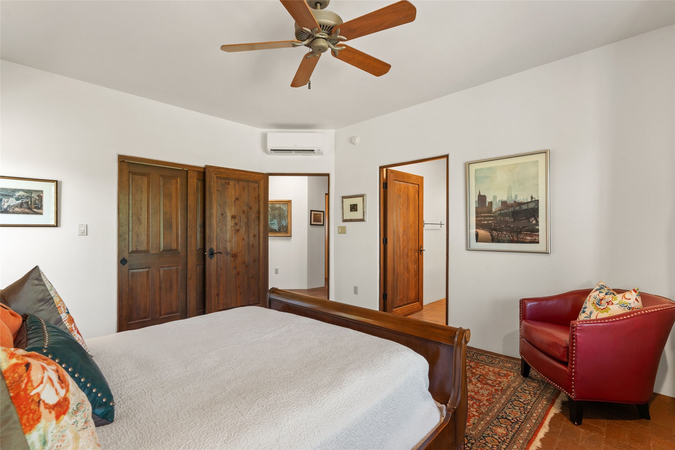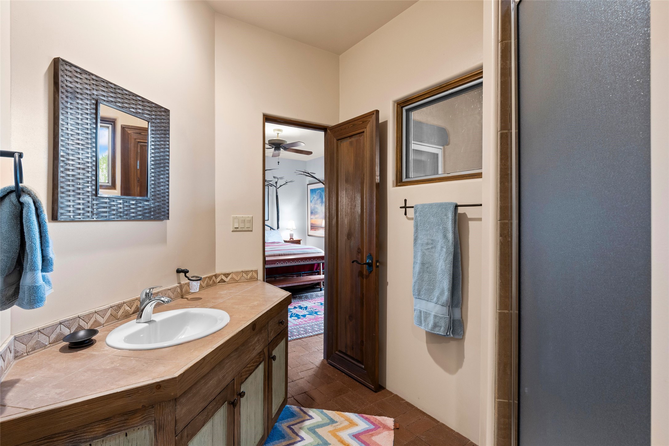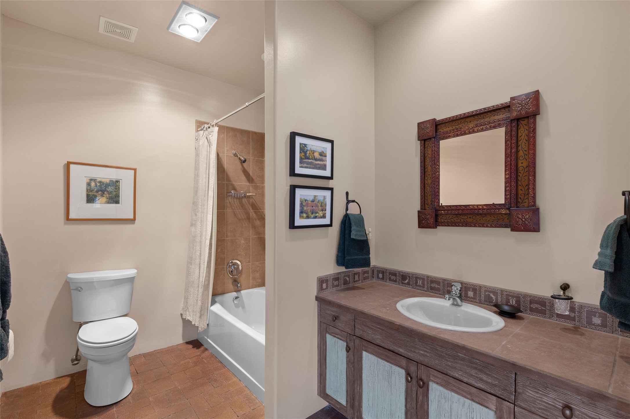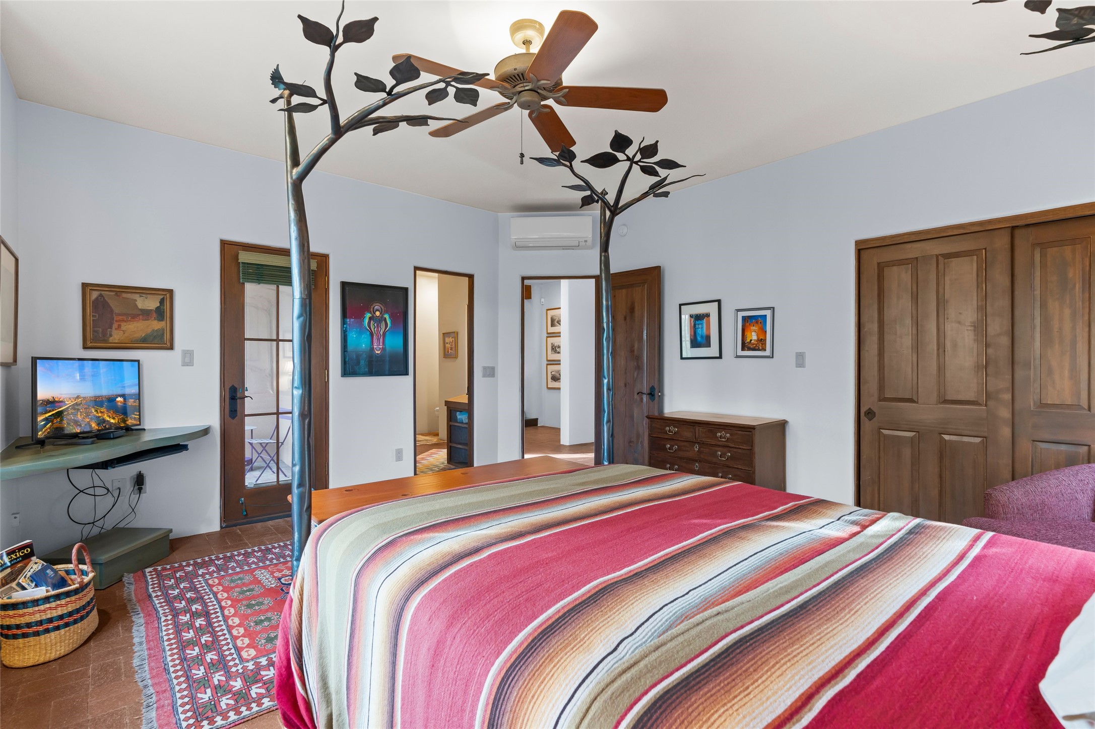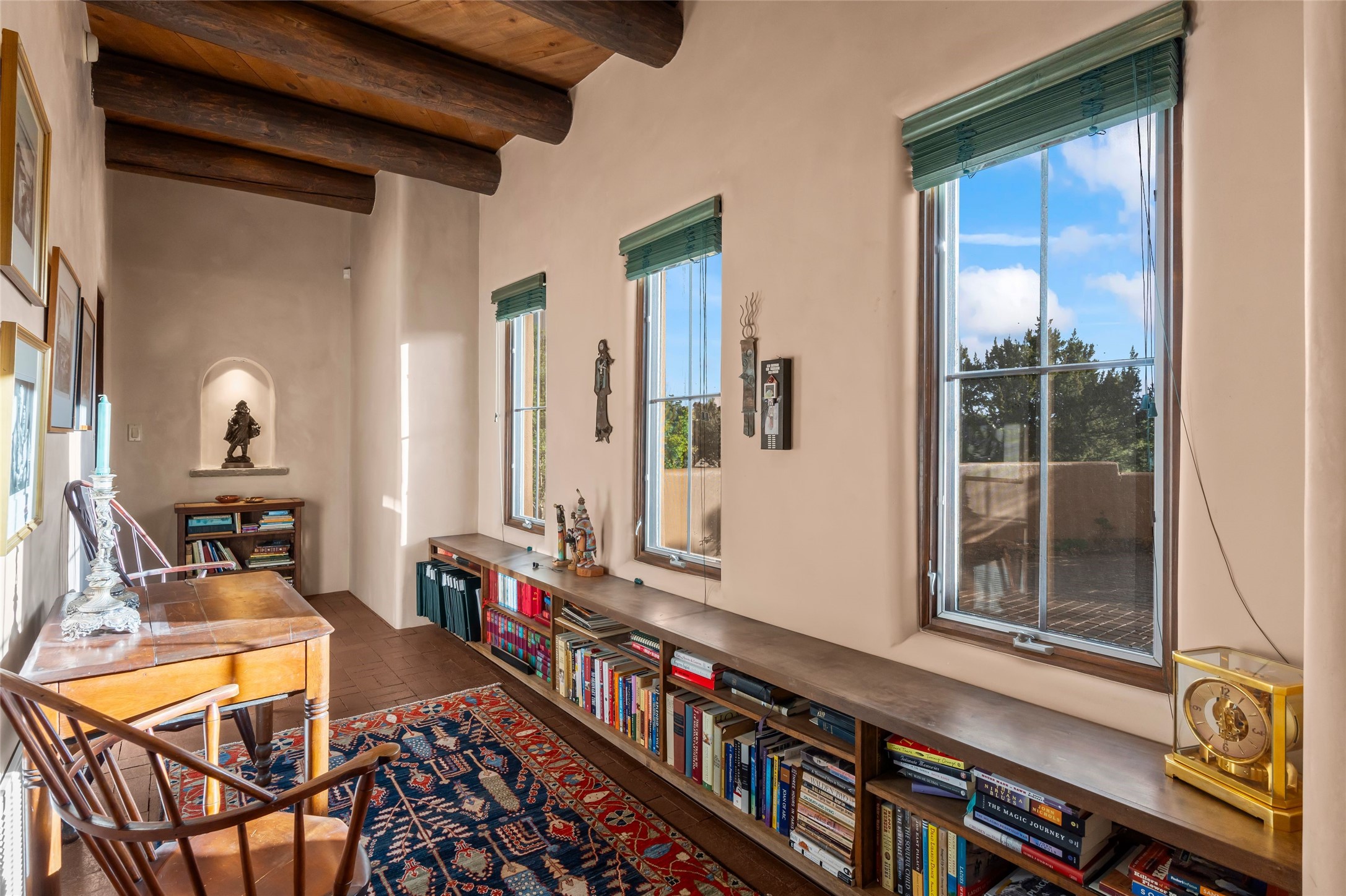 This Soft Contemporary 3-Bed + Den + Retreat / 3.5 -Bath home offers Sangre de Cristo Mountain Views in gated Las Campanas. The Great Room is truly Great, with 2 areas for socializing - One with a Kiva Fireplace, built-in TV / entertainment niche & doors to the Front Portal area. The other is a conversation area with a free-flowing kiva fireplace, wet bar, room for a Baby Grand Piano, Sangre de Cristo views plus access to the Back Portal area with wood-burning kiva fireplace. The Dining area is perfect for sharing meals & has access to the Back Portal area with Built-in BBQ & in-ground spa. The Kitchen has a Sub-Zero refrigerator, Bosch Dishwasher, Dacor Oven & Microwave plus a generous island with Dacor gas cooktop & prep sink. There is also a walk-in wine storage area plus Buffet & Butler's Pantry, both with ample storage. The Owner's Suite includes a kiva fireplace, walk-in closet & its own private portal with a Sangre de Cristo Mountain view. The Owner's Bath offers 2 separate vanities, 2 separate water closets, walk-in shower with body sprays & direct access to the In-ground Spa & outdoor shower. Also in the Owner's Suite wing, there is a private Den / Office with walk-in closet & outdoor access through double French doors as well as a south-facing Library / Retreat area. Two secondary bedrooms, each with their own bathrooms, are on the opposite side of the home, creating privacy from the Owner's Suite. The spacious outdoor area offers a multitude of desirable features - Private In-Ground Spa, Outdoor Shower, Built-in BBQ, Extensive shaded portal areas with wood-burning fireplace & a spacious roof deck with 360-degree Mountain Views. The 3-car garage includes a third, separate stall that can be used as a studio. This fabulous home checks all the boxes - 3 Bedrooms + Den + Retreat * 3 Baths * 3-Car Garage * In-ground Spa * Outdoor Shower * Spacious Roof Deck * Sangre de Cristo Mountain views - Make it yours Today!