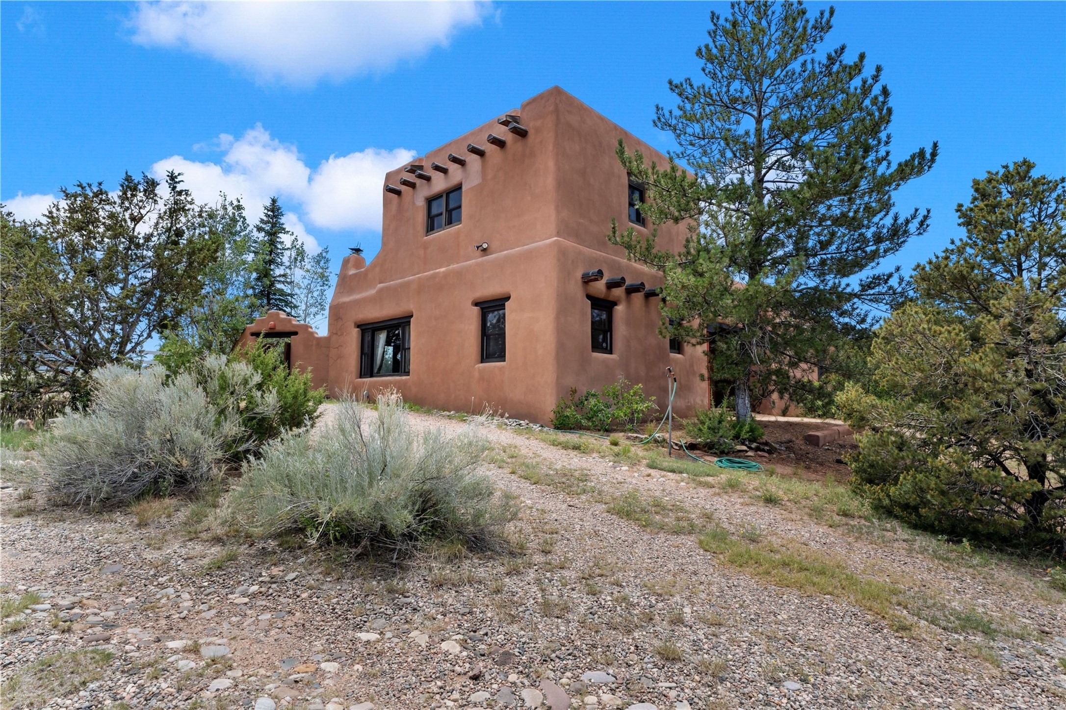 Sited on two and a half acres in a bucolic rural setting with pretty Sangre de Cristo mountain views, this charming Pueblo style adobe home offers traditional architectural details such as beautiful wood ceilings of vigas and latillas, also coved ceilings with vigas, plaster walls, solid wood doors, wooden lintels, brick and Saltillo tile floors, Talavera tile, and a kiva fireplace. The property features beautiful large pine trees, an enclosed yard with perennial plantings and lovely flower gardens, and a synthetic wood deck. The studio space is fitted with blackout window coverings, so it can be used as a dark room as well. The original infrastructure has been upgraded: the electrical system, new mechanical room with boiler and water heater, roof and stucco, and the well was recently maintained with new pressure tanks installed. There's also a small horse barn on the lot. Quintessential Santa Fe!