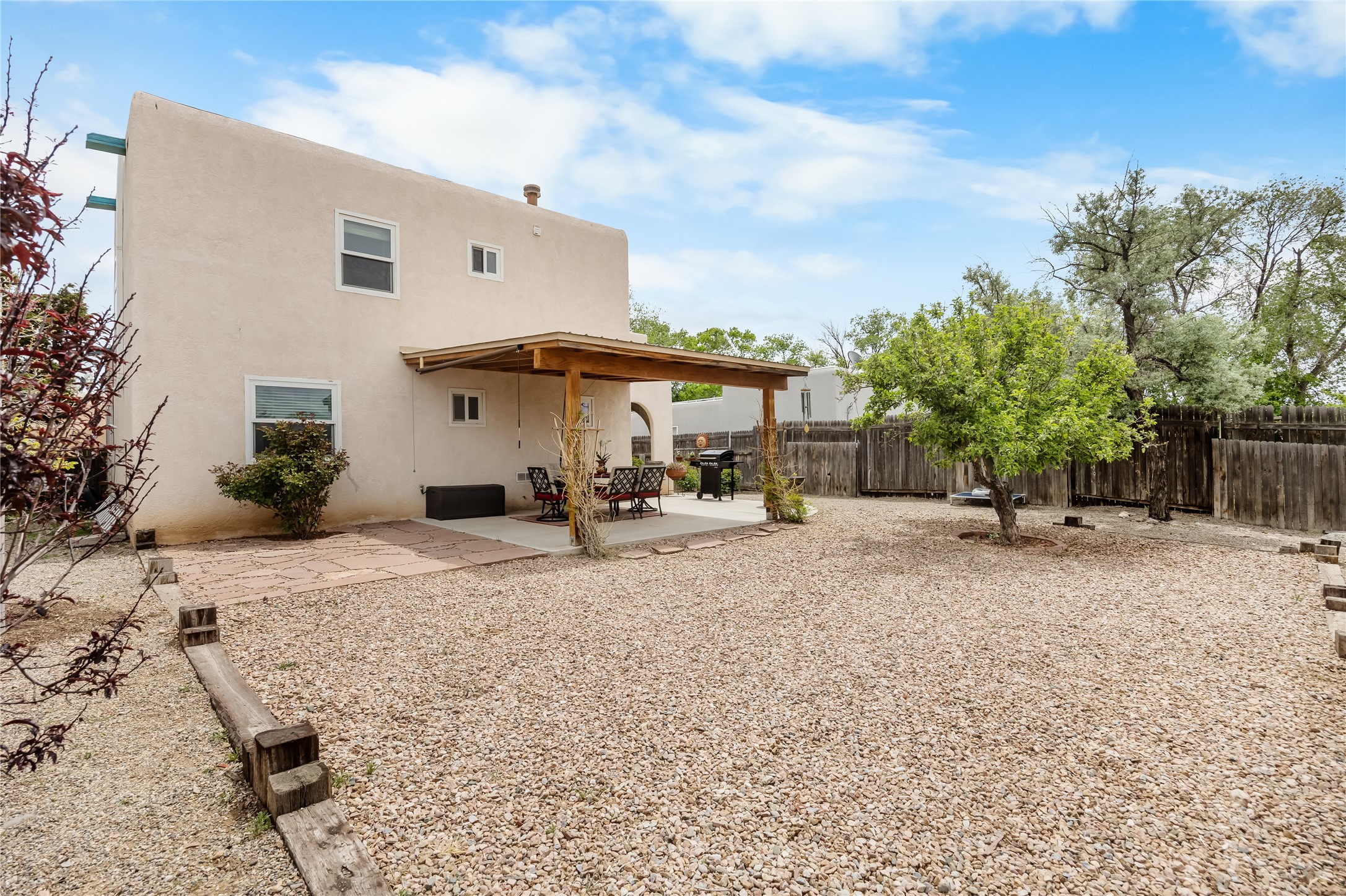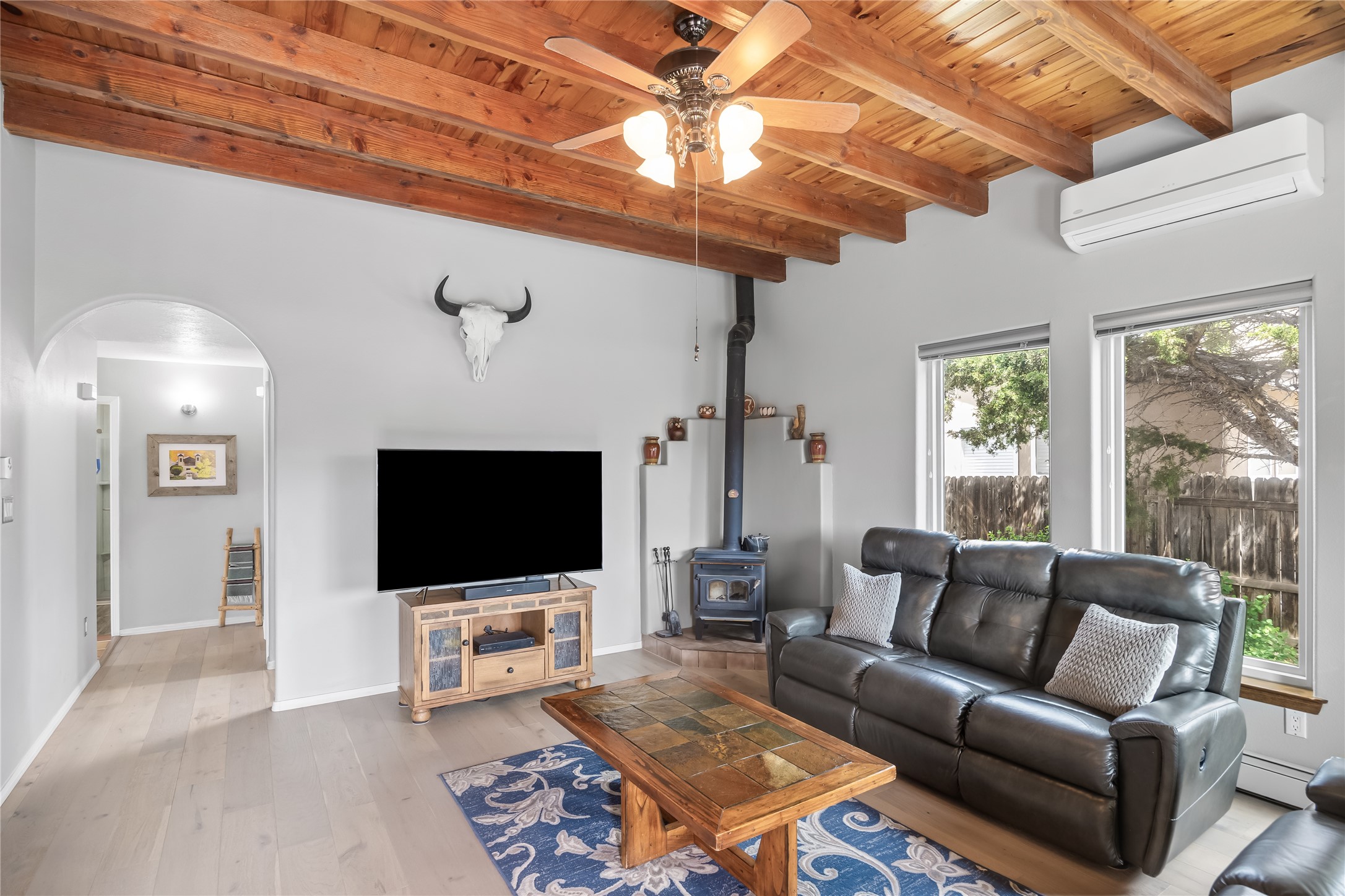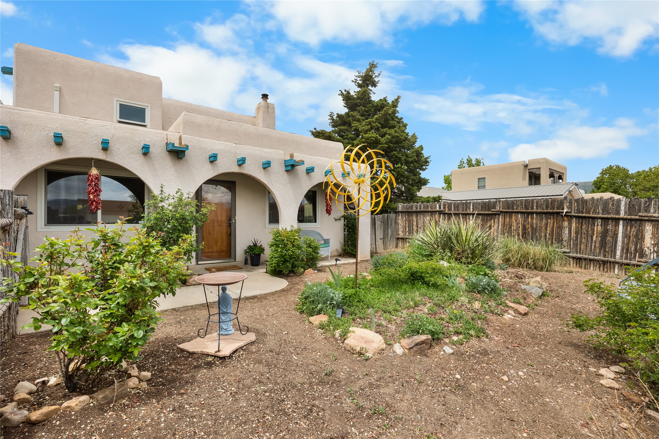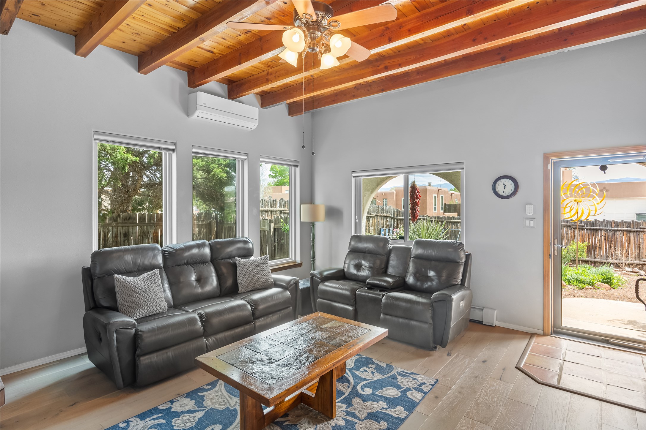Home Sweet Home! Enter the thoughtfully landscaped, fenced, large front courtyard through a coyote fenced gate. The home's first level is graced with owner installed wooden flooring, high beamed ceilings, Anderson windows, custom blinds and has a wonderful flow from its spacious Living Room to its Dining Room, Kitchen, laundry room, hall bathroom (with Dream Style shower) and guest bedroom. A brand-new stainless dishwasher plus newer range & fridge enhance a highly functional, comfortably sized kitchen. Enjoy a welcoming, extensive rear yard which includes an owner added roomy portal, great for entertaining, plus a variety of mature fruit trees & lots of space for pets to roam. The second level features the primary bedroom with a deck and Dream Style shower, as well as a second guest bedroom. Rest cool and easy with the addition of 4 mini-splits and a well-maintained roof over your head, in this well maintained property in an established, friendly neighborhood.