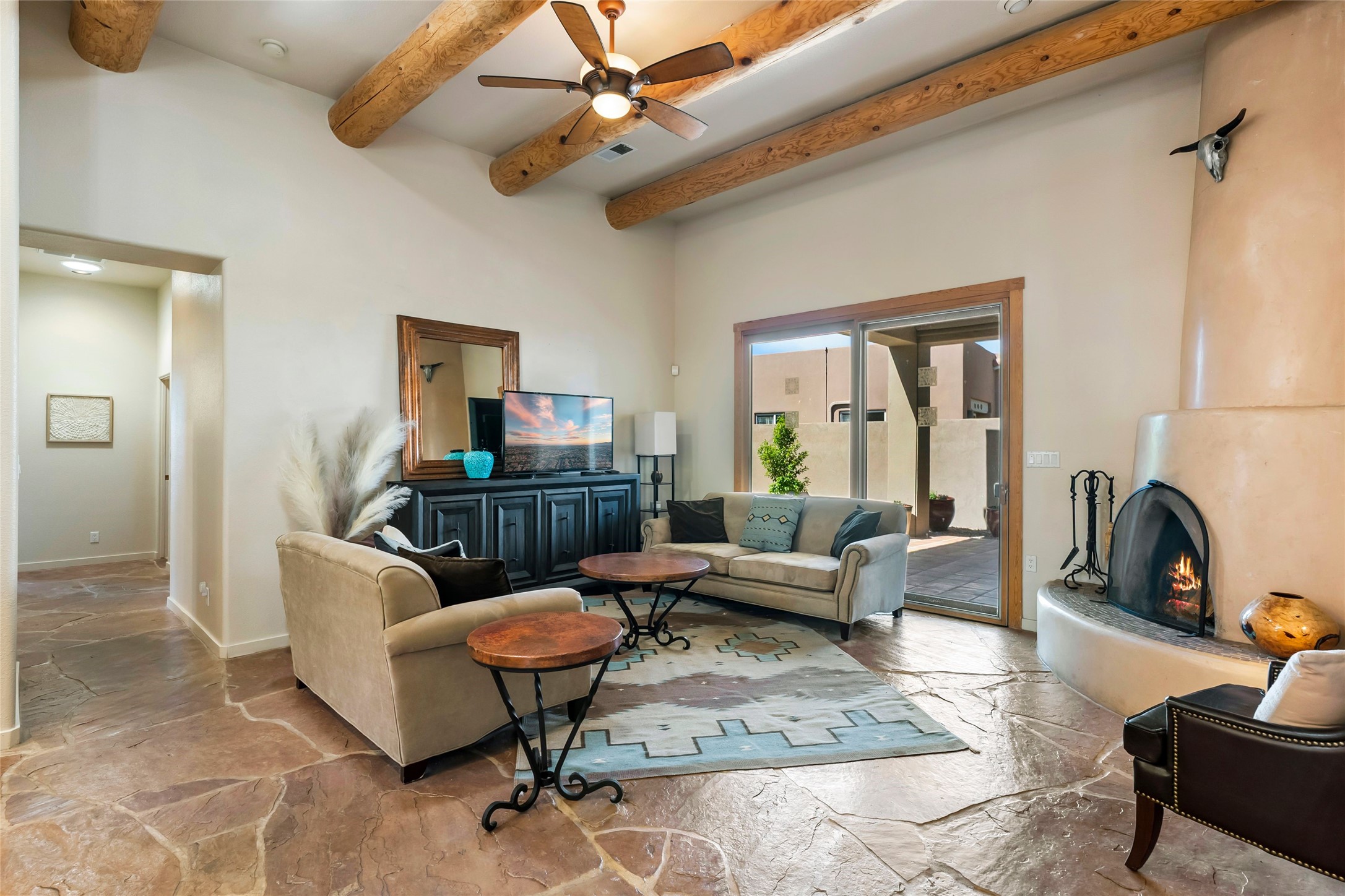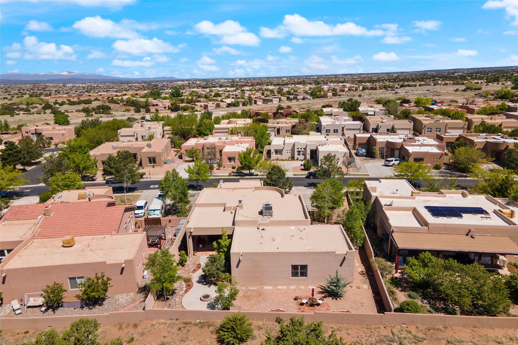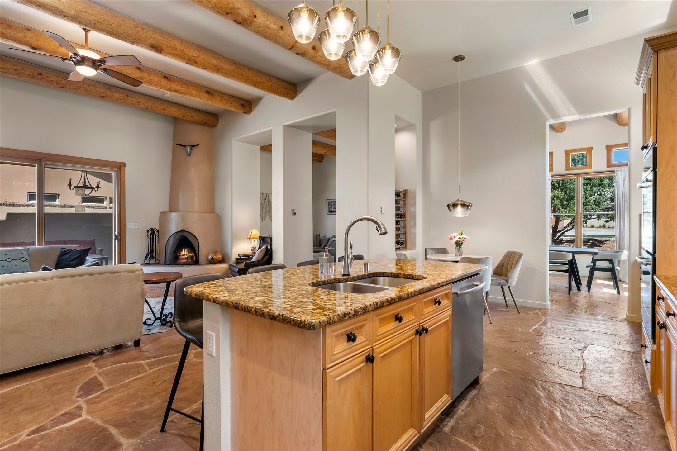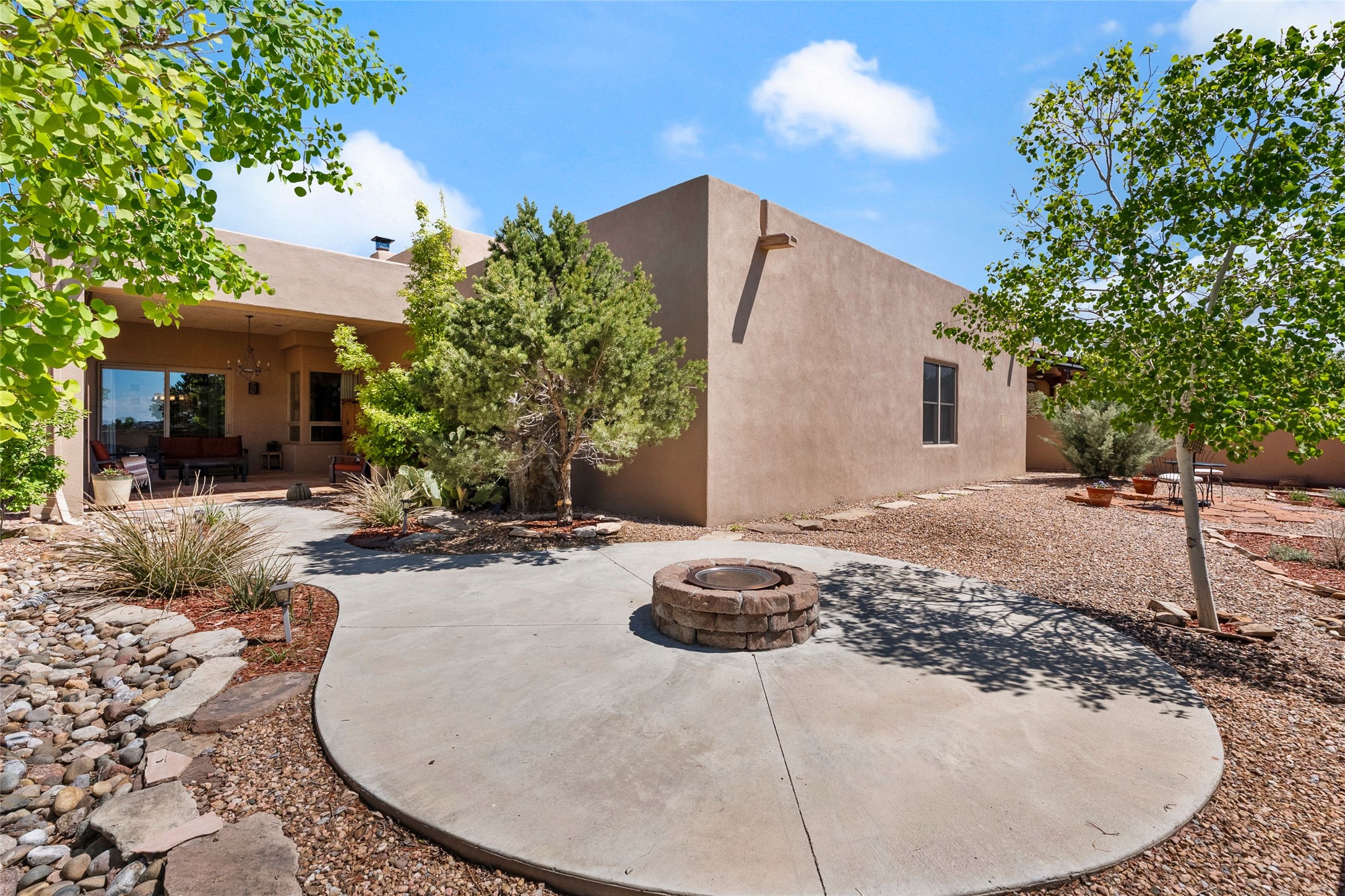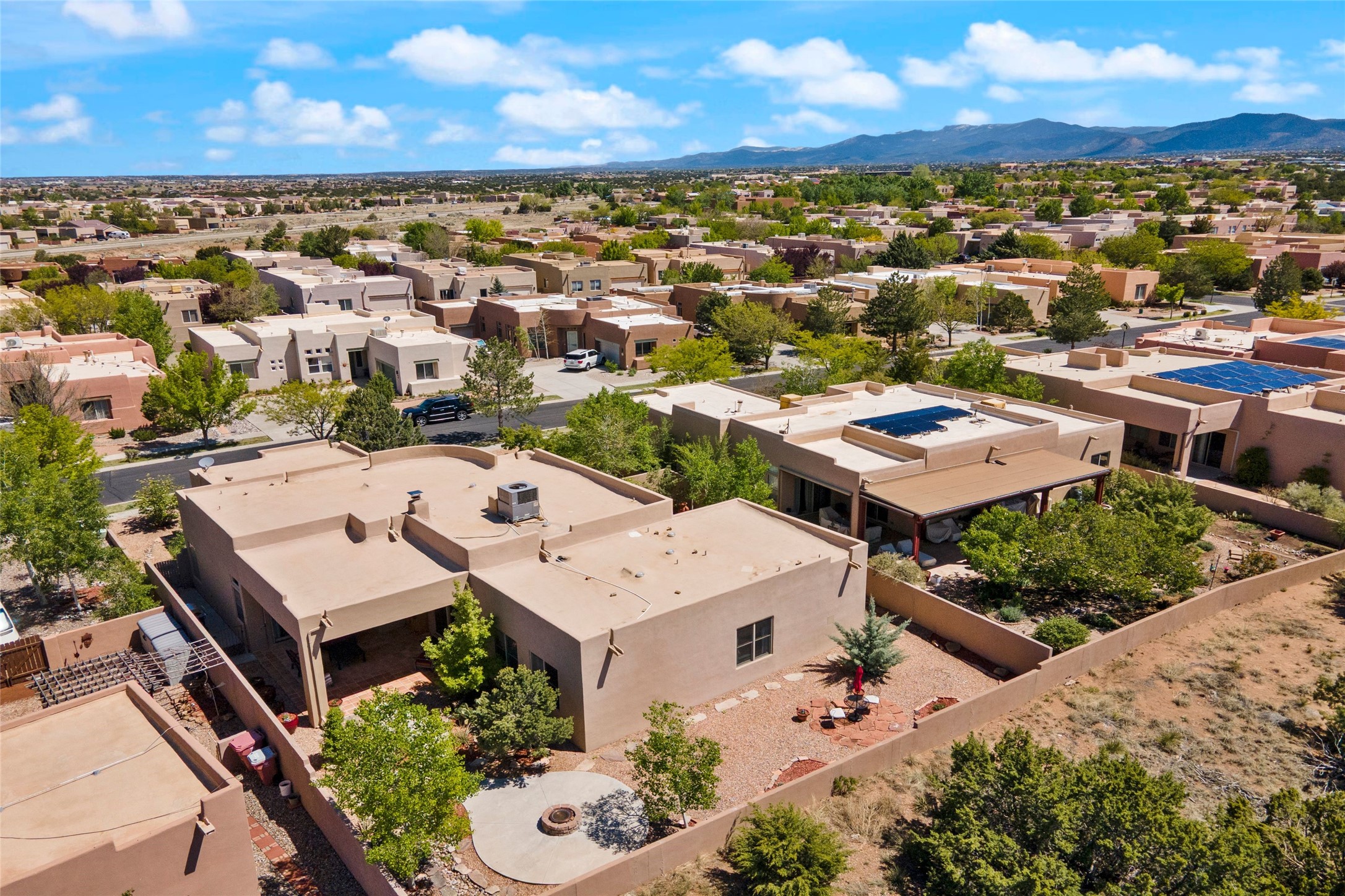 Rarely available 5 bedroom, 3 bathroom home in Rancho Viejo with multiple gathering spaces inside and out is calling you home! This was the model home and you will know why when you step through the front door. Elegance, warmth, and charm abound in this single level (no steps!) abode with high ceilings with vigas, gorgeous flagstone flooring, kiva woodburning fireplace, two living areas, and two dining areas. The grand entry foyer welcomes you into this beautiful and well-maintained home with great separation between the gracious primary bedroom suite and the four guest bedrooms. One of the guest bedrooms is its own suite with patio and separate entrance, perfect for guests wanting to come and go as they please. The additional guest bedrooms provide space for offices, exercise rooms, or whatever best suits your lifestyle. Unleash your inner chef in the stunning and functional kitchen that includes an island with bar seating, upgraded cabinets, and granite countertops. The grand rear portal is a sanctuary for outdoor living and entertaining, with Saltillo tile flooring and views to the lovely rear yard with firepit, which is fully enclosed and offers wonderful southern views of the Ortiz Mountains and the Galisteo Wave. Bask in the quiet privacy of your outdoor retreat, perfect for bird and butterfly watching and taking in Santa Fe's incredible sunrises and sunsets. In-floor radiant heat and central air conditioning will keep you comfortable year-round. Additional features include wonderful natural light via clerestory windows and sun tunnels, attached 2 car garage with direct entry, separate laundry room, and close access to the Rancho Viejo trail system. $53K in seller upgrades include a new roof silicone coating in May 2025 with a 25-year transferable warranty. Don't miss this stunning and inviting home in a coveted location!