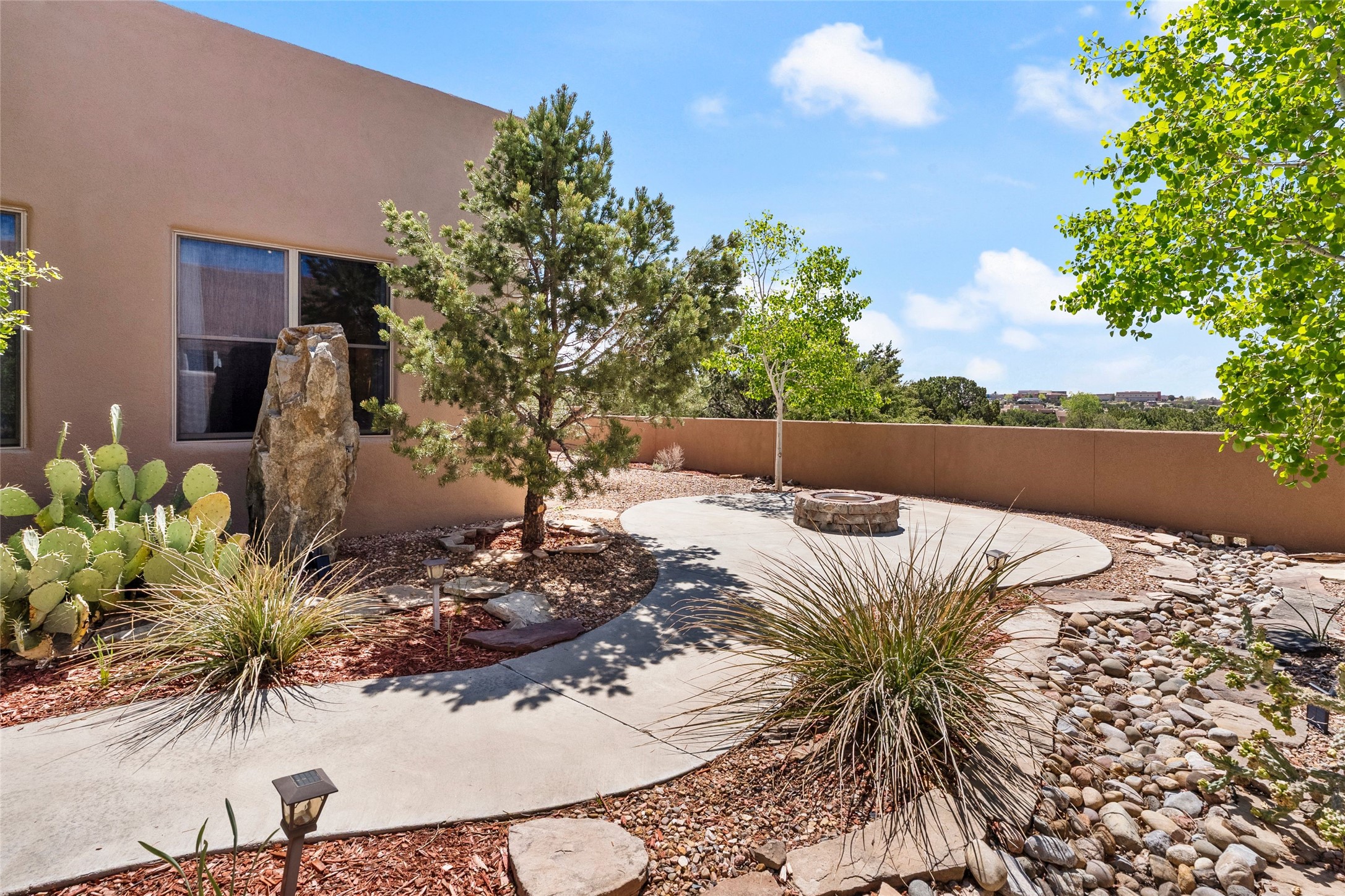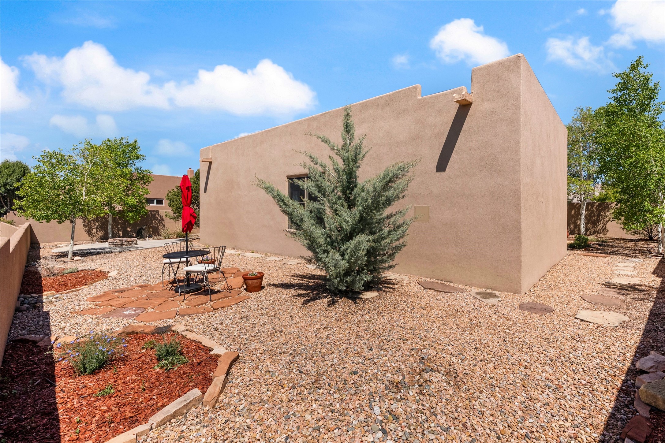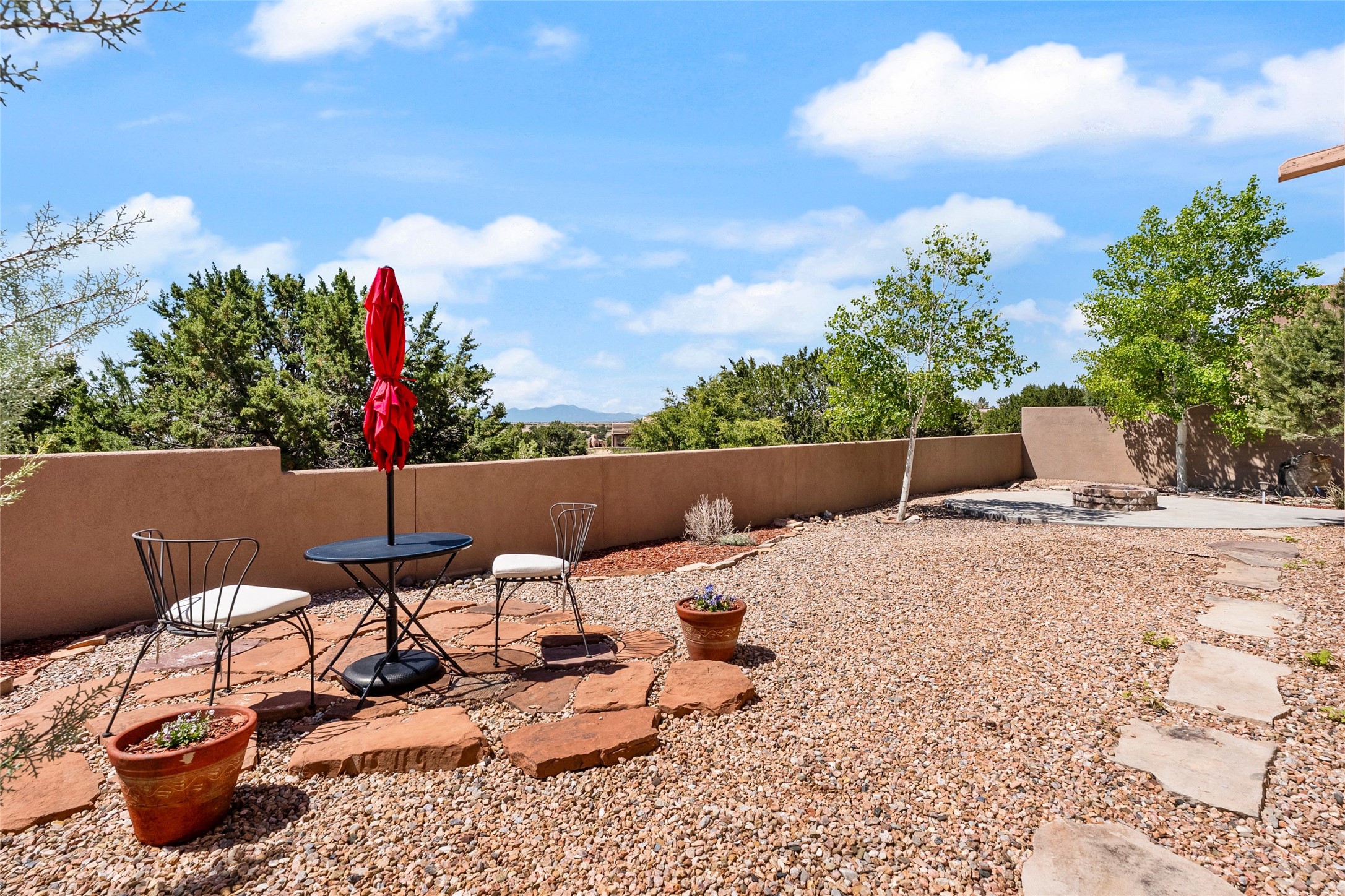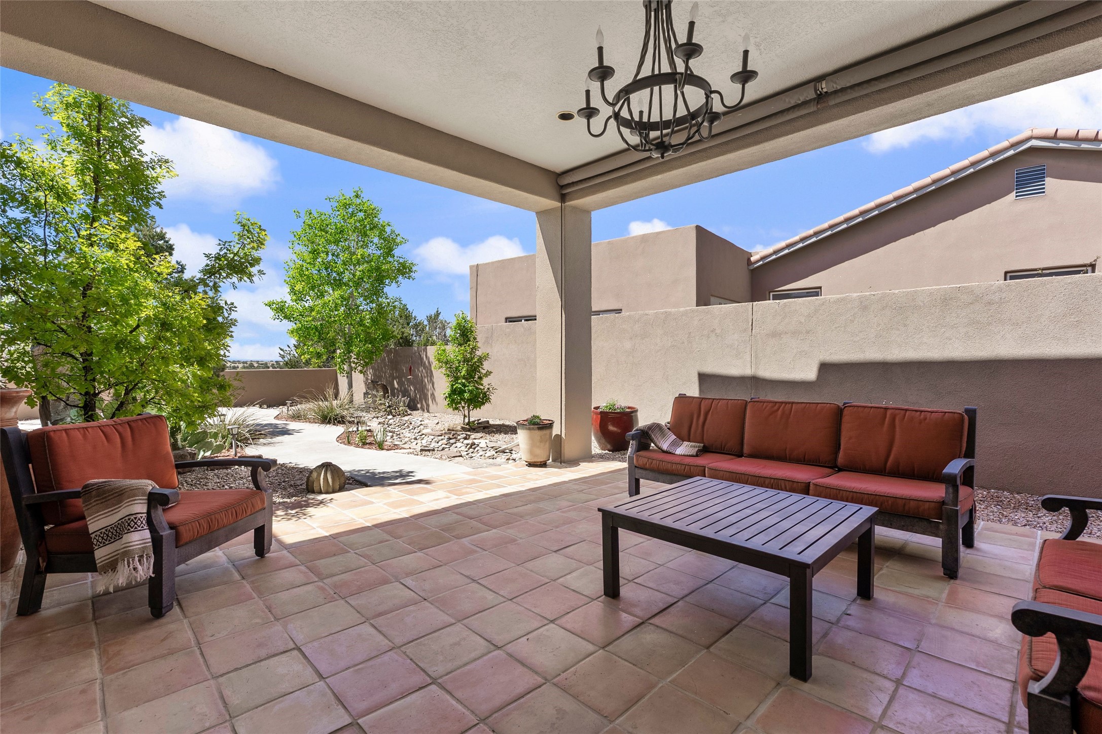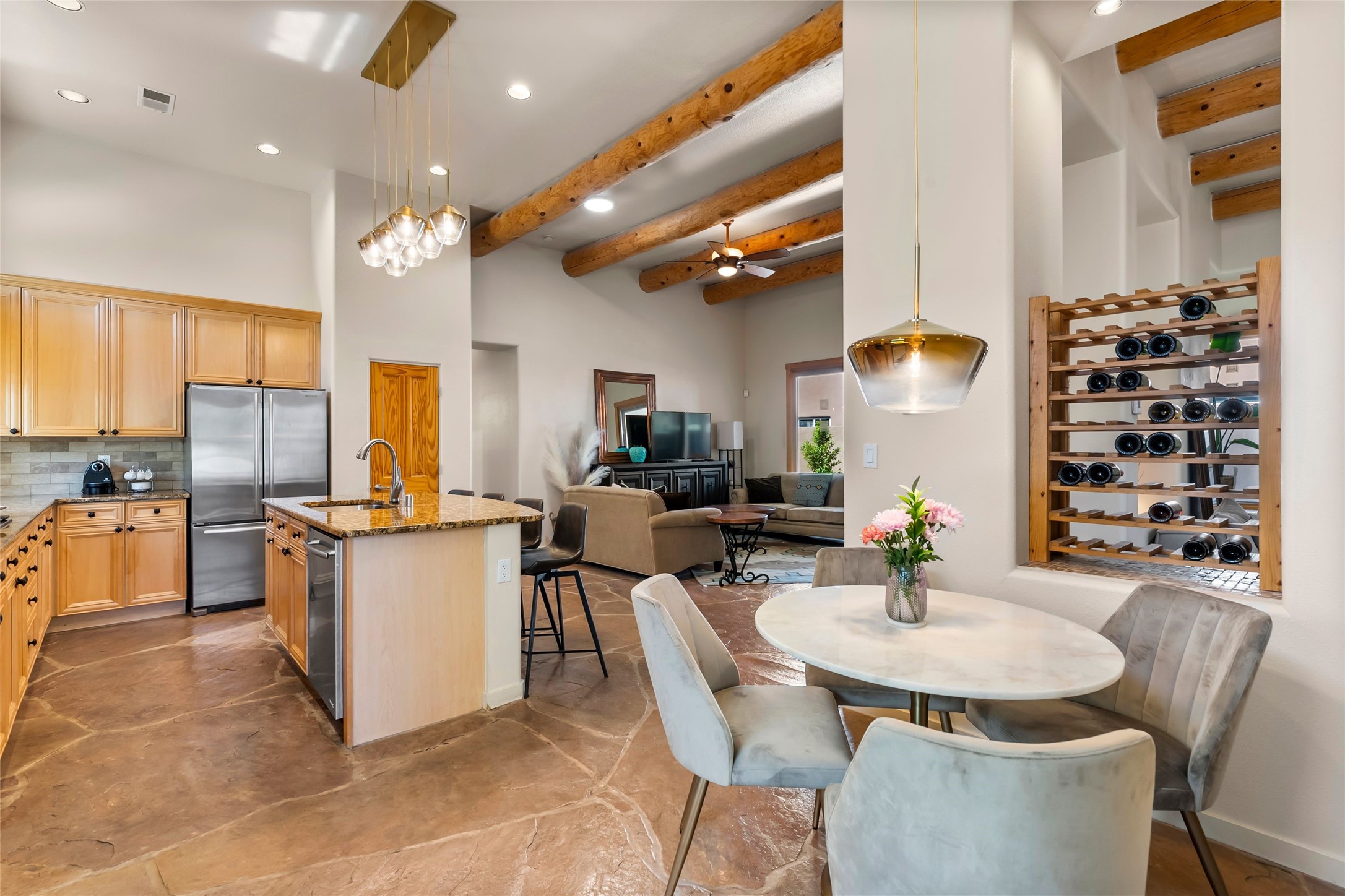Rarely available 5 bedroom, 3 bathroom home in Rancho Viejo with multiple gathering spaces inside and out is calling you home! This was the model home and you will know why when you step through the front door. Elegance, warmth, and charm abound in this single level (no steps!) abode with high ceilings with vigas, gorgeous flagstone flooring, kiva woodburning fireplace, two living areas, and two dining areas. The grand entry foyer welcomes you into this beautiful and well-maintained home with great separation between the gracious primary bedroom suite and the four guest bedrooms. One of the guest bedrooms is its own suite with patio and separate entrance, perfect for guests wanting to come and go as they please. The additional guest bedrooms provide space for offices, exercise rooms, or whatever best suits your lifestyle. Unleash your inner chef in the stunning and functional kitchen that includes an island with bar seating, upgraded cabinets, and granite countertops. The grand rear portal is a sanctuary for outdoor living and entertaining, with Saltillo tile flooring and views to the lovely rear yard with firepit, which is fully enclosed and offers wonderful southern views of the Ortiz Mountains and the Galisteo Wave. Bask in the quiet privacy of your outdoor retreat, perfect for bird and butterfly watching and taking in Santa Fe's incredible sunrises and sunsets. In-floor radiant heat and central air conditioning will keep you comfortable year-round. Additional features include wonderful natural light via clerestory windows and sun tunnels, attached 2 car garage with direct entry, separate laundry room, and close access to the Rancho Viejo trail system. $53K in seller upgrades include a new roof silicone coating in May 2025 with a 25-year transferable warranty. Don't miss this stunning and inviting home in a coveted location!