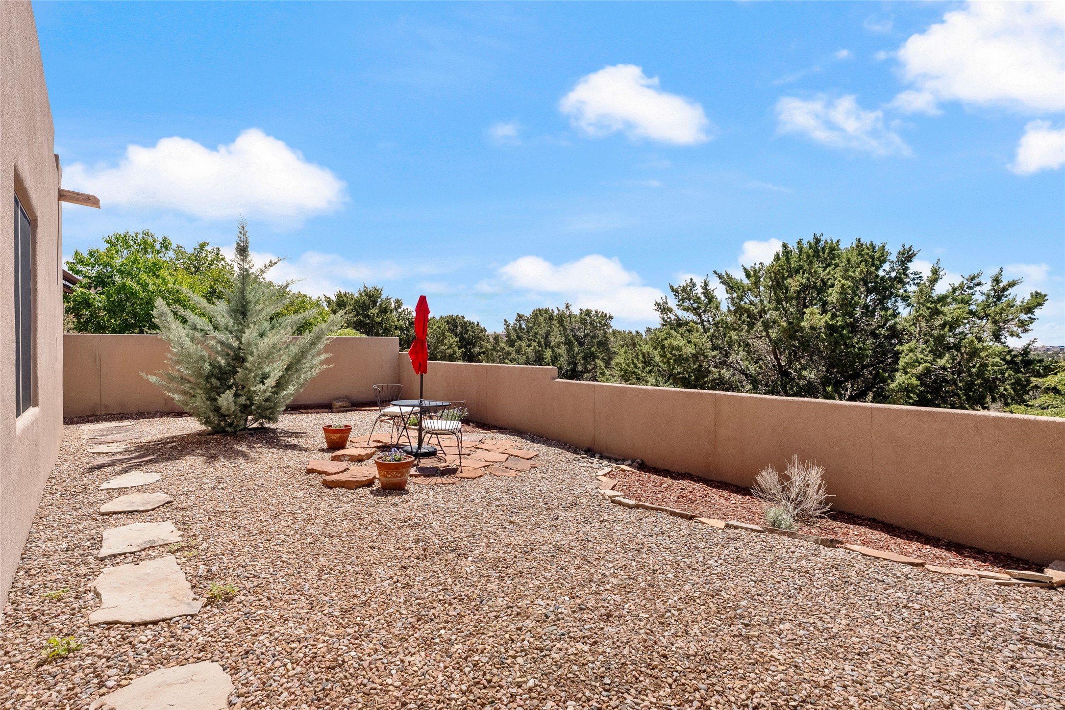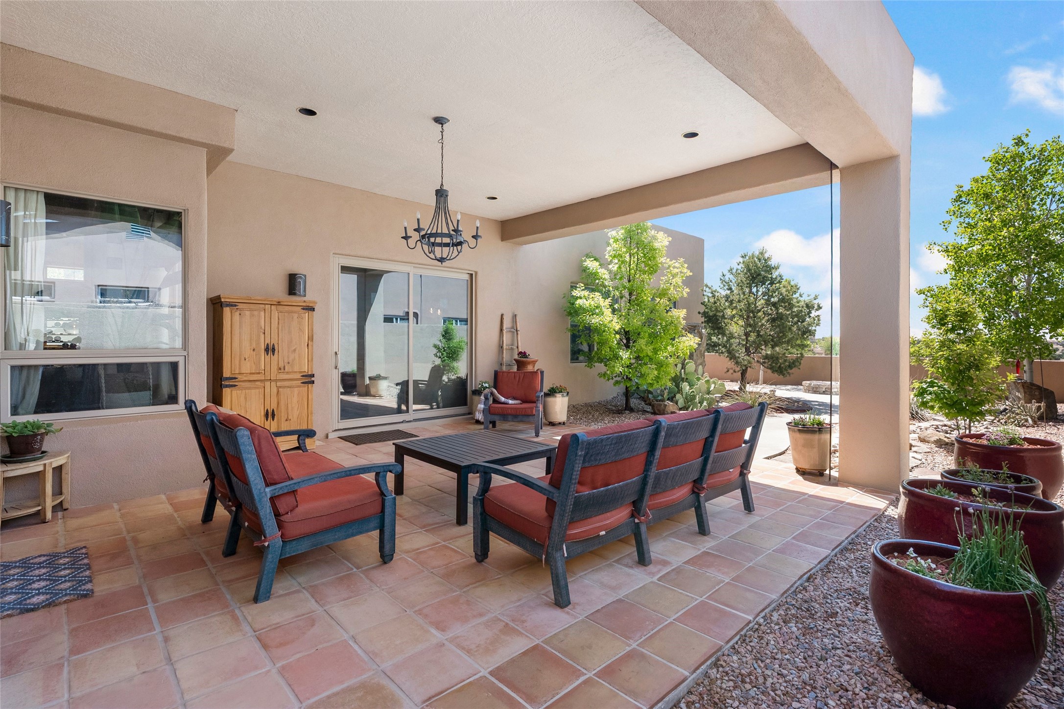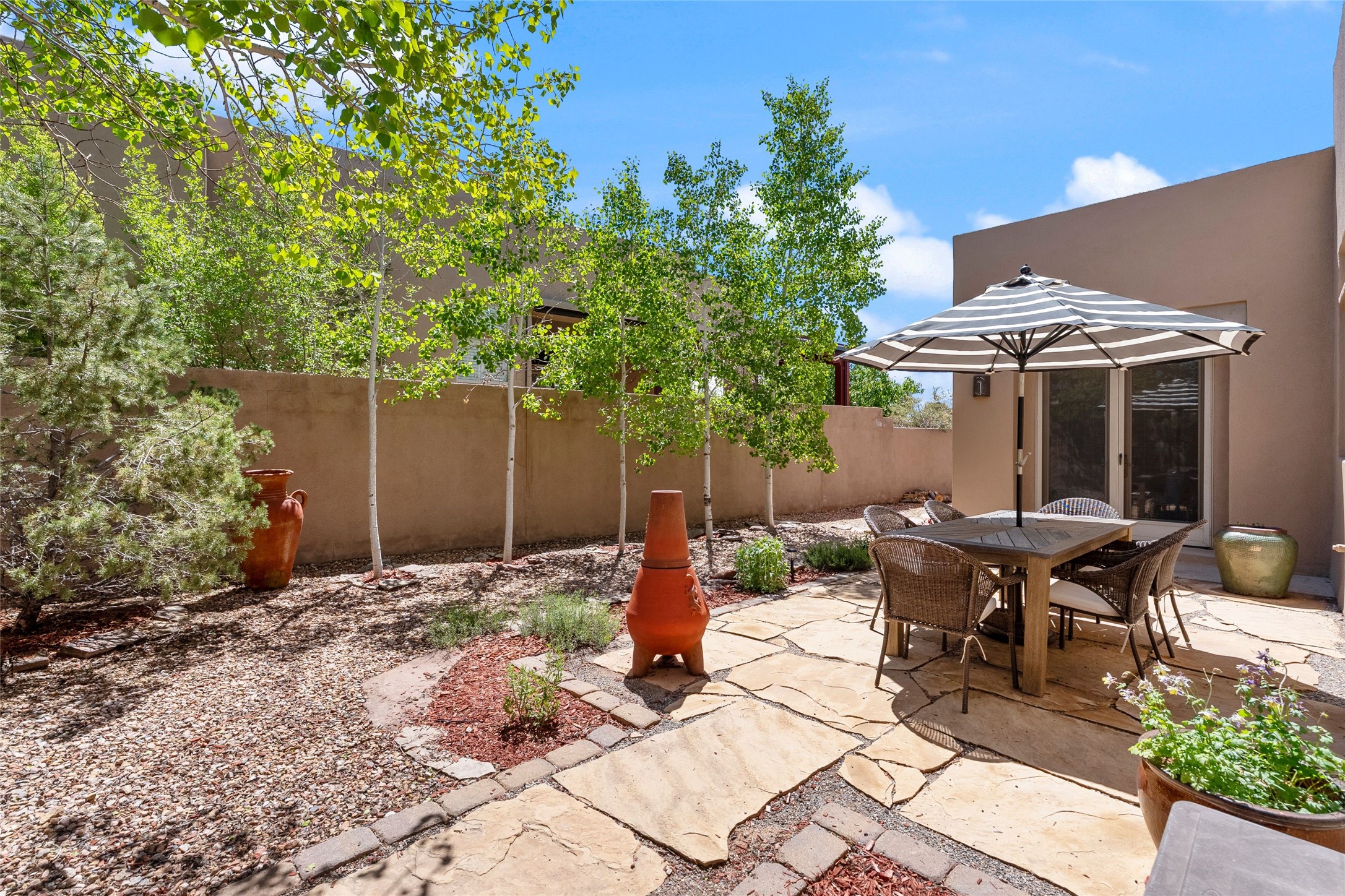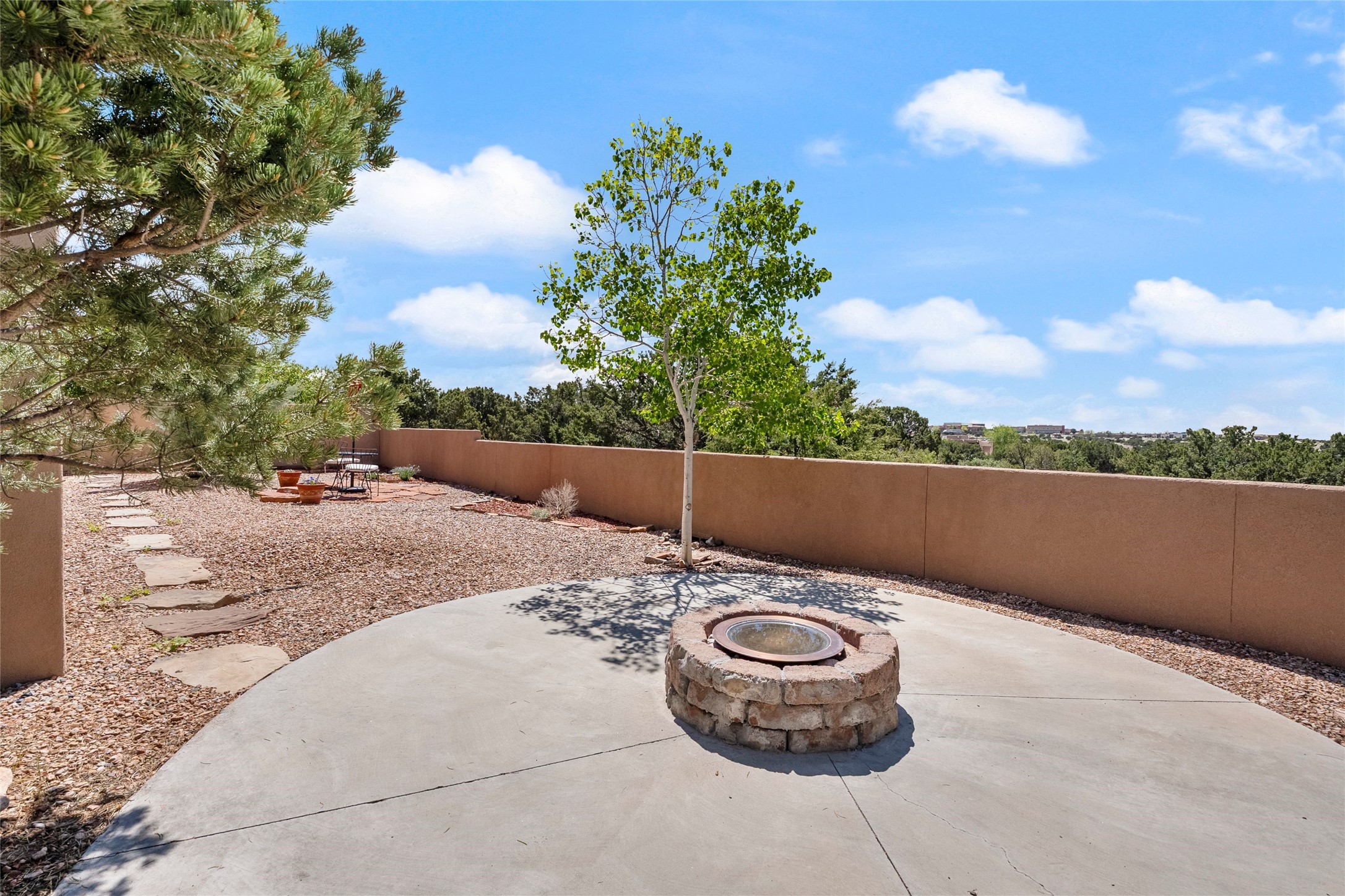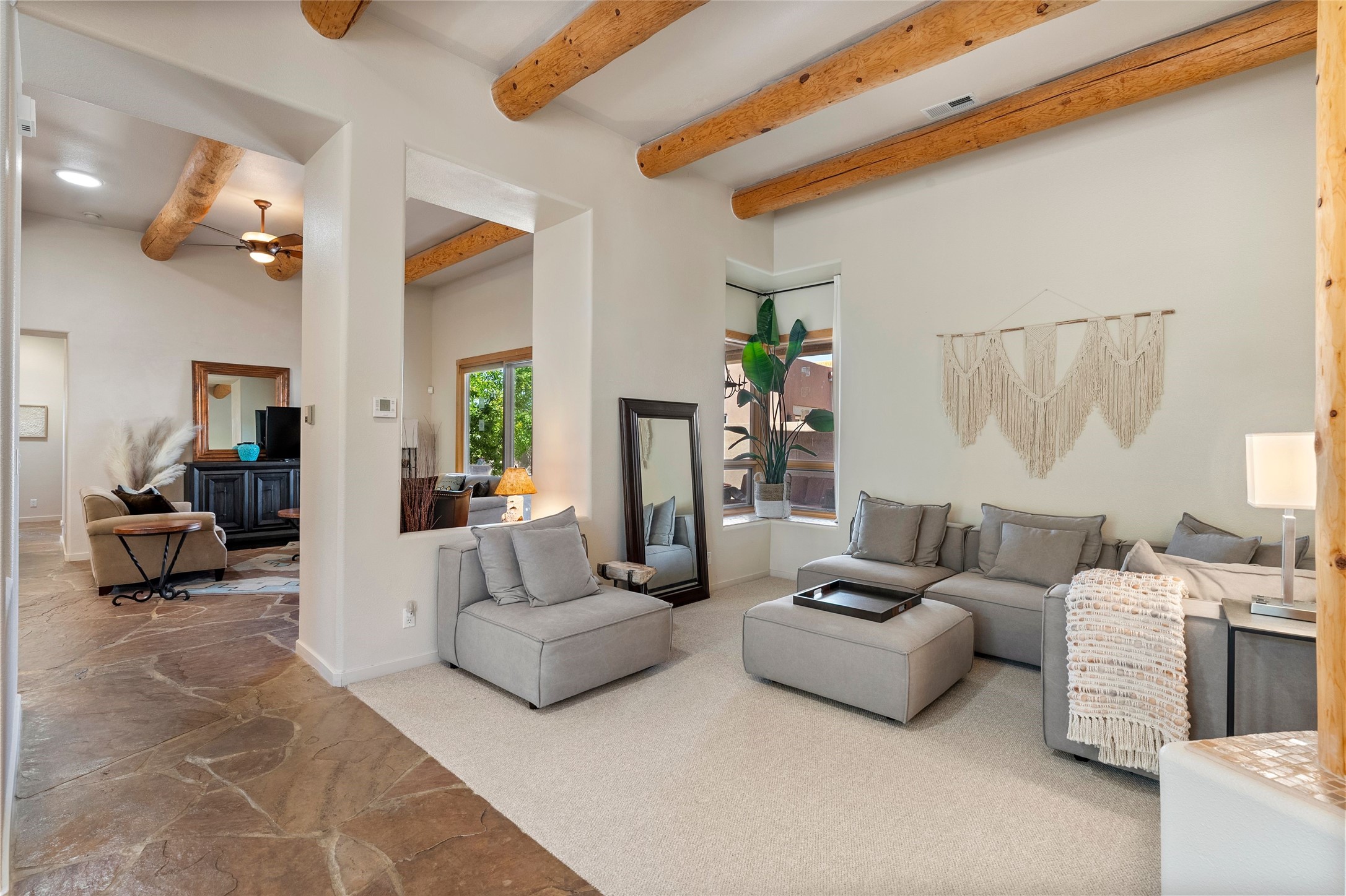 Rarely available 5 bedroom, 3 bathroom home in Rancho Viejo with multiple gathering spaces inside and out is calling you home! This was the model home and you will know why when you step through the front door. Elegance, warmth, and charm abound in this single level (no steps!) abode with high ceilings with vigas, gorgeous flagstone flooring, kiva woodburning fireplace, two living areas, and two dining areas. The grand entry foyer welcomes you into this beautiful and well-maintained home with great separation between the gracious primary bedroom suite and the four guest bedrooms. One of the guest bedrooms is its own suite with patio and separate entrance, perfect for guests wanting to come and go as they please. The additional guest bedrooms provide space for offices, exercise rooms, or whatever best suits your lifestyle. Unleash your inner chef in the stunning and functional kitchen that includes an island with bar seating, upgraded cabinets, and granite countertops. The grand rear portal is a sanctuary for outdoor living and entertaining, with Saltillo tile flooring and views to the lovely rear yard with firepit, which is fully enclosed and offers wonderful southern views of the Ortiz Mountains and the Galisteo Wave. Bask in the quiet privacy of your outdoor retreat, perfect for bird and butterfly watching and taking in Santa Fe's incredible sunrises and sunsets. In-floor radiant heat and central air conditioning will keep you comfortable year-round. Additional features include wonderful natural light via clerestory windows and sun tunnels, attached 2 car garage with direct entry, separate laundry room, and close access to the Rancho Viejo trail system. $53K in seller upgrades include a new roof silicone coating in May 2025 with a 25-year transferable warranty. Don't miss this stunning and inviting home in a coveted location!