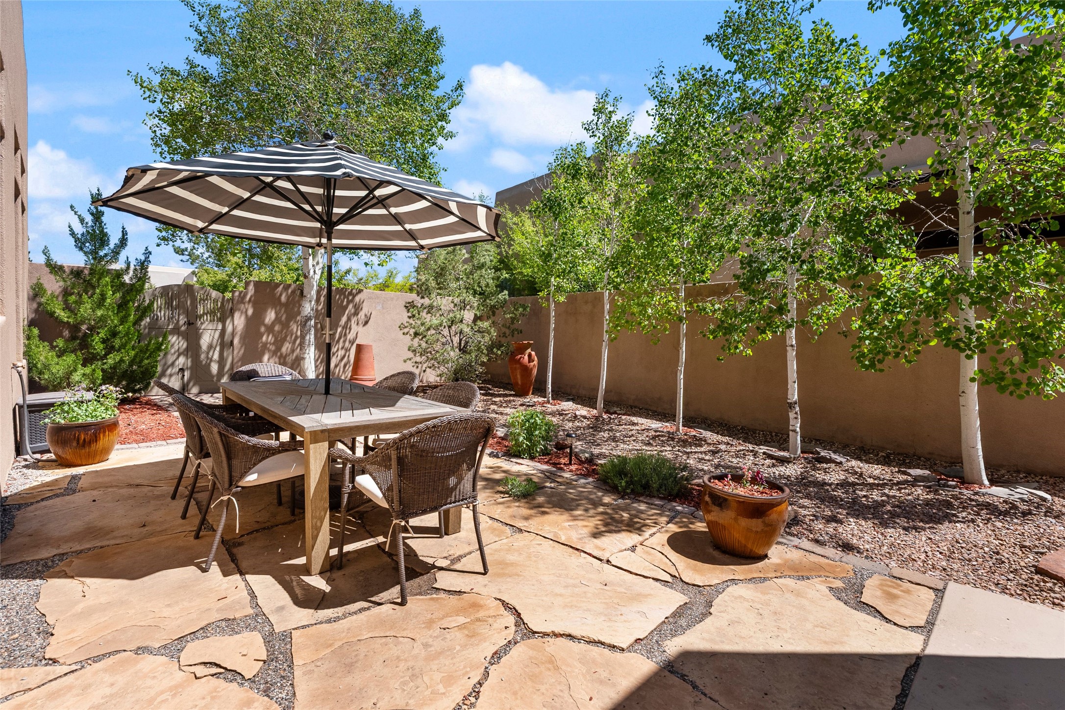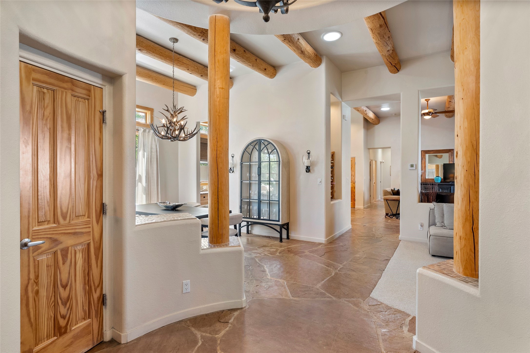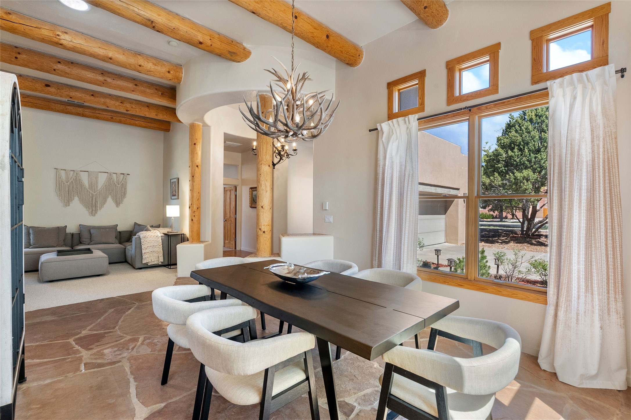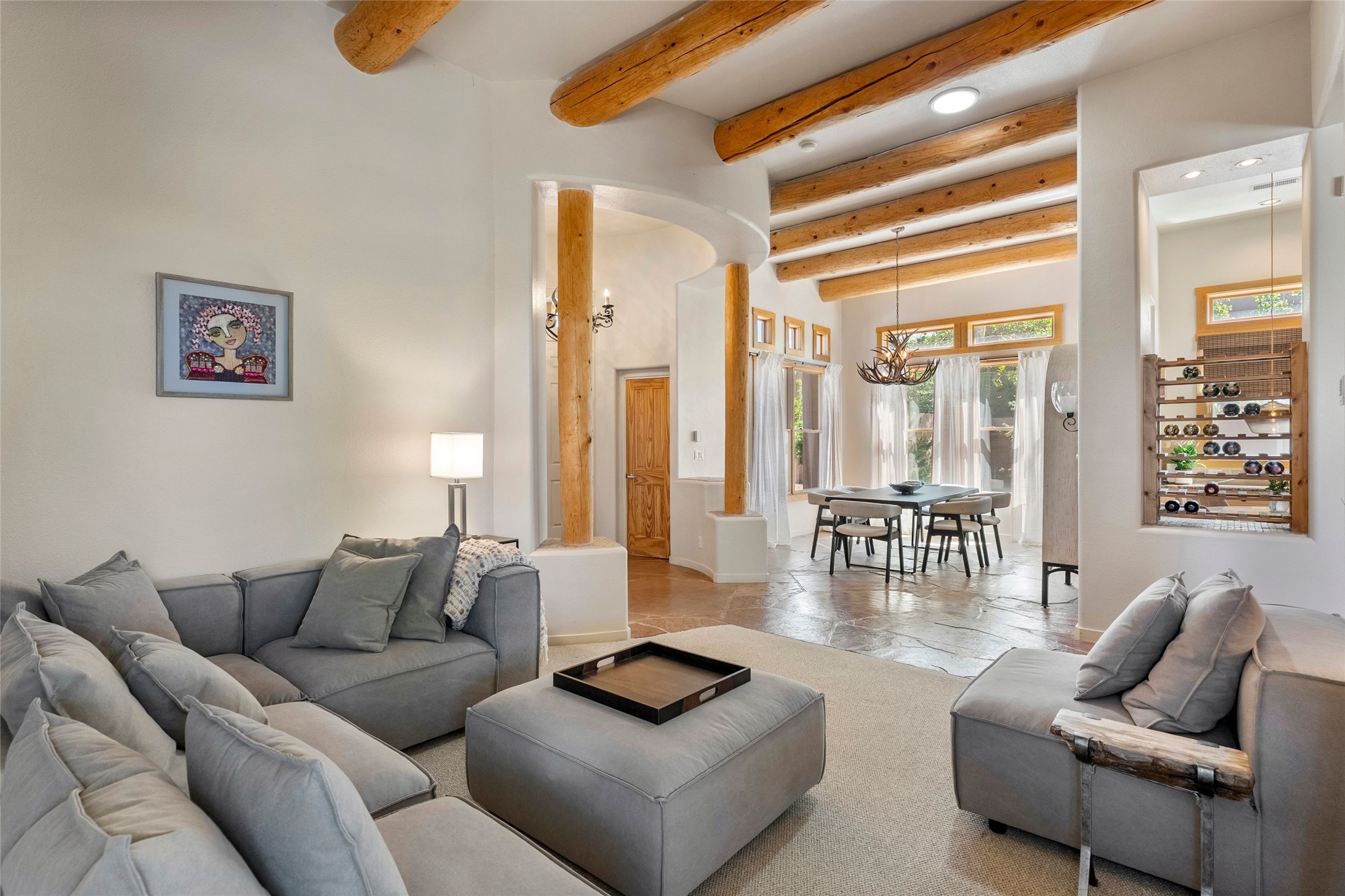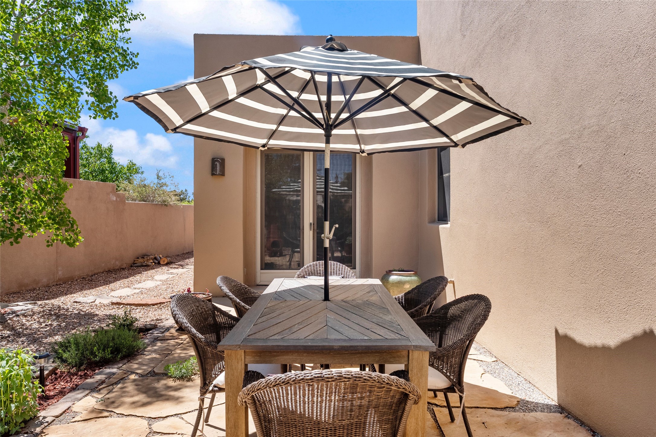 Rarely available 5 bedroom, 3 bathroom home in Rancho Viejo with multiple gathering spaces inside and out is calling you home! This was the model home and you will know why when you step through the front door. Elegance, warmth, and charm abound in this single level (no steps!) abode with high ceilings with vigas, gorgeous flagstone flooring, kiva woodburning fireplace, two living areas, and two dining areas. The grand entry foyer welcomes you into this beautiful and well-maintained home with great separation between the gracious primary bedroom suite and the four guest bedrooms. One of the guest bedrooms is its own suite with patio and separate entrance, perfect for guests wanting to come and go as they please. The additional guest bedrooms provide space for offices, exercise rooms, or whatever best suits your lifestyle. Unleash your inner chef in the stunning and functional kitchen that includes an island with bar seating, upgraded cabinets, and granite countertops. The grand rear portal is a sanctuary for outdoor living and entertaining, with Saltillo tile flooring and views to the lovely rear yard with firepit, which is fully enclosed and offers wonderful southern views of the Ortiz Mountains and the Galisteo Wave. Bask in the quiet privacy of your outdoor retreat, perfect for bird and butterfly watching and taking in Santa Fe's incredible sunrises and sunsets. In-floor radiant heat and central air conditioning will keep you comfortable year-round. Additional features include wonderful natural light via clerestory windows and sun tunnels, attached 2 car garage with direct entry, separate laundry room, and close access to the Rancho Viejo trail system. $53K in seller upgrades include a new roof silicone coating in May 2025 with a 25-year transferable warranty. Don't miss this stunning and inviting home in a coveted location!