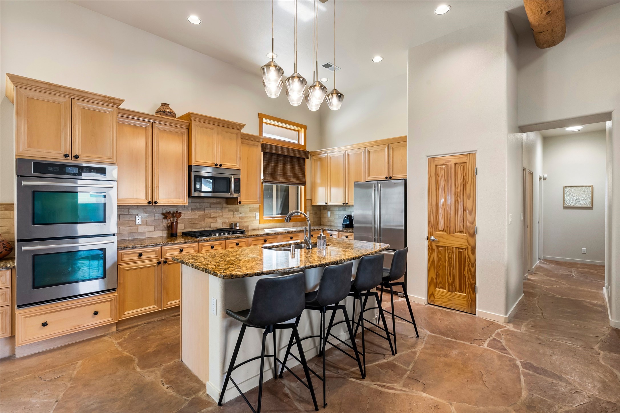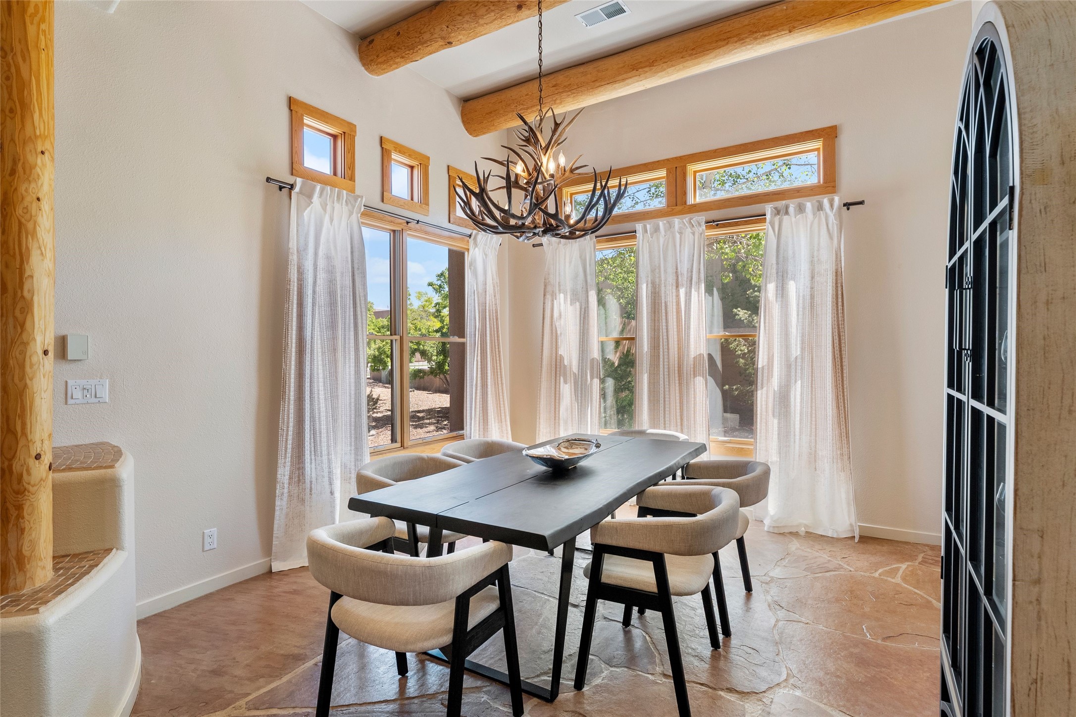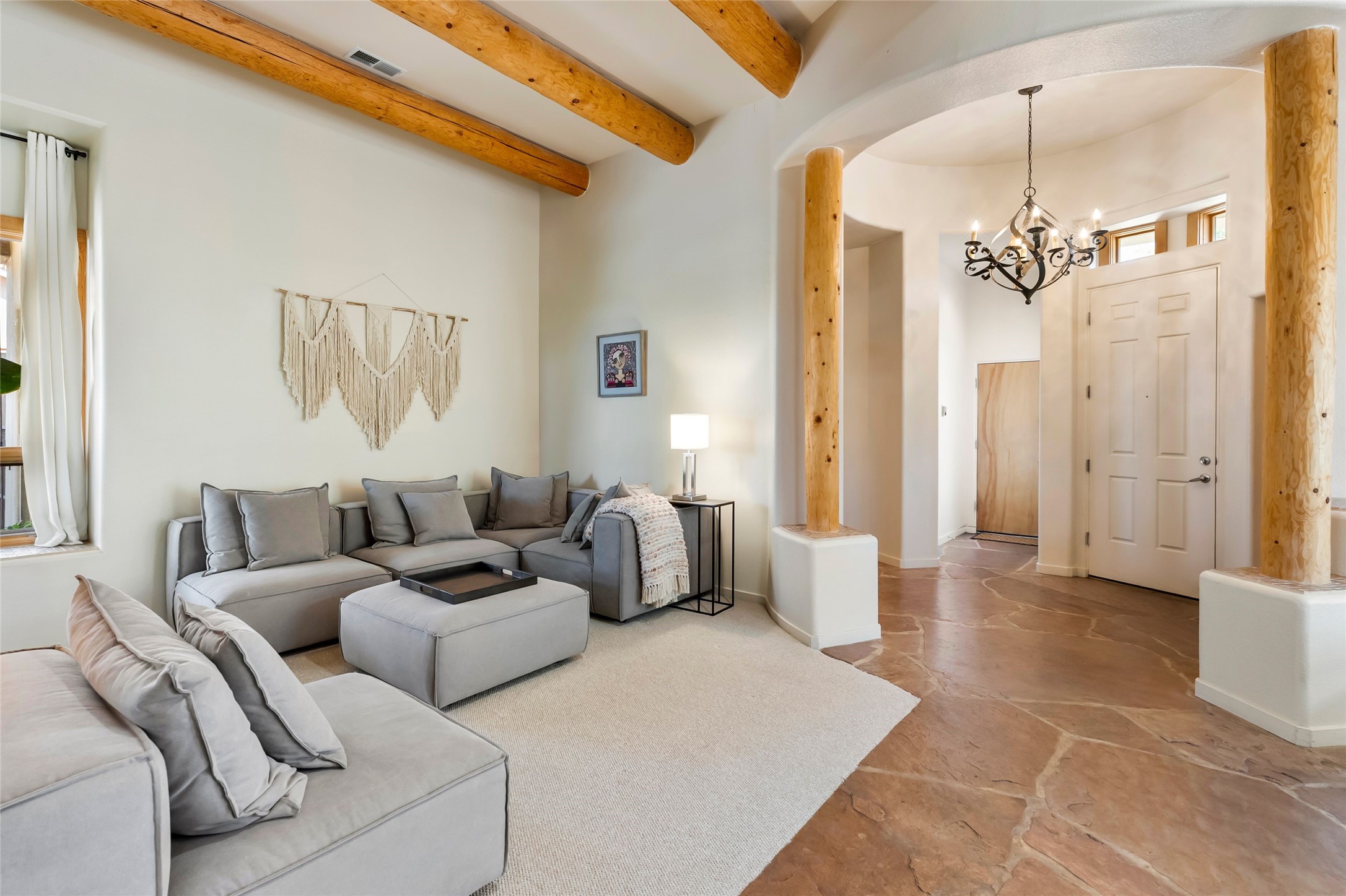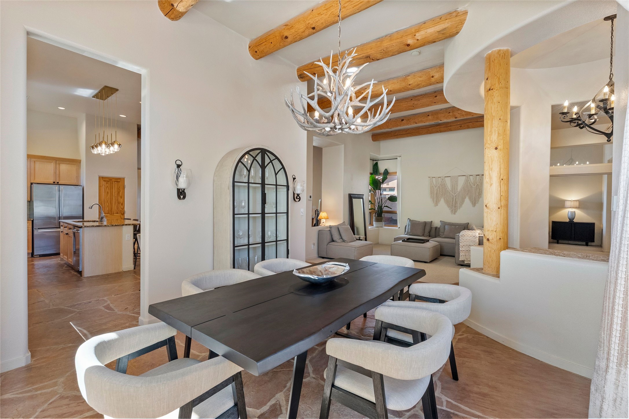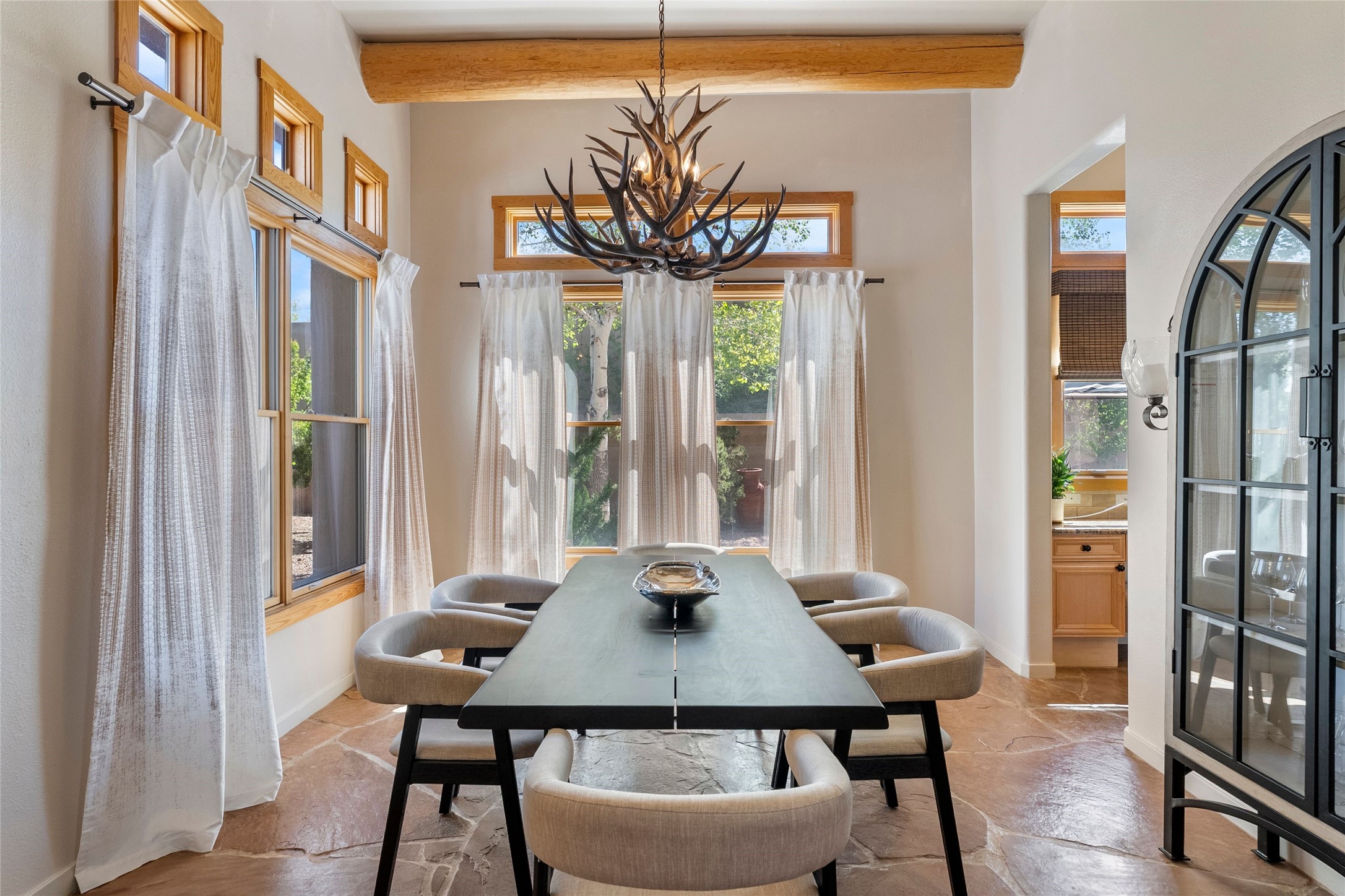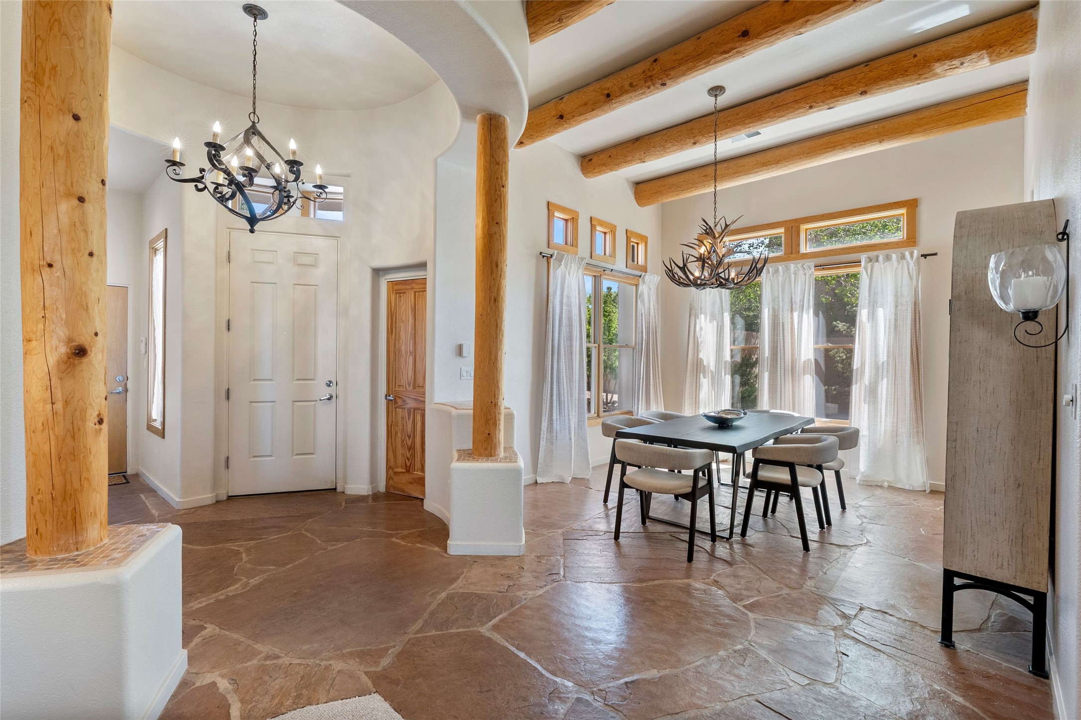 Rarely available 5 bedroom, 3 bathroom home in Rancho Viejo with multiple gathering spaces inside and out is calling you home! This was the model home and you will know why when you step through the front door. Elegance, warmth, and charm abound in this single level (no steps!) abode with high ceilings with vigas, gorgeous flagstone flooring, kiva woodburning fireplace, two living areas, and two dining areas. The grand entry foyer welcomes you into this beautiful and well-maintained home with great separation between the gracious primary bedroom suite and the four guest bedrooms. One of the guest bedrooms is its own suite with patio and separate entrance, perfect for guests wanting to come and go as they please. The additional guest bedrooms provide space for offices, exercise rooms, or whatever best suits your lifestyle. Unleash your inner chef in the stunning and functional kitchen that includes an island with bar seating, upgraded cabinets, and granite countertops. The grand rear portal is a sanctuary for outdoor living and entertaining, with Saltillo tile flooring and views to the lovely rear yard with firepit, which is fully enclosed and offers wonderful southern views of the Ortiz Mountains and the Galisteo Wave. Bask in the quiet privacy of your outdoor retreat, perfect for bird and butterfly watching and taking in Santa Fe's incredible sunrises and sunsets. In-floor radiant heat and central air conditioning will keep you comfortable year-round. Additional features include wonderful natural light via clerestory windows and sun tunnels, attached 2 car garage with direct entry, separate laundry room, and close access to the Rancho Viejo trail system. $53K in seller upgrades include a new roof silicone coating in May 2025 with a 25-year transferable warranty. Don't miss this stunning and inviting home in a coveted location!