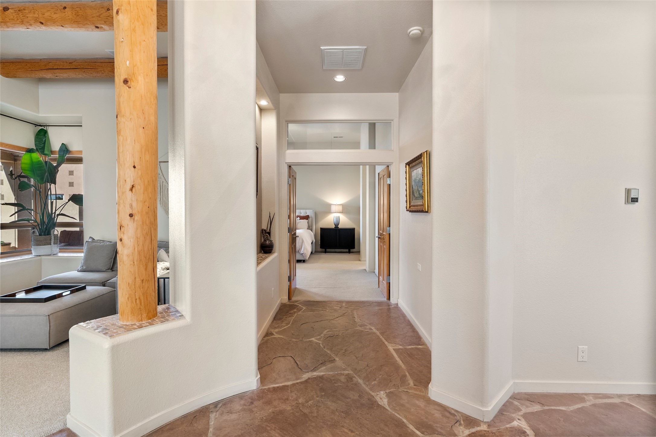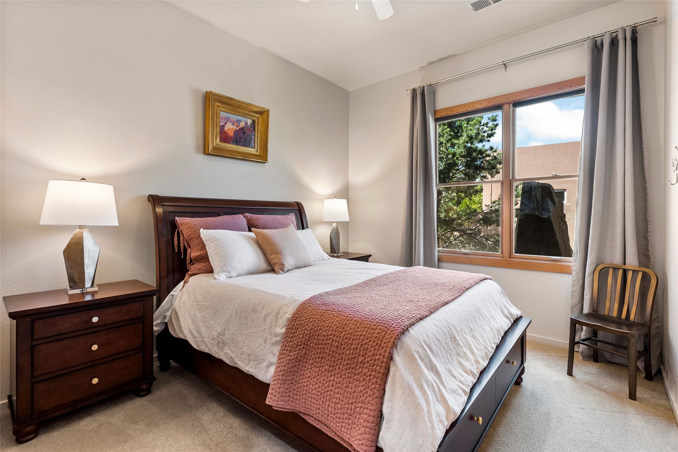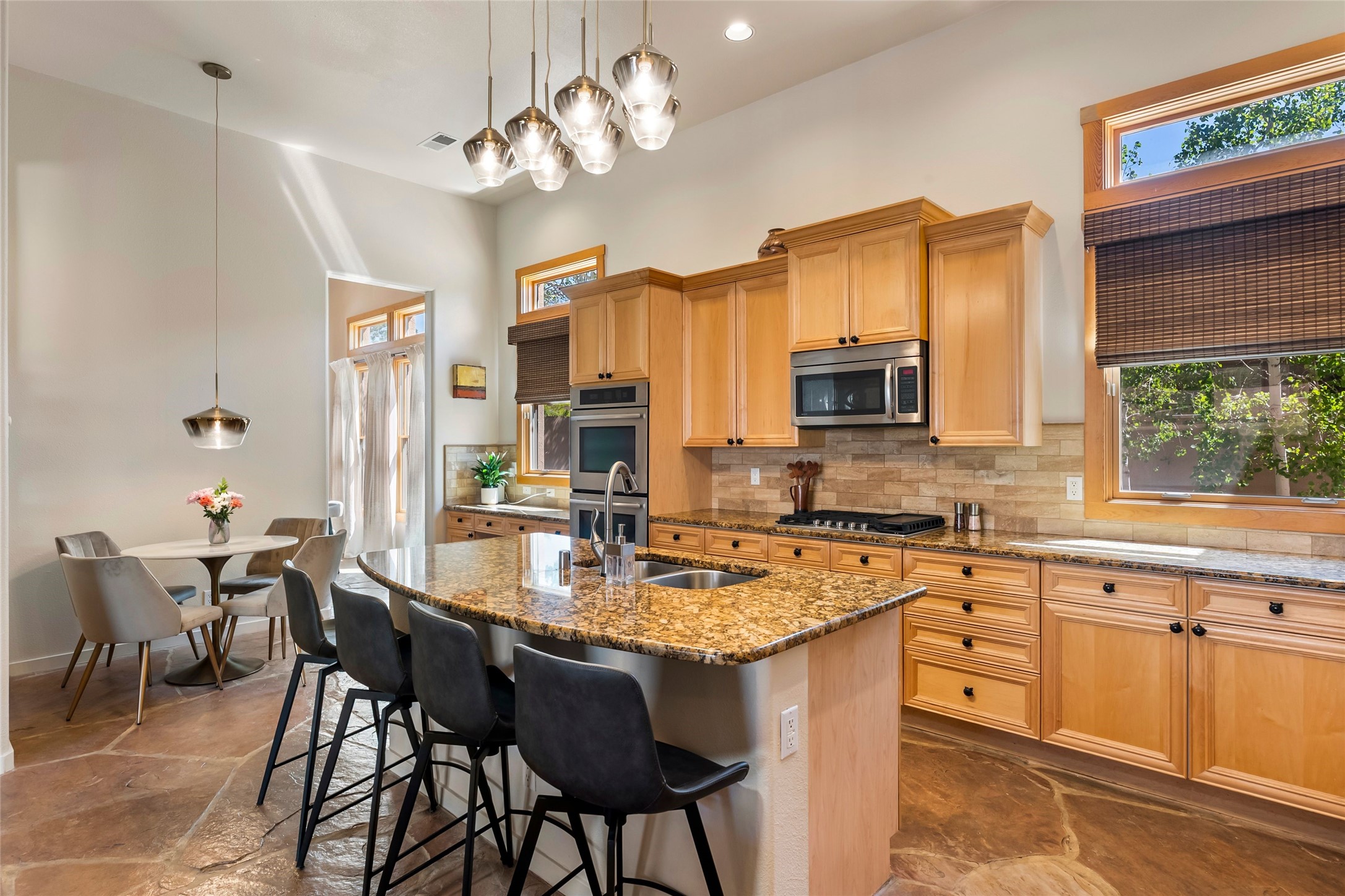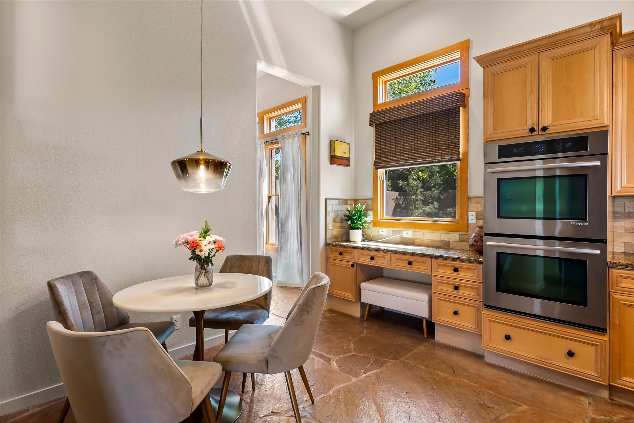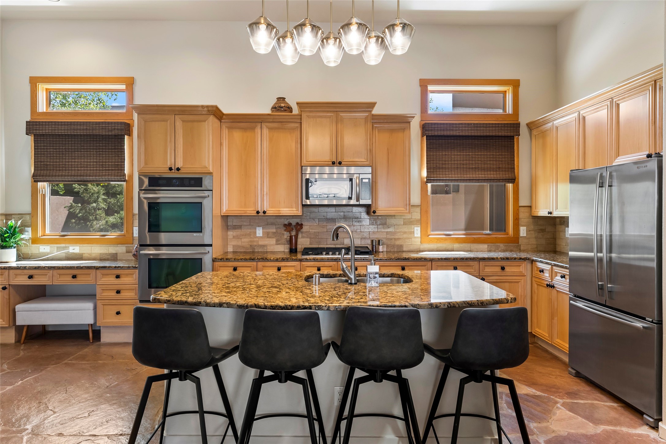 Rarely available 5 bedroom, 3 bathroom home in Rancho Viejo with multiple gathering spaces inside and out is calling you home! This was the model home and you will know why when you step through the front door. Elegance, warmth, and charm abound in this single level (no steps!) abode with high ceilings with vigas, gorgeous flagstone flooring, kiva woodburning fireplace, two living areas, and two dining areas. The grand entry foyer welcomes you into this beautiful and well-maintained home with great separation between the gracious primary bedroom suite and the four guest bedrooms. One of the guest bedrooms is its own suite with patio and separate entrance, perfect for guests wanting to come and go as they please. The additional guest bedrooms provide space for offices, exercise rooms, or whatever best suits your lifestyle. Unleash your inner chef in the stunning and functional kitchen that includes an island with bar seating, upgraded cabinets, and granite countertops. The grand rear portal is a sanctuary for outdoor living and entertaining, with Saltillo tile flooring and views to the lovely rear yard with firepit, which is fully enclosed and offers wonderful southern views of the Ortiz Mountains and the Galisteo Wave. Bask in the quiet privacy of your outdoor retreat, perfect for bird and butterfly watching and taking in Santa Fe's incredible sunrises and sunsets. In-floor radiant heat and central air conditioning will keep you comfortable year-round. Additional features include wonderful natural light via clerestory windows and sun tunnels, attached 2 car garage with direct entry, separate laundry room, and close access to the Rancho Viejo trail system. $53K in seller upgrades include a new roof silicone coating in May 2025 with a 25-year transferable warranty. Don't miss this stunning and inviting home in a coveted location!