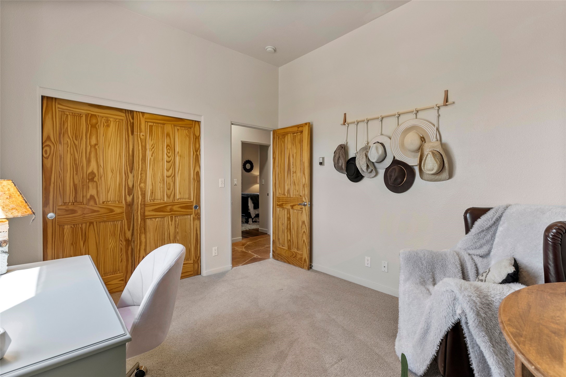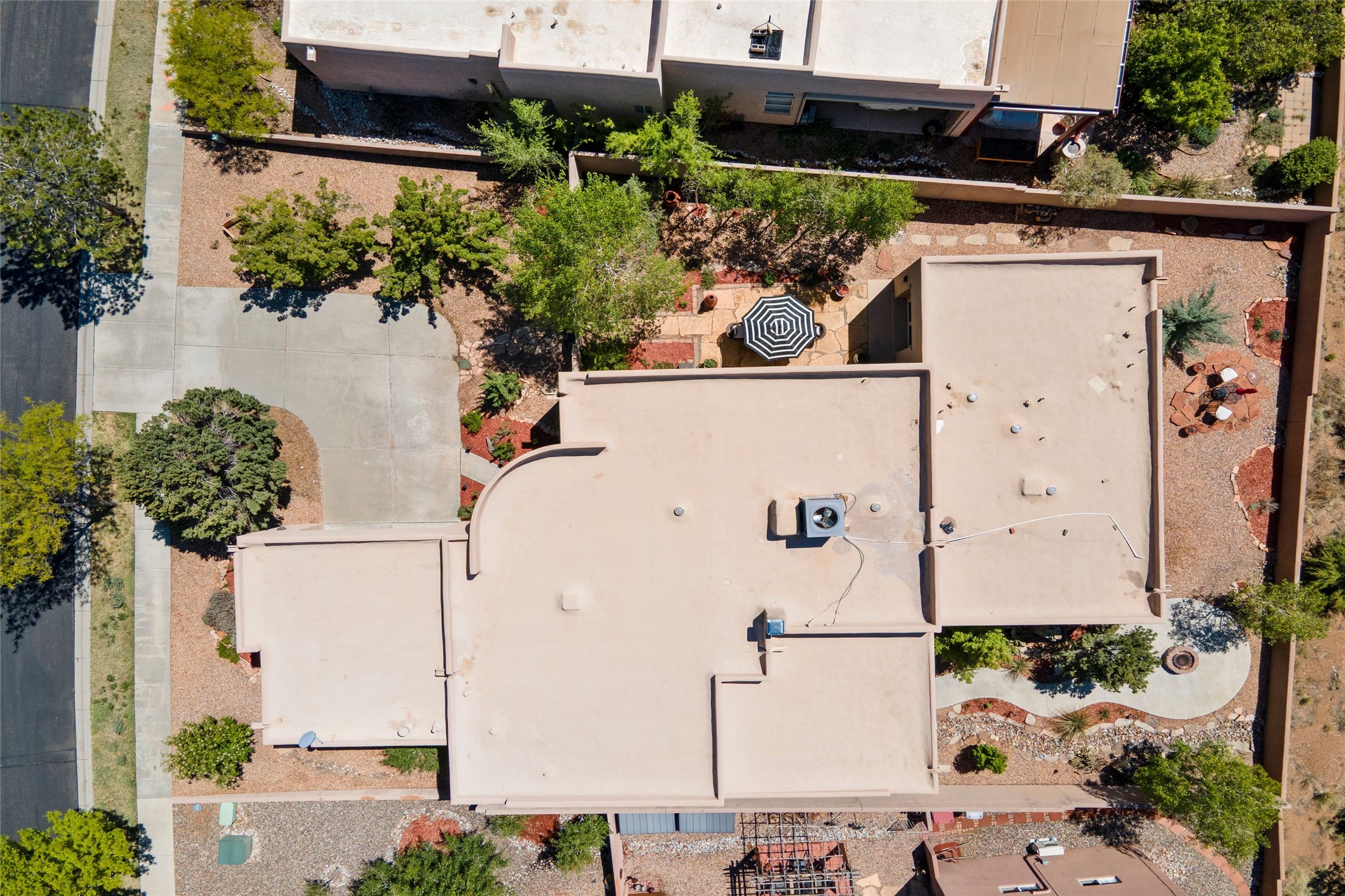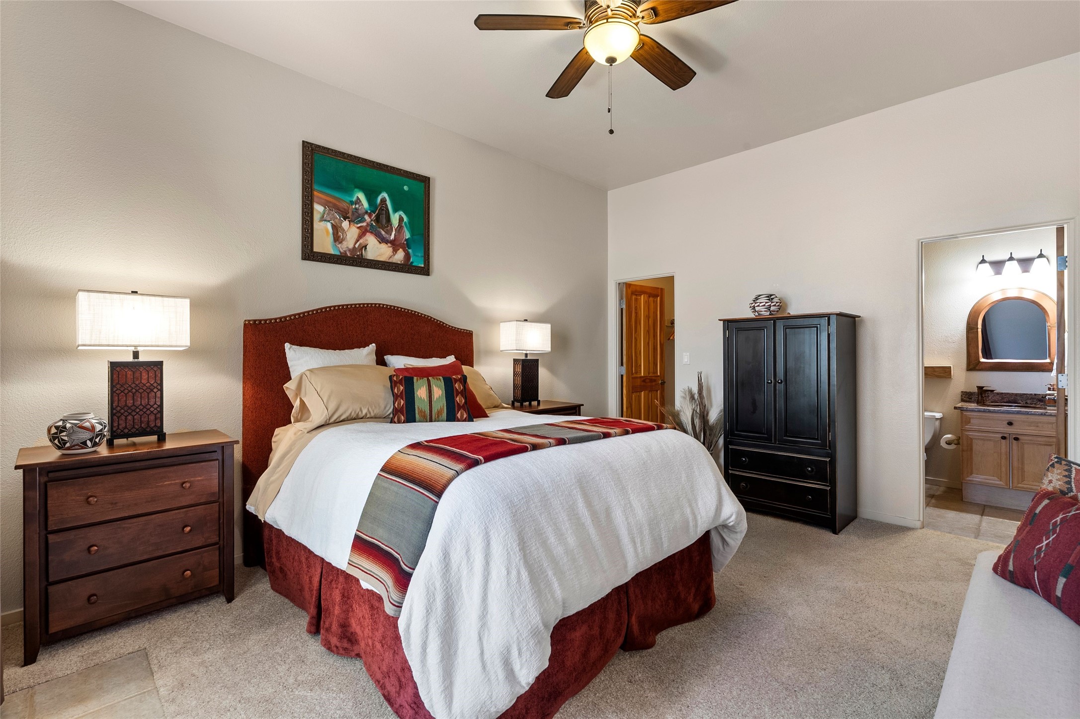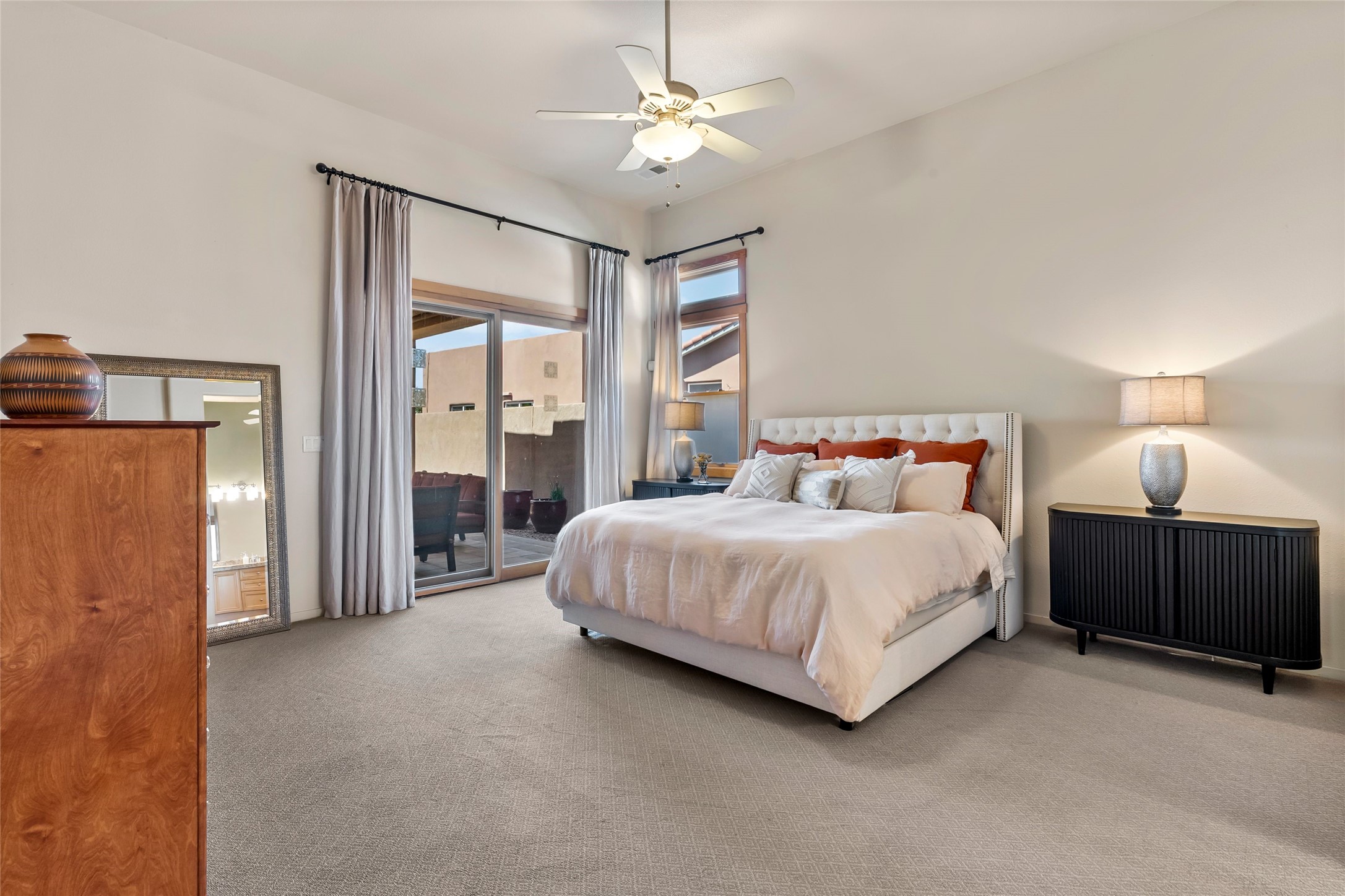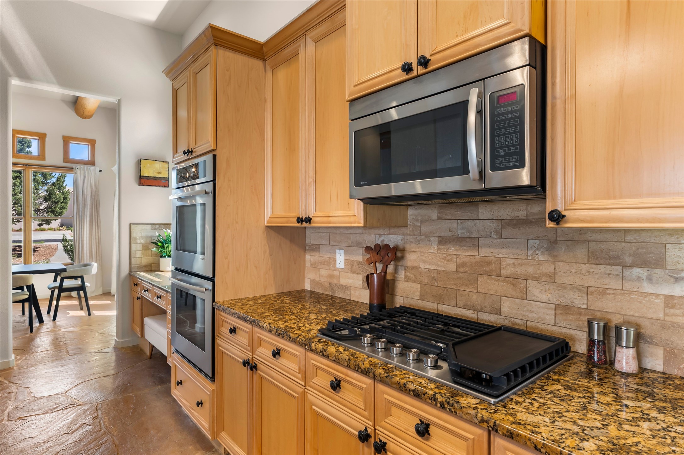 Rarely available 5 bedroom, 3 bathroom home in Rancho Viejo with multiple gathering spaces inside and out is calling you home! This was the model home and you will know why when you step through the front door. Elegance, warmth, and charm abound in this single level (no steps!) abode with high ceilings with vigas, gorgeous flagstone flooring, kiva woodburning fireplace, two living areas, and two dining areas. The grand entry foyer welcomes you into this beautiful and well-maintained home with great separation between the gracious primary bedroom suite and the four guest bedrooms. One of the guest bedrooms is its own suite with patio and separate entrance, perfect for guests wanting to come and go as they please. The additional guest bedrooms provide space for offices, exercise rooms, or whatever best suits your lifestyle. Unleash your inner chef in the stunning and functional kitchen that includes an island with bar seating, upgraded cabinets, and granite countertops. The grand rear portal is a sanctuary for outdoor living and entertaining, with Saltillo tile flooring and views to the lovely rear yard with firepit, which is fully enclosed and offers wonderful southern views of the Ortiz Mountains and the Galisteo Wave. Bask in the quiet privacy of your outdoor retreat, perfect for bird and butterfly watching and taking in Santa Fe's incredible sunrises and sunsets. In-floor radiant heat and central air conditioning will keep you comfortable year-round. Additional features include wonderful natural light via clerestory windows and sun tunnels, attached 2 car garage with direct entry, separate laundry room, and close access to the Rancho Viejo trail system. $53K in seller upgrades include a new roof silicone coating in May 2025 with a 25-year transferable warranty. Don't miss this stunning and inviting home in a coveted location!