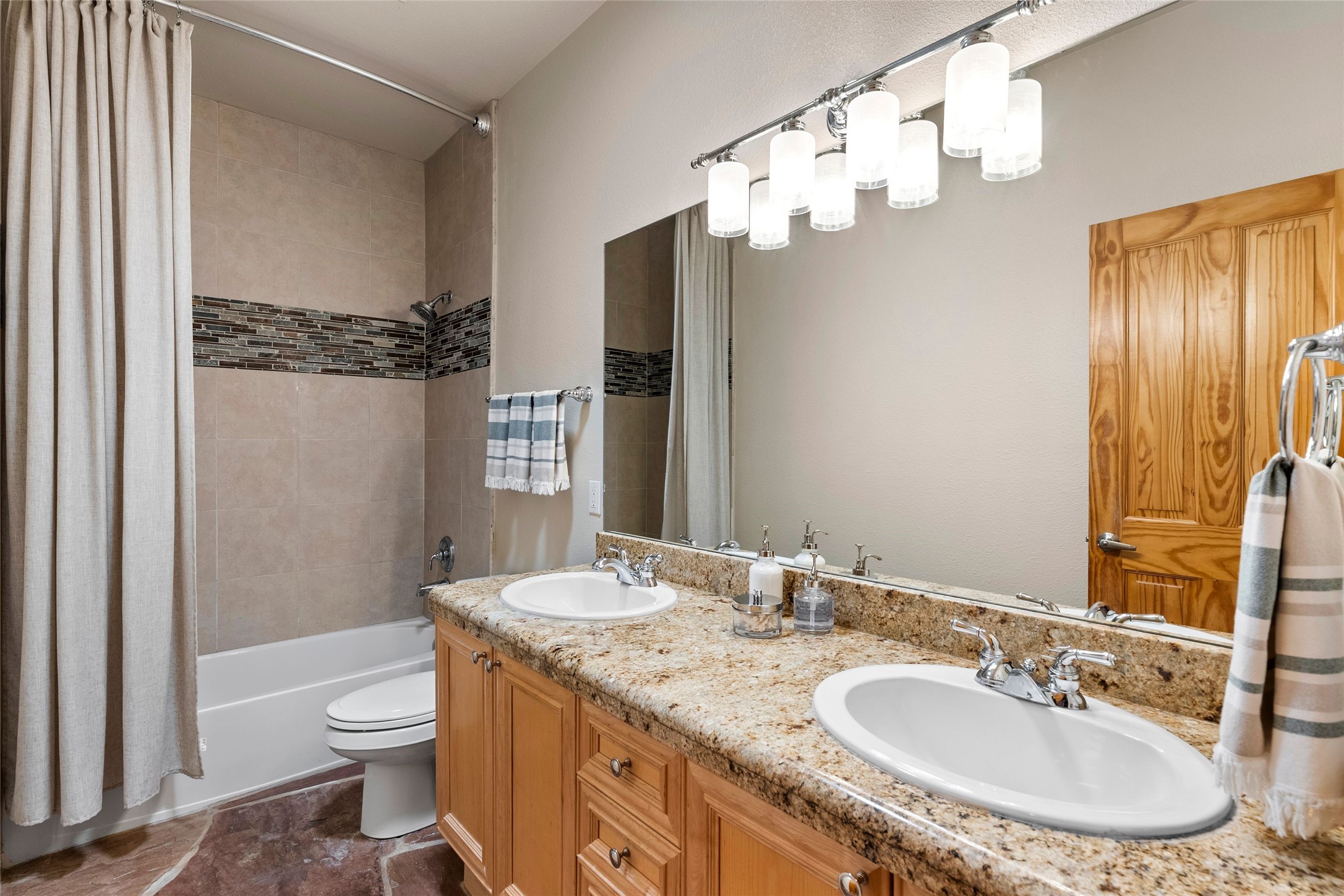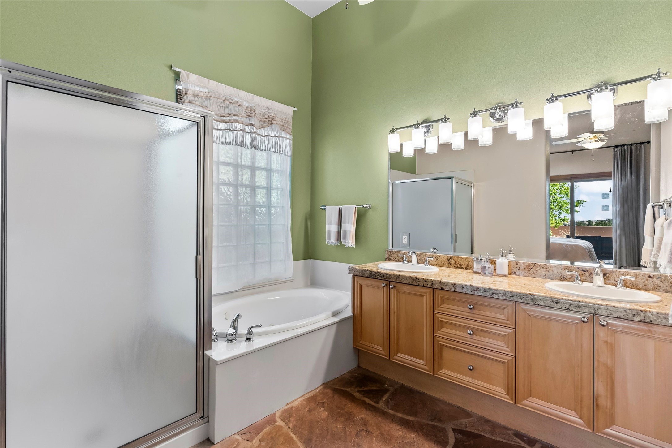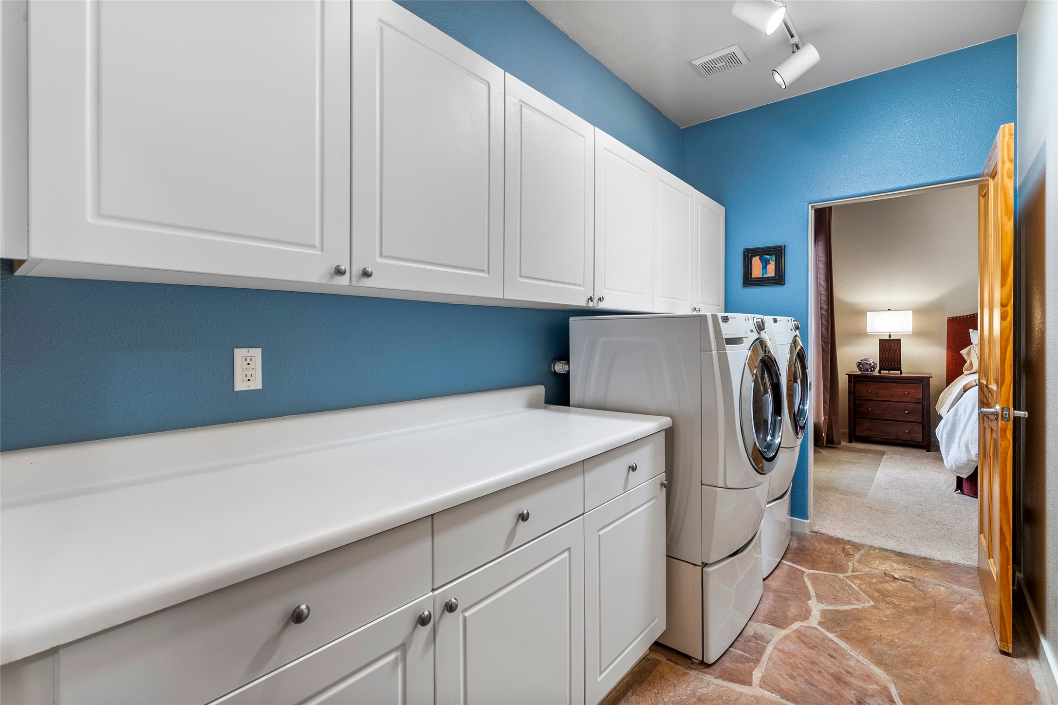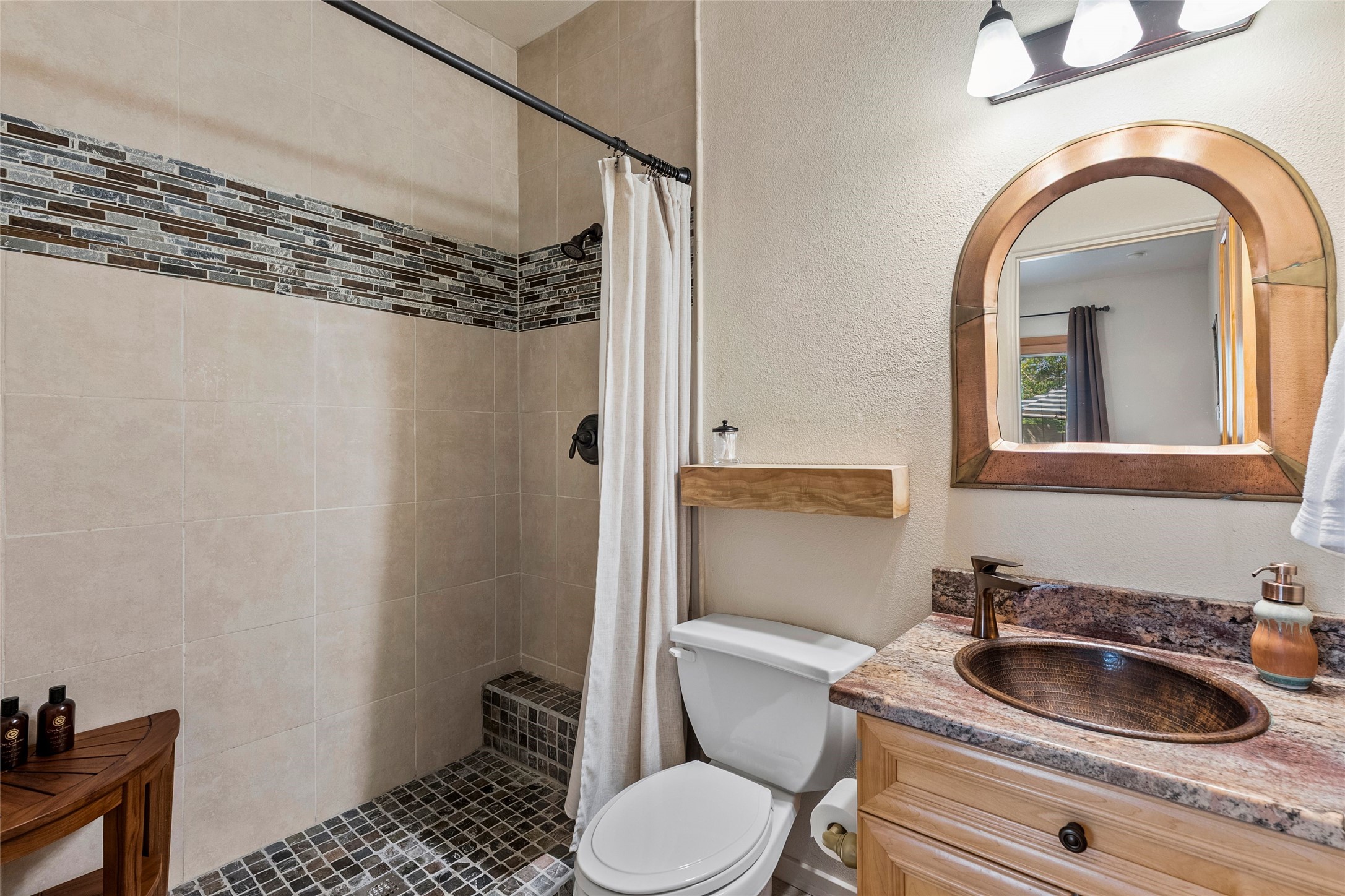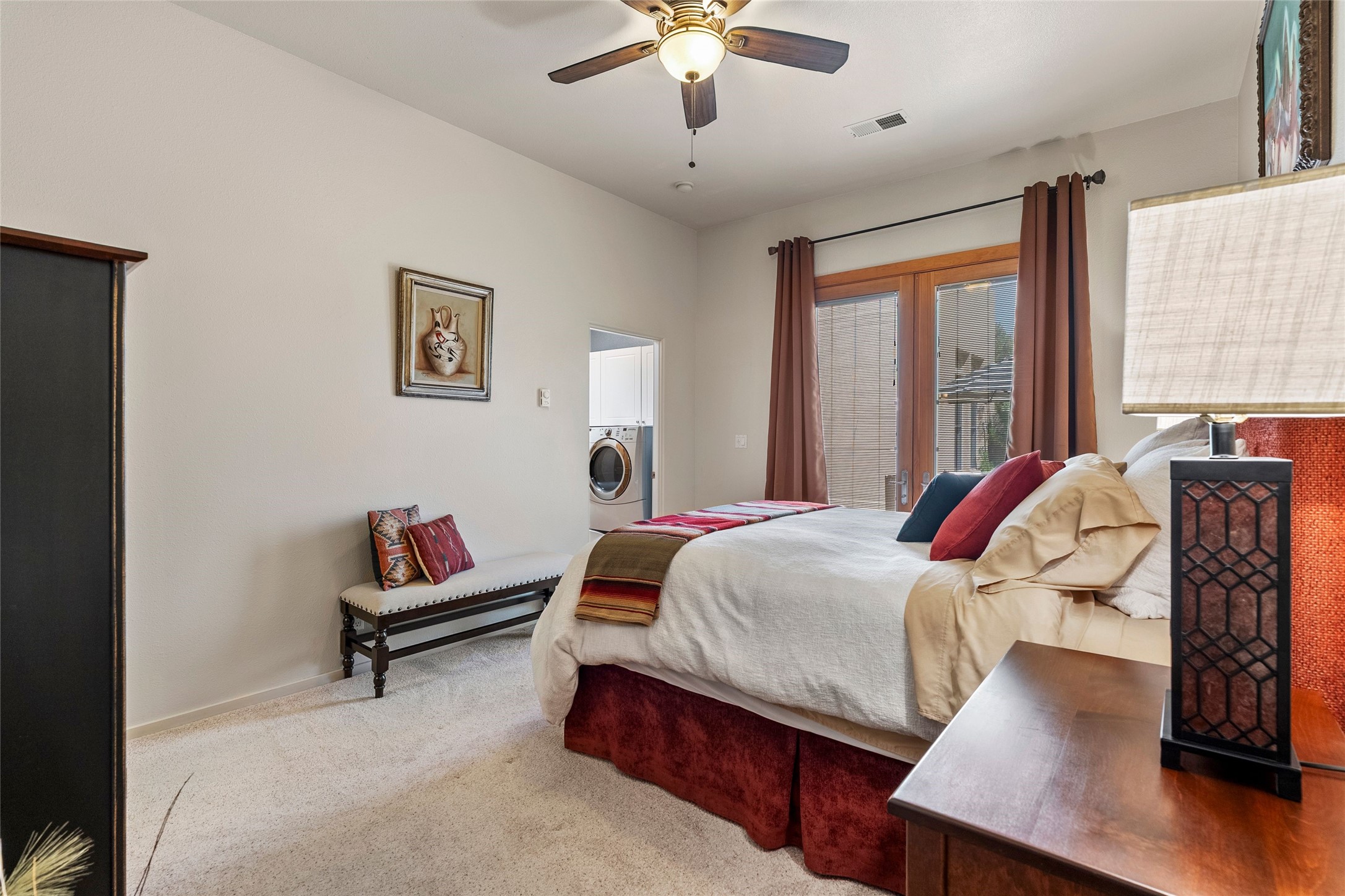 Rarely available 5 bedroom, 3 bathroom home in Rancho Viejo with multiple gathering spaces inside and out is calling you home! This was the model home and you will know why when you step through the front door. Elegance, warmth, and charm abound in this single level (no steps!) abode with high ceilings with vigas, gorgeous flagstone flooring, kiva woodburning fireplace, two living areas, and two dining areas. The grand entry foyer welcomes you into this beautiful and well-maintained home with great separation between the gracious primary bedroom suite and the four guest bedrooms. One of the guest bedrooms is its own suite with patio and separate entrance, perfect for guests wanting to come and go as they please. The additional guest bedrooms provide space for offices, exercise rooms, or whatever best suits your lifestyle. Unleash your inner chef in the stunning and functional kitchen that includes an island with bar seating, upgraded cabinets, and granite countertops. The grand rear portal is a sanctuary for outdoor living and entertaining, with Saltillo tile flooring and views to the lovely rear yard with firepit, which is fully enclosed and offers wonderful southern views of the Ortiz Mountains and the Galisteo Wave. Bask in the quiet privacy of your outdoor retreat, perfect for bird and butterfly watching and taking in Santa Fe's incredible sunrises and sunsets. In-floor radiant heat and central air conditioning will keep you comfortable year-round. Additional features include wonderful natural light via clerestory windows and sun tunnels, attached 2 car garage with direct entry, separate laundry room, and close access to the Rancho Viejo trail system. $53K in seller upgrades include a new roof silicone coating in May 2025 with a 25-year transferable warranty. Don't miss this stunning and inviting home in a coveted location!