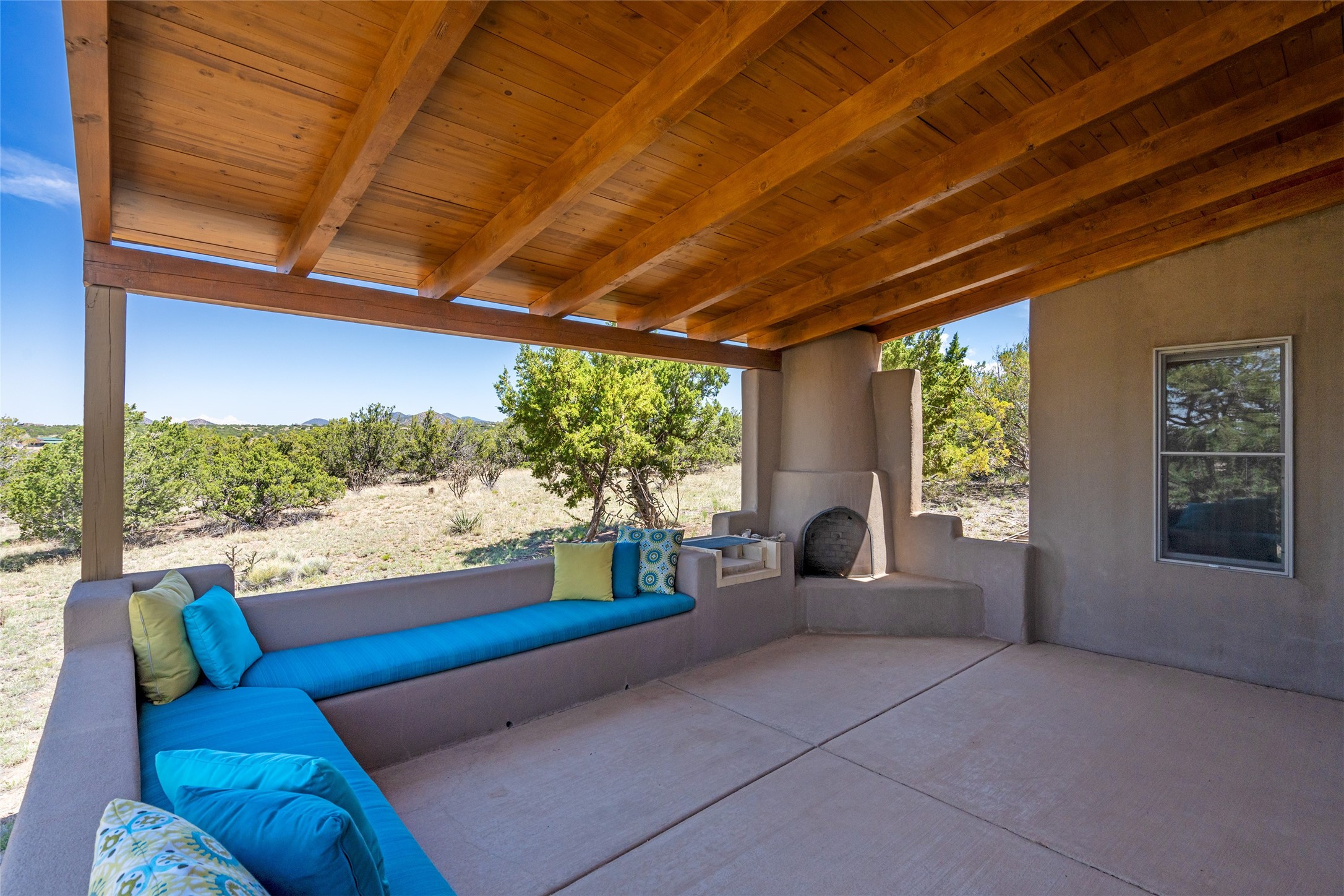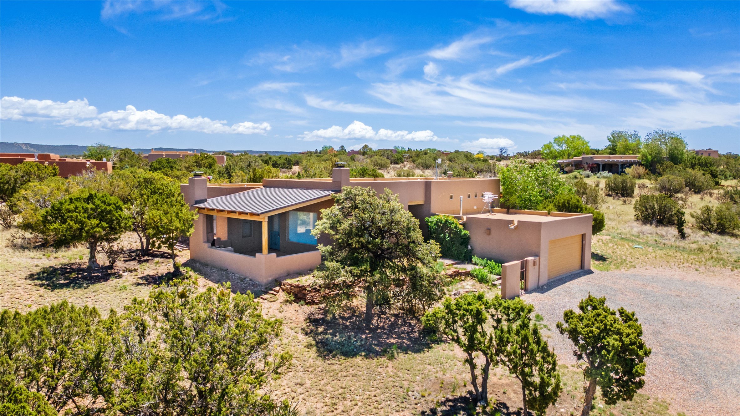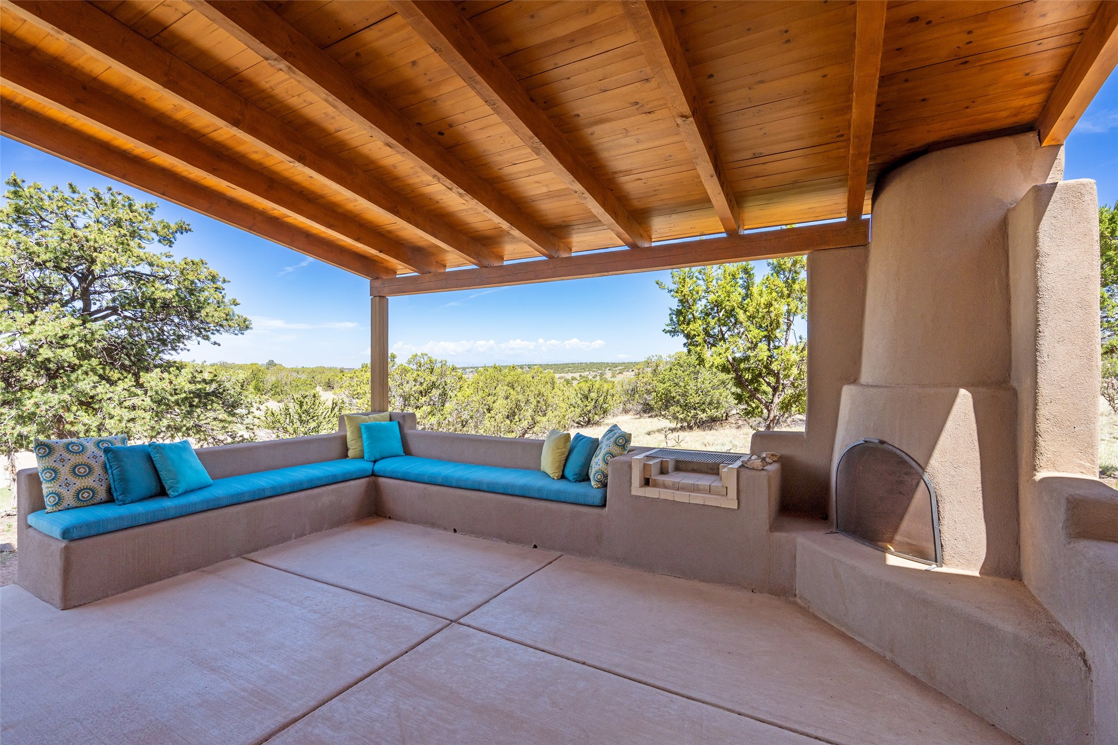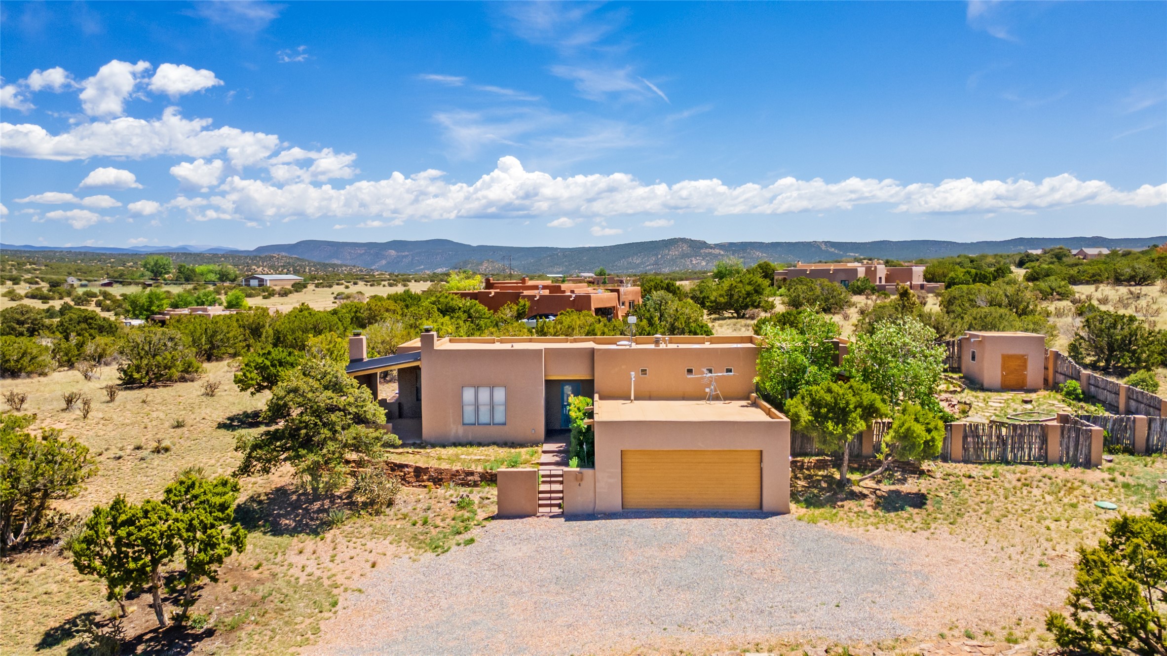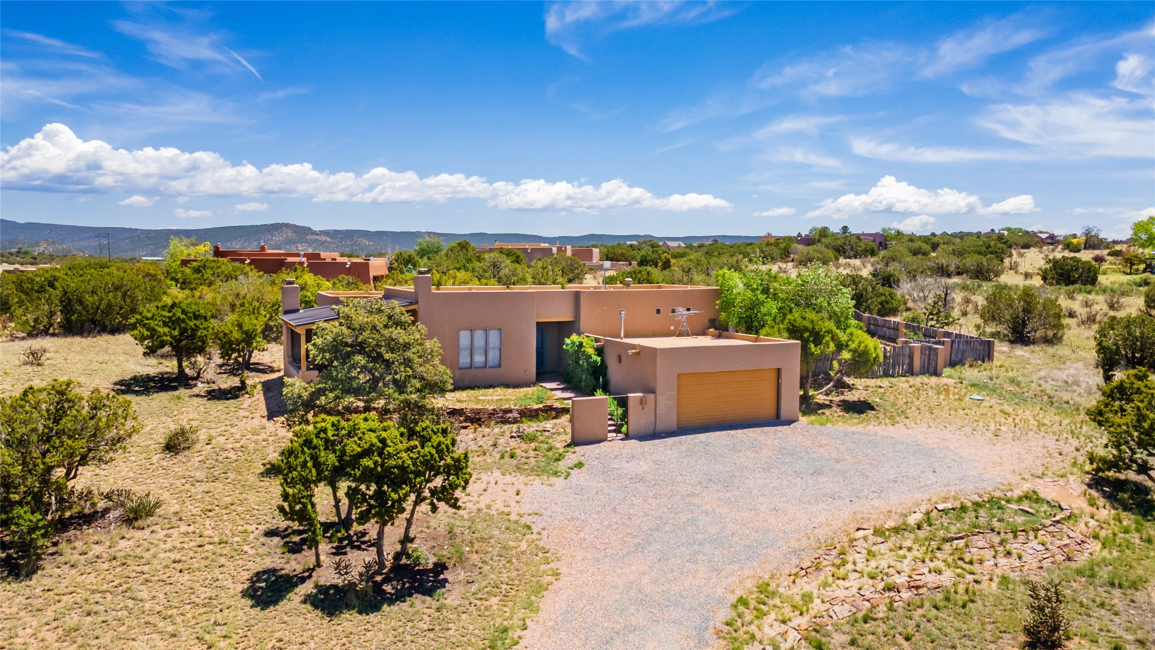 Lovely, contemporary Santa Fe style home in the East Ranch subdivision. This home sits on 2.13 acres, has views and features 3 bedrooms, 2 baths with concrete flooring throughout. Tiled counter tops in the kitchen with stainless appliances, maple cabinets plus an Ikea pantry unit. Seven skylights provide diffused lighting inside the home. Santa Fe touches include vigas and a kiva fireplace in the living area and vigas in the primary bedroom. Bold and colorful accent walls all around! New Hunter Douglas blinds recently installed. Light and bright laundry room with side by side W/D, a sink and cabinets. Two covered portals are located on the north and south side of the house. One portal has a kiva fireplace, the other portal has a kiva fireplace and a built in grill; perfect for outdoor entertaining. Spacious fenced yard in the back with a garden shed. Attached two car garage. This property is conveniently located just 4 miles from the Agora Shopping Center. Don't miss seeing this gem and the serenity of Southwest living!