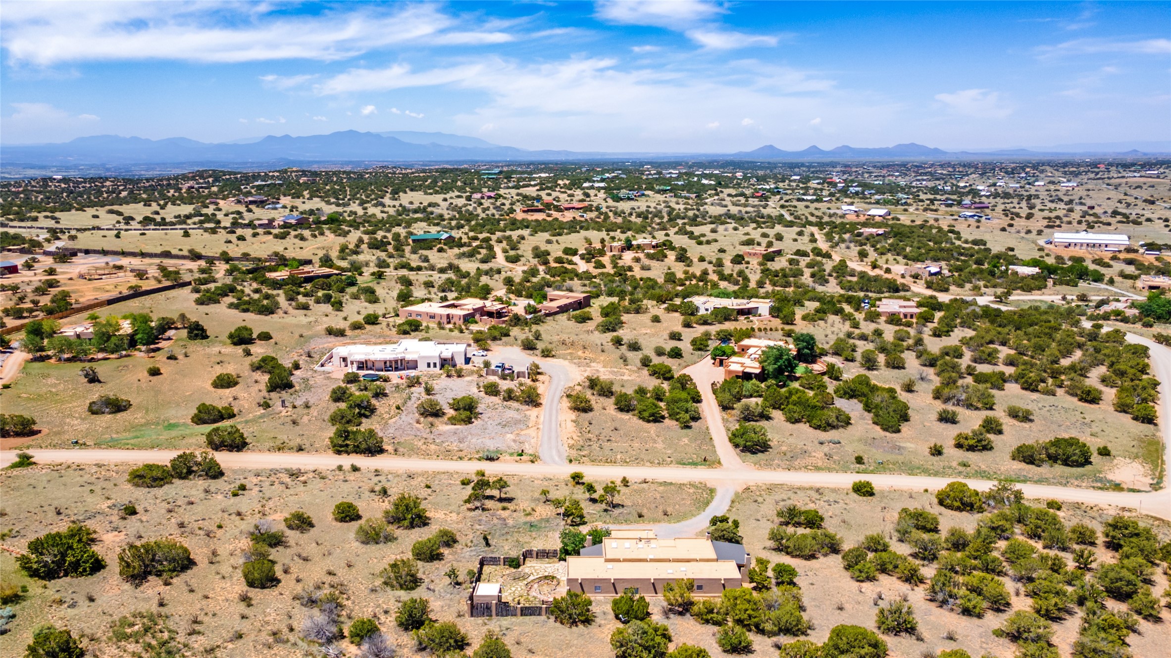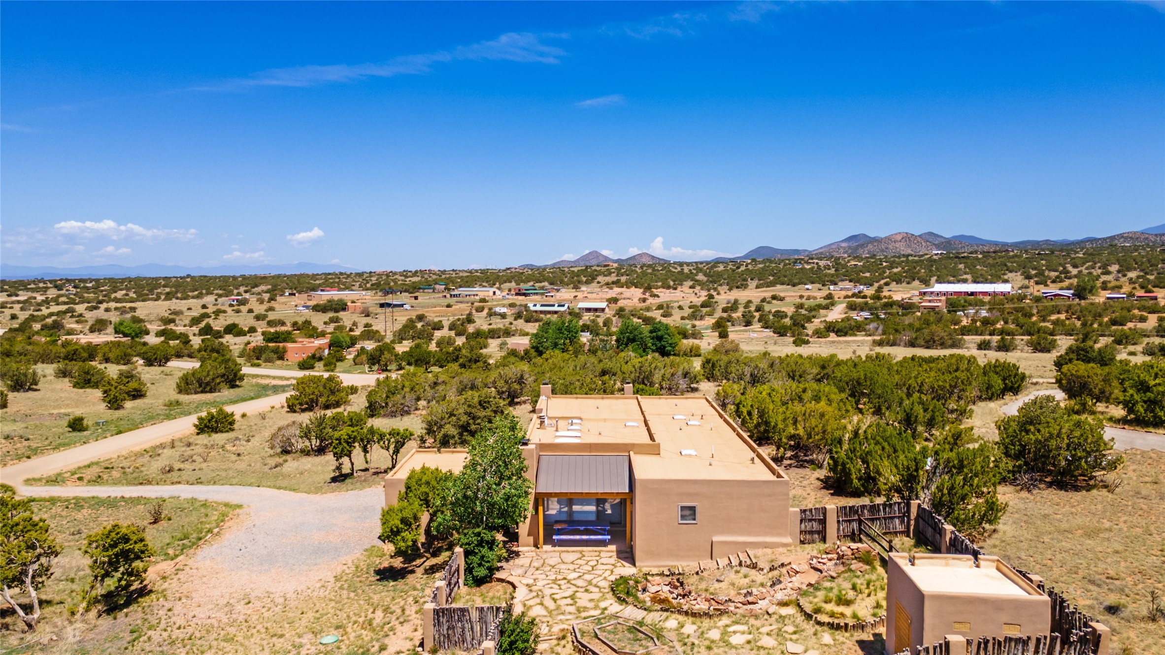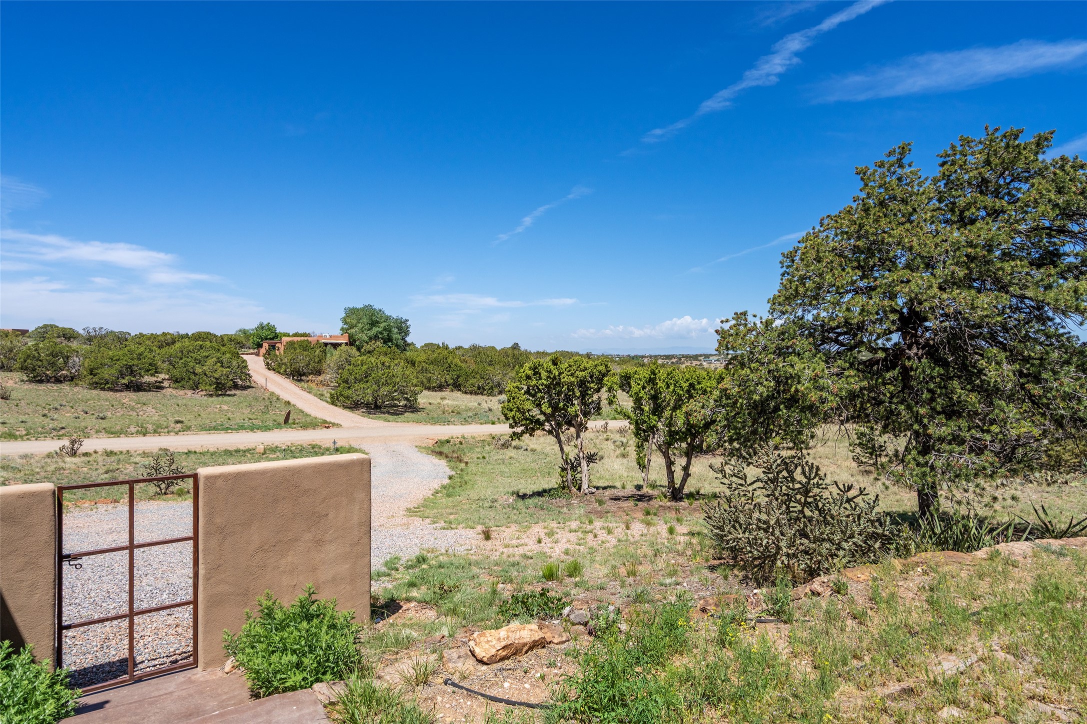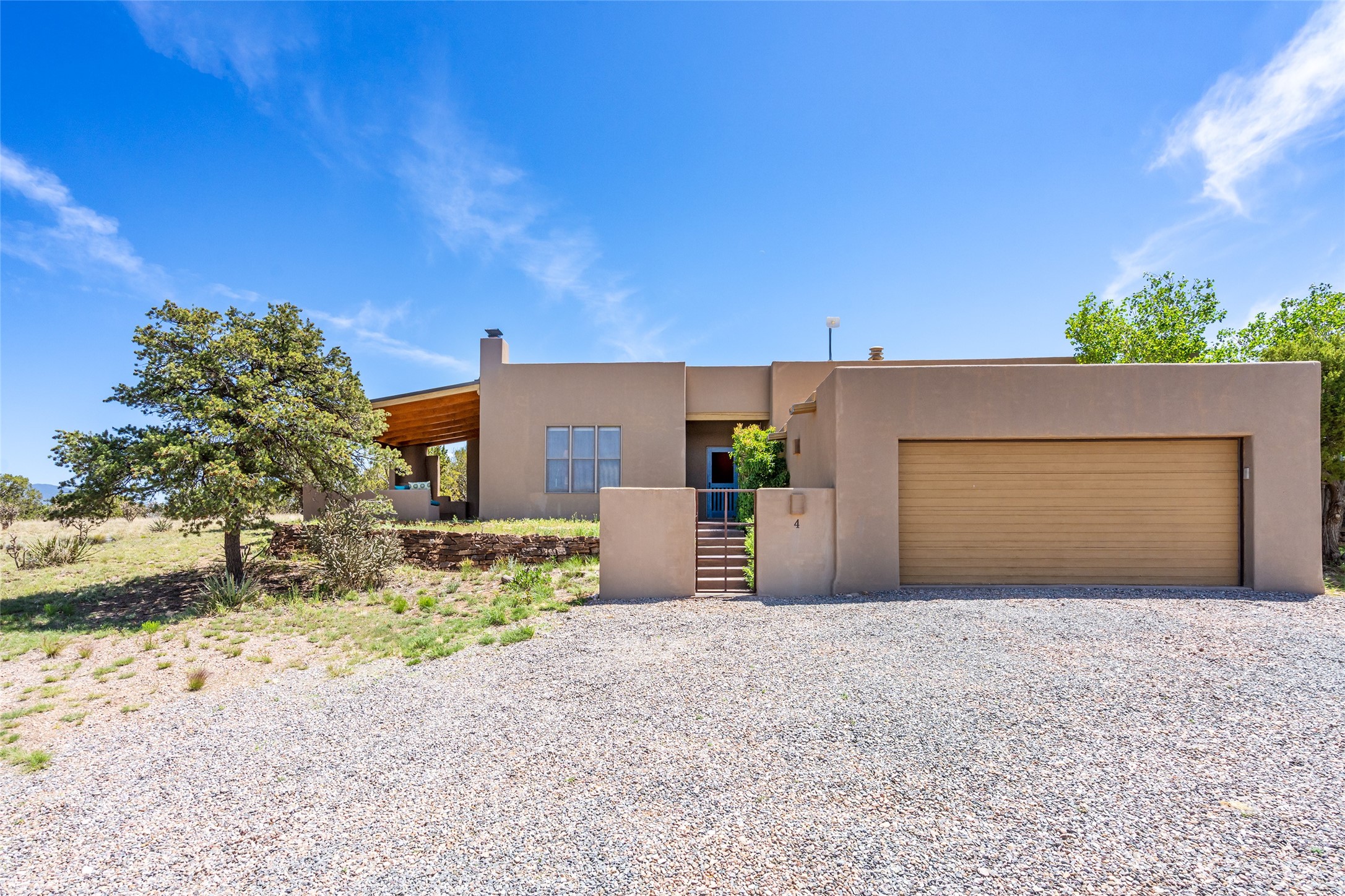 Lovely, contemporary Santa Fe style home in the East Ranch subdivision. This home sits on 2.13 acres, has views and features 3 bedrooms, 2 baths with concrete flooring throughout. Tiled counter tops in the kitchen with stainless appliances, maple cabinets plus an Ikea pantry unit. Seven skylights provide diffused lighting inside the home. Santa Fe touches include vigas and a kiva fireplace in the living area and vigas in the primary bedroom. Bold and colorful accent walls all around! New Hunter Douglas blinds recently installed. Light and bright laundry room with side by side W/D, a sink and cabinets. Two covered portals are located on the north and south side of the house. One portal has a kiva fireplace, the other portal has a kiva fireplace and a built in grill; perfect for outdoor entertaining. Spacious fenced yard in the back with a garden shed. Attached two car garage. This property is conveniently located just 4 miles from the Agora Shopping Center. Don't miss seeing this gem and the serenity of Southwest living!