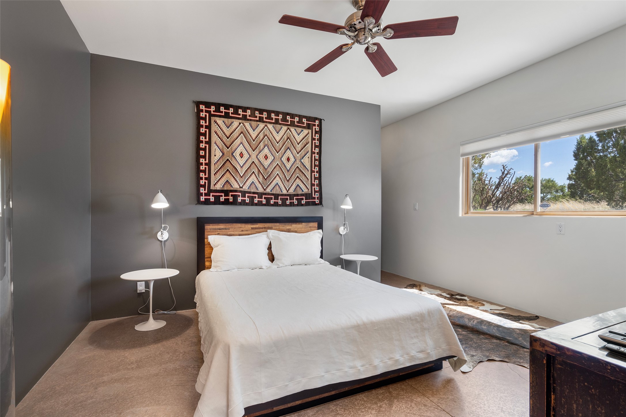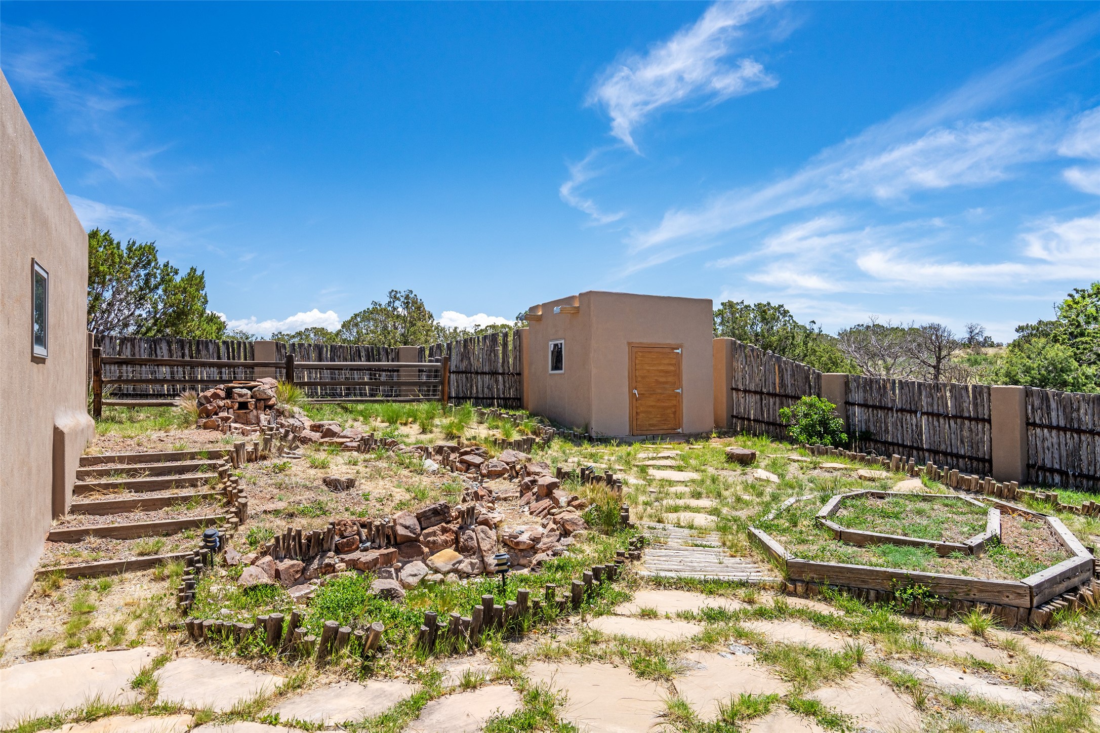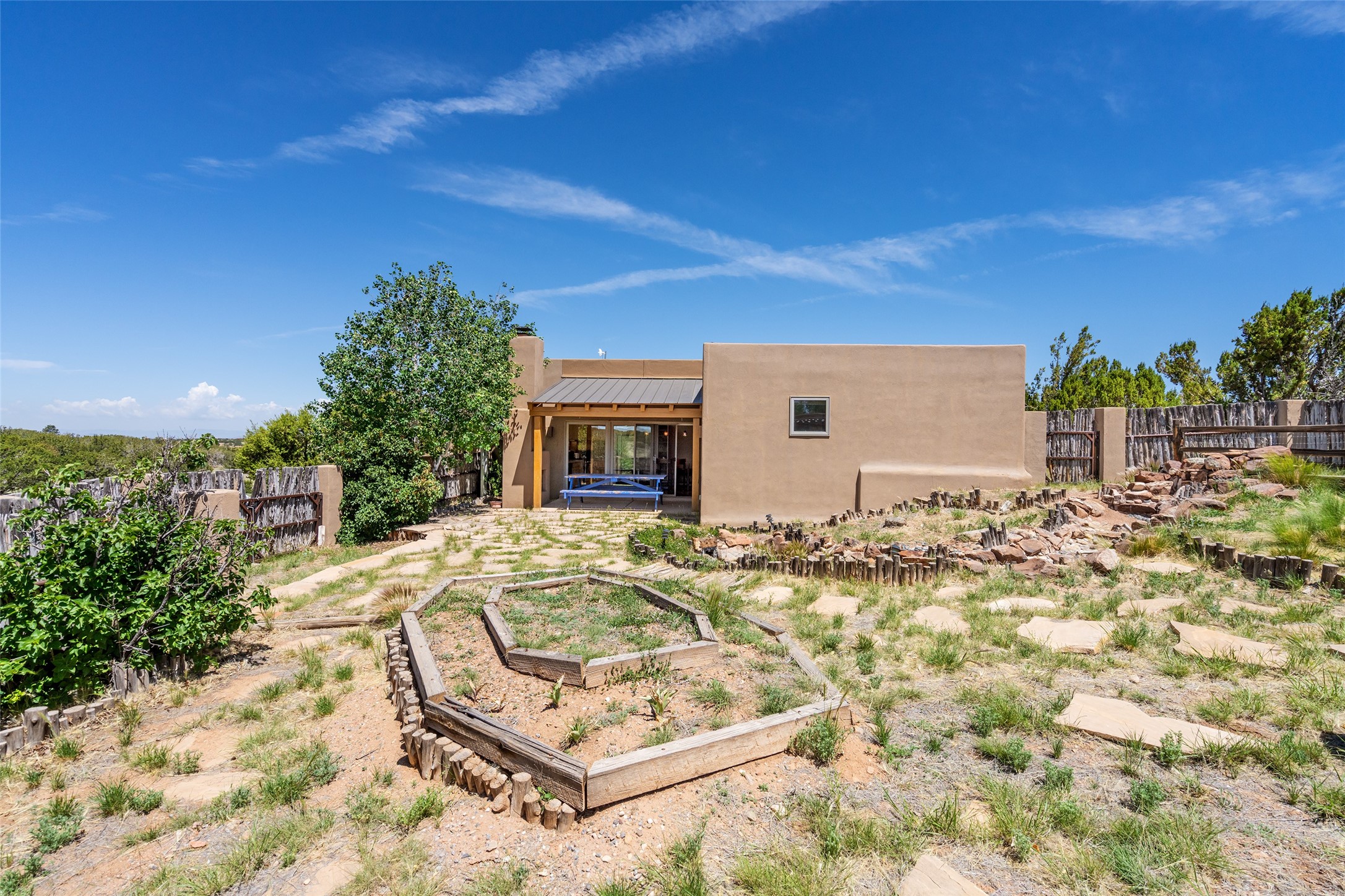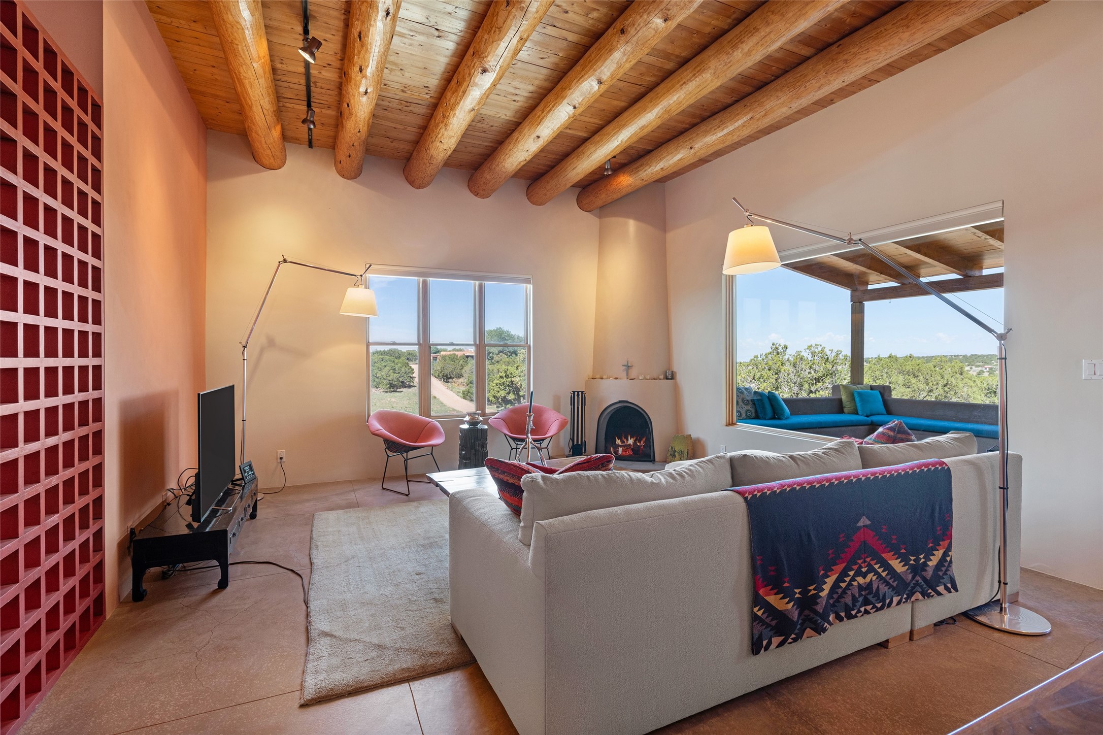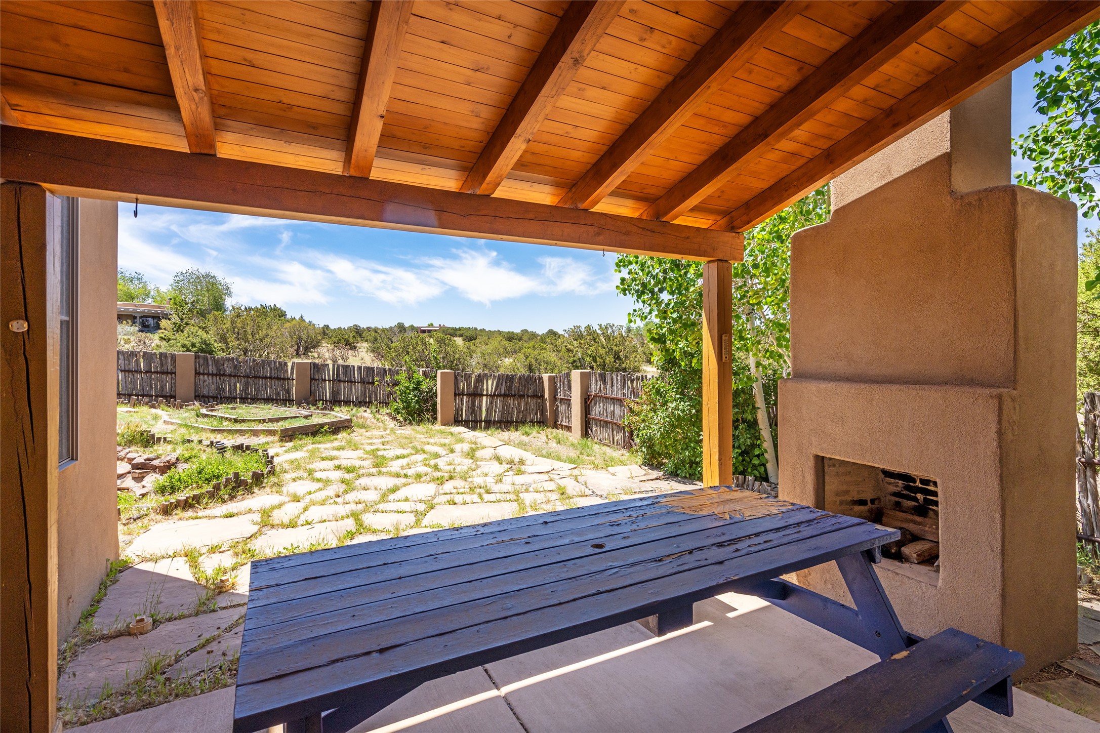Lovely, contemporary Santa Fe style home in the East Ranch subdivision. This home sits on 2.13 acres, has views and features 3 bedrooms, 2 baths with concrete flooring throughout. Tiled counter tops in the kitchen with stainless appliances, maple cabinets plus an Ikea pantry unit. Seven skylights provide diffused lighting inside the home. Santa Fe touches include vigas and a kiva fireplace in the living area and vigas in the primary bedroom. Bold and colorful accent walls all around! New Hunter Douglas blinds recently installed. Light and bright laundry room with side by side W/D, a sink and cabinets. Two covered portals are located on the north and south side of the house. One portal has a kiva fireplace, the other portal has a kiva fireplace and a built in grill; perfect for outdoor entertaining. Spacious fenced yard in the back with a garden shed. Attached two car garage. This property is conveniently located just 4 miles from the Agora Shopping Center. Don't miss seeing this gem and the serenity of Southwest living!