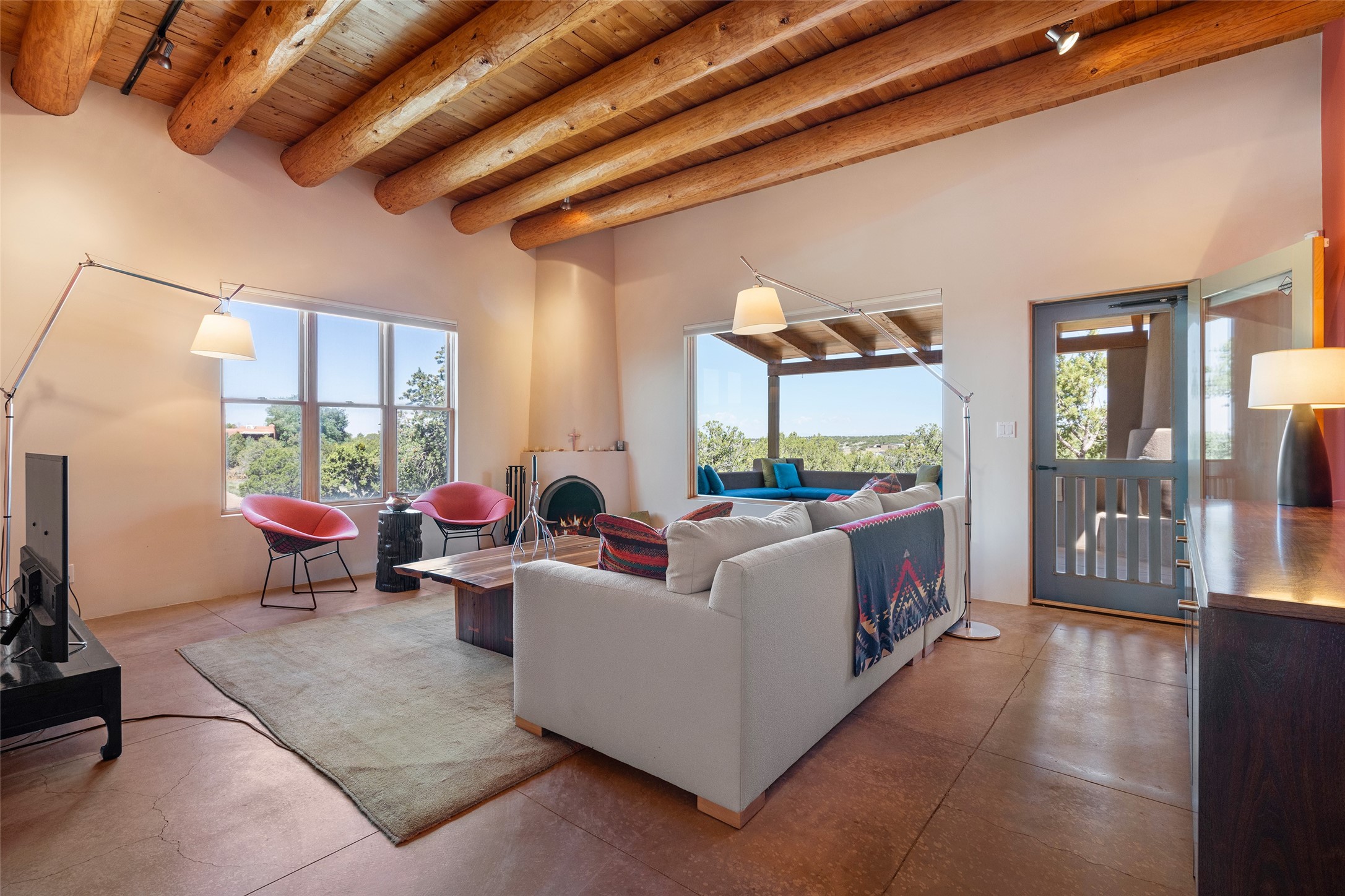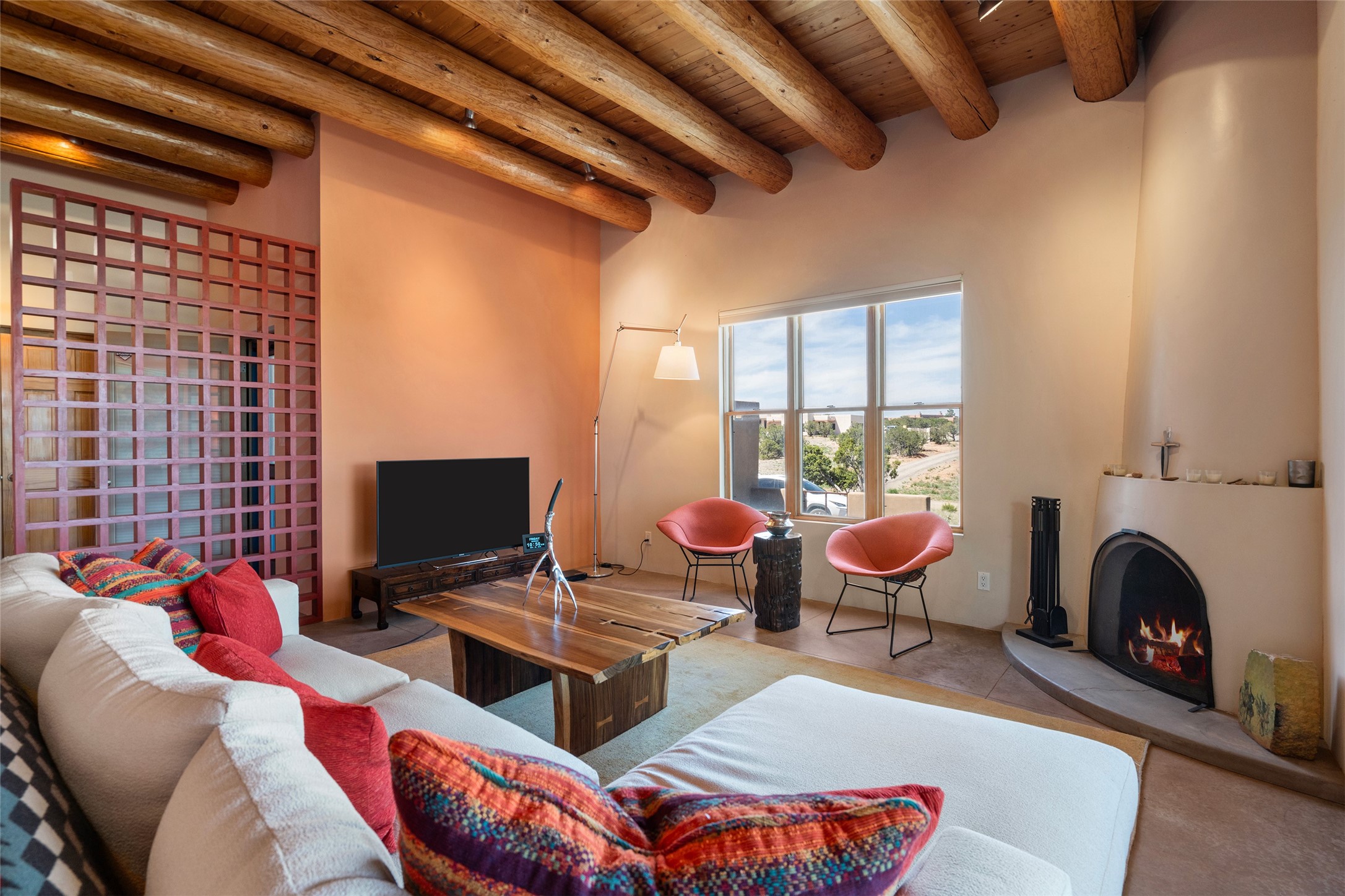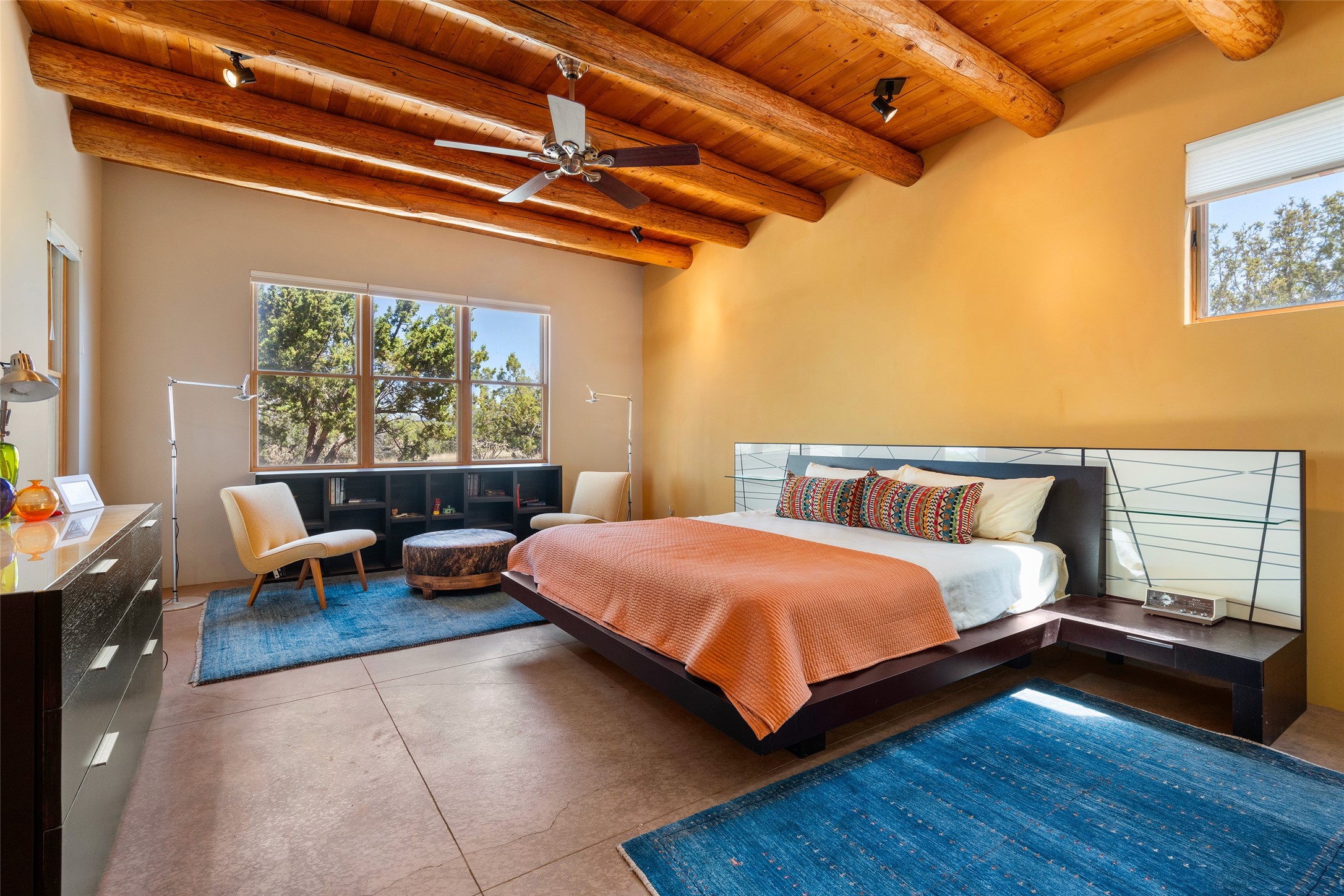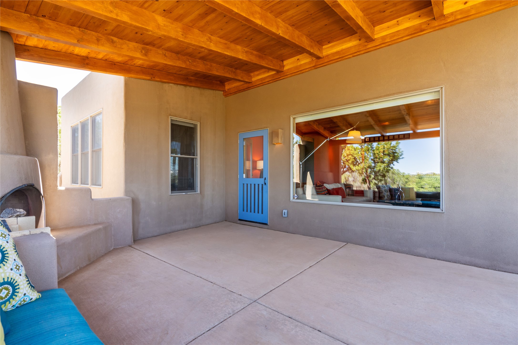 Lovely, contemporary Santa Fe style home in the East Ranch subdivision. This home sits on 2.13 acres, has views and features 3 bedrooms, 2 baths with concrete flooring throughout. Tiled counter tops in the kitchen with stainless appliances, maple cabinets plus an Ikea pantry unit. Seven skylights provide diffused lighting inside the home. Santa Fe touches include vigas and a kiva fireplace in the living area and vigas in the primary bedroom. Bold and colorful accent walls all around! New Hunter Douglas blinds recently installed. Light and bright laundry room with side by side W/D, a sink and cabinets. Two covered portals are located on the north and south side of the house. One portal has a kiva fireplace, the other portal has a kiva fireplace and a built in grill; perfect for outdoor entertaining. Spacious fenced yard in the back with a garden shed. Attached two car garage. This property is conveniently located just 4 miles from the Agora Shopping Center. Don't miss seeing this gem and the serenity of Southwest living!