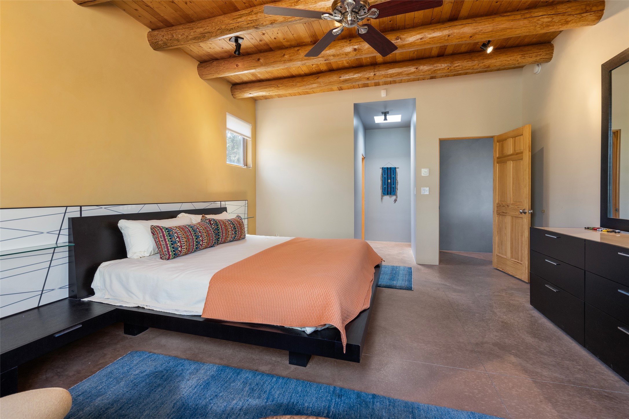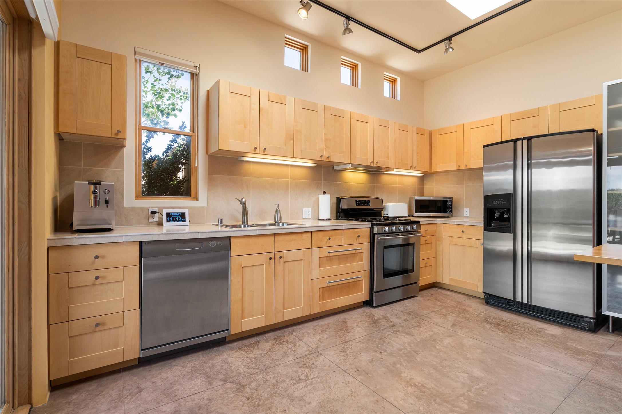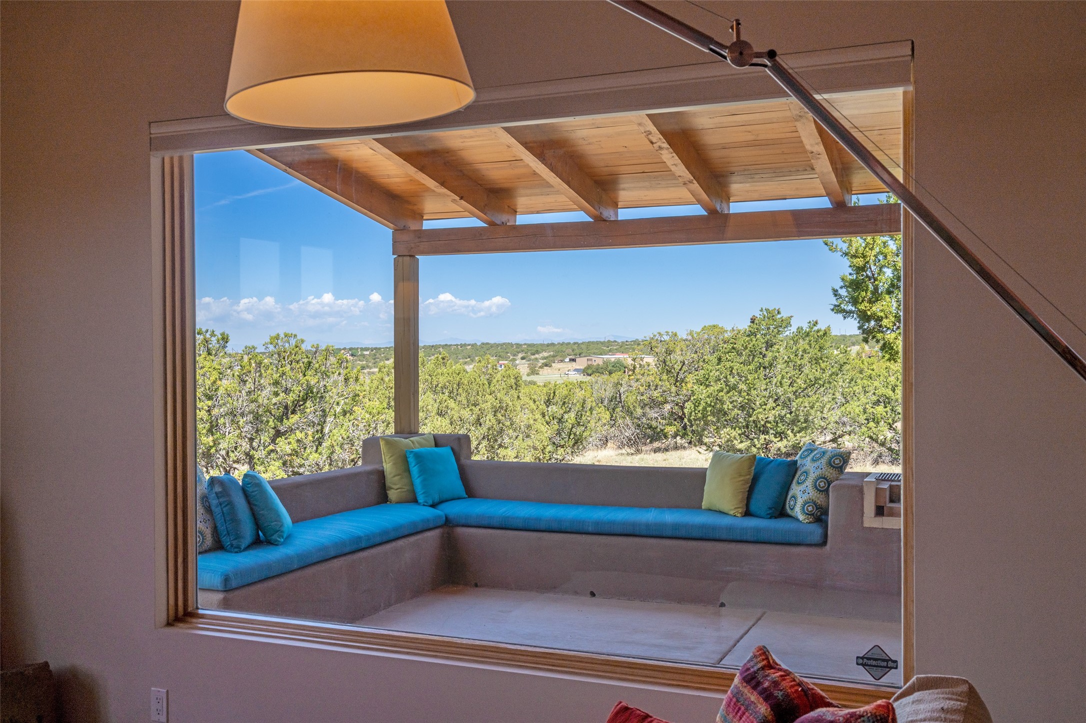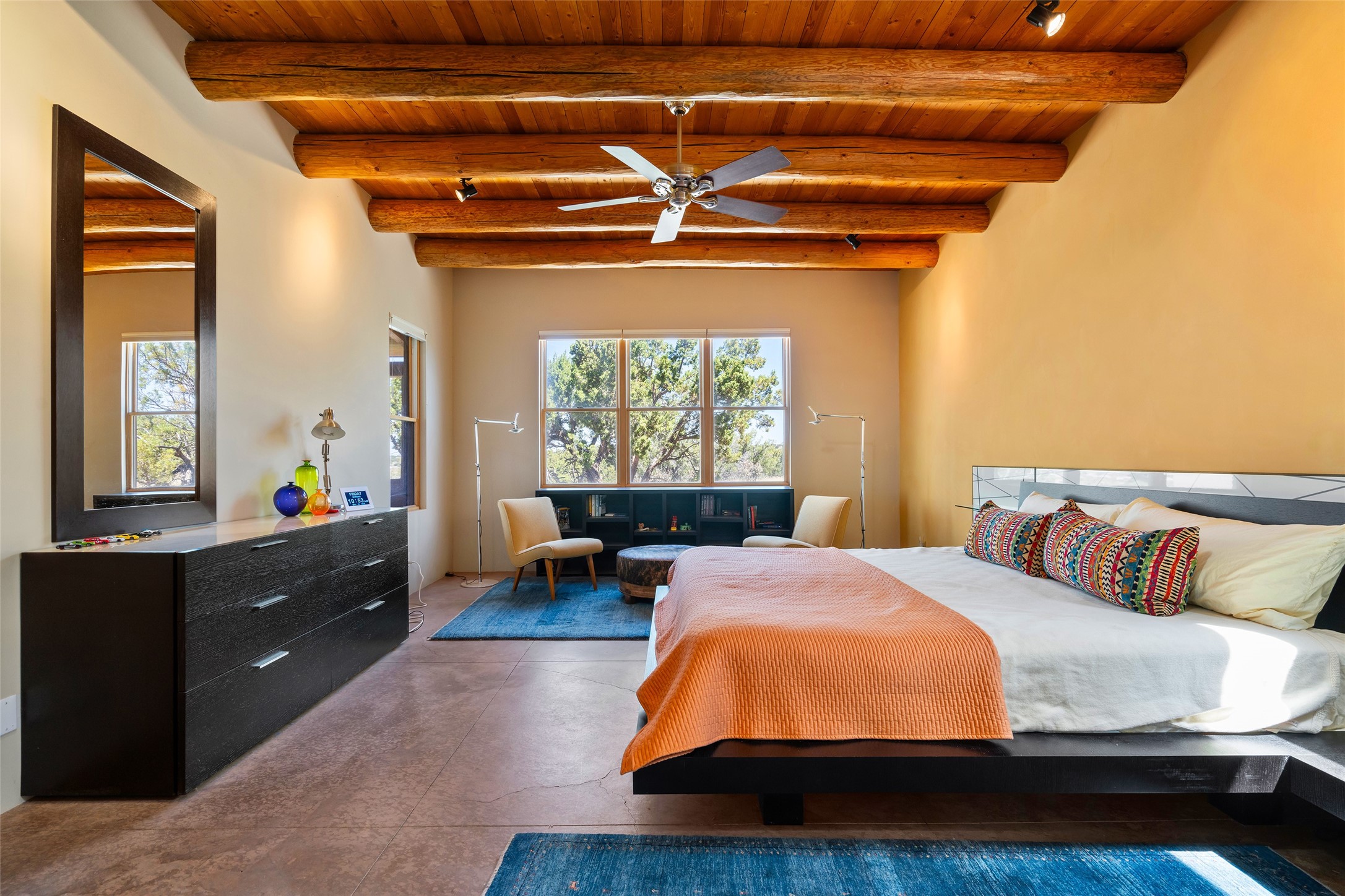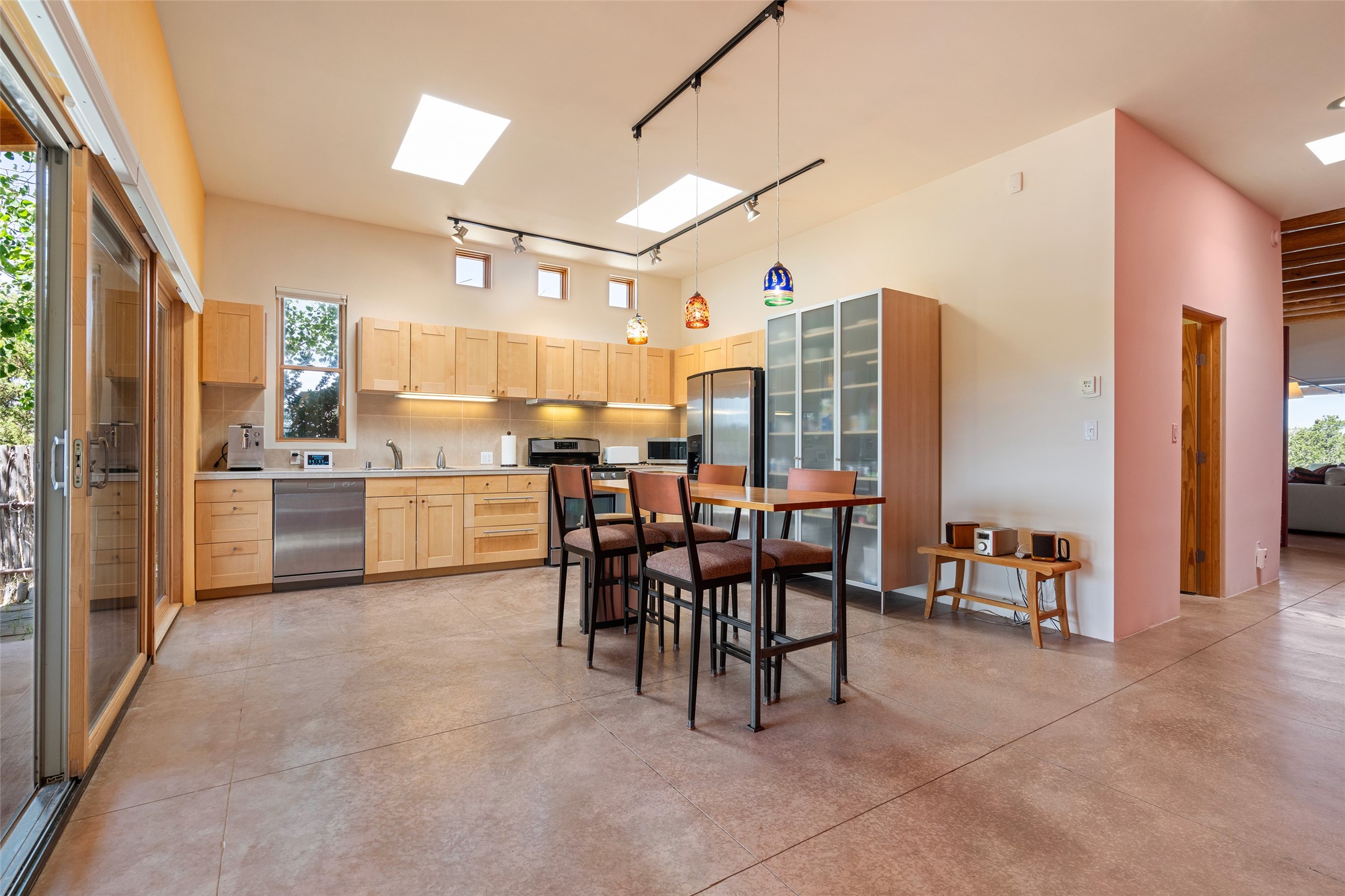 Lovely, contemporary Santa Fe style home in the East Ranch subdivision. This home sits on 2.13 acres, has views and features 3 bedrooms, 2 baths with concrete flooring throughout. Tiled counter tops in the kitchen with stainless appliances, maple cabinets plus an Ikea pantry unit. Seven skylights provide diffused lighting inside the home. Santa Fe touches include vigas and a kiva fireplace in the living area and vigas in the primary bedroom. Bold and colorful accent walls all around! New Hunter Douglas blinds recently installed. Light and bright laundry room with side by side W/D, a sink and cabinets. Two covered portals are located on the north and south side of the house. One portal has a kiva fireplace, the other portal has a kiva fireplace and a built in grill; perfect for outdoor entertaining. Spacious fenced yard in the back with a garden shed. Attached two car garage. This property is conveniently located just 4 miles from the Agora Shopping Center. Don't miss seeing this gem and the serenity of Southwest living!