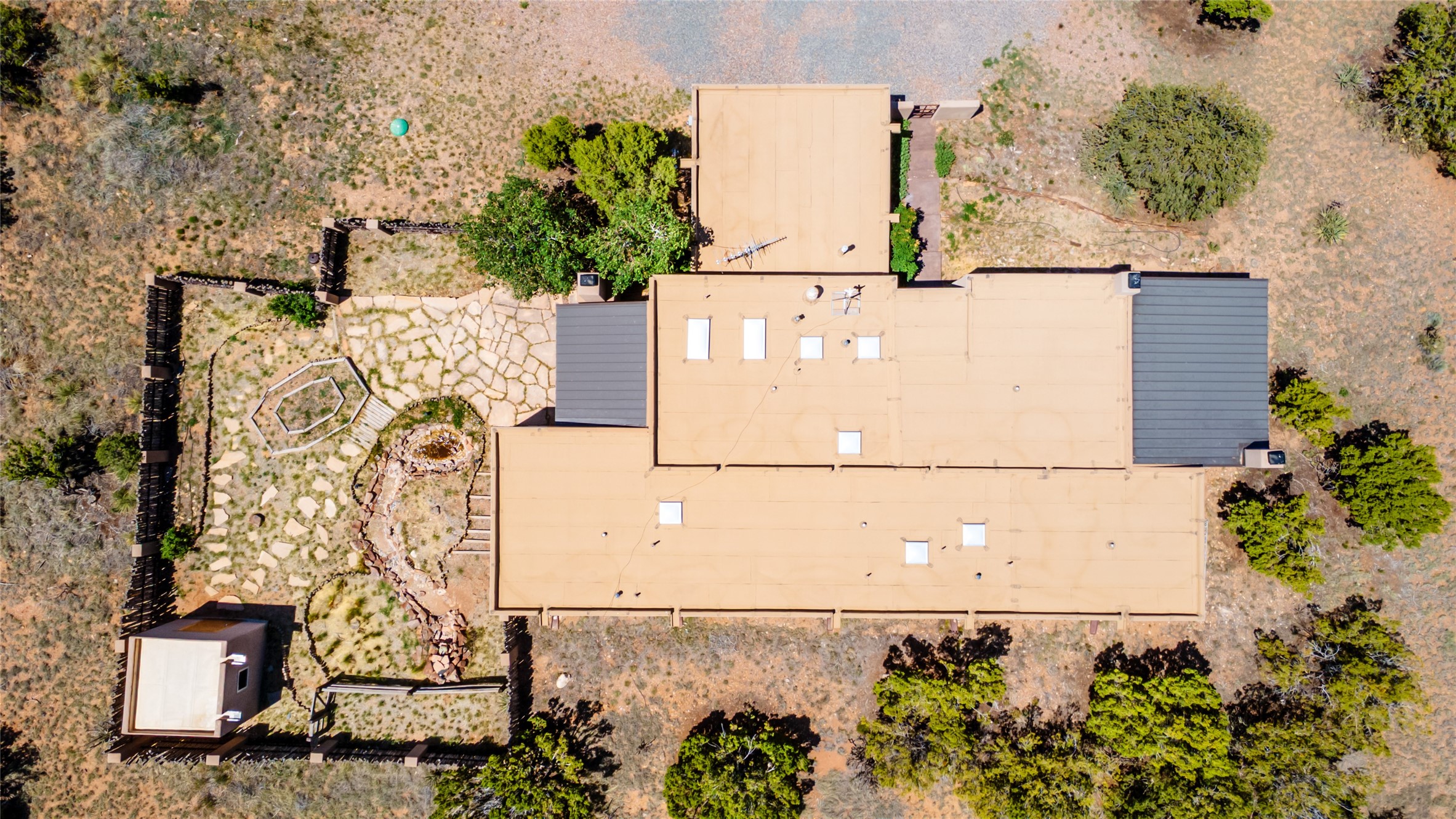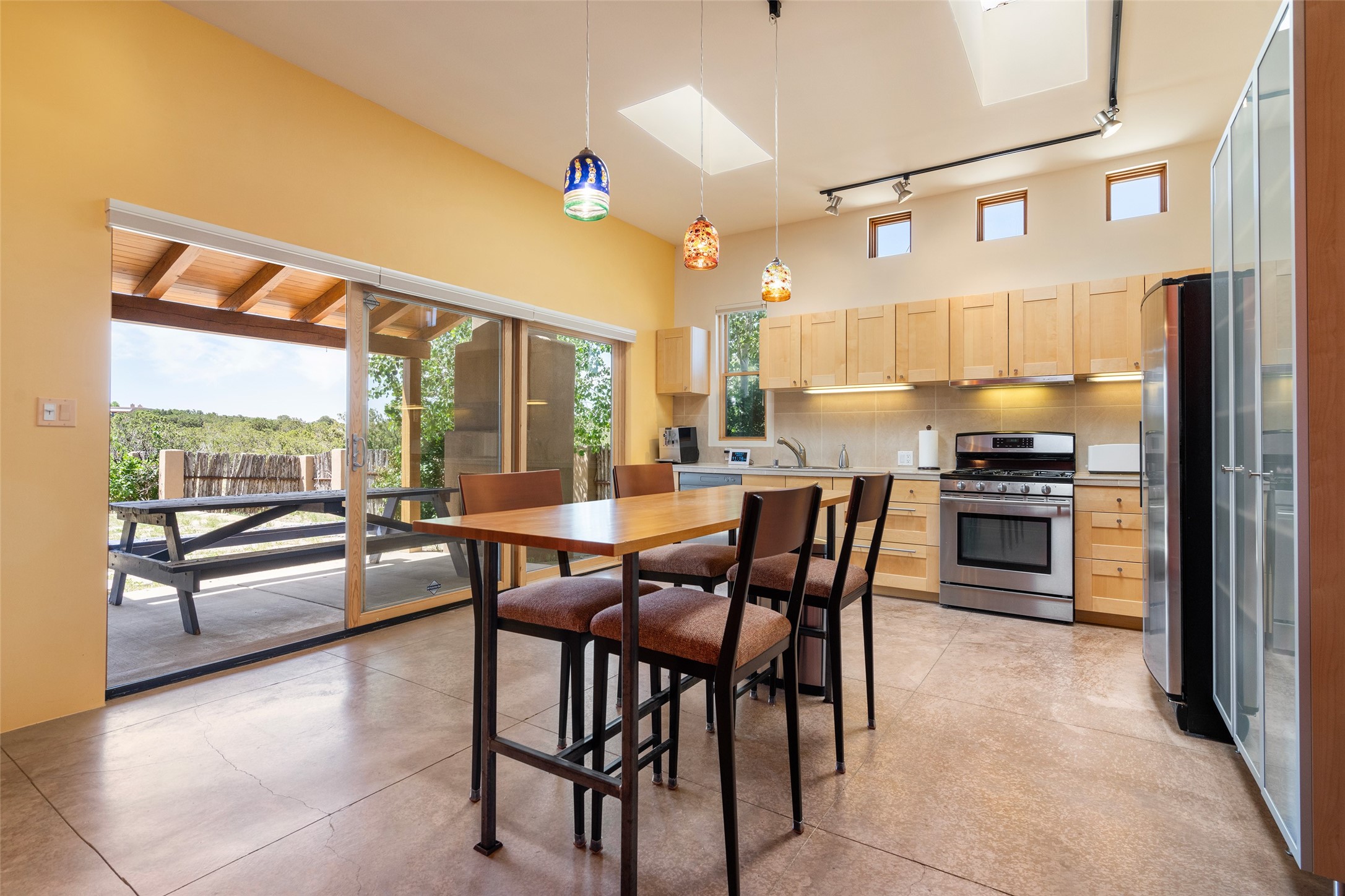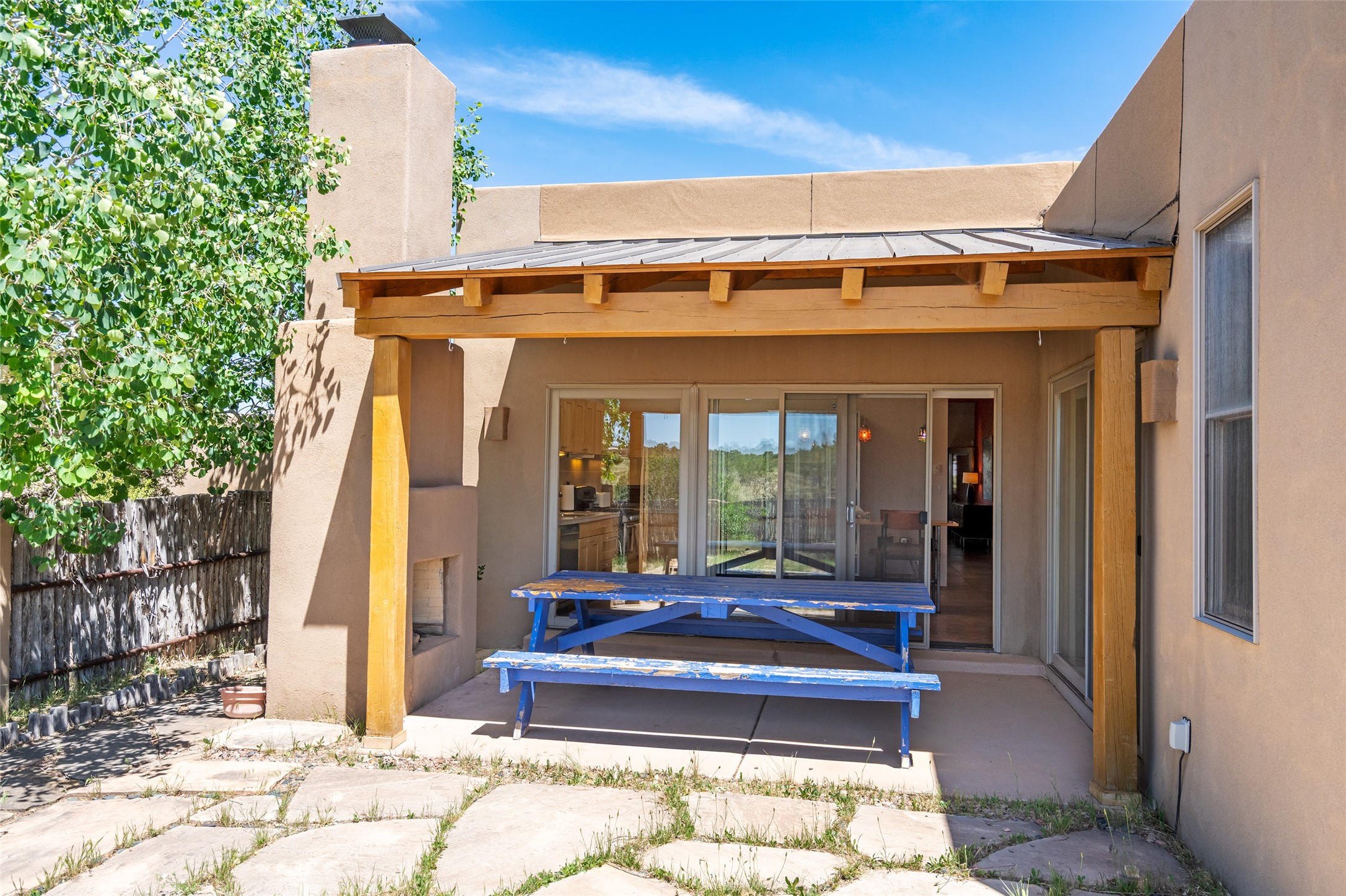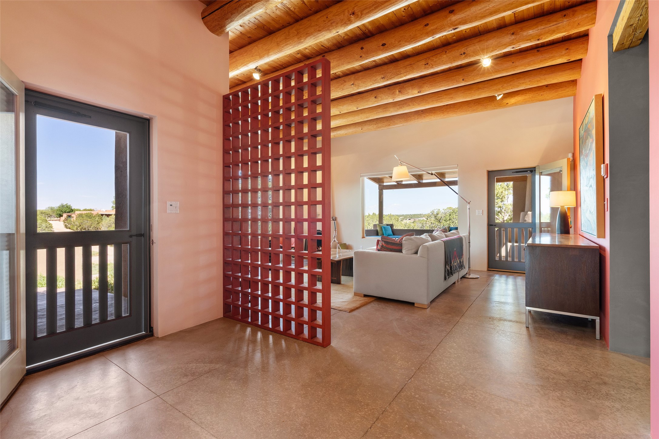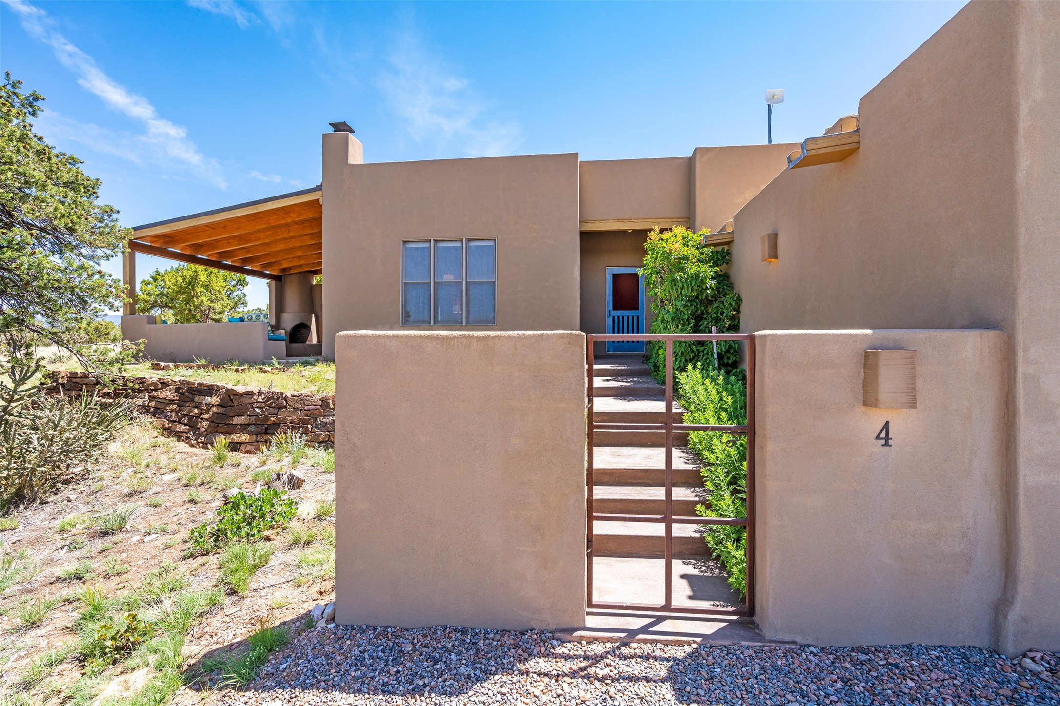 Lovely, contemporary Santa Fe style home in the East Ranch subdivision. This home sits on 2.13 acres, has views and features 3 bedrooms, 2 baths with concrete flooring throughout. Tiled counter tops in the kitchen with stainless appliances, maple cabinets plus an Ikea pantry unit. Seven skylights provide diffused lighting inside the home. Santa Fe touches include vigas and a kiva fireplace in the living area and vigas in the primary bedroom. Bold and colorful accent walls all around! New Hunter Douglas blinds recently installed. Light and bright laundry room with side by side W/D, a sink and cabinets. Two covered portals are located on the north and south side of the house. One portal has a kiva fireplace, the other portal has a kiva fireplace and a built in grill; perfect for outdoor entertaining. Spacious fenced yard in the back with a garden shed. Attached two car garage. This property is conveniently located just 4 miles from the Agora Shopping Center. Don't miss seeing this gem and the serenity of Southwest living!