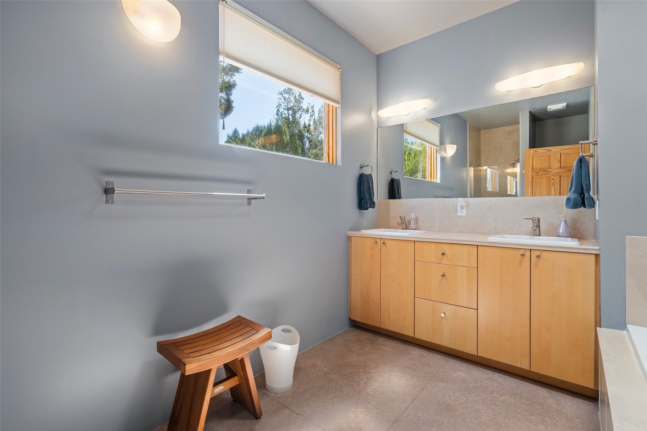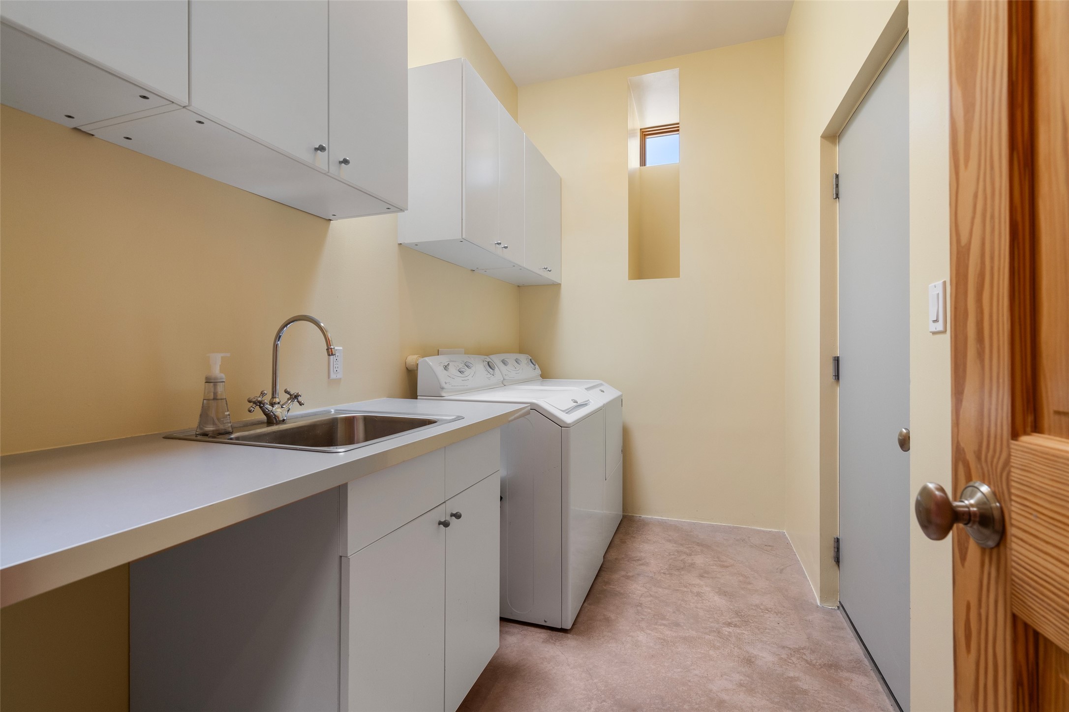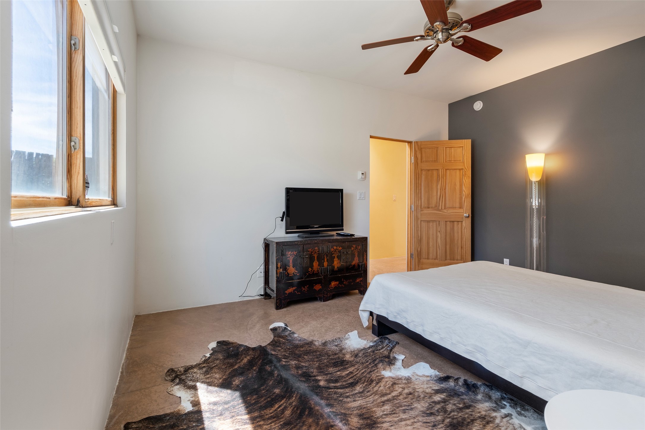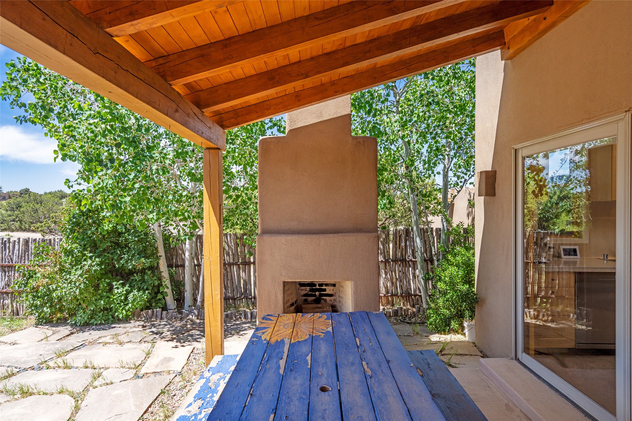 Lovely, contemporary Santa Fe style home in the East Ranch subdivision. This home sits on 2.13 acres, has views and features 3 bedrooms, 2 baths with concrete flooring throughout. Tiled counter tops in the kitchen with stainless appliances, maple cabinets plus an Ikea pantry unit. Seven skylights provide diffused lighting inside the home. Santa Fe touches include vigas and a kiva fireplace in the living area and vigas in the primary bedroom. Bold and colorful accent walls all around! New Hunter Douglas blinds recently installed. Light and bright laundry room with side by side W/D, a sink and cabinets. Two covered portals are located on the north and south side of the house. One portal has a kiva fireplace, the other portal has a kiva fireplace and a built in grill; perfect for outdoor entertaining. Spacious fenced yard in the back with a garden shed. Attached two car garage. This property is conveniently located just 4 miles from the Agora Shopping Center. Don't miss seeing this gem and the serenity of Southwest living!