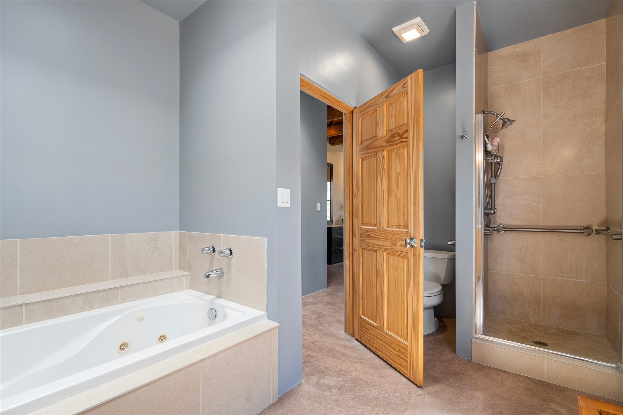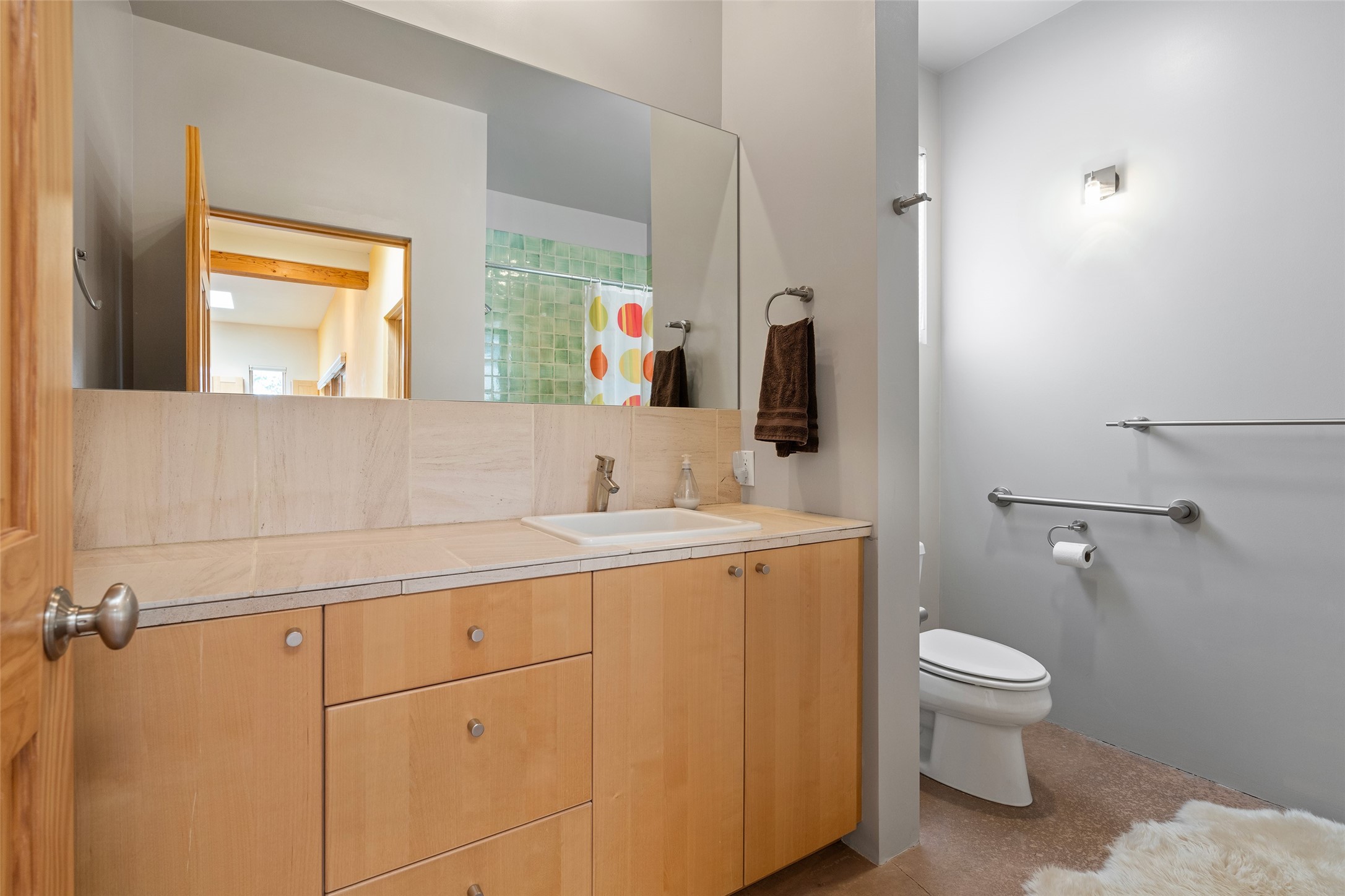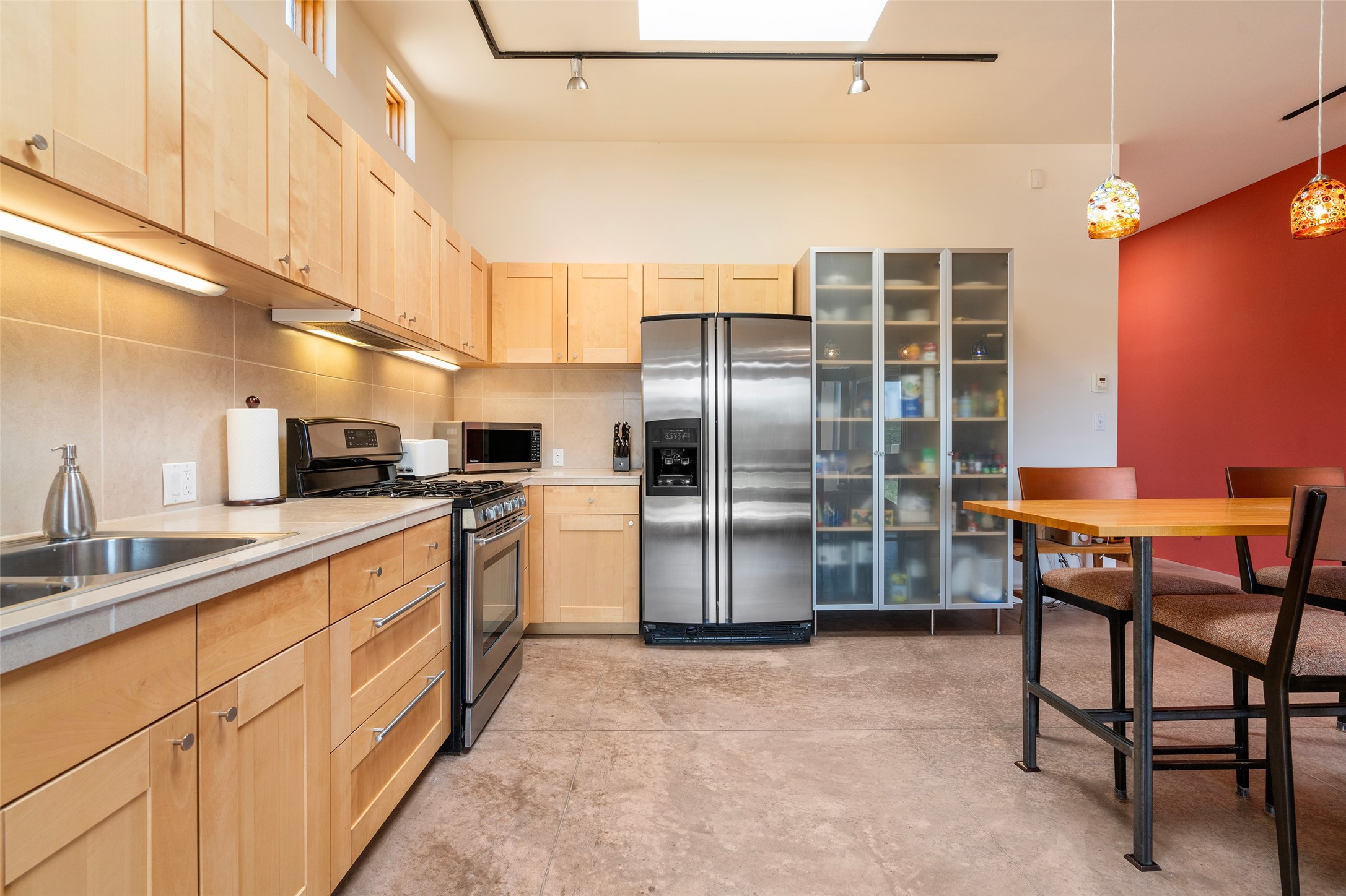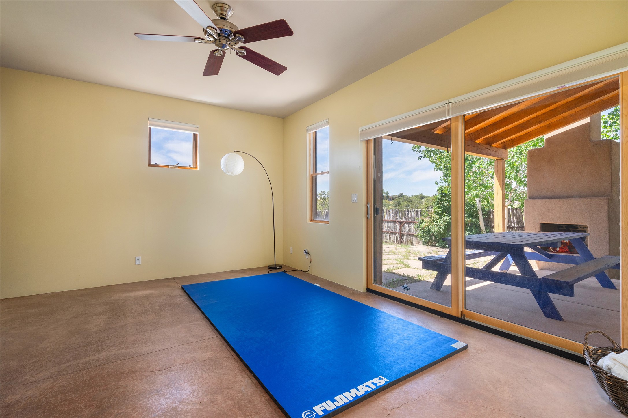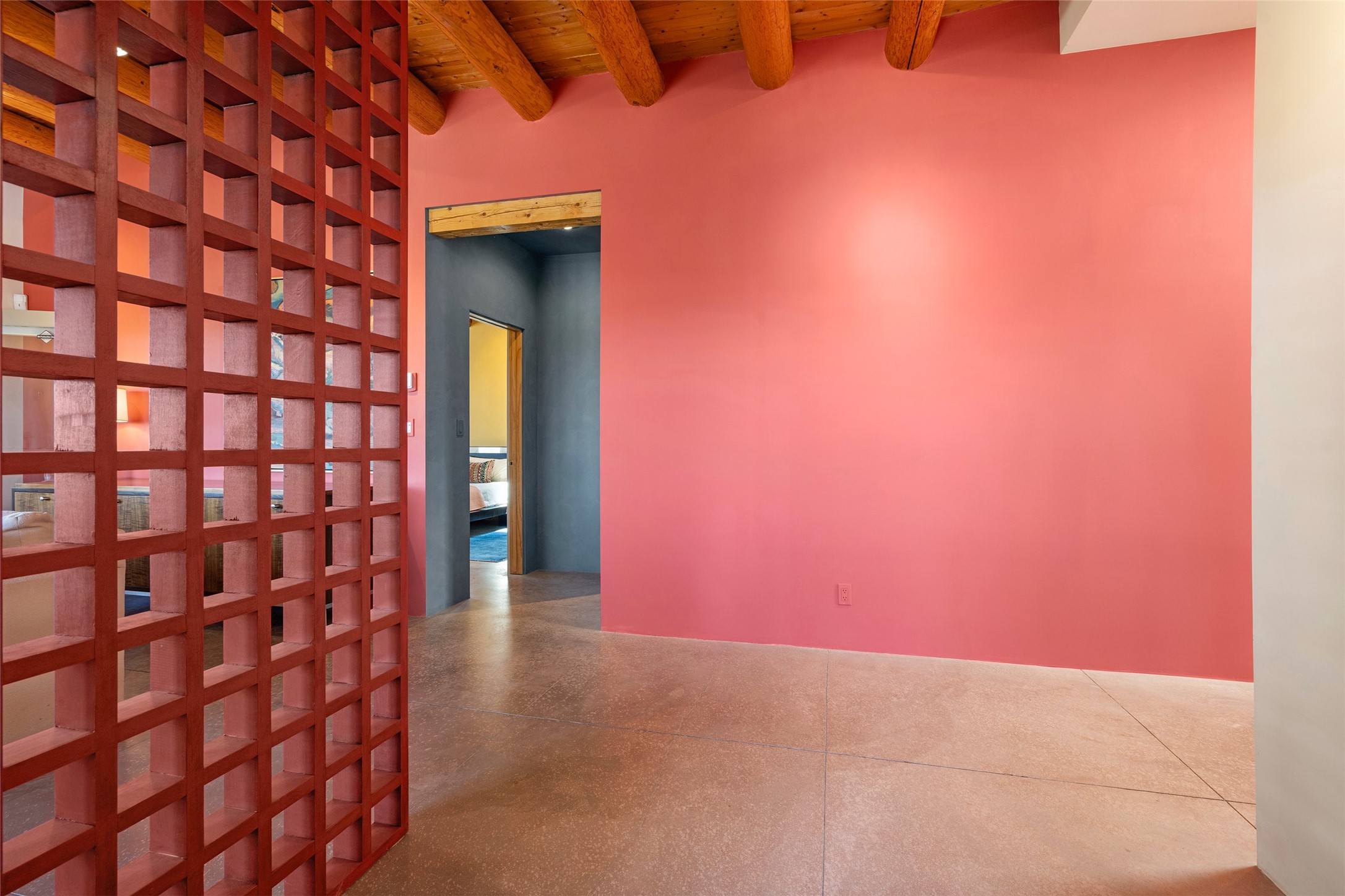 Lovely, contemporary Santa Fe style home in the East Ranch subdivision. This home sits on 2.13 acres, has views and features 3 bedrooms, 2 baths with concrete flooring throughout. Tiled counter tops in the kitchen with stainless appliances, maple cabinets plus an Ikea pantry unit. Seven skylights provide diffused lighting inside the home. Santa Fe touches include vigas and a kiva fireplace in the living area and vigas in the primary bedroom. Bold and colorful accent walls all around! New Hunter Douglas blinds recently installed. Light and bright laundry room with side by side W/D, a sink and cabinets. Two covered portals are located on the north and south side of the house. One portal has a kiva fireplace, the other portal has a kiva fireplace and a built in grill; perfect for outdoor entertaining. Spacious fenced yard in the back with a garden shed. Attached two car garage. This property is conveniently located just 4 miles from the Agora Shopping Center. Don't miss seeing this gem and the serenity of Southwest living!