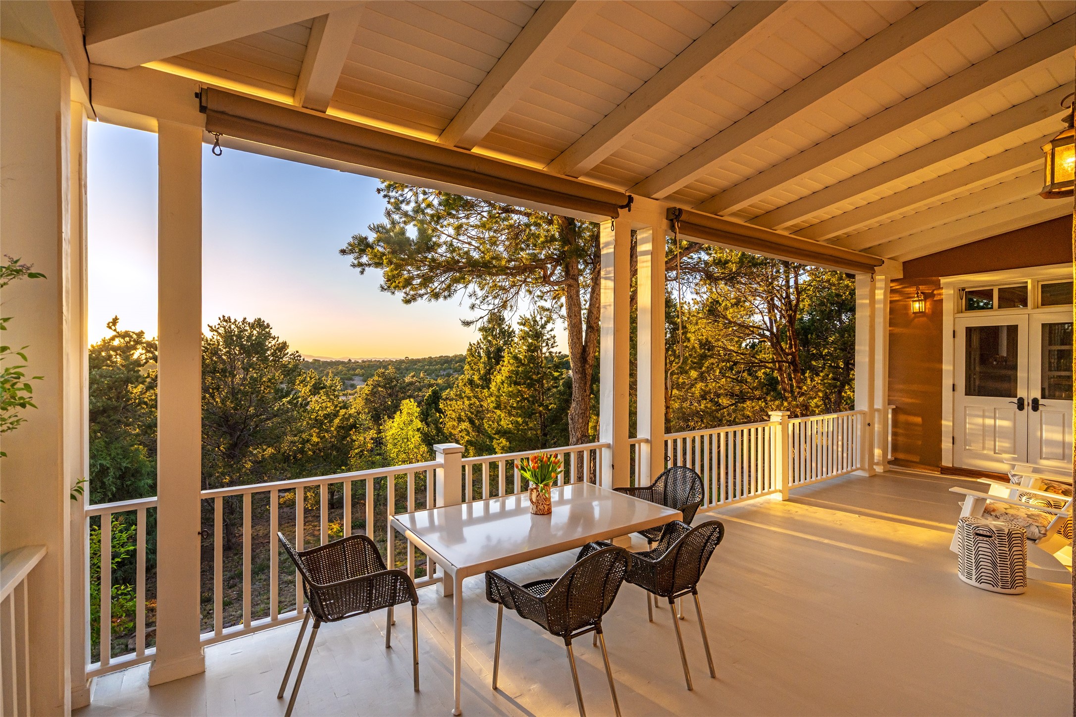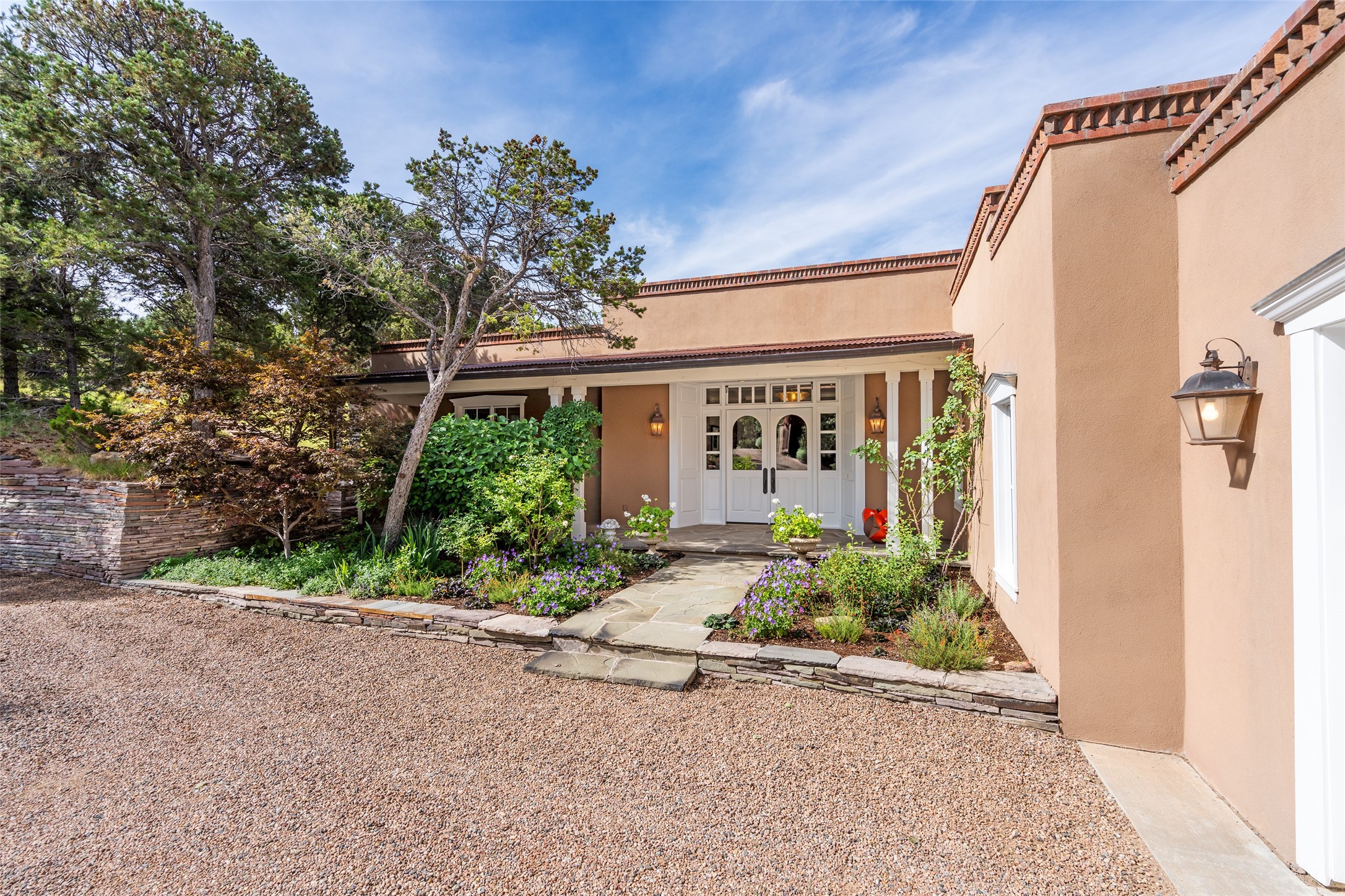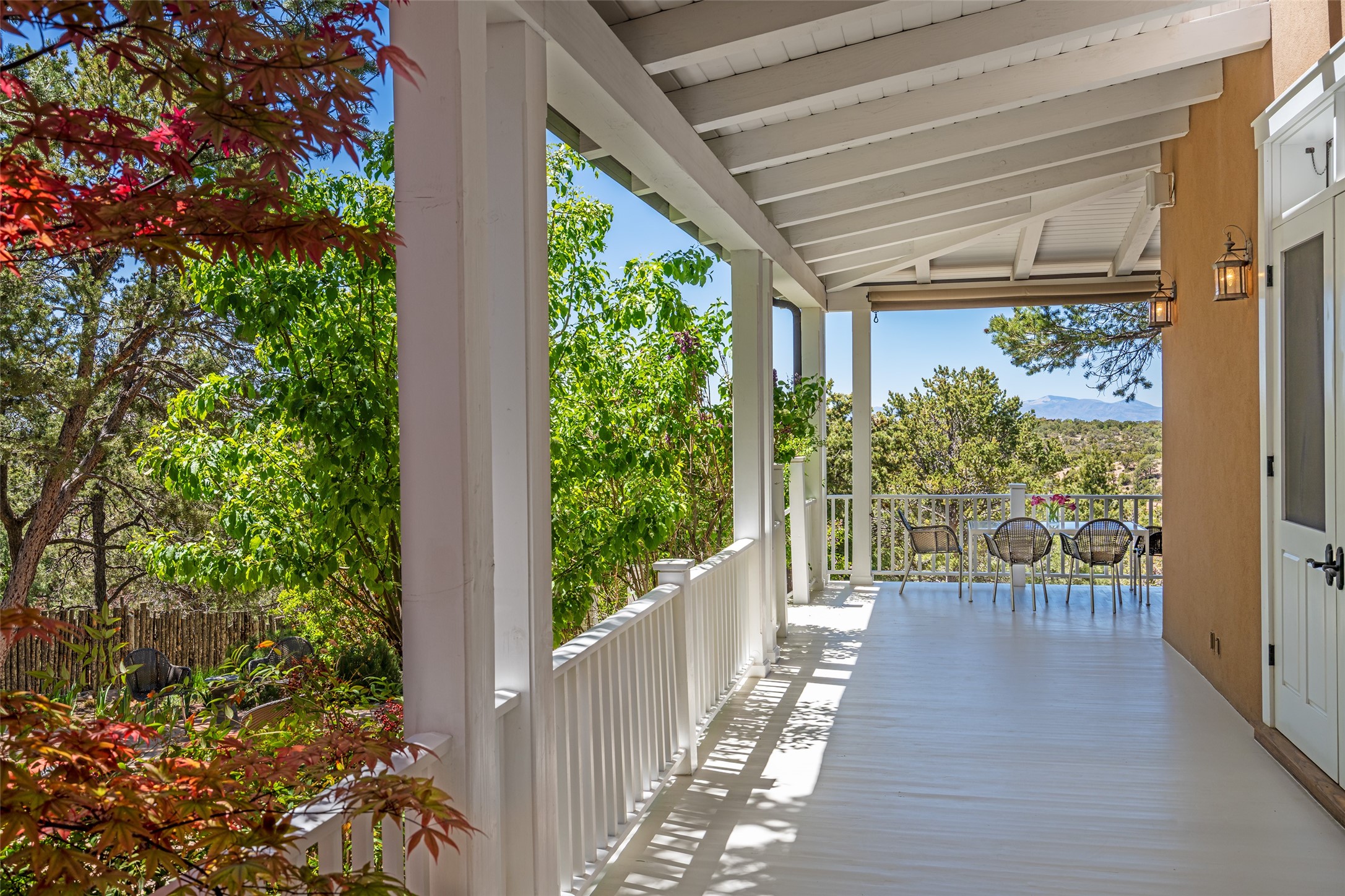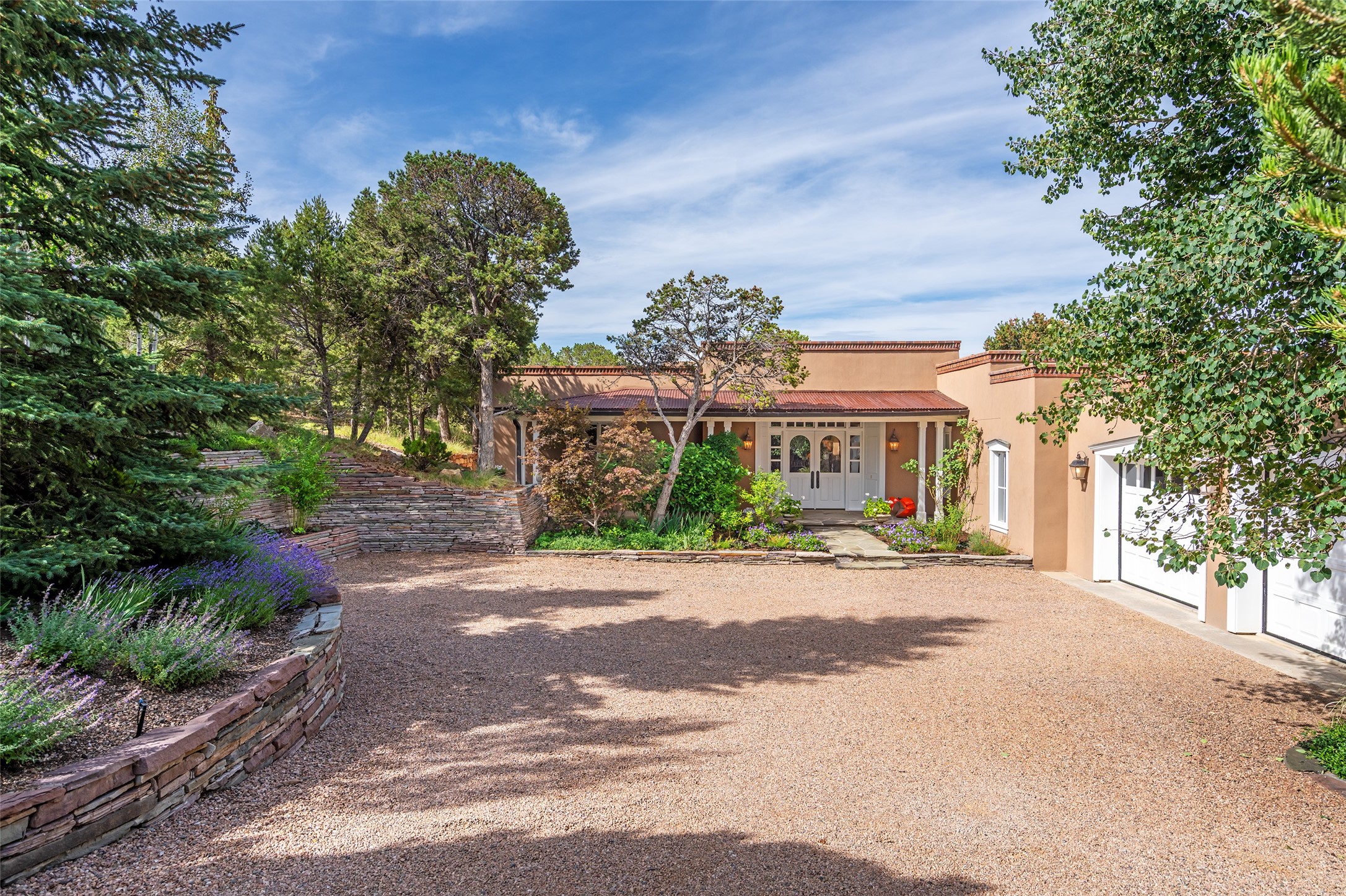 This gated oasis tastefully blends territorial-style with southwestern character reminiscent of old-world Europe. The property offers privacy, elegance, and tranquil views of the Jemez Mountains. The home features a deep wrap-around veranda --perfect for outdoor entertaining or peaceful evenings surrounded by lush, mature gardens and glorious trees. Inside, unique architectural touches abound, including roughhewn wood accents and soaring brick ceilings that add warmth and texture throughout. The elegant living room features a large stone fireplace and is adjoined by the dining room that seamlessly integrates with the gourmet kitchen -- a culinary dream, with a large island, honed stone countertop, top-tier appliances, and a separate butler's pantry with an additional dishwasher and sink. The spacious floor plan includes three bedrooms and four baths. The primary suite is generous, with access to the veranda, a private study, two spacious walk-in closets, and a luxurious bath. The separate guest wing with two gracious guest suites enjoys privacy and ensures welcoming accommodations. An oversized two-car garage completes this stunning property. More than a home, this is a secluded sanctuary that blends timeless design with modern comfort.