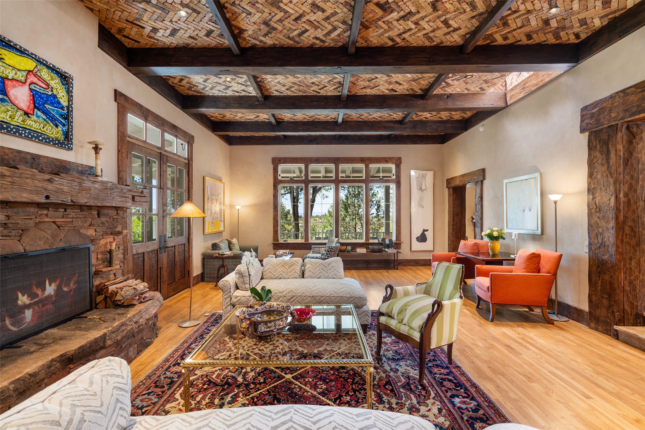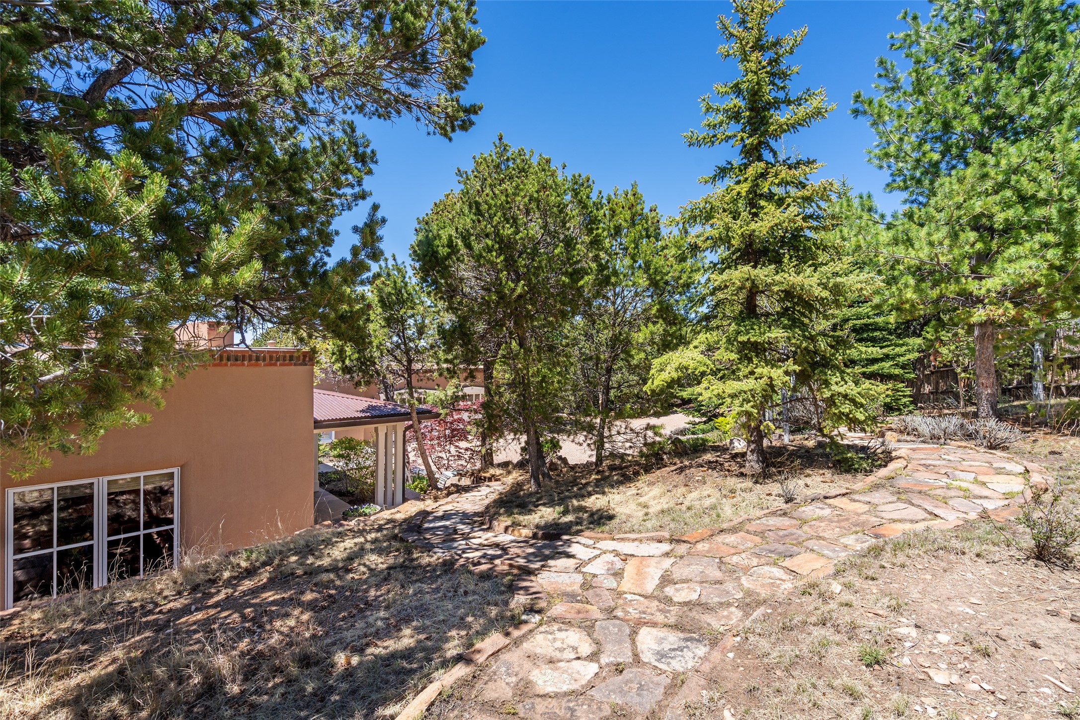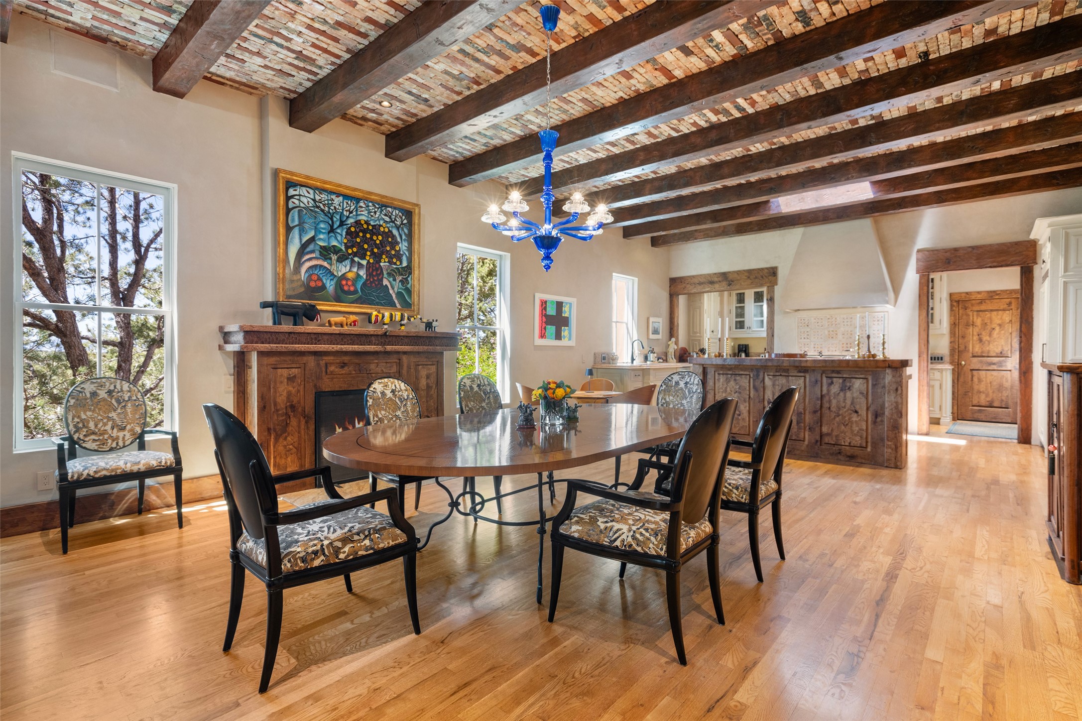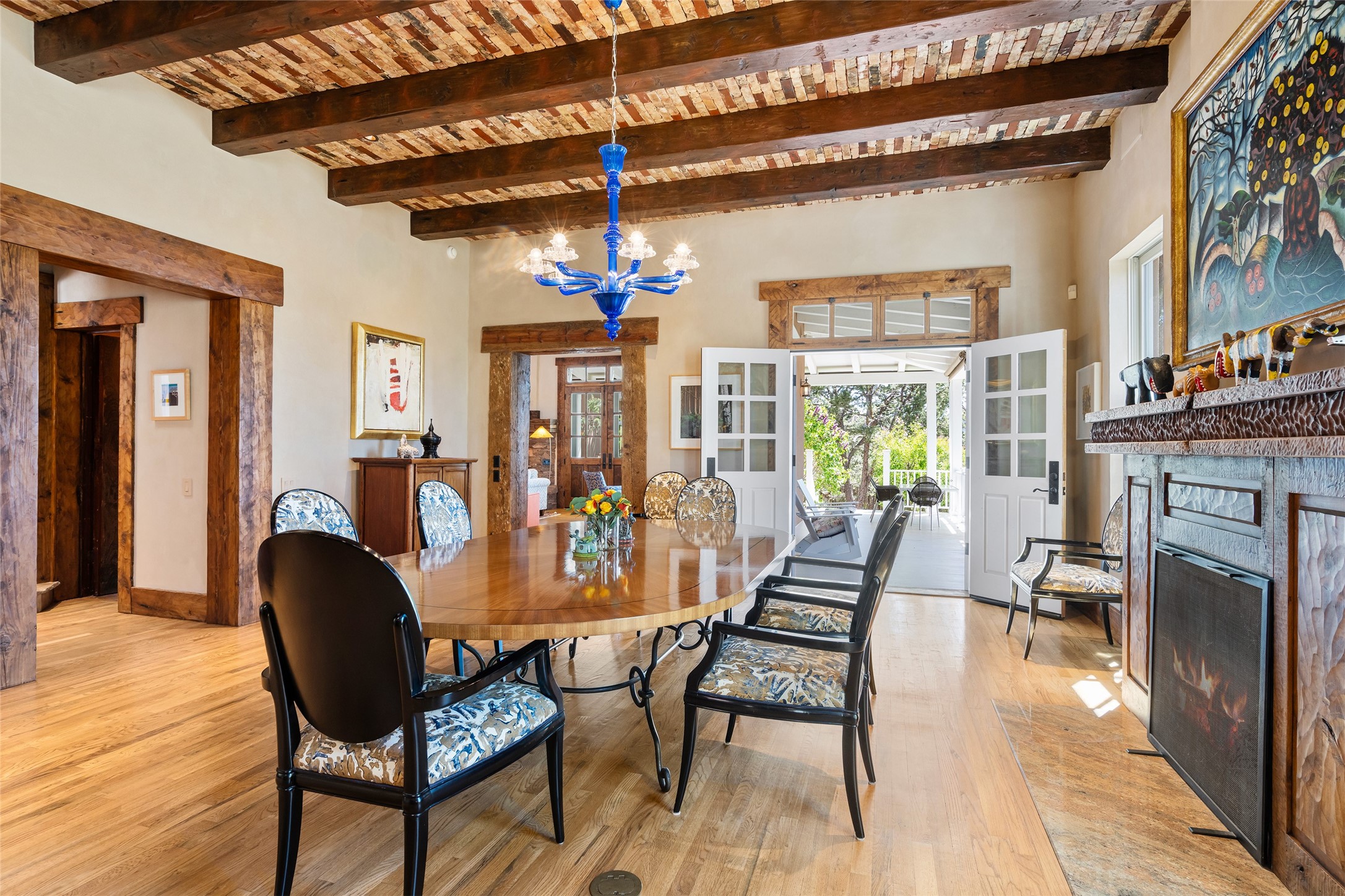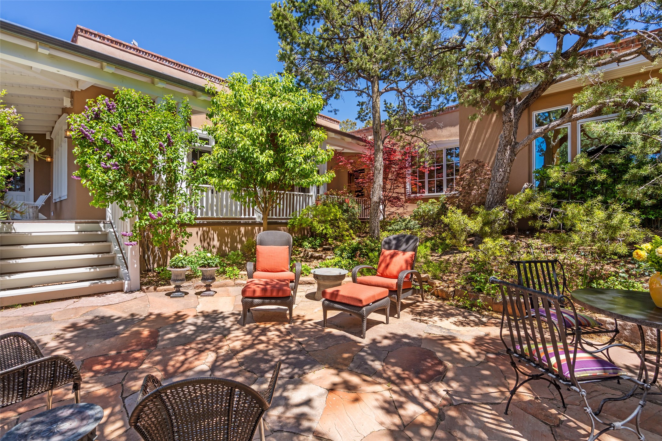 This gated oasis tastefully blends territorial-style with southwestern character reminiscent of old-world Europe. The property offers privacy, elegance, and tranquil views of the Jemez Mountains. The home features a deep wrap-around veranda --perfect for outdoor entertaining or peaceful evenings surrounded by lush, mature gardens and glorious trees. Inside, unique architectural touches abound, including roughhewn wood accents and soaring brick ceilings that add warmth and texture throughout. The elegant living room features a large stone fireplace and is adjoined by the dining room that seamlessly integrates with the gourmet kitchen -- a culinary dream, with a large island, honed stone countertop, top-tier appliances, and a separate butler's pantry with an additional dishwasher and sink. The spacious floor plan includes three bedrooms and four baths. The primary suite is generous, with access to the veranda, a private study, two spacious walk-in closets, and a luxurious bath. The separate guest wing with two gracious guest suites enjoys privacy and ensures welcoming accommodations. An oversized two-car garage completes this stunning property. More than a home, this is a secluded sanctuary that blends timeless design with modern comfort.